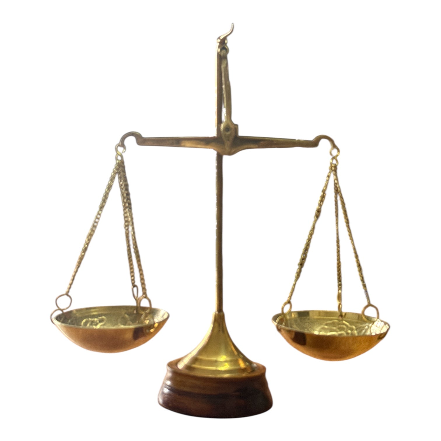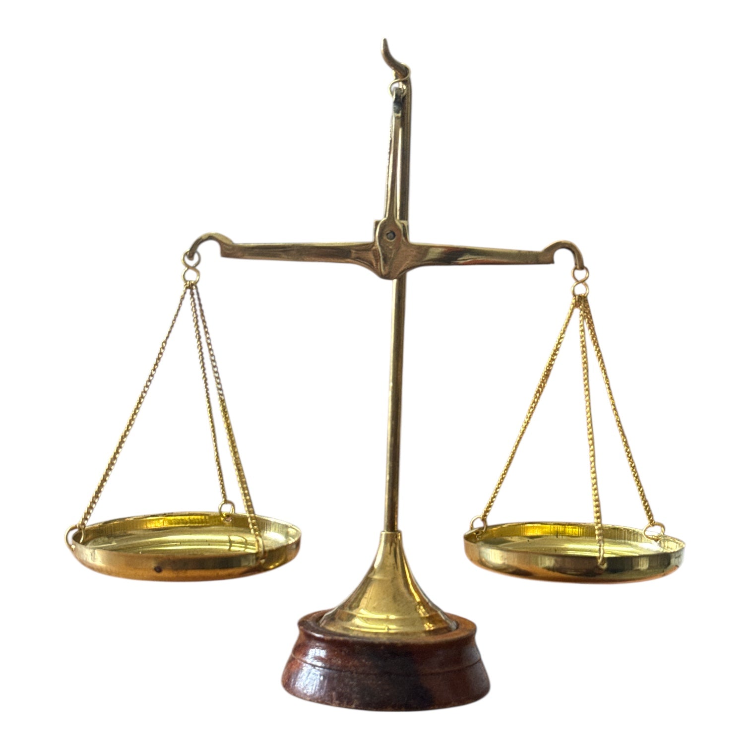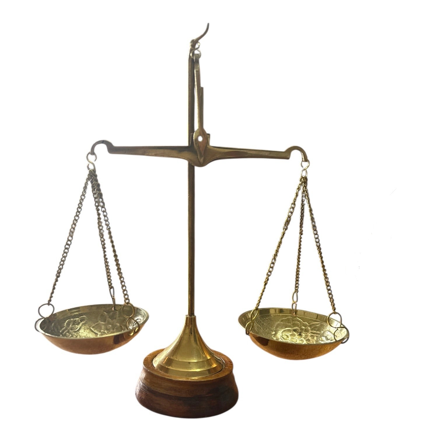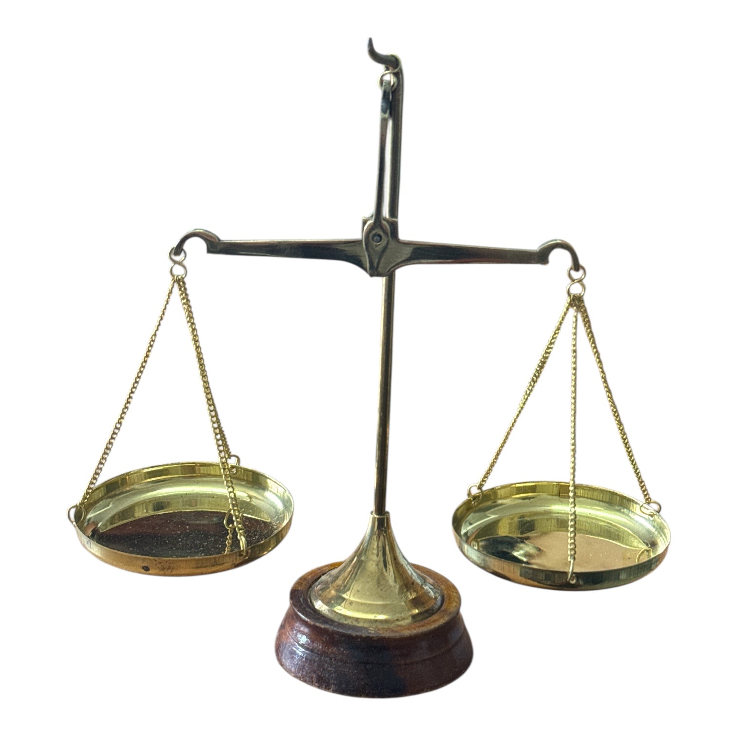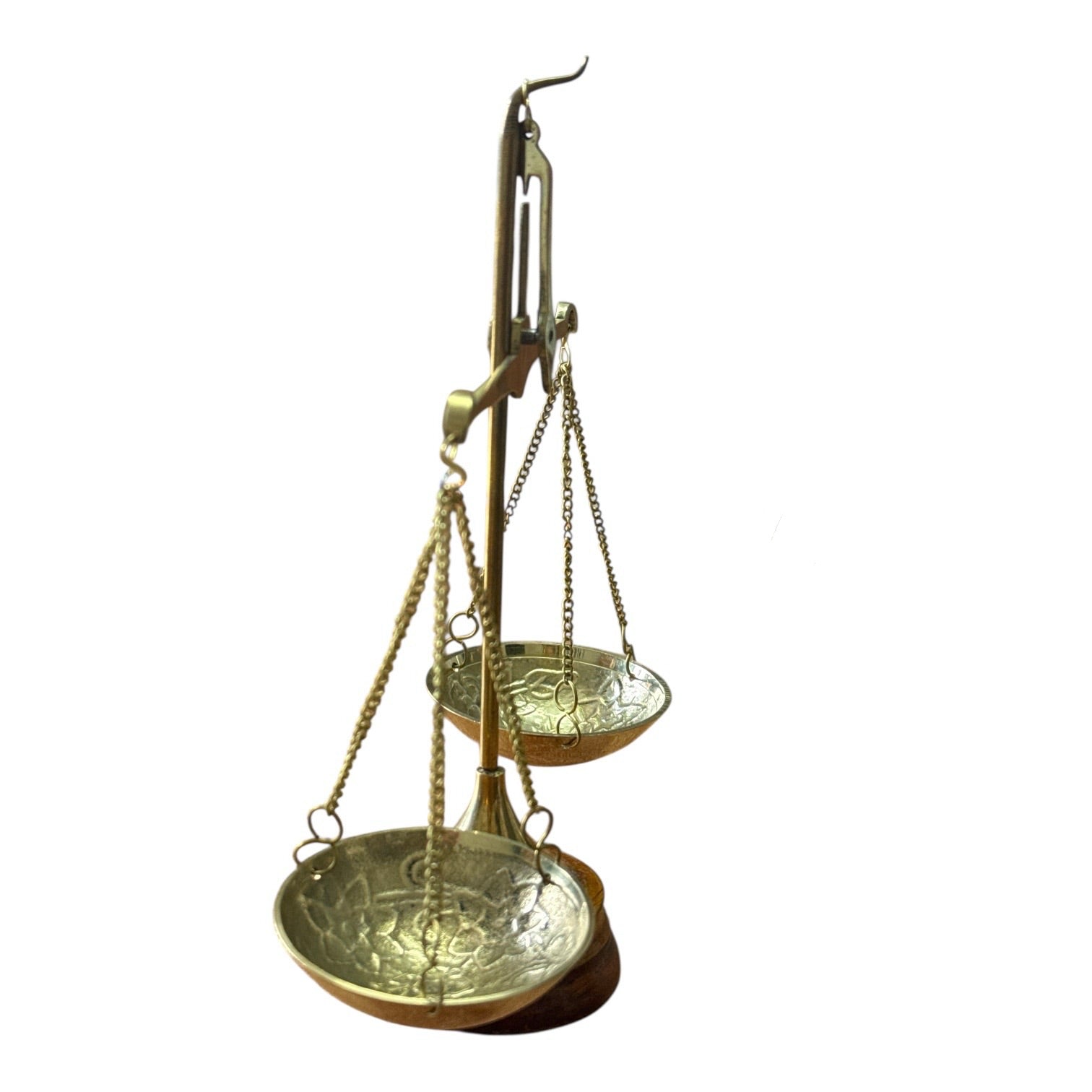 Balanță decorativă realizată din alamă, cu un design clasic și elegant, inspirat din stilul vintage. Finisajul auriu, combinat cu baza din lemn, oferă un aspect rafinat și autentic, transformând acest obiect într-un element decorativ deosebit.
