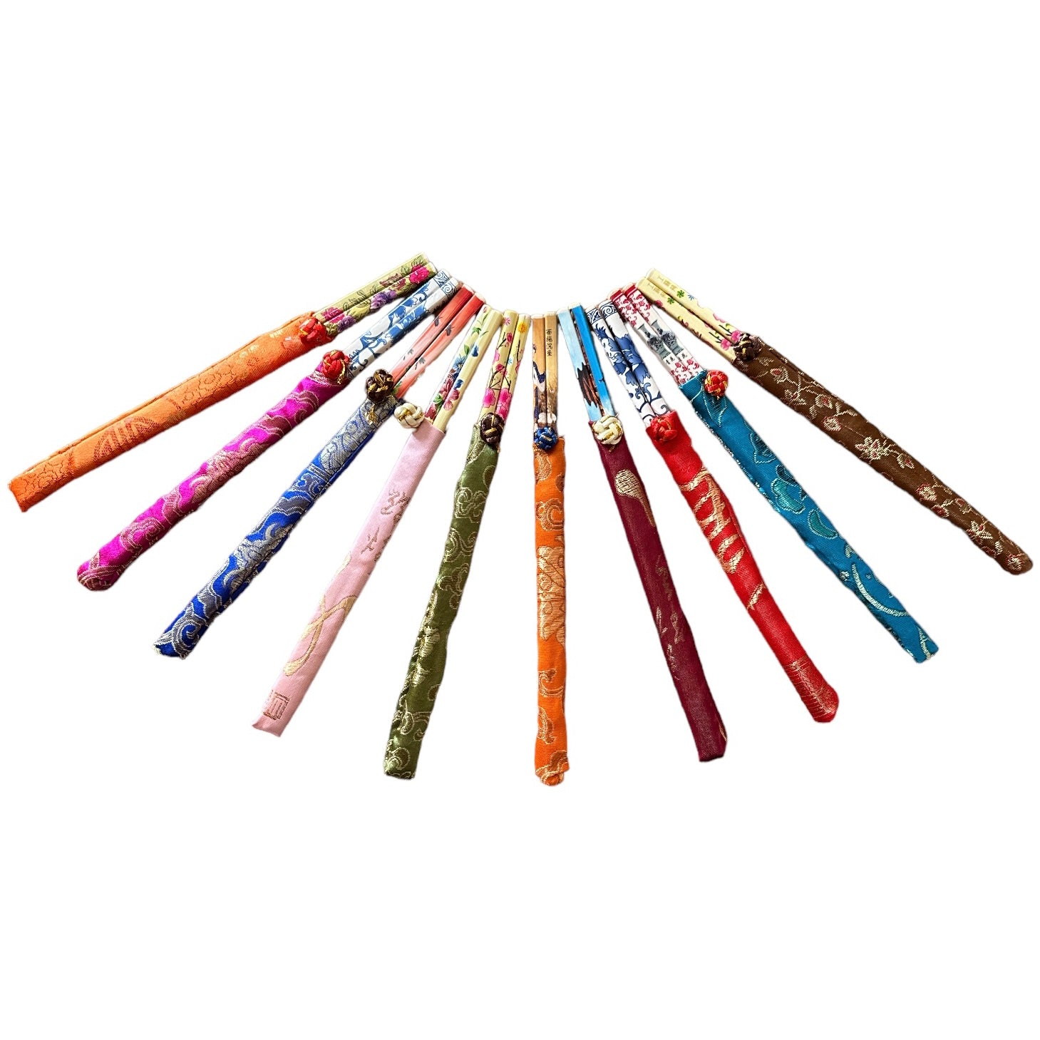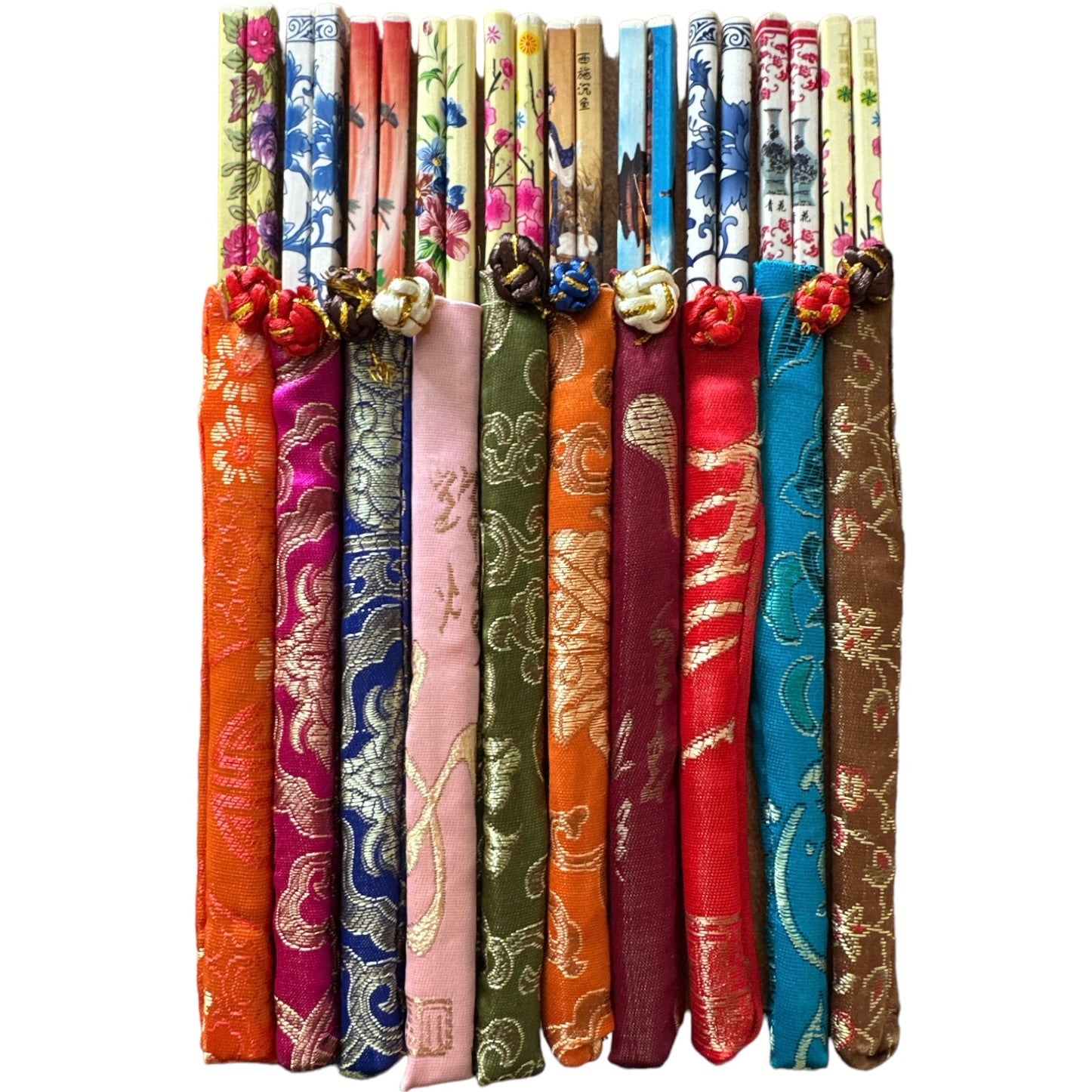 Setul include 10 perechi de bețișoare, astfel încât să poți împărtăși experiența de luat masa asiatică cu prietenii. Fiecare set are propria husă din material textil frumos colorat și decorat cu motive tradiționale .