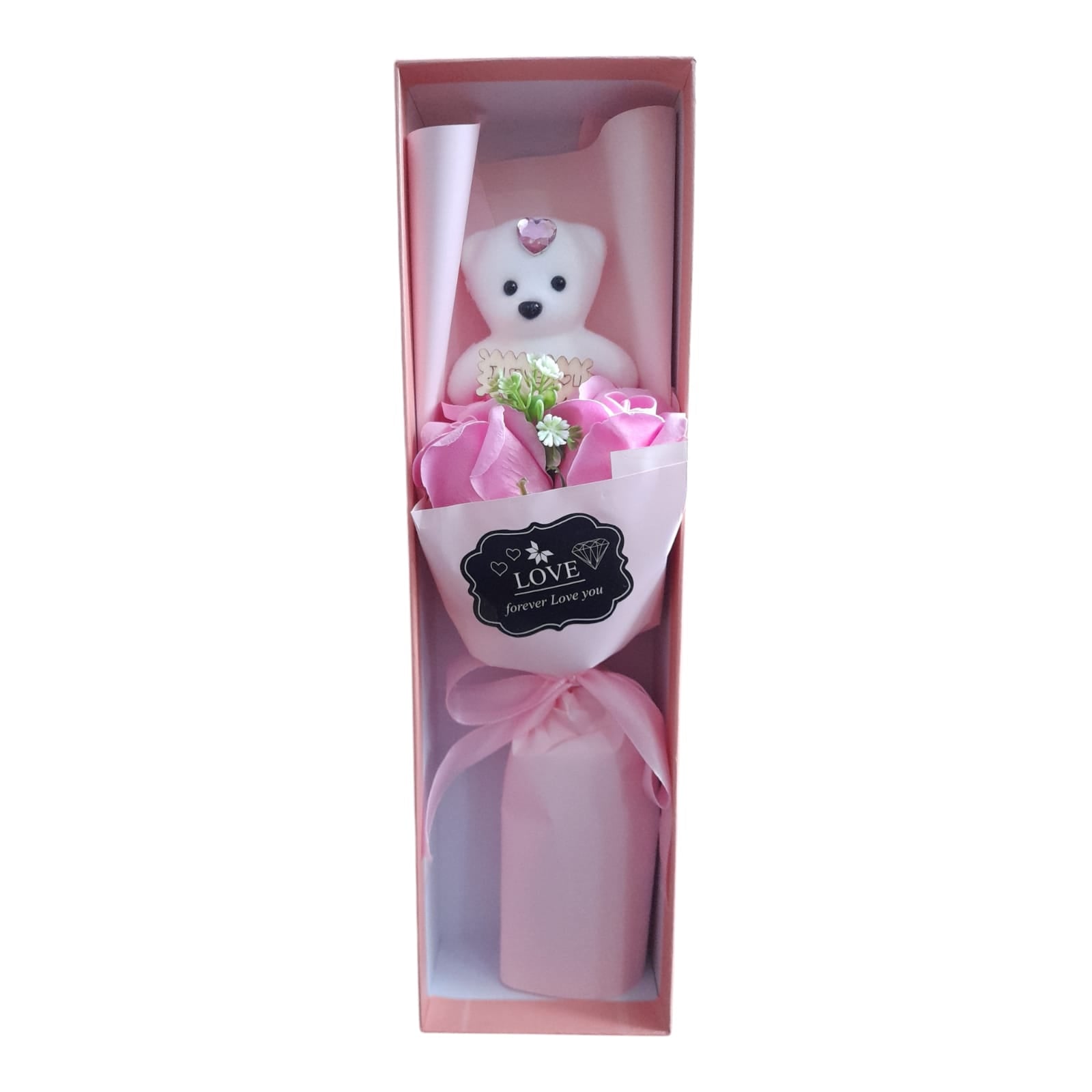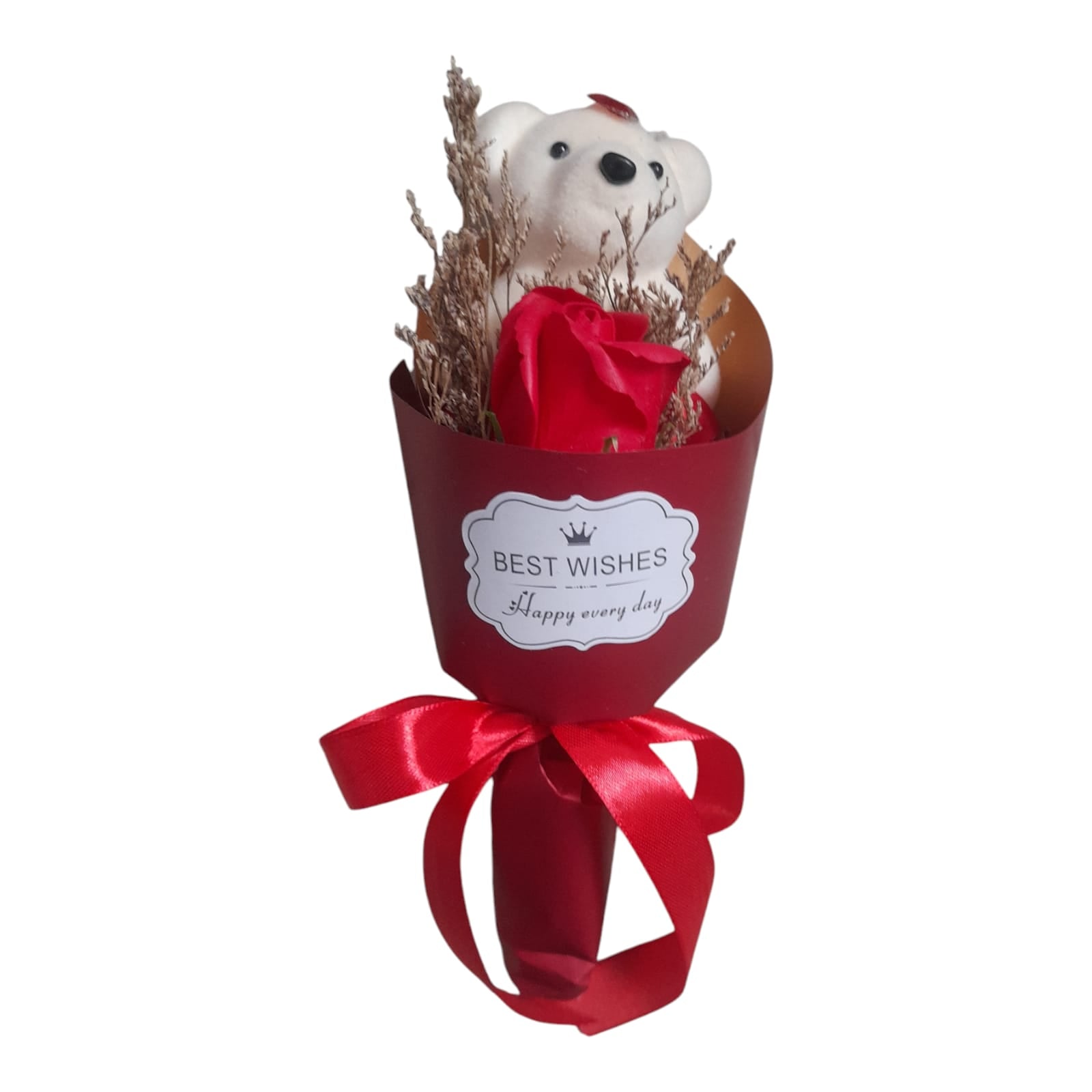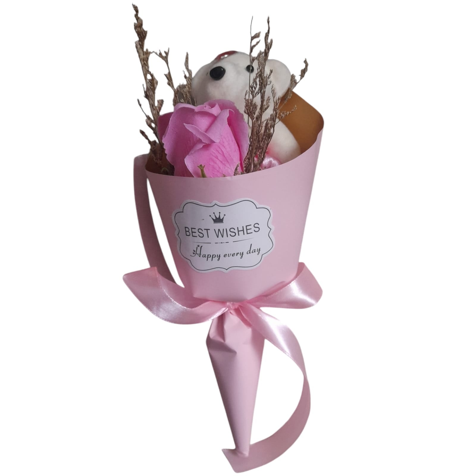 Acest buchet decorativ este un cadou minunat pentru ocazii speciale, combinând frumusețea florilor artificiale cu un design modern și elegant și un Ursuleț adorabil din pluș.
