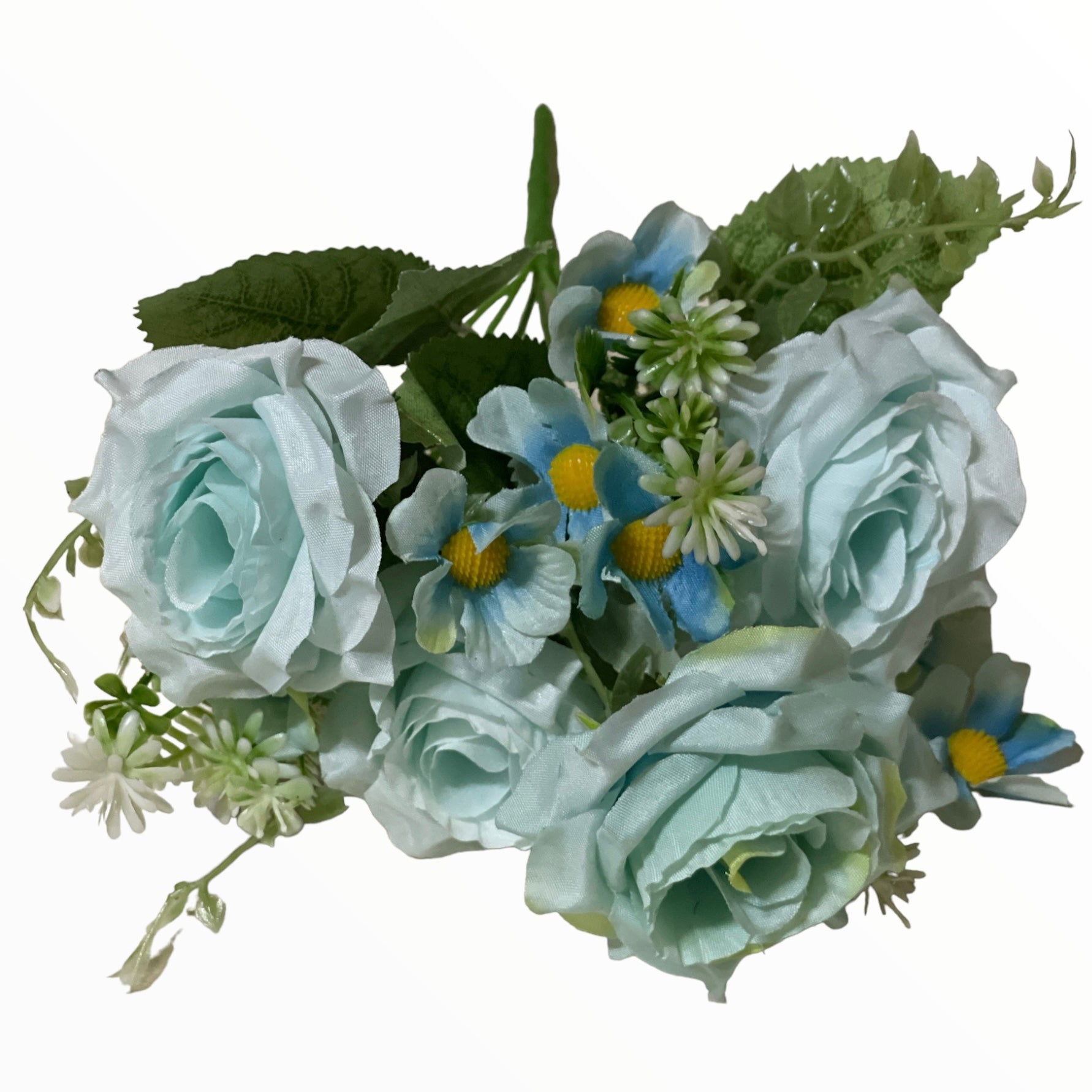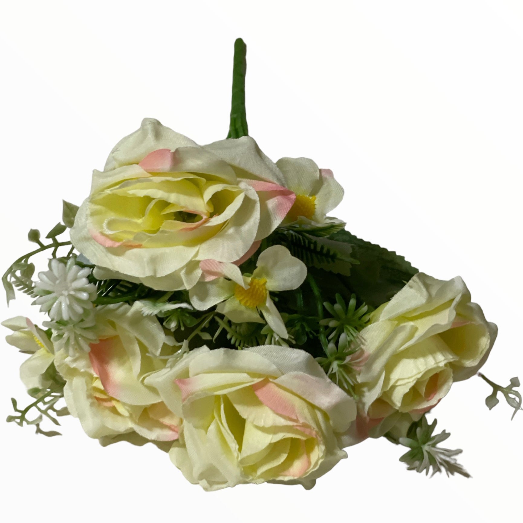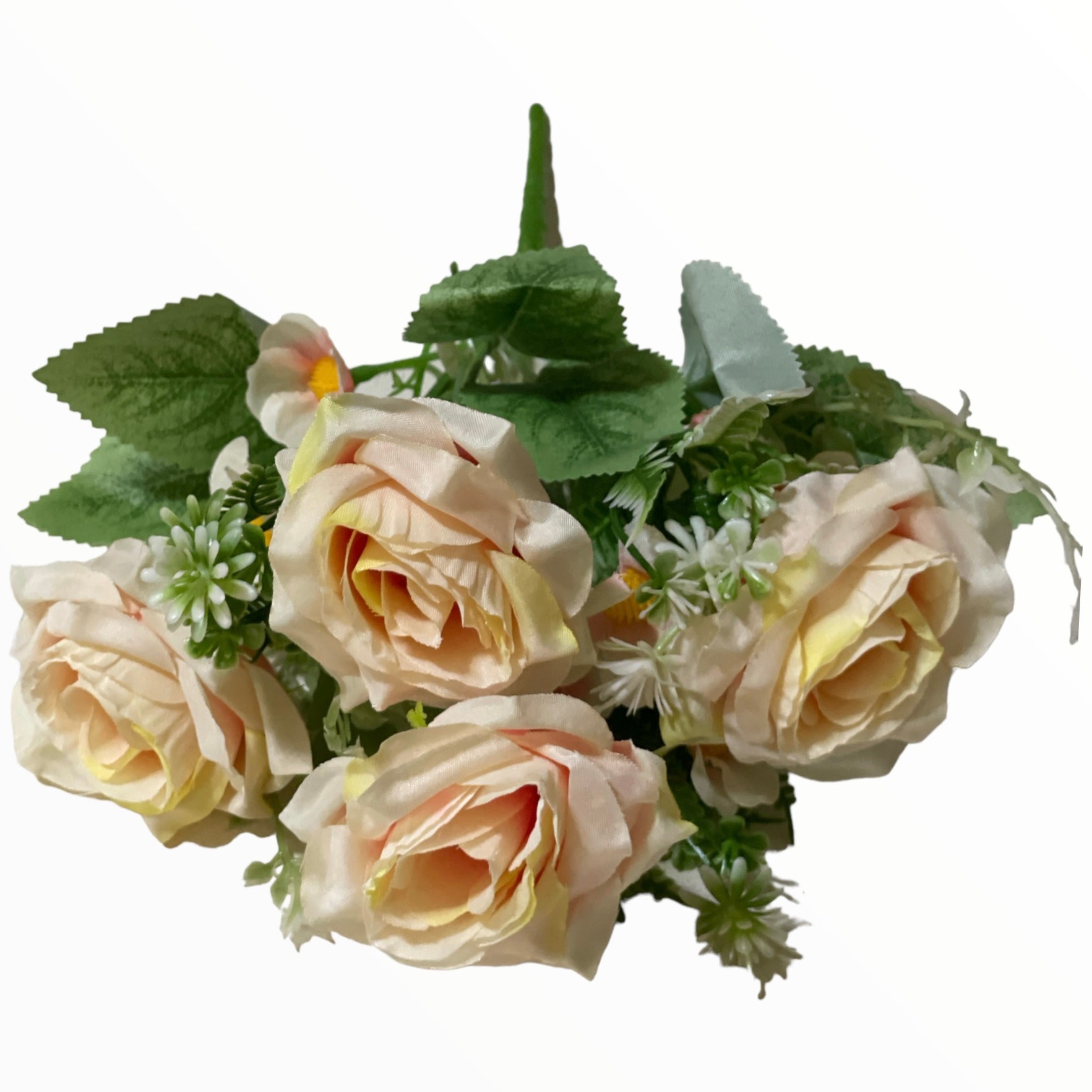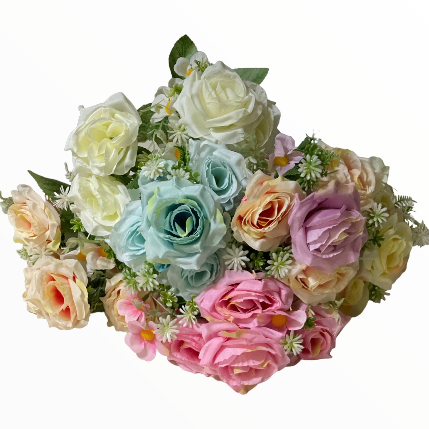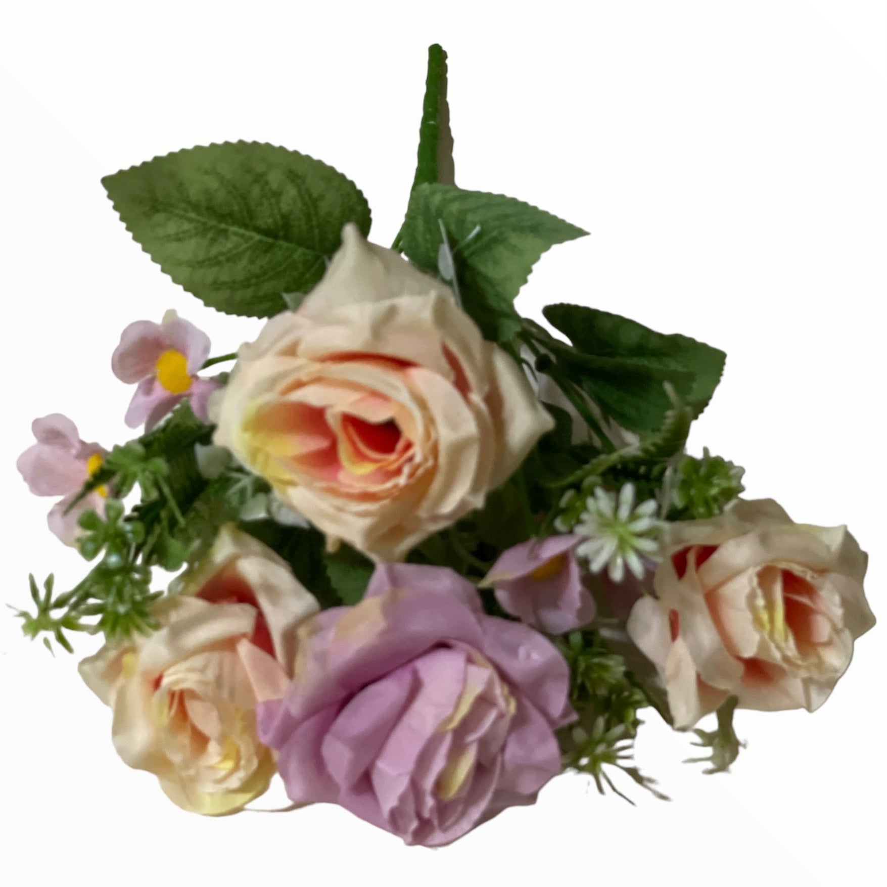 Buchetul decorativ cu flori artificiale în nuanțe delicate de culori diverse , completate de frunze verzi și elemente decorative. Realizate cu atenție la detalii, florile oferă un aspect natural și elegant, fiind ideale pentru decorarea locuințelor, birourilor sau evenimentelor speciale.