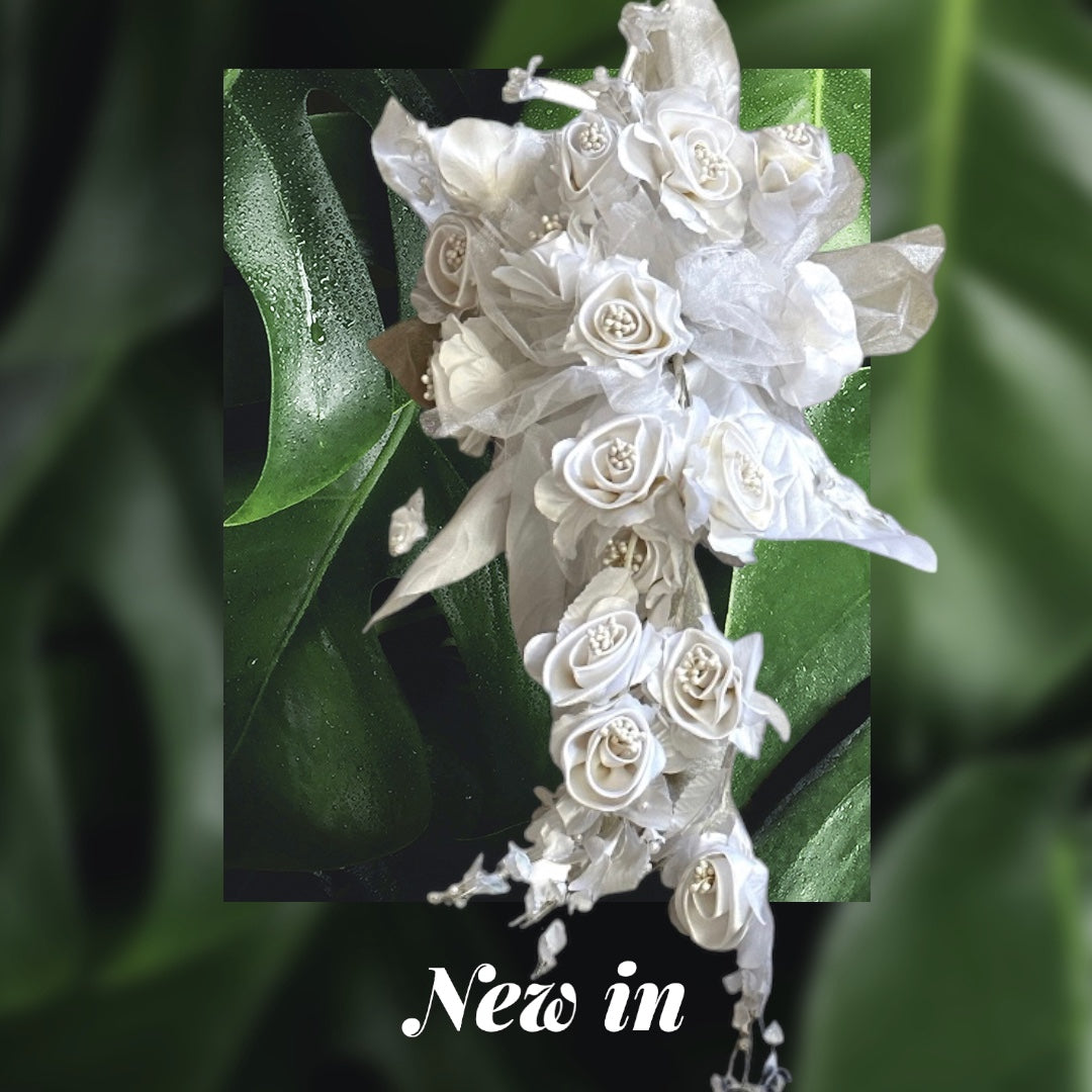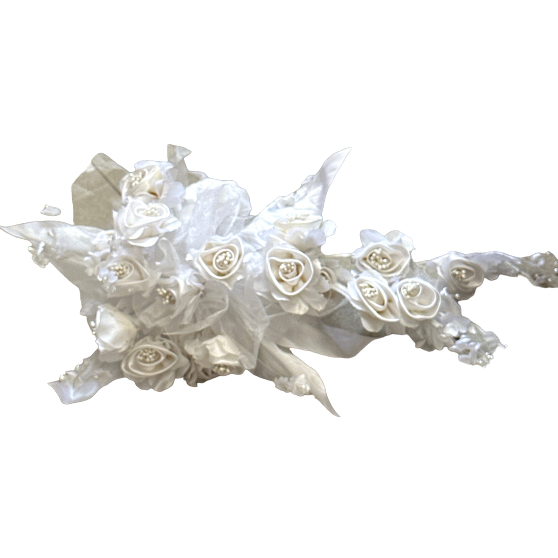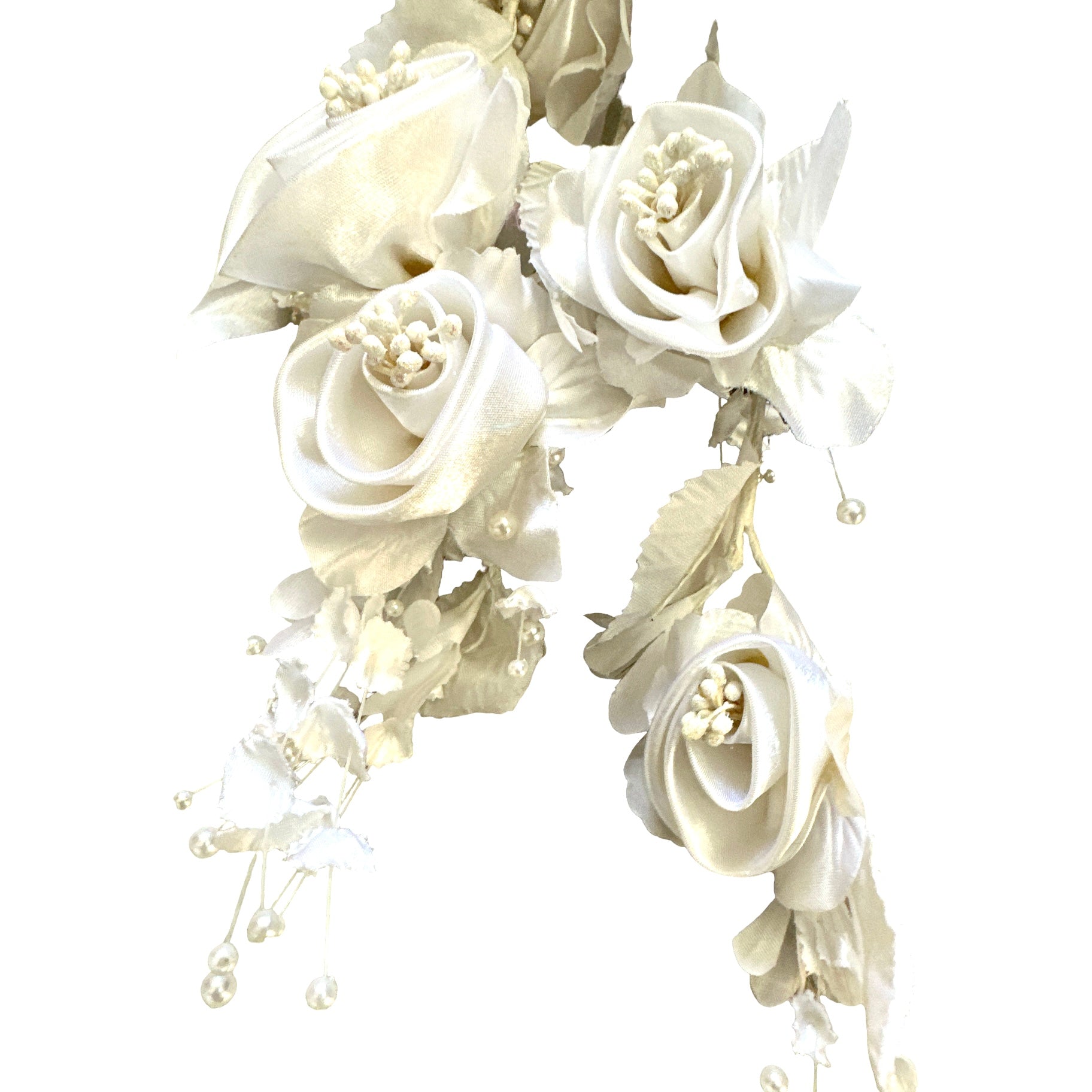 Florile sunt fabricate din material alb satinat cu tije din sârmă și decorate cu perluțe artificiale și mărgele.