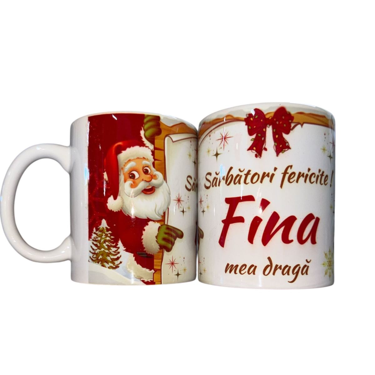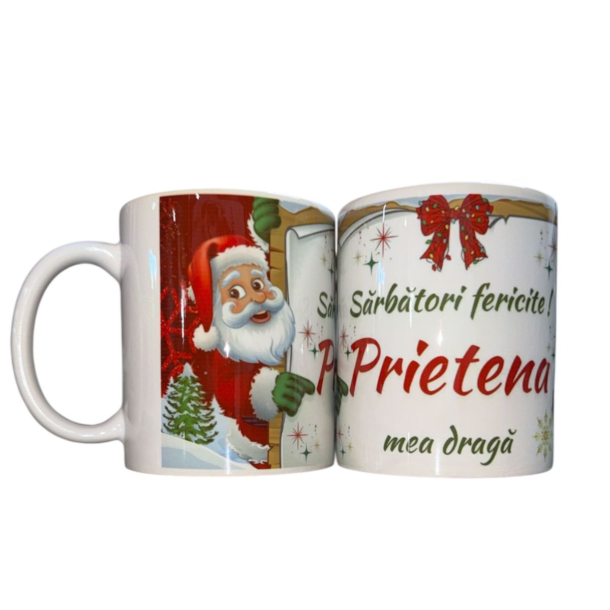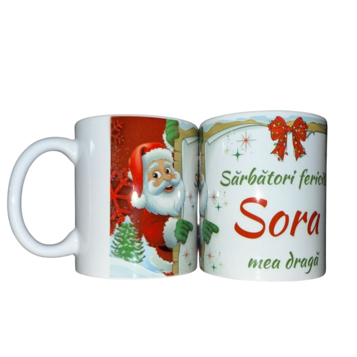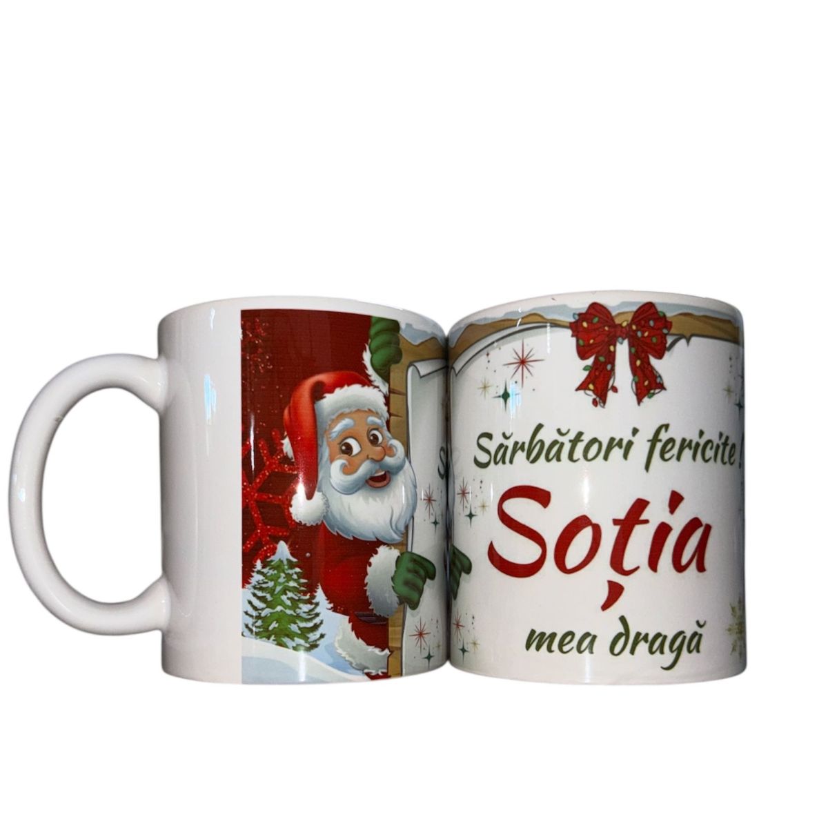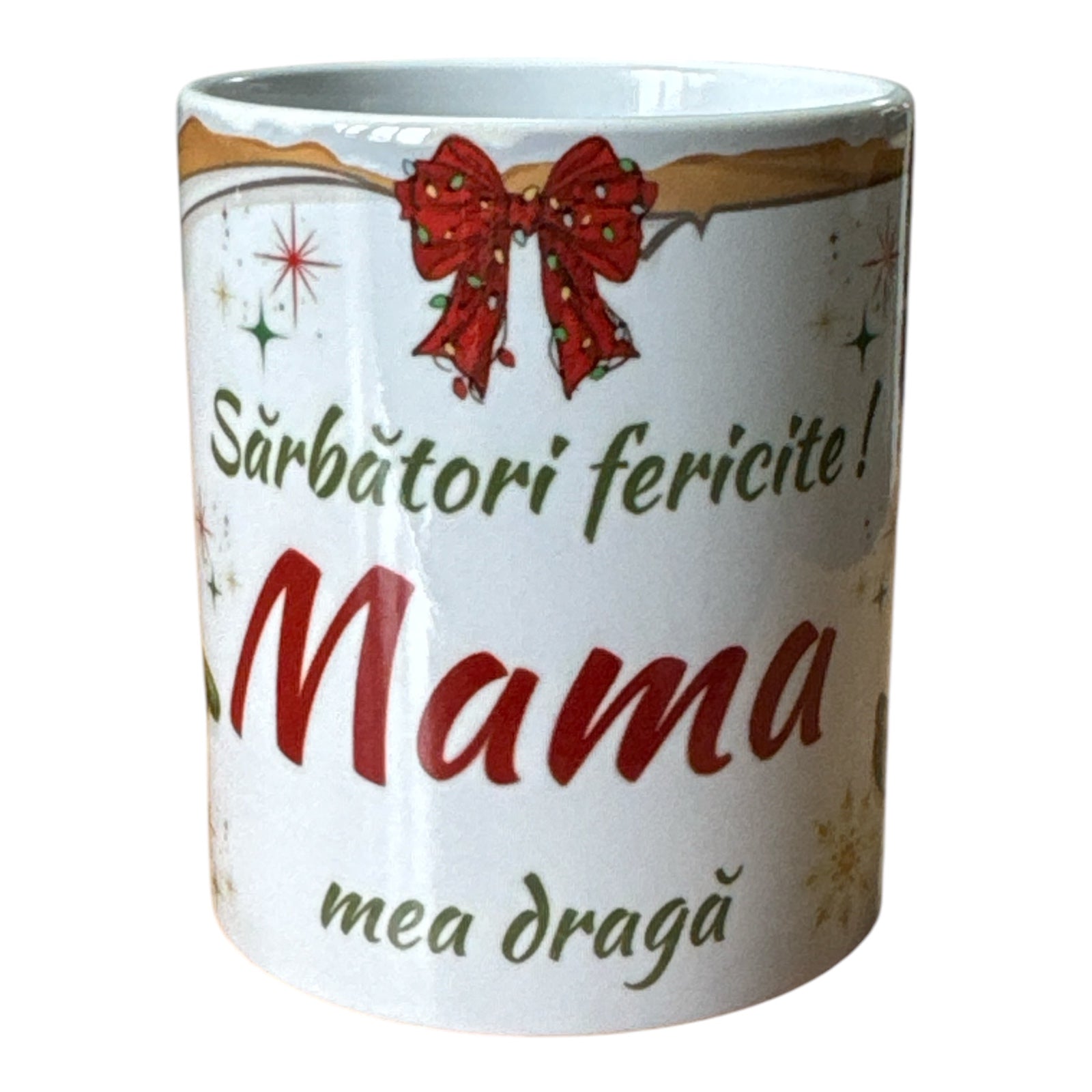 Această cană intensifică plăcerea de a-ți bea cafeaua în fiecare dimineață sau poate fi un cadou deosebit pentru o persoană dragă sau orice rudă apropiată fiind personalizată cu mesajul “ Sărbători fericite ! Pentru…….. dragă“
