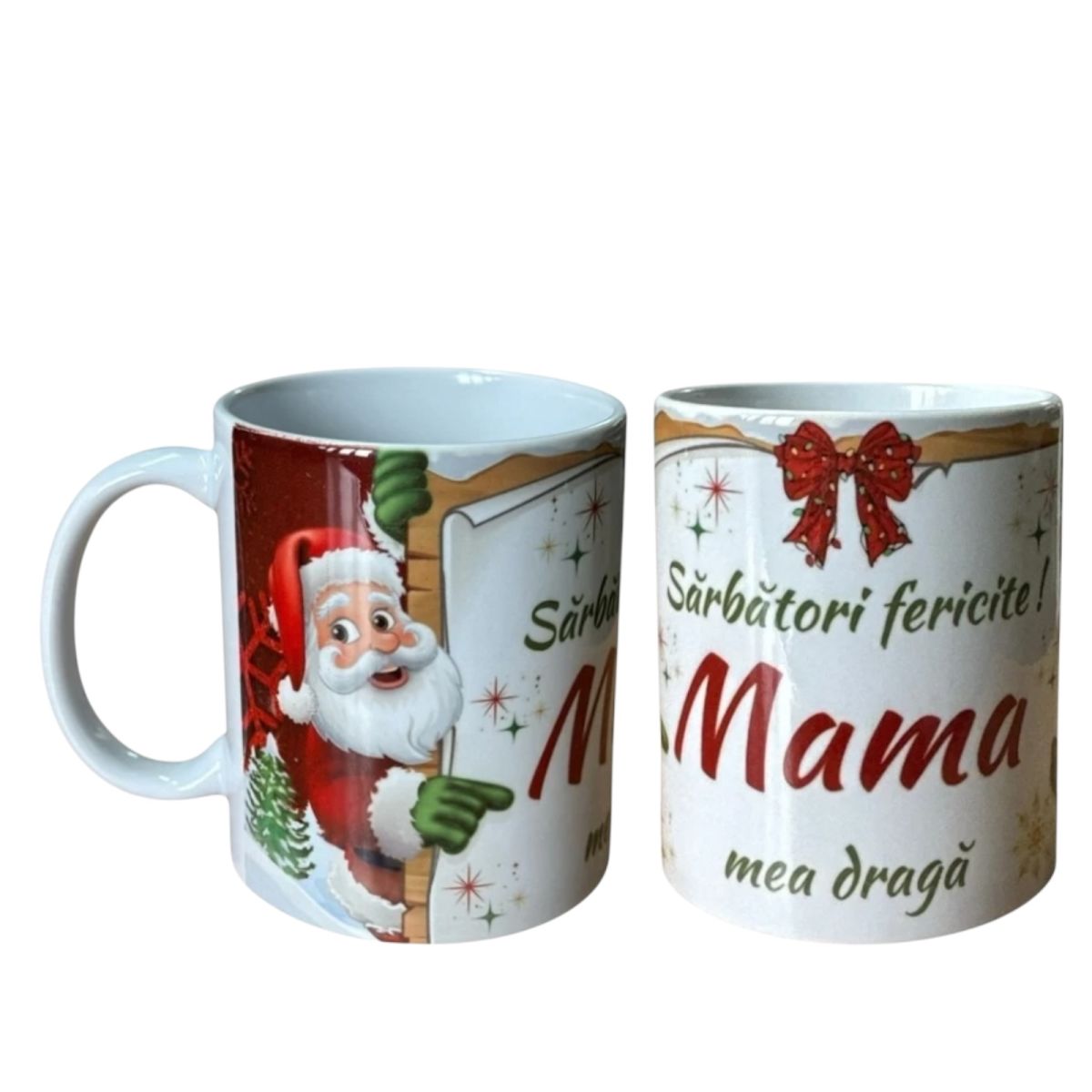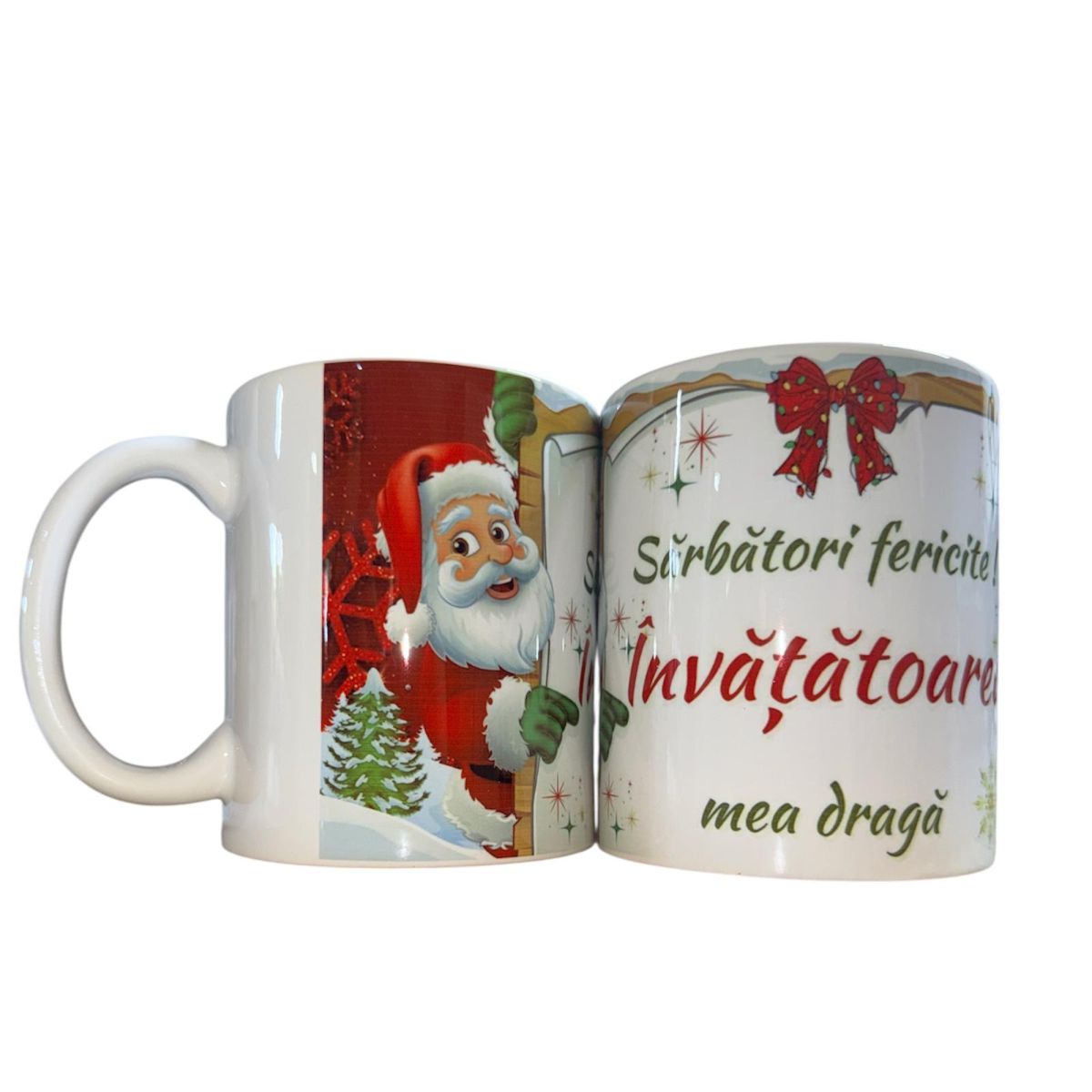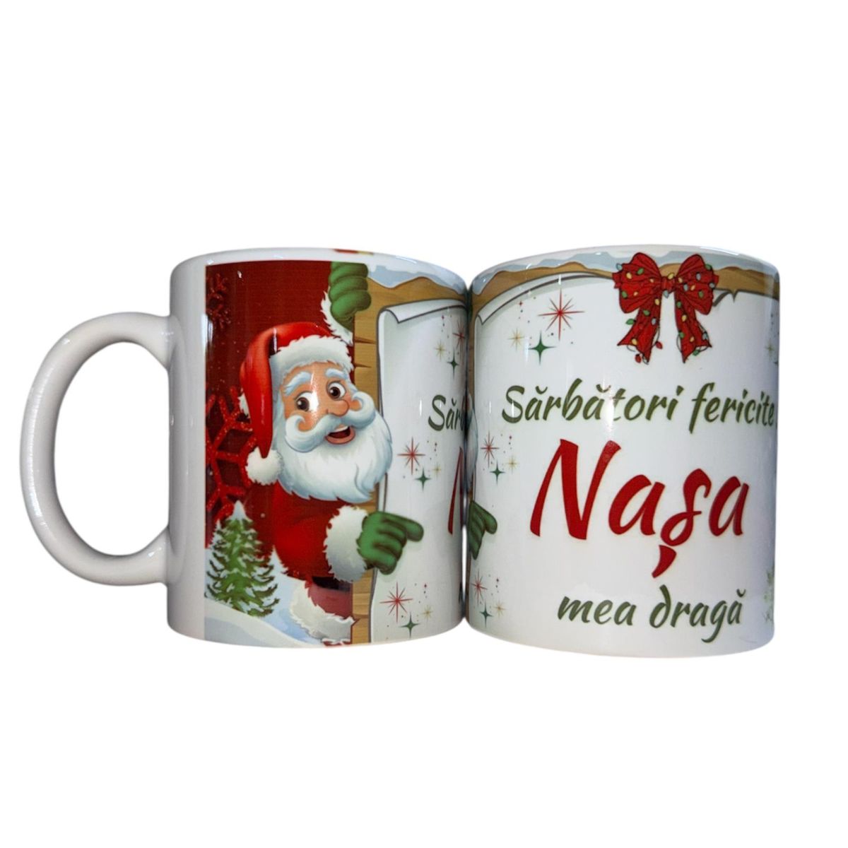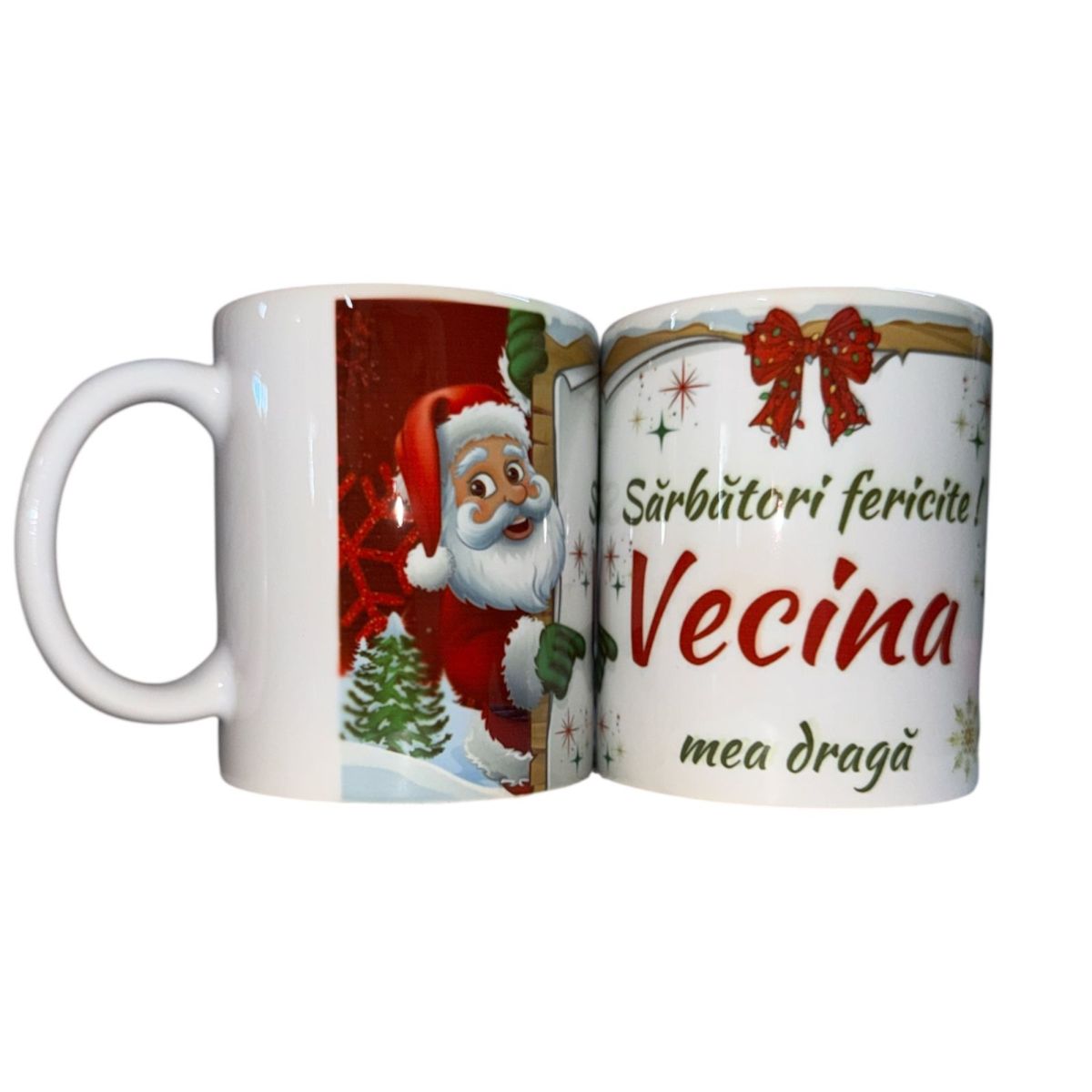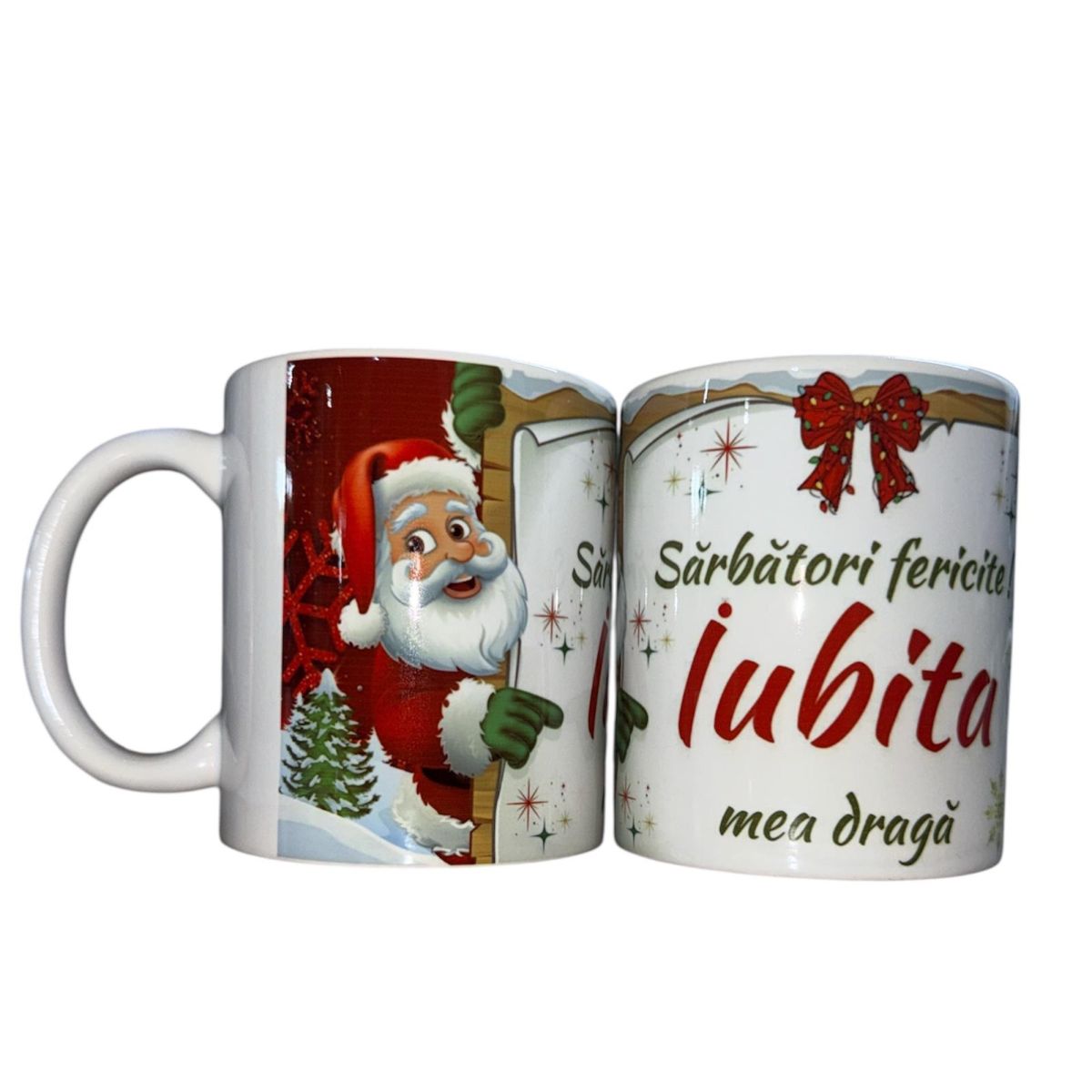 Această cană intensifică plăcerea de a-ți bea cafeaua în fiecare dimineață sau poate fi un cadou deosebit pentru o persoană dragă sau orice rudă apropiată fiind personalizată cu mesajul “ Sărbători fericite ! Pentru…….. dragă“