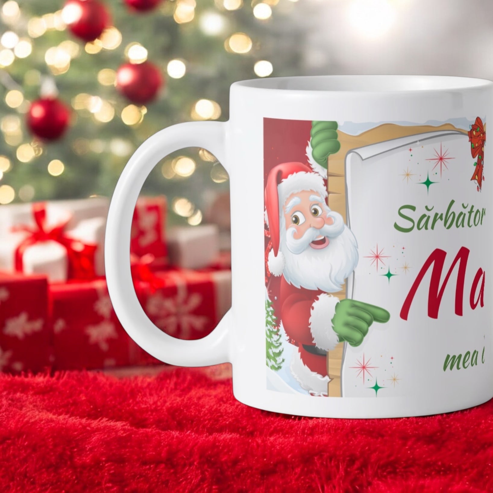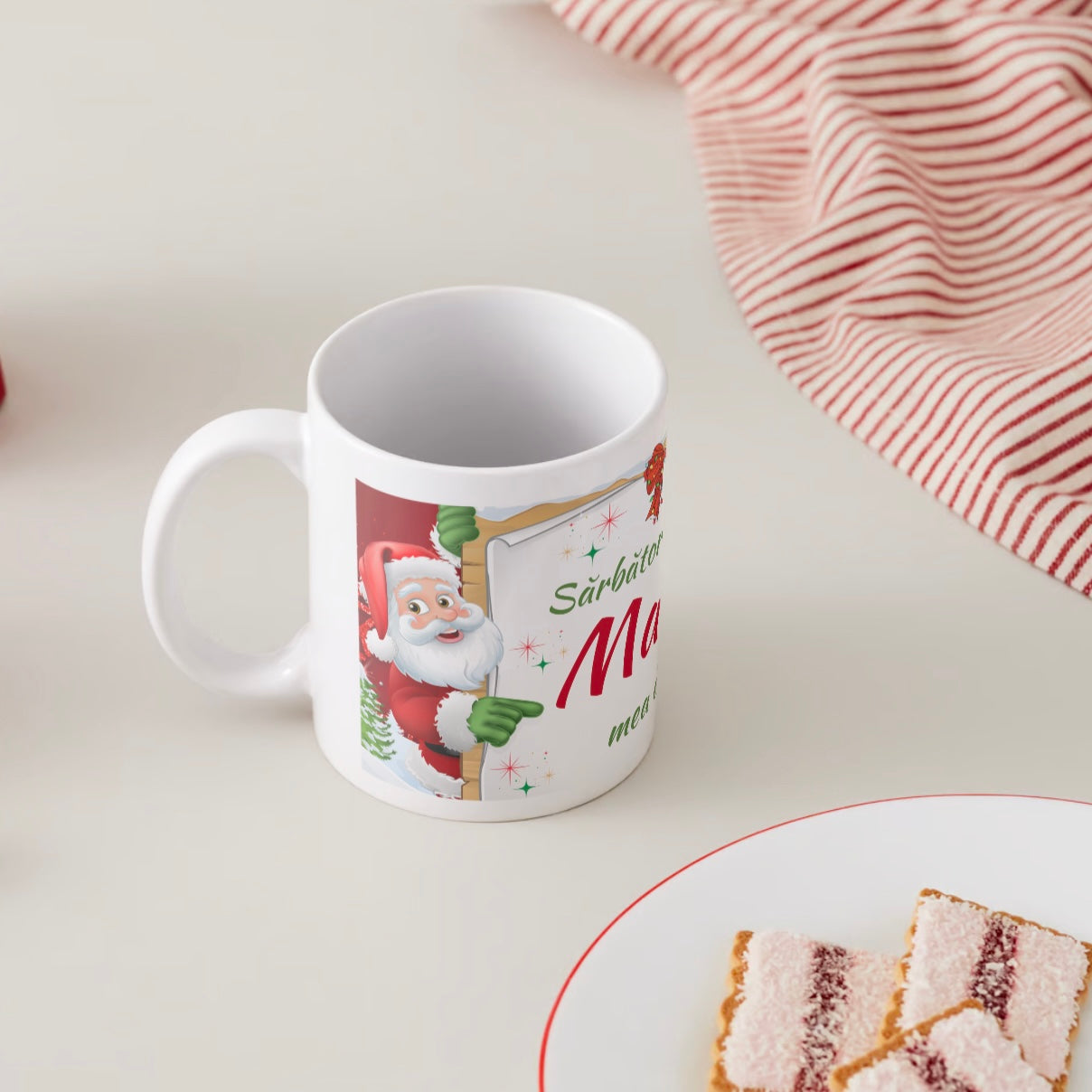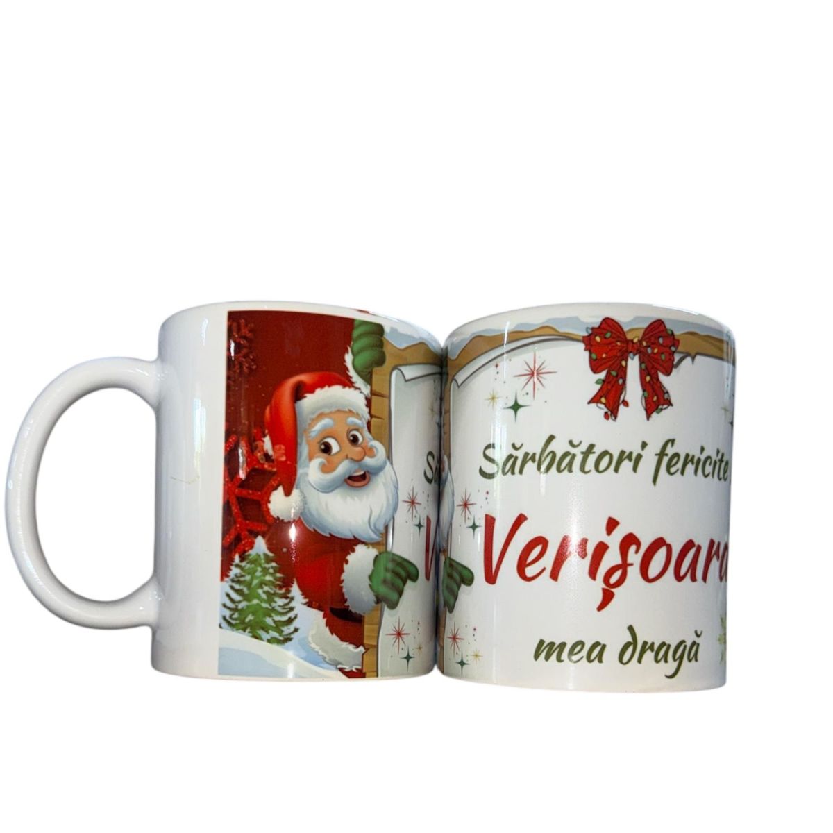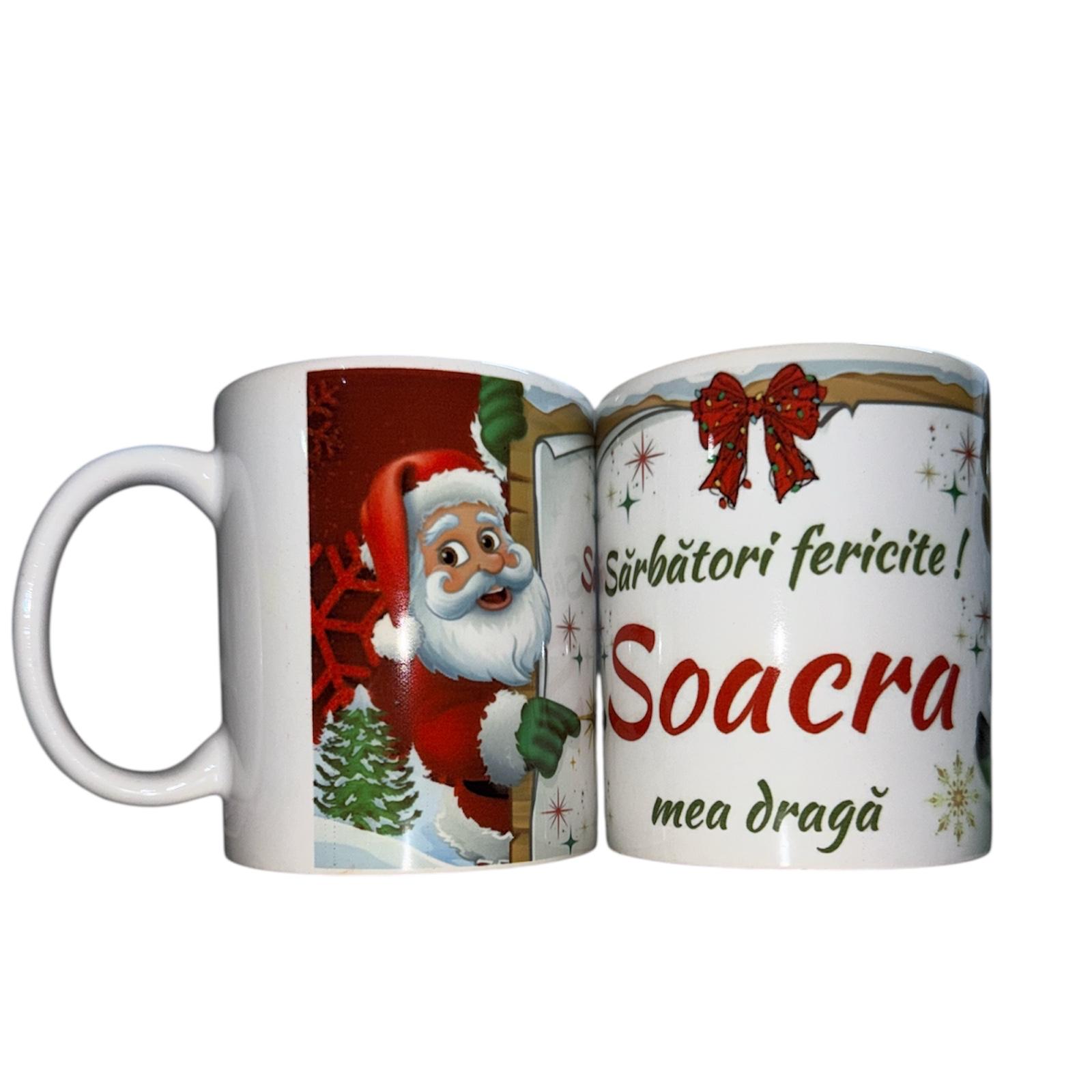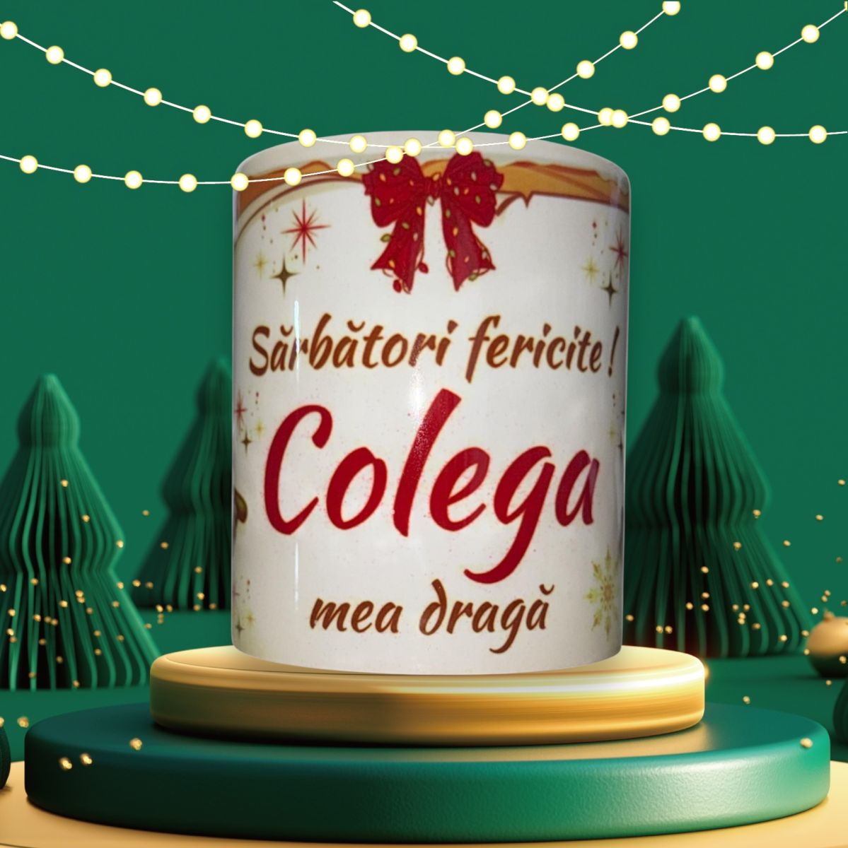 Această cană intensifică plăcerea de a-ți bea cafeaua în fiecare dimineață sau poate fi un cadou deosebit pentru o persoană dragă sau orice rudă apropiată fiind personalizată cu mesajul “ Sărbători fericite ! Pentru…….. dragă“
