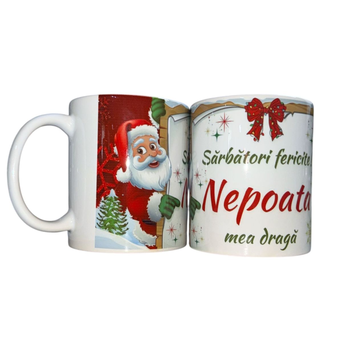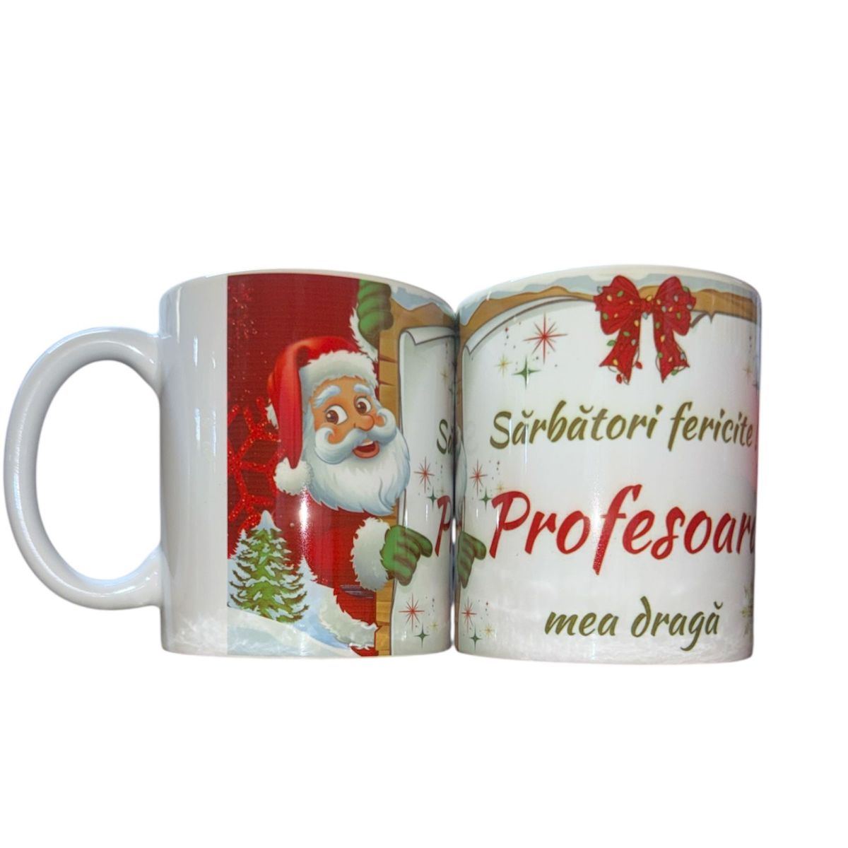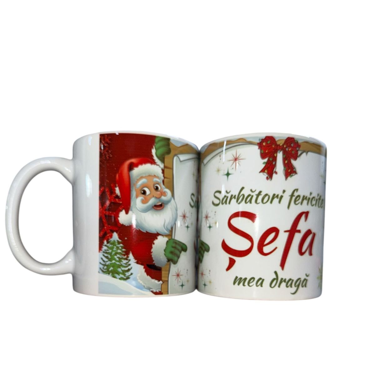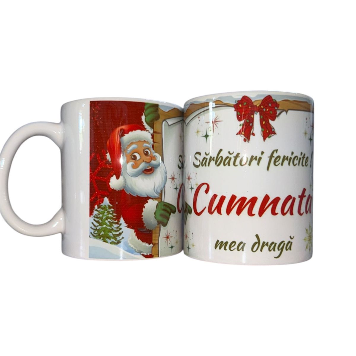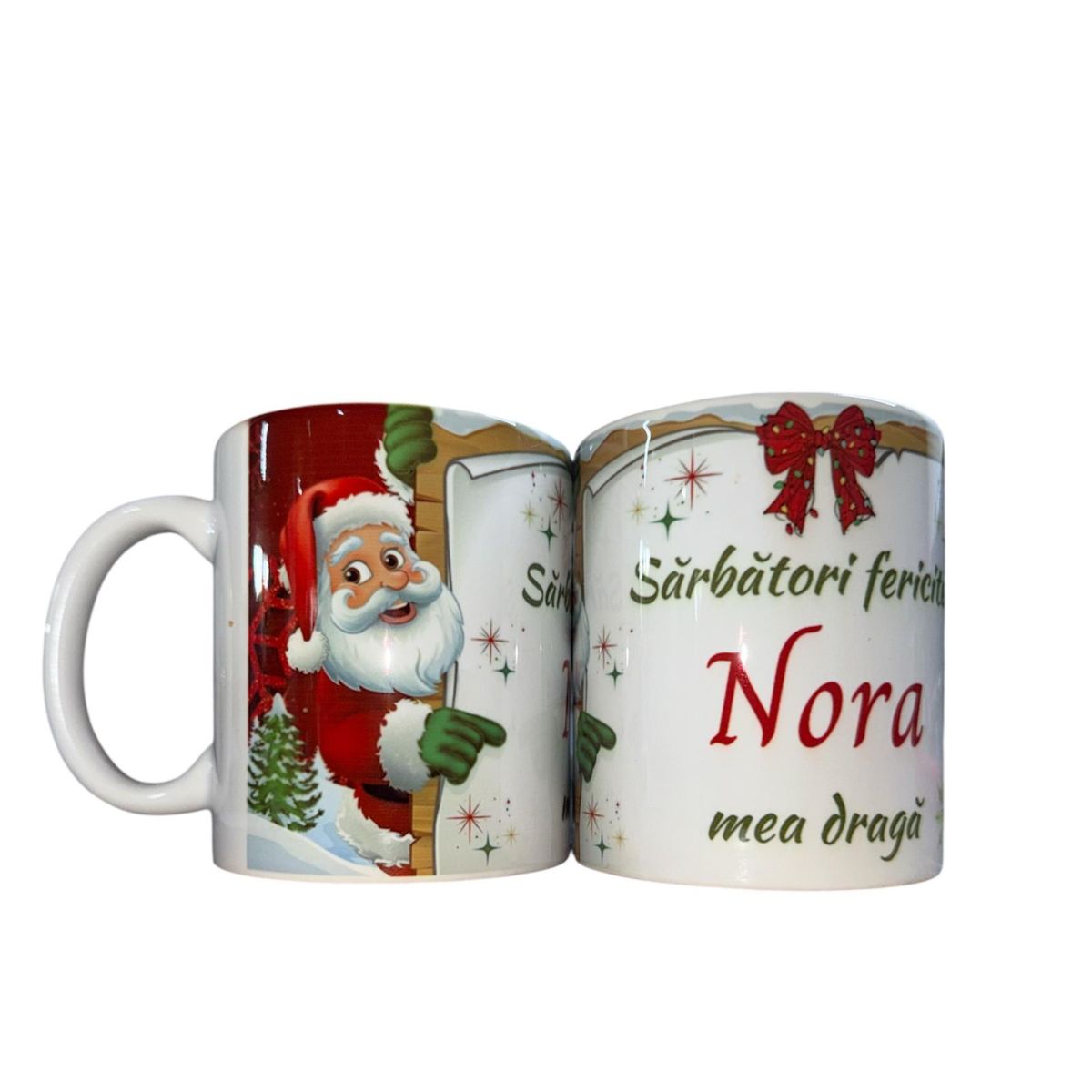 Această cană intensifică plăcerea de a-ți bea cafeaua în fiecare dimineață sau poate fi un cadou deosebit pentru o persoană dragă sau orice rudă apropiată fiind personalizată cu mesajul “ Sărbători fericite ! Pentru…….. dragă“