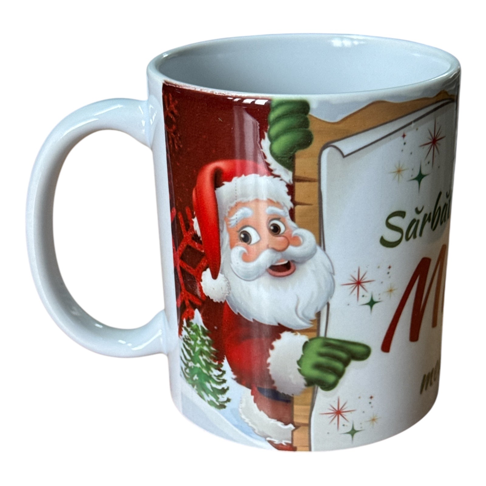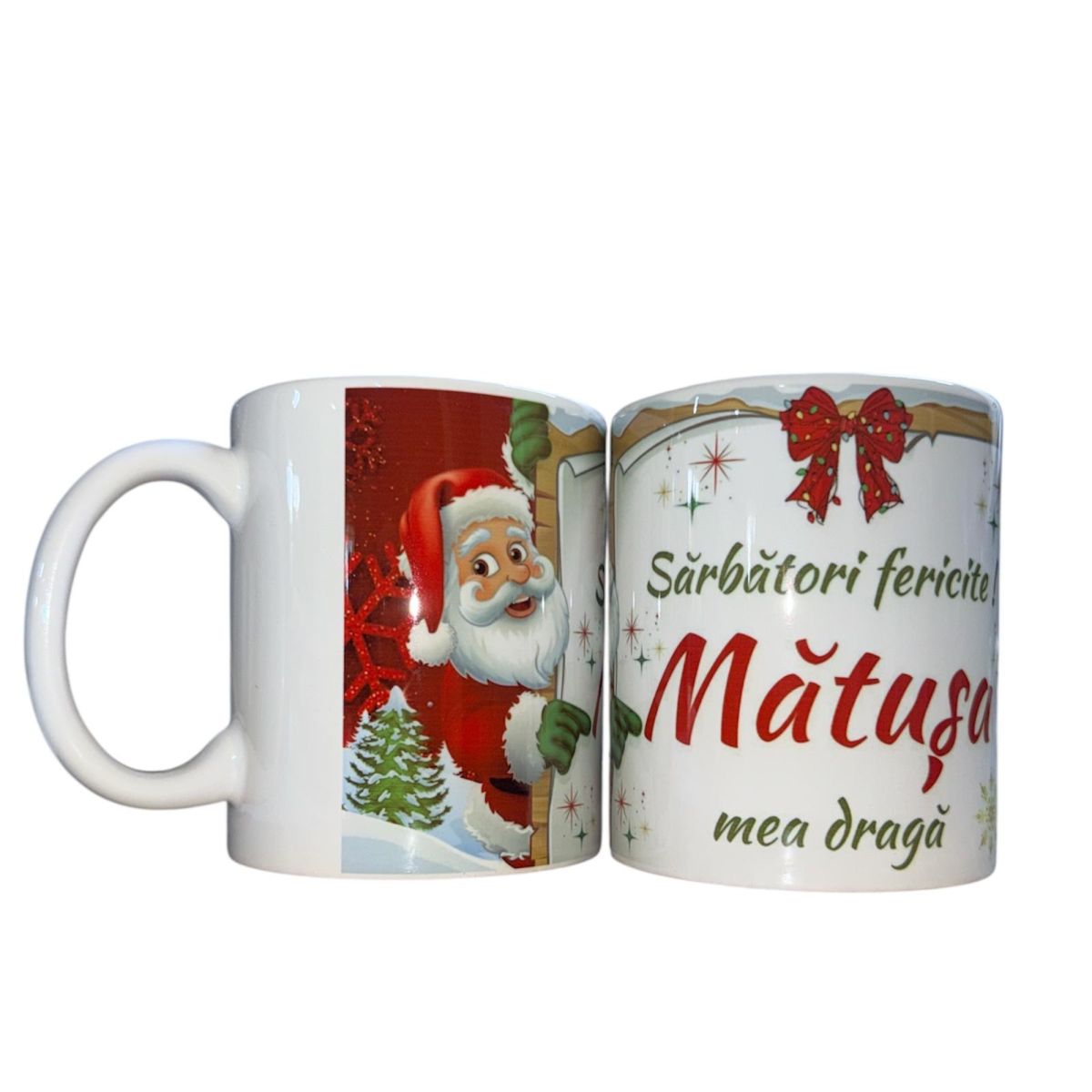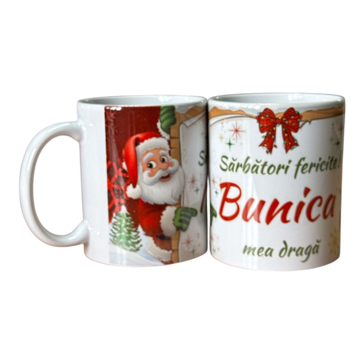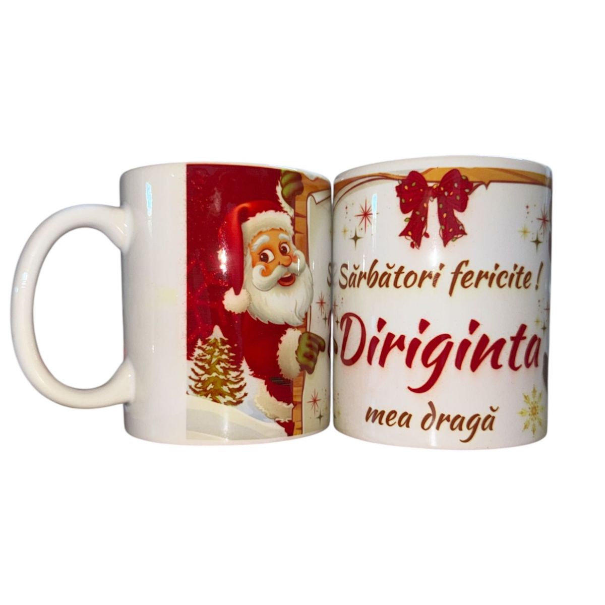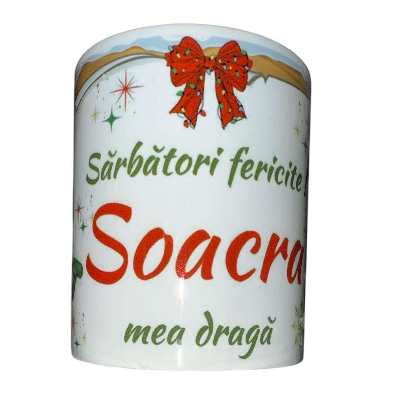 Această cană intensifică plăcerea de a-ți bea cafeaua în fiecare dimineață sau poate fi un cadou deosebit pentru o persoană dragă sau orice rudă apropiată fiind personalizată cu mesajul “ Sărbători fericite ! Pentru…….. dragă“