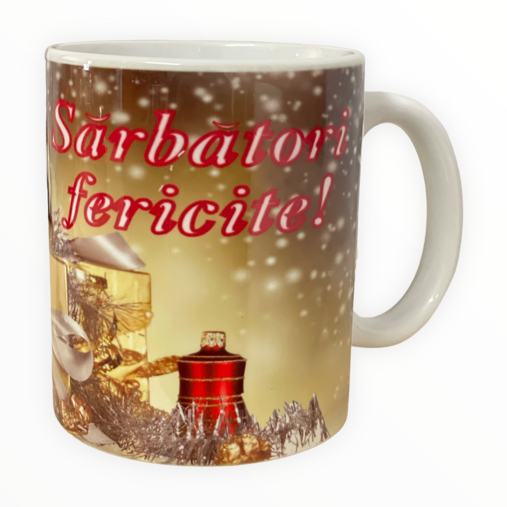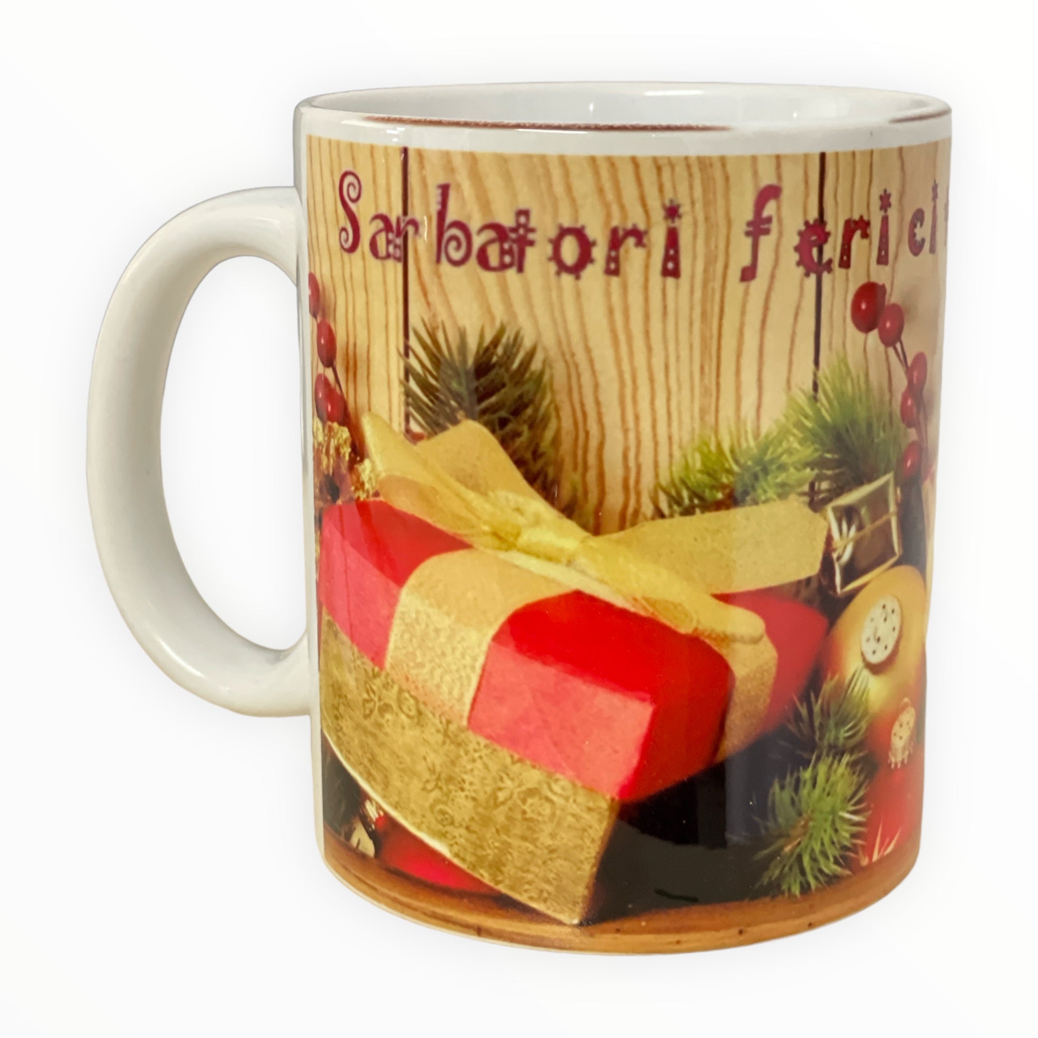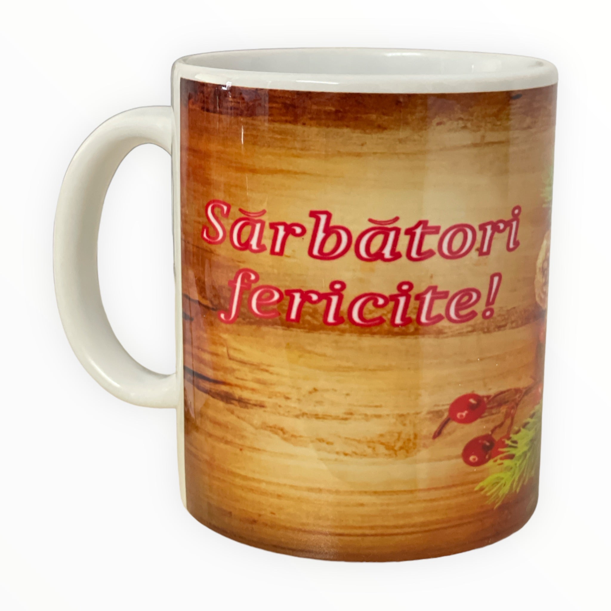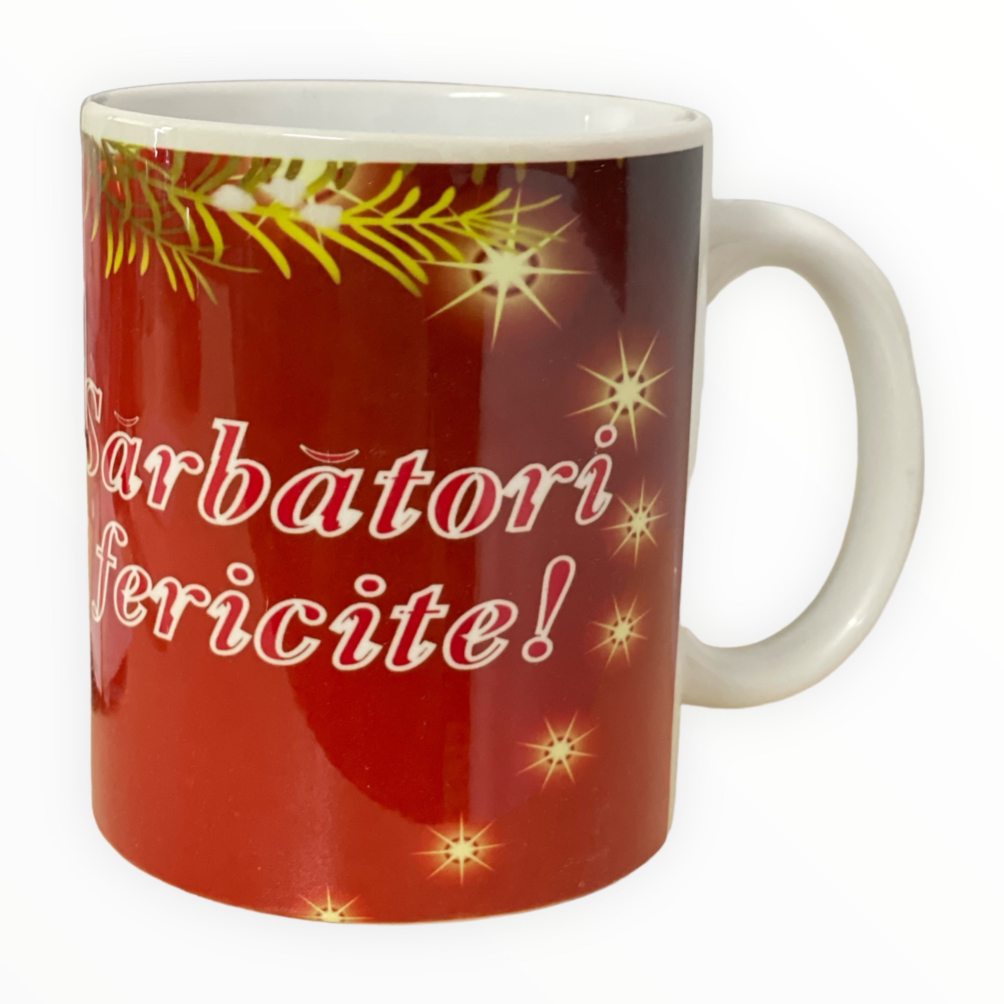 Aceasta cană intensifică plăcerea de a-ți bea cafeaua în fiecare dimineață sau poate fi un cadou deosebit pentru o persoană dragă sau orice rudă apropiată fiind personalizată cu mesajul “ Sărbători fericite !”