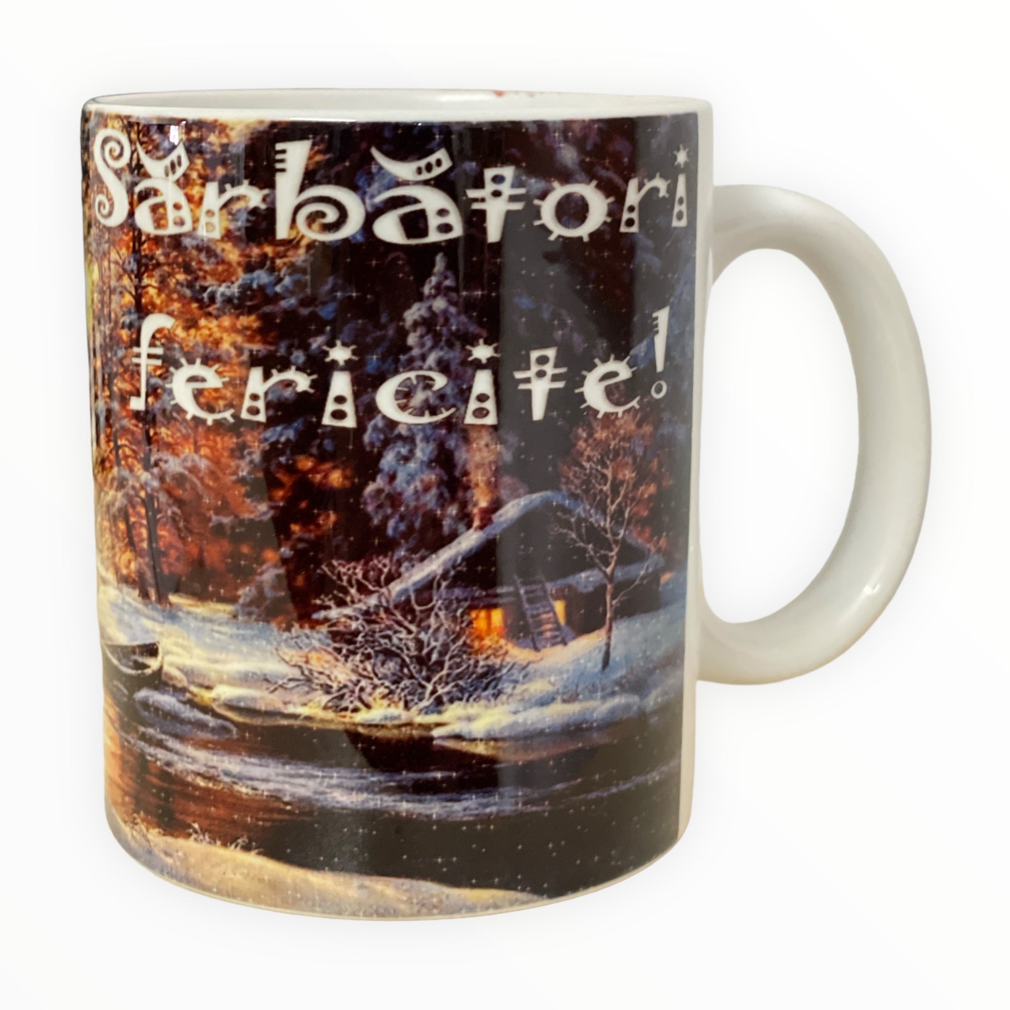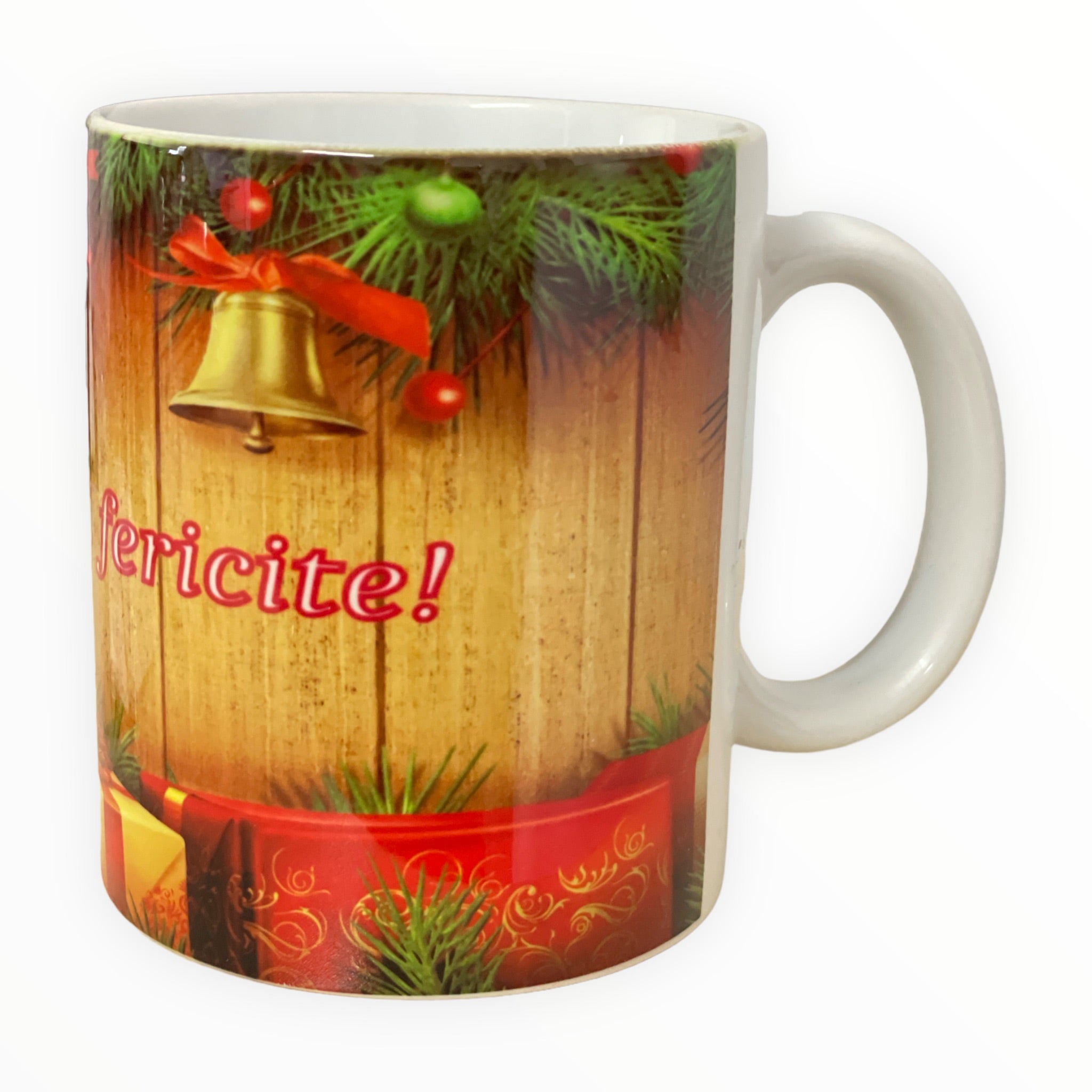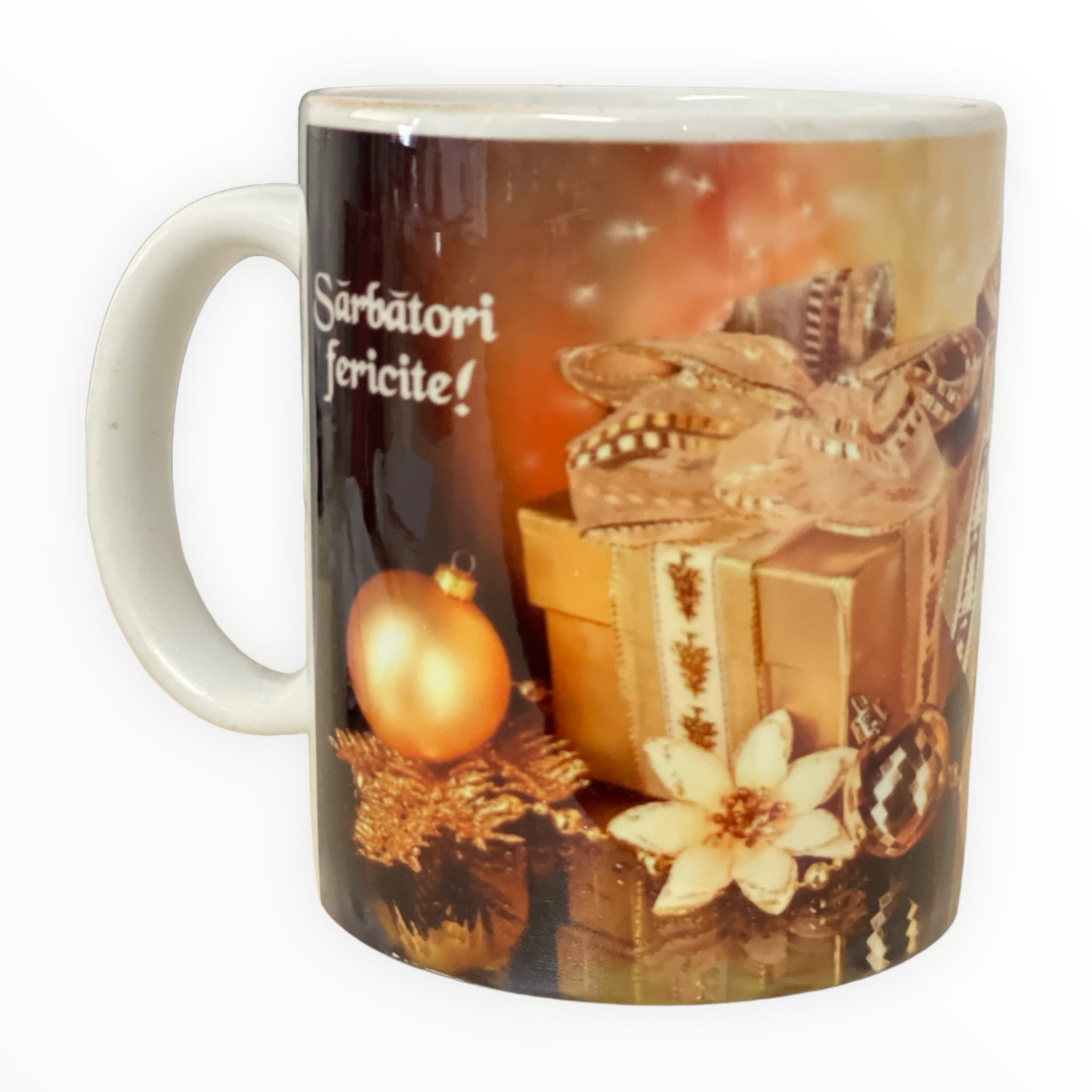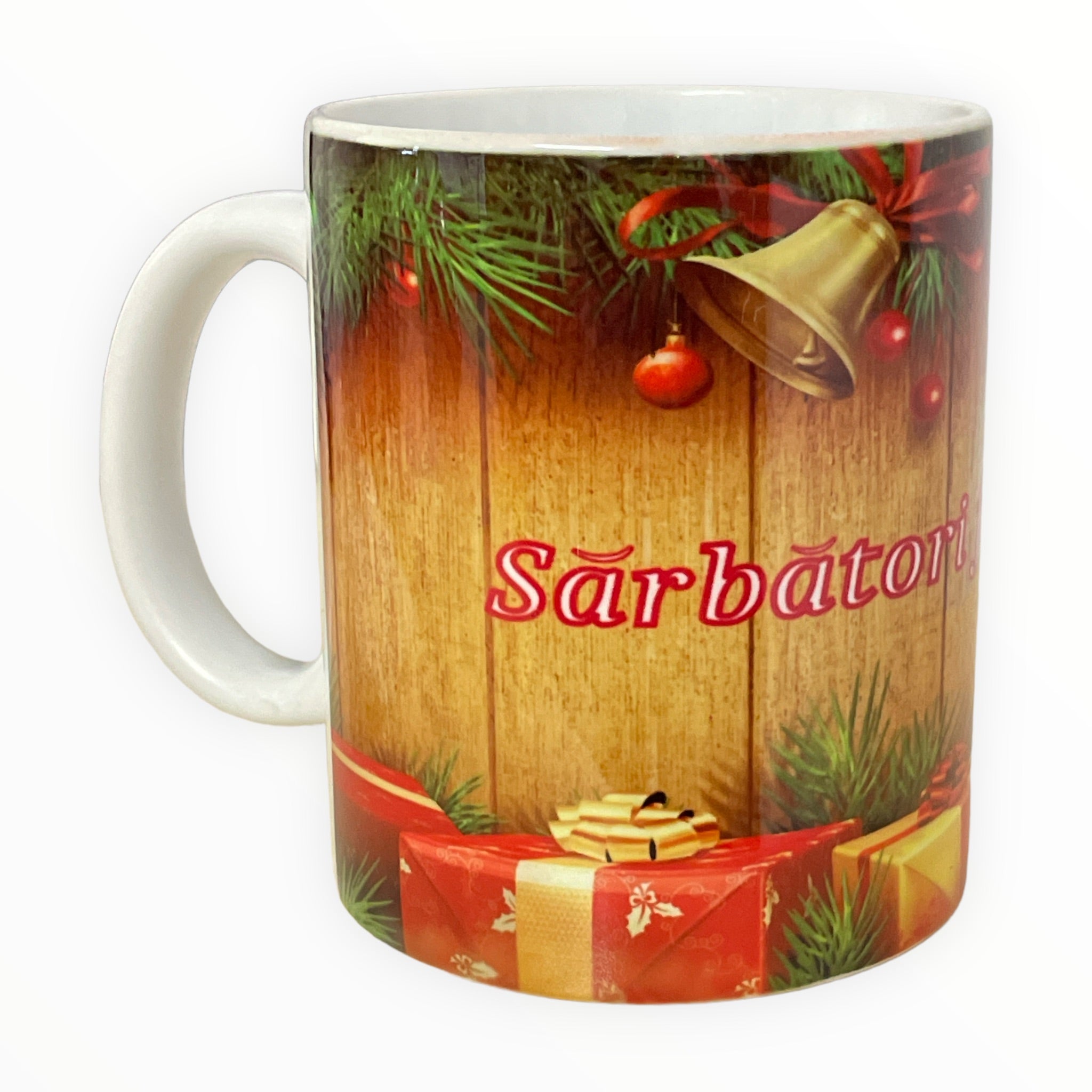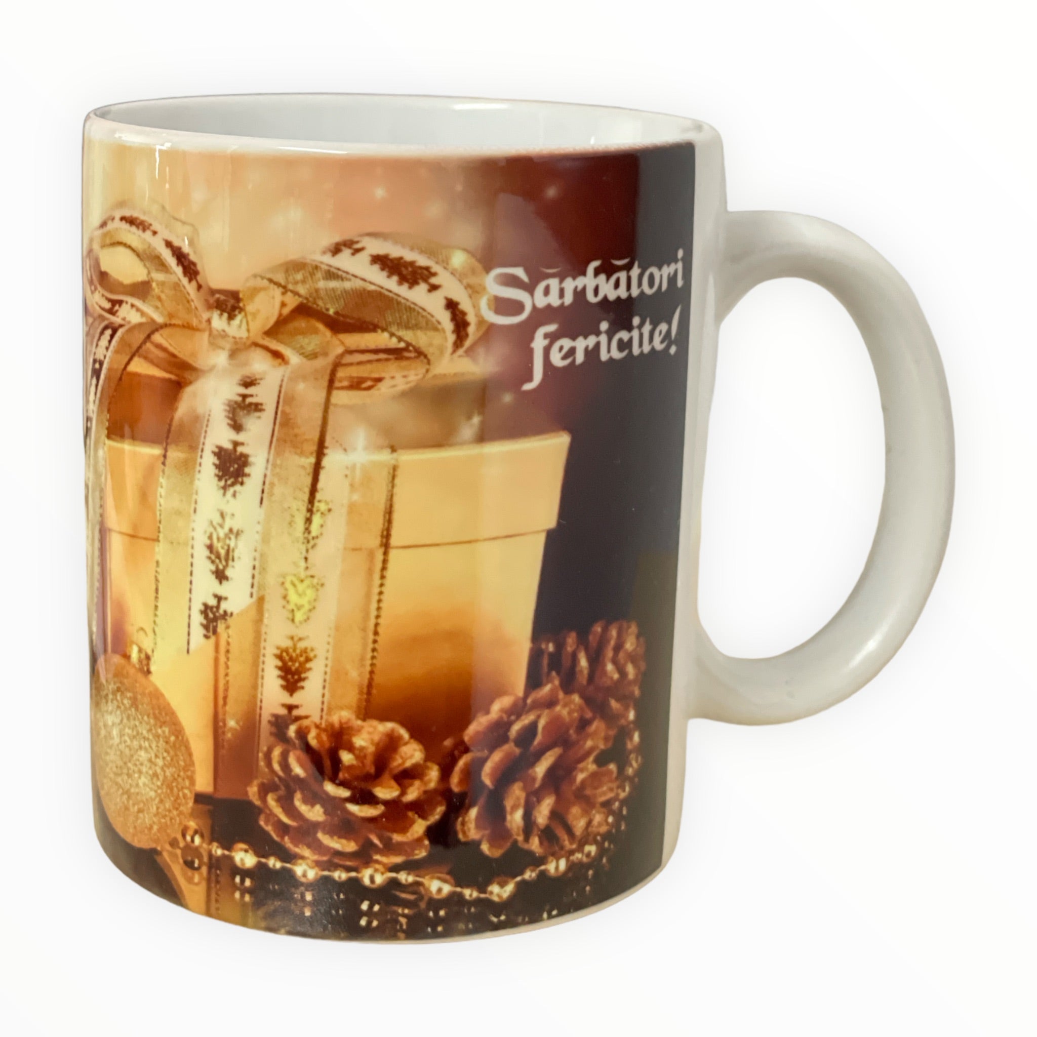 Aceasta cană intensifică plăcerea de a-ți bea cafeaua în fiecare dimineață sau poate fi un cadou deosebit pentru o persoană dragă sau orice rudă apropiată fiind personalizată cu mesajul “ Sărbători fericite !”