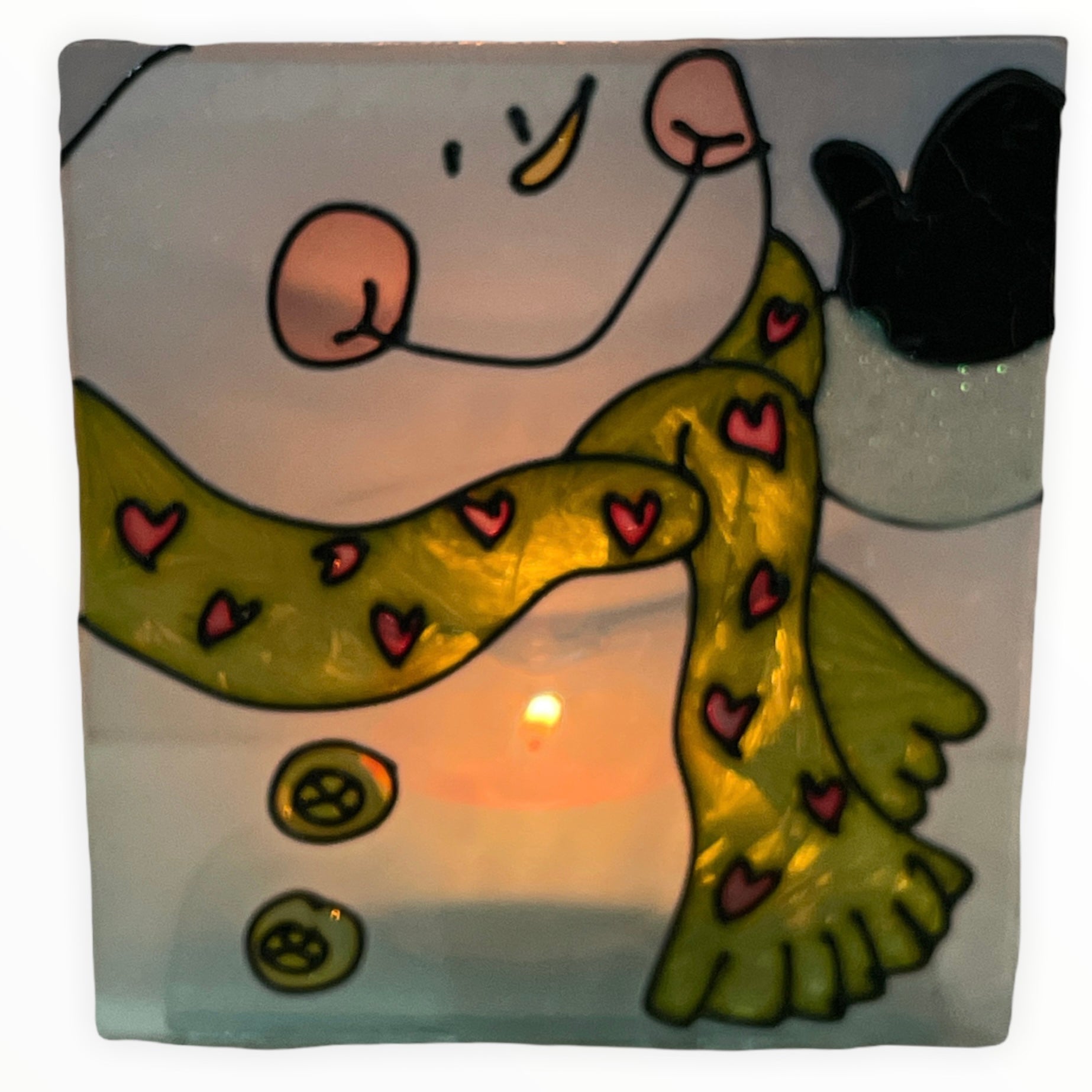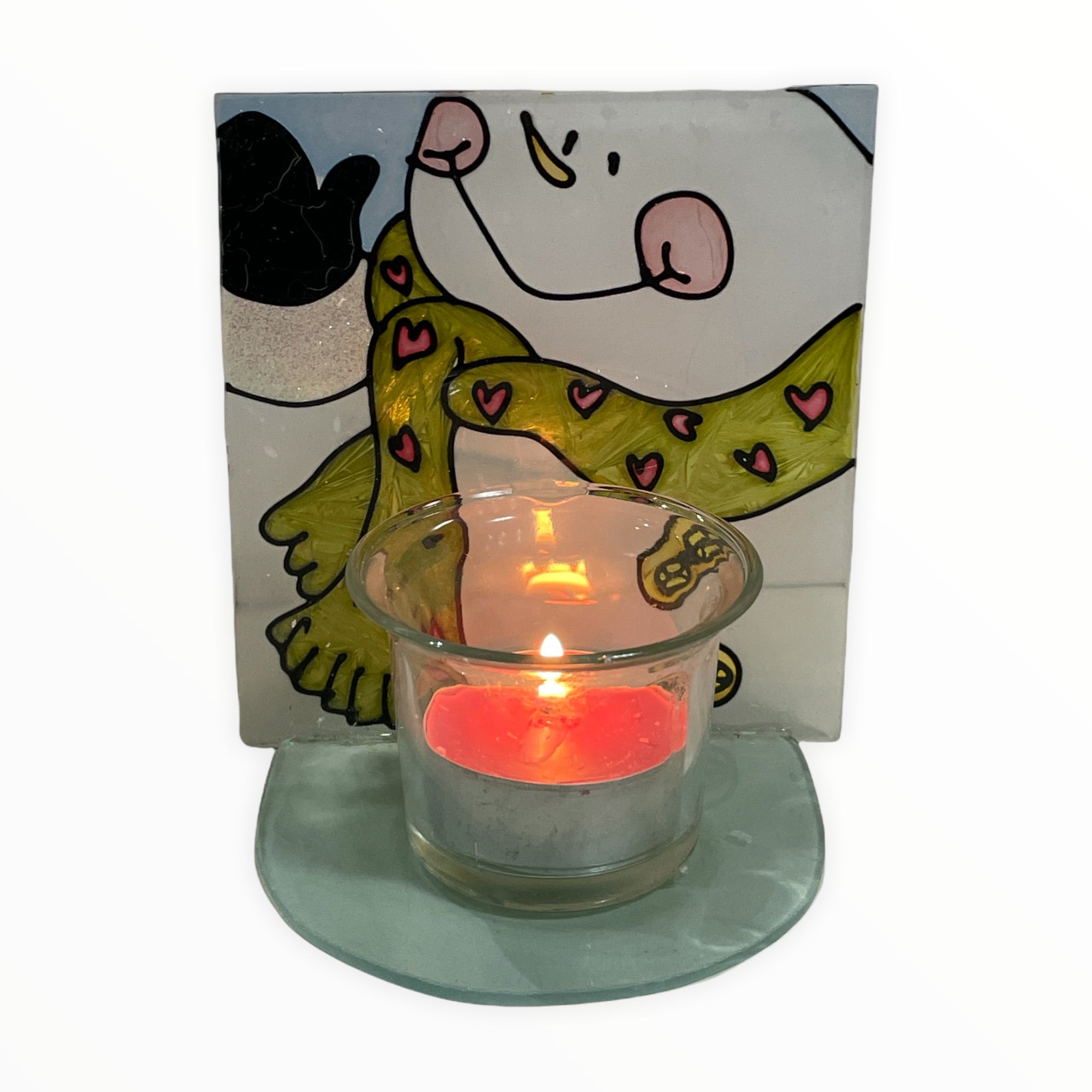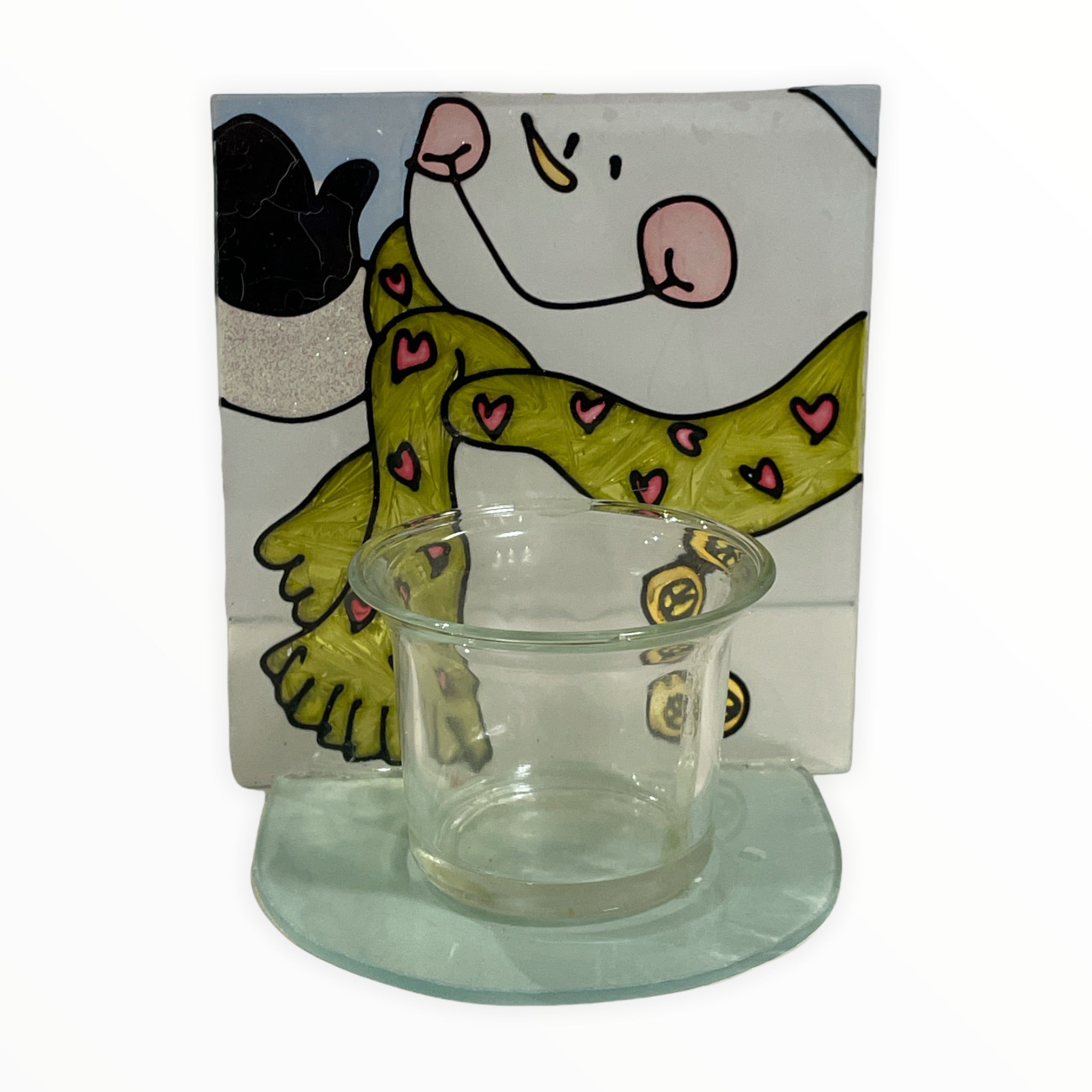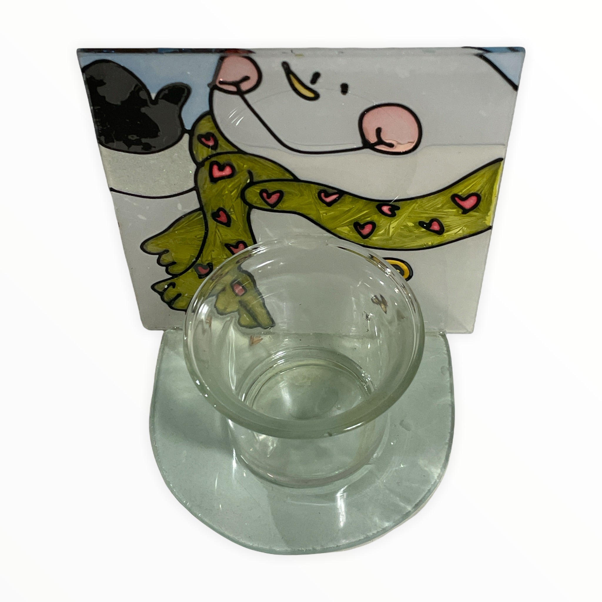 - Realizat din sticlă rezistentă, suportul are un design de iarnă cu un om de zăpadă vesel, decorat cu fular verde cu inimioare roșii.