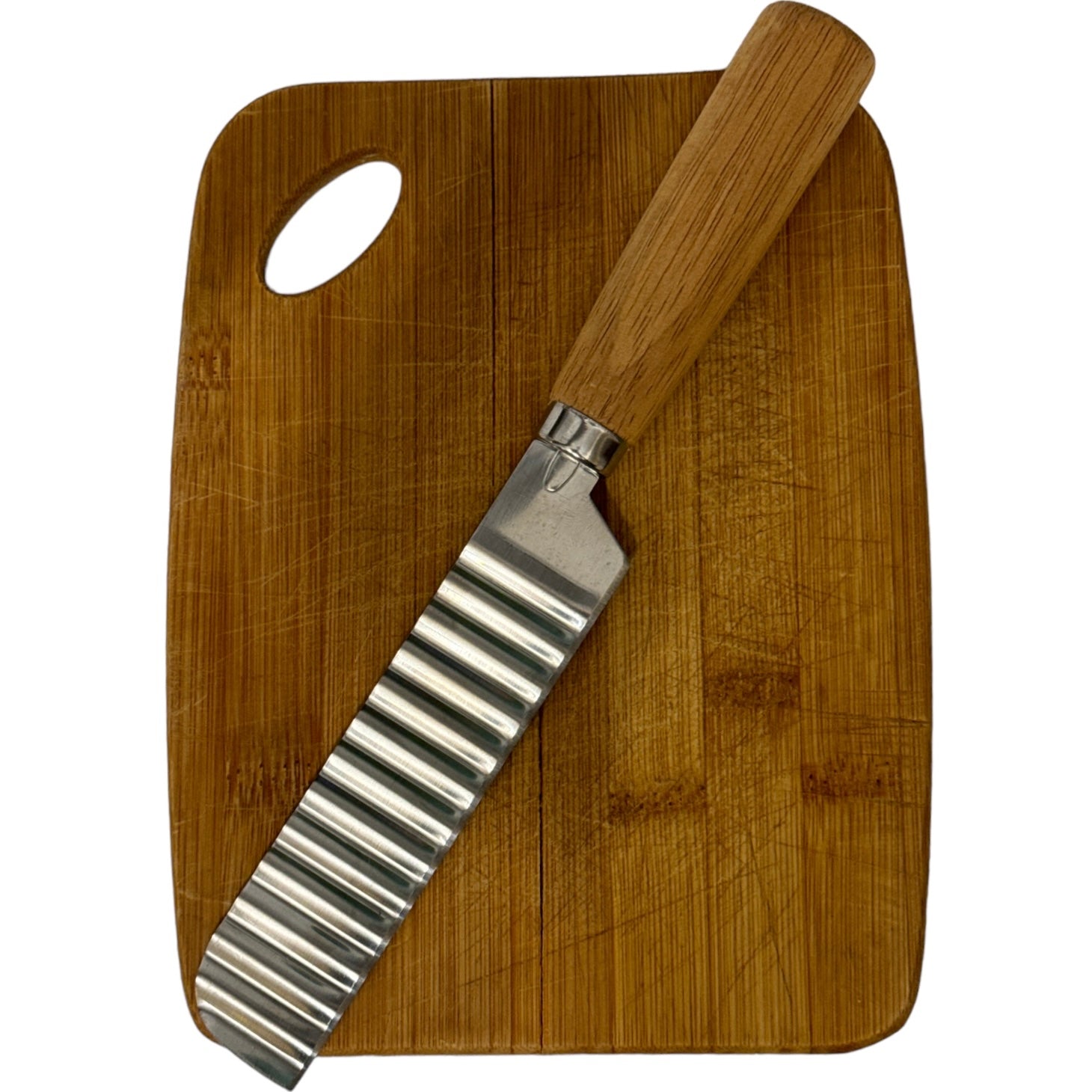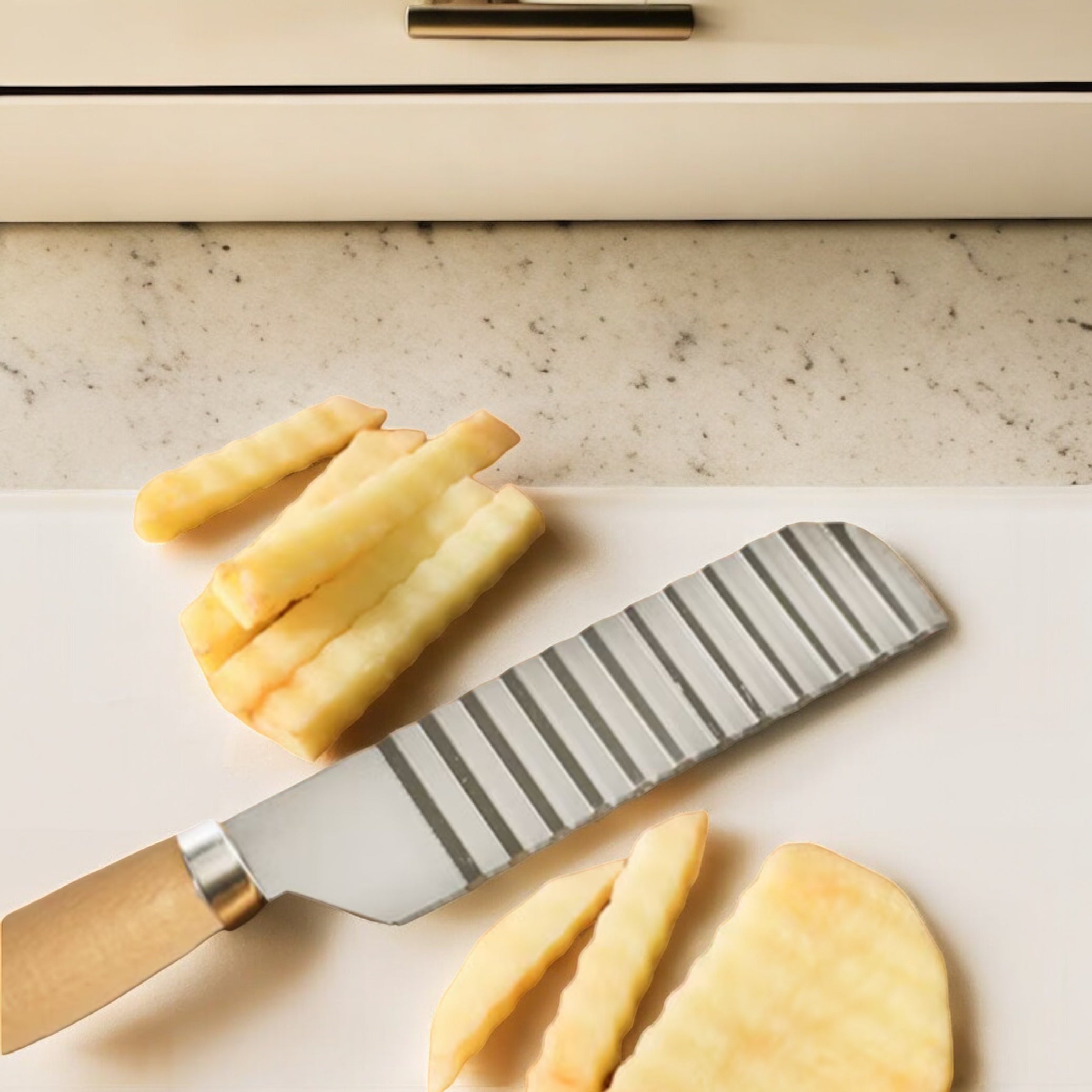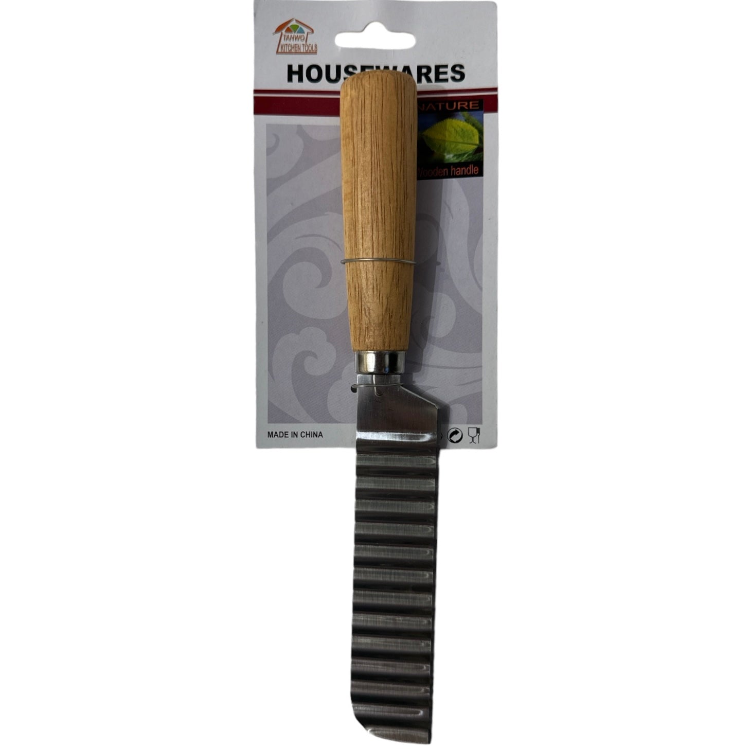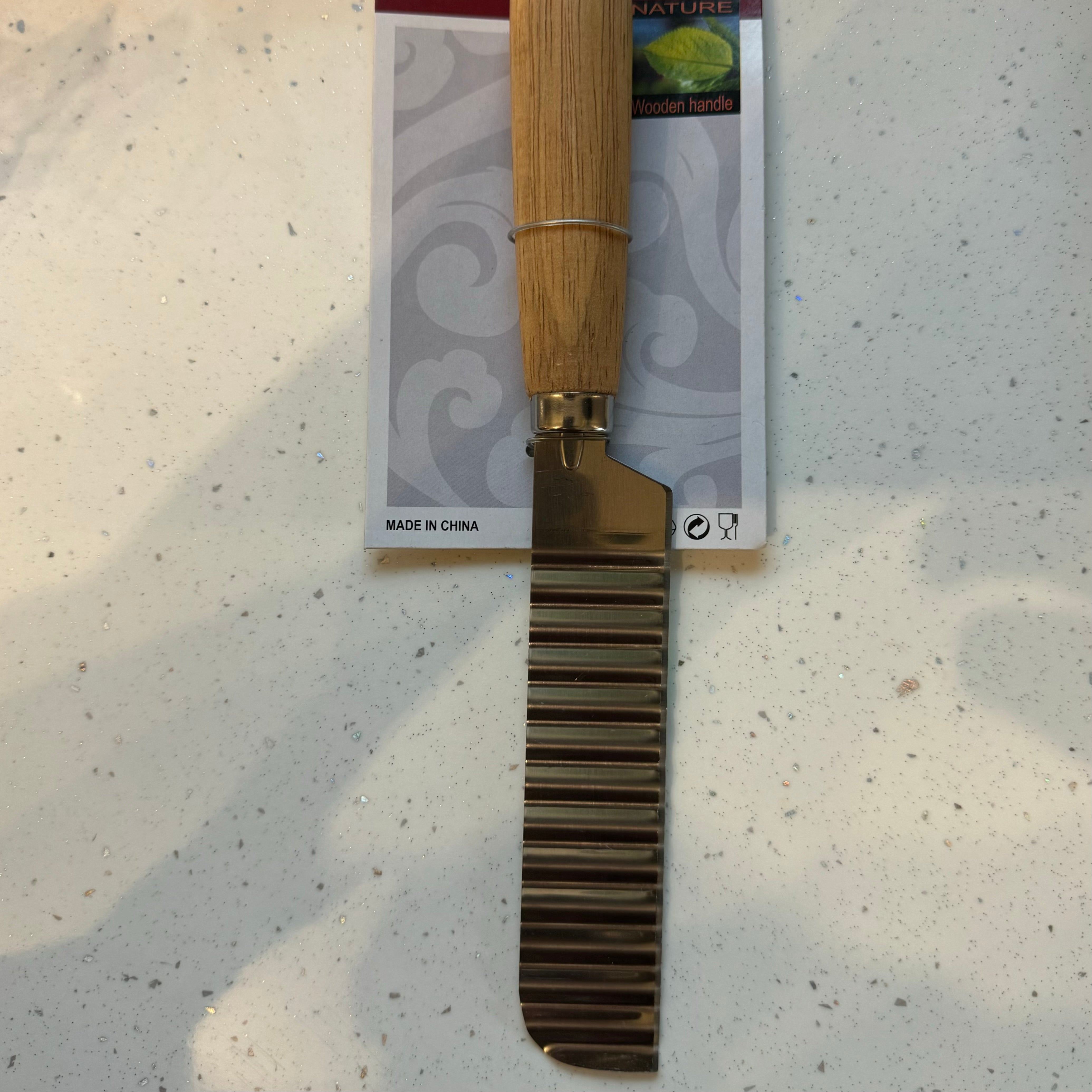 Fabricat din oțel durabil, cu un design ondulat și mâner din lemn, acest cuțit vă permite să tăiați cu ușurință și precis, obținând felii uniforme și atrăgătoare.