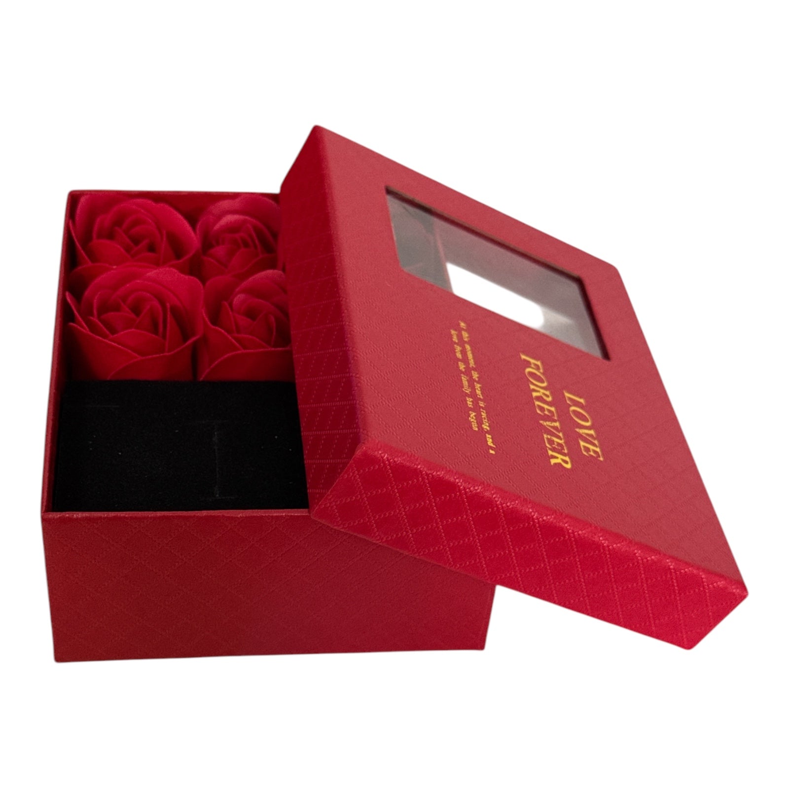 Florile vin ambalate într-o cutie elegantă de carton lucios cu fundiță prevăzută cu un loc special pentru o bijuterie.