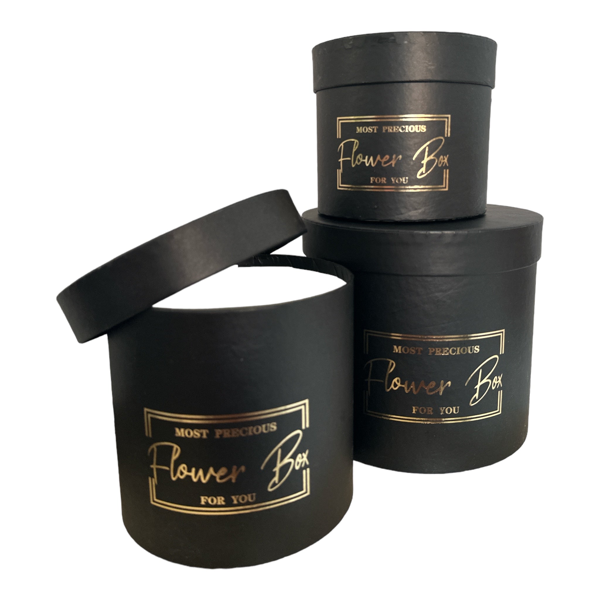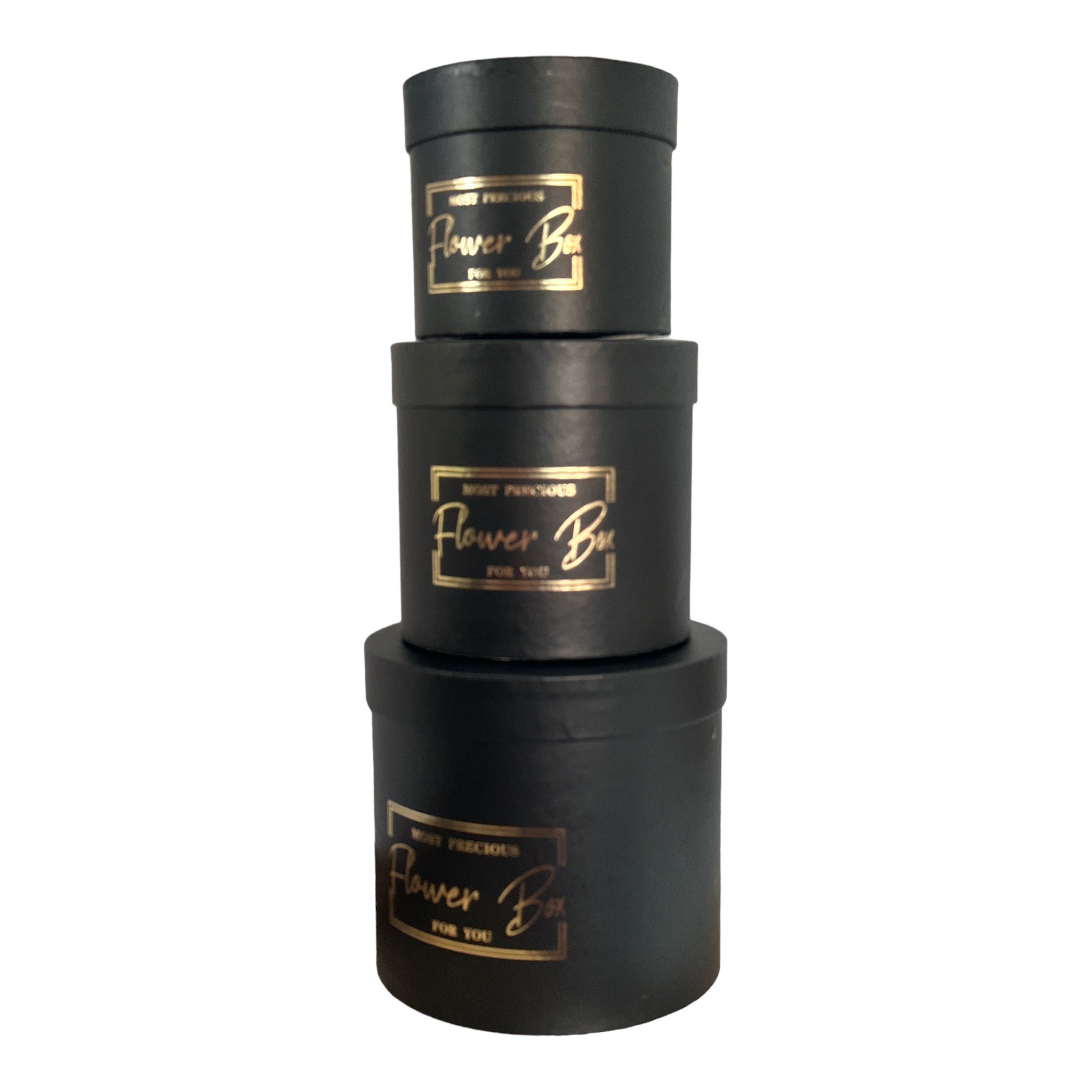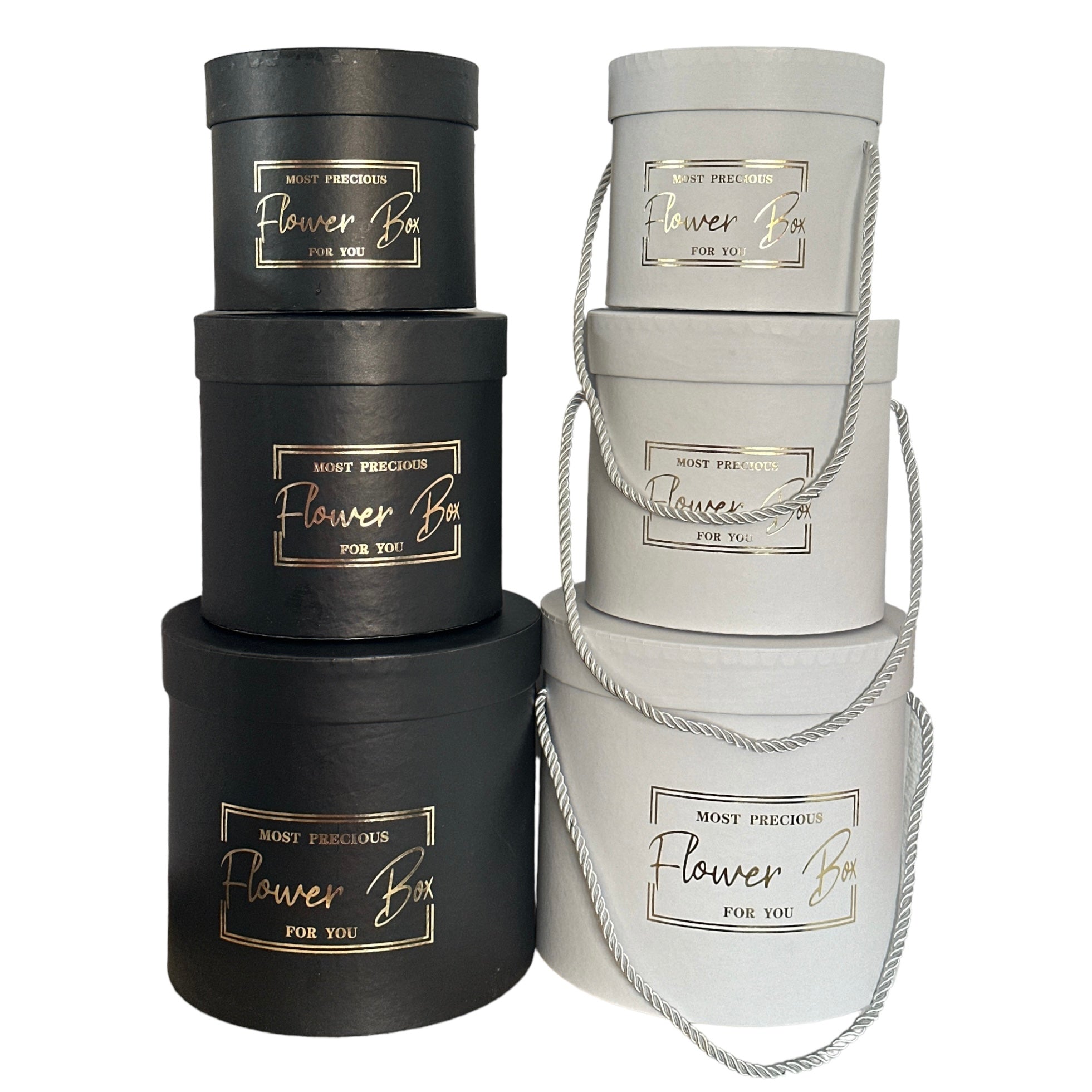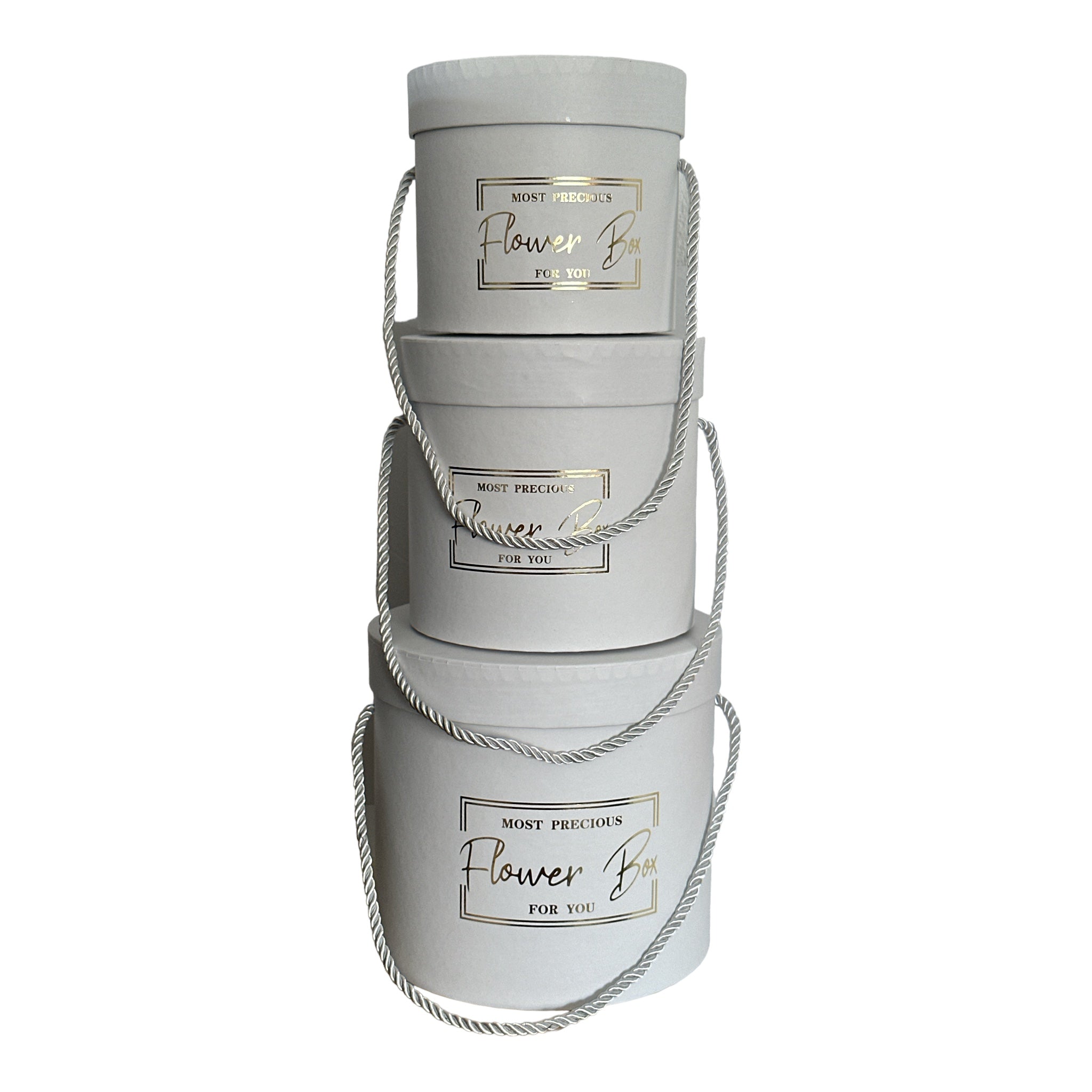 Setul contine 3 cutii din carton rotunde , ideale pentru aranjamente florale . Cutiile mai pot fi folosite si pentru decoratiuni, cadouri si depozitarea unor bijuterii.