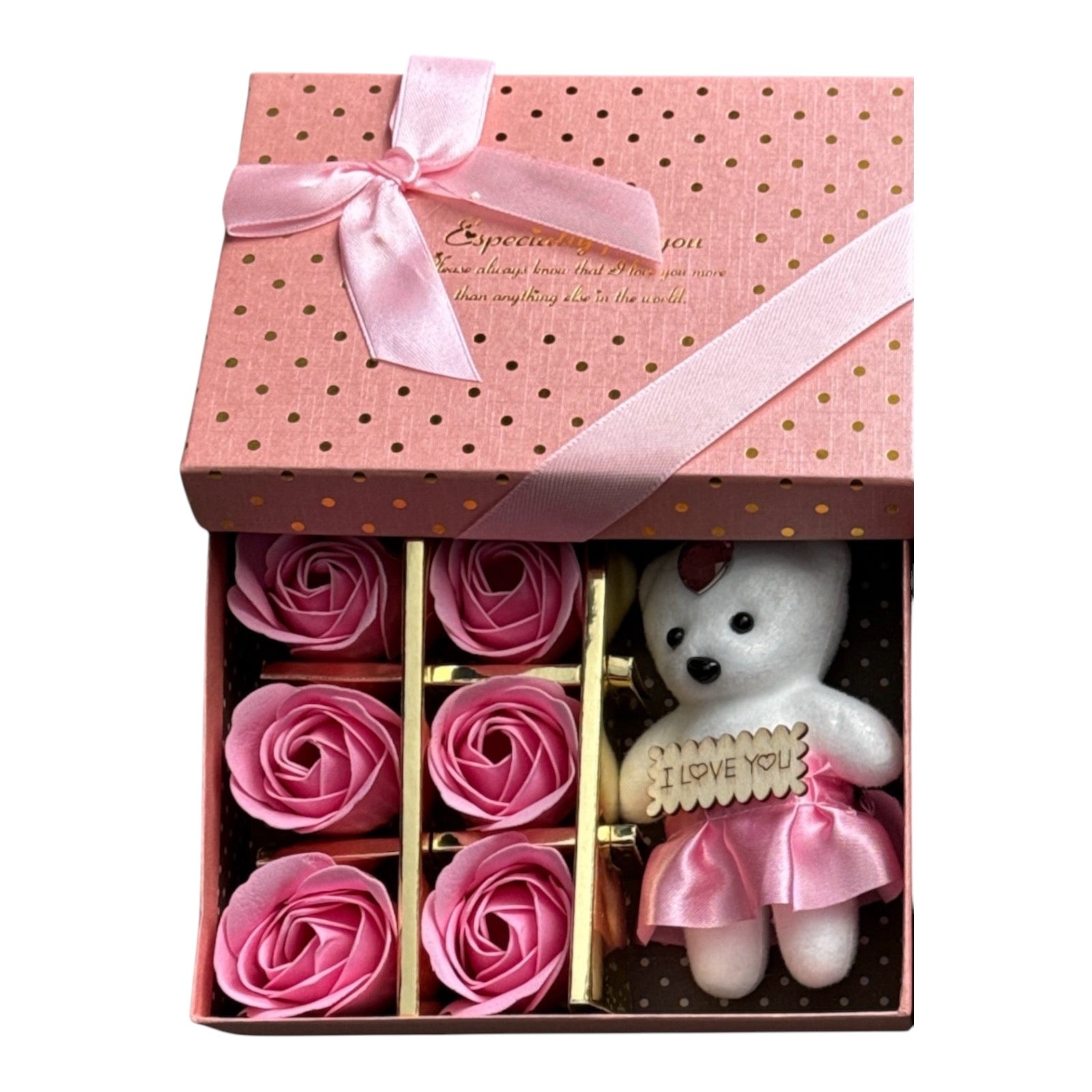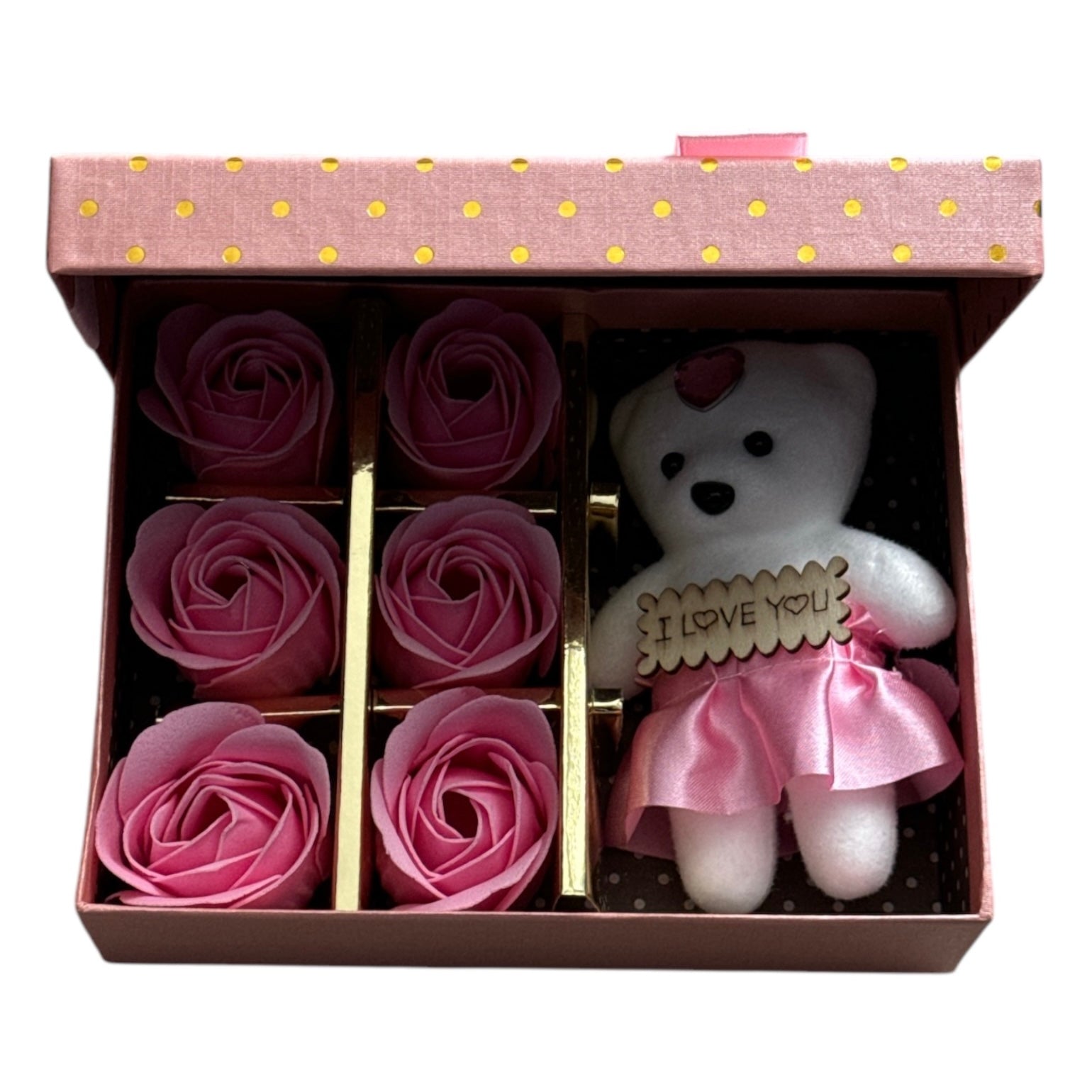 Cutia cu trandafiri de săpun și ursuleț adorabil din pluș poate fi oferită cadou persoanelor dragi .Florile vin ambalate într-o cutie elegantă de carton lucios cu fundiță.
