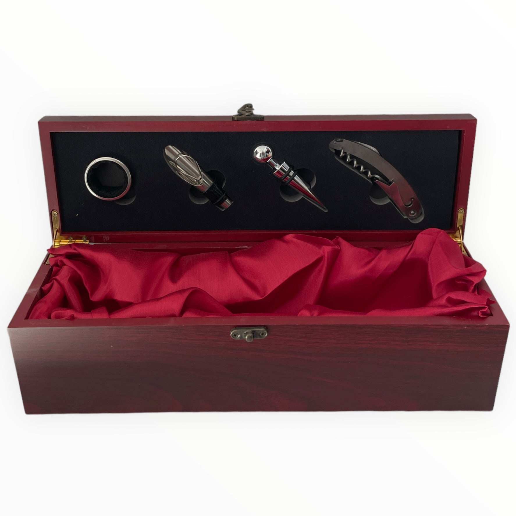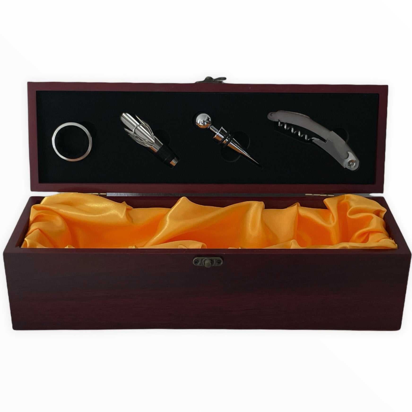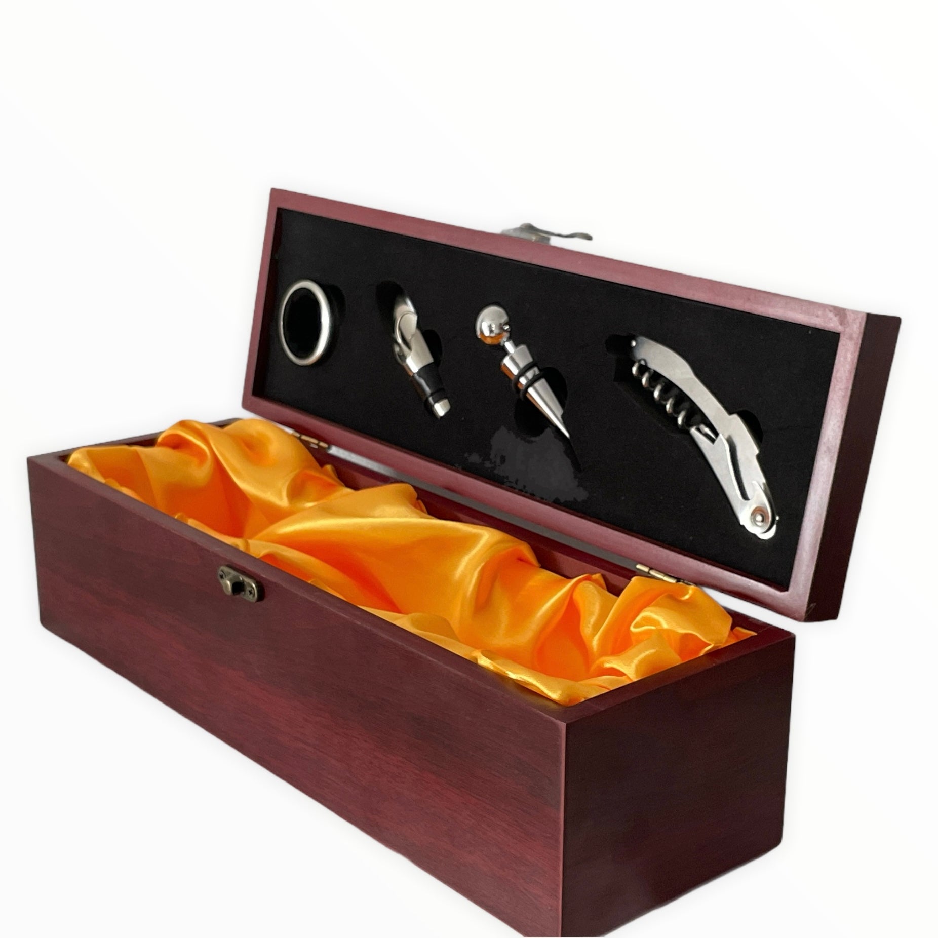 Cutie din lemn pentru o sticla de vin contine 4 accesorii: