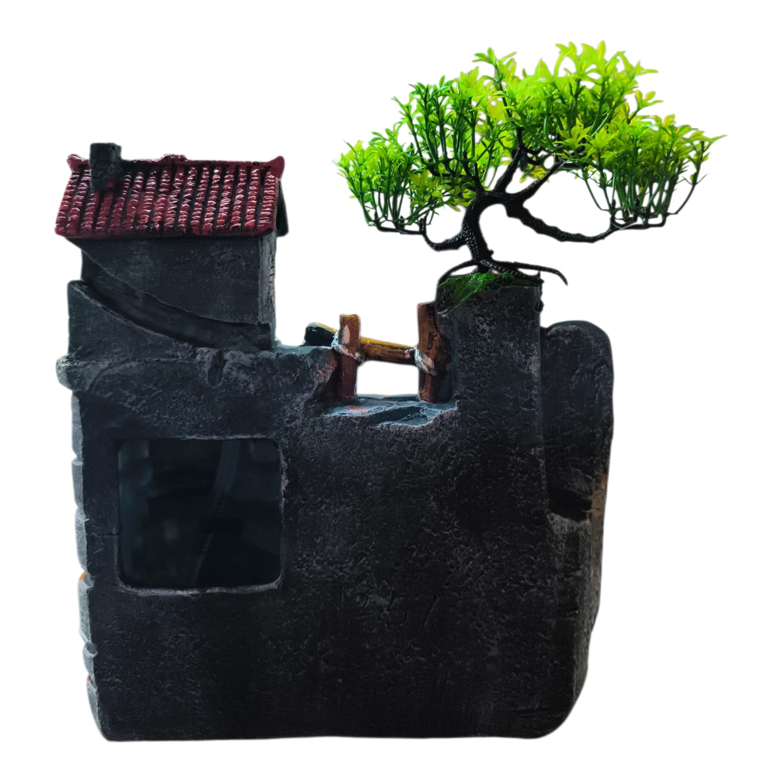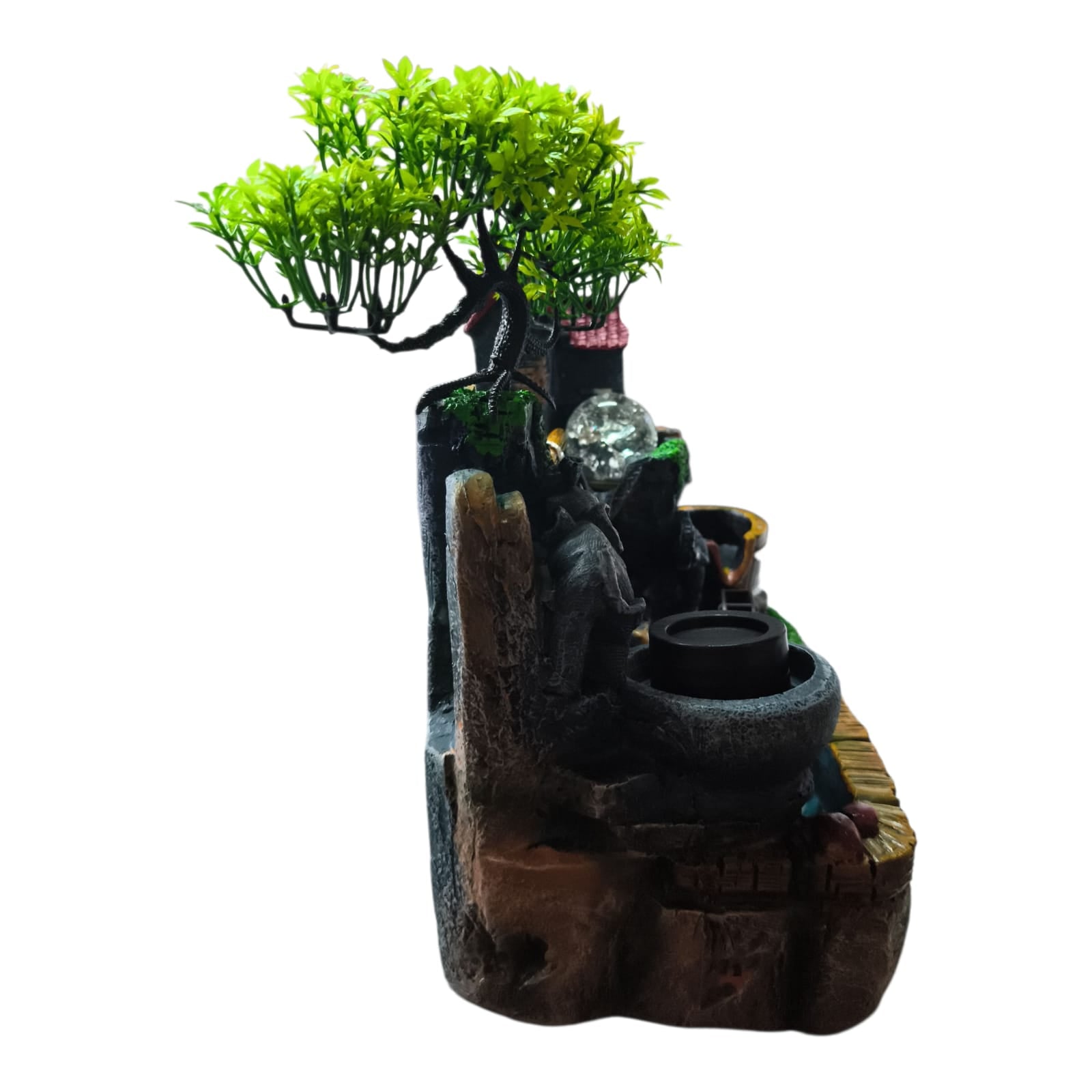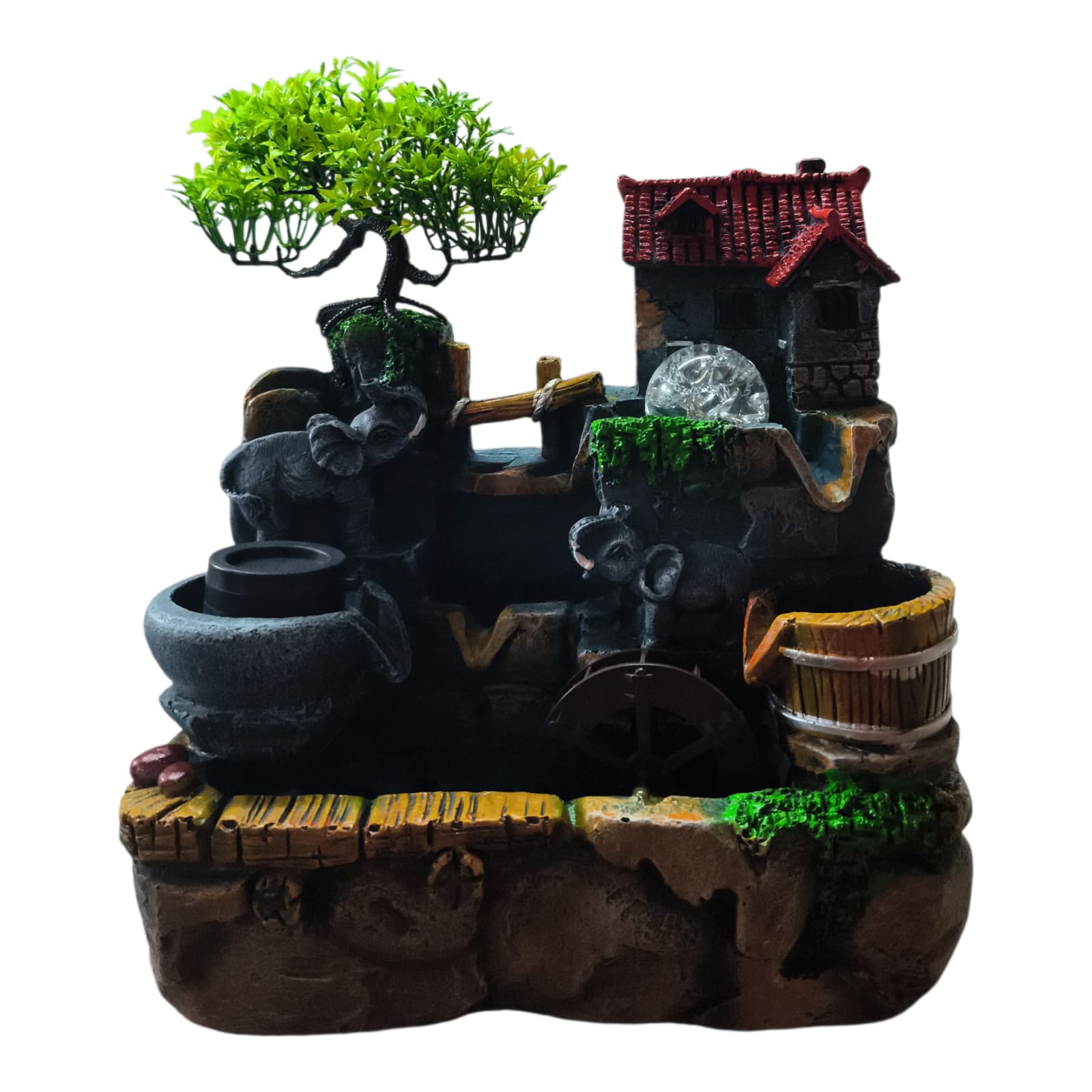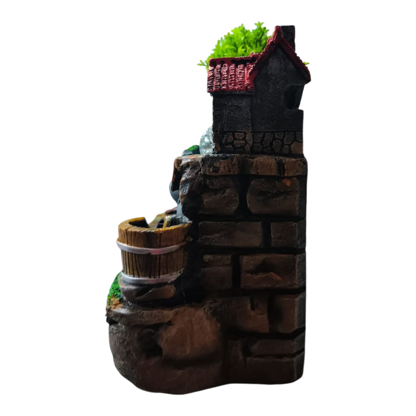 Fântâna este fabricată din polirășină vopsită multicolor.