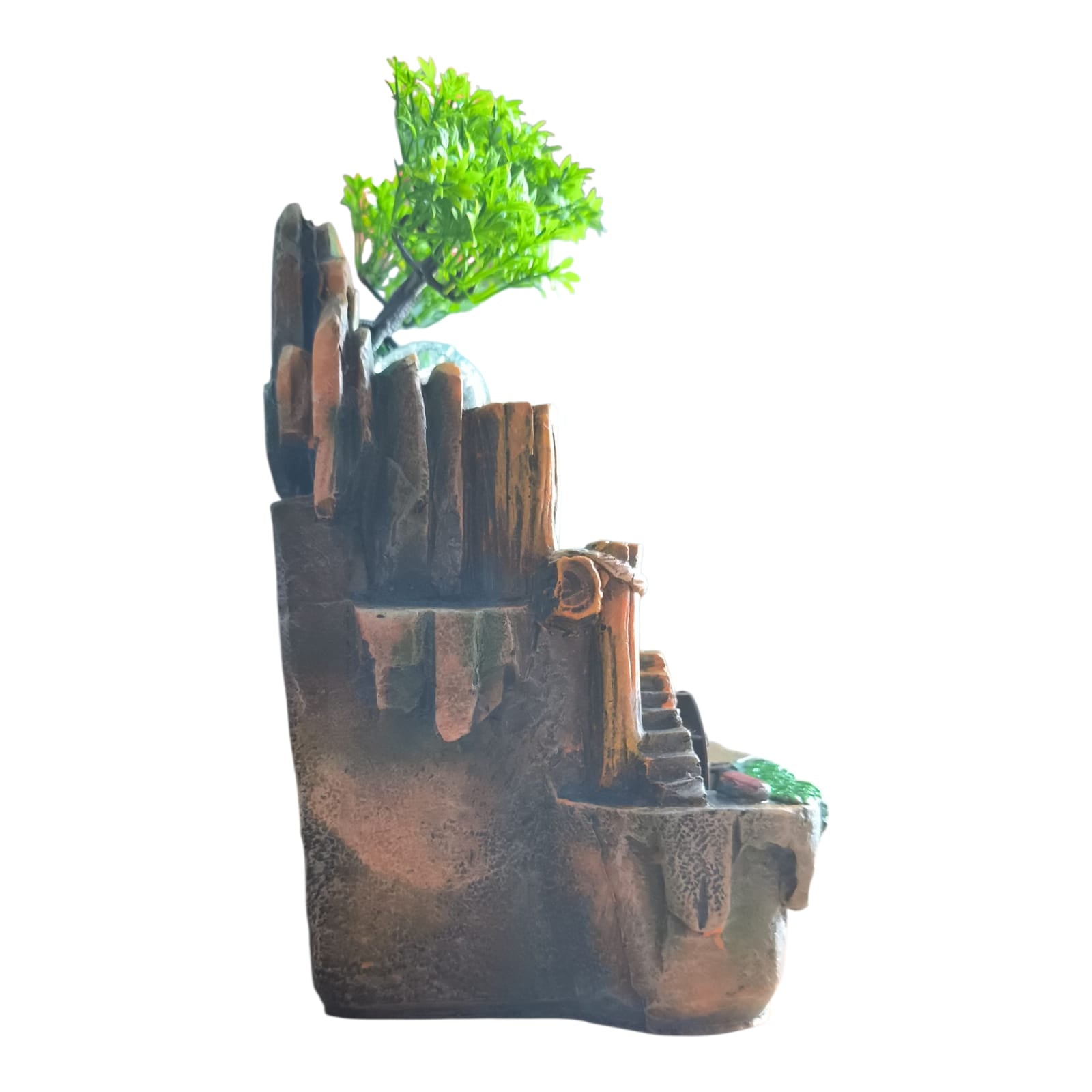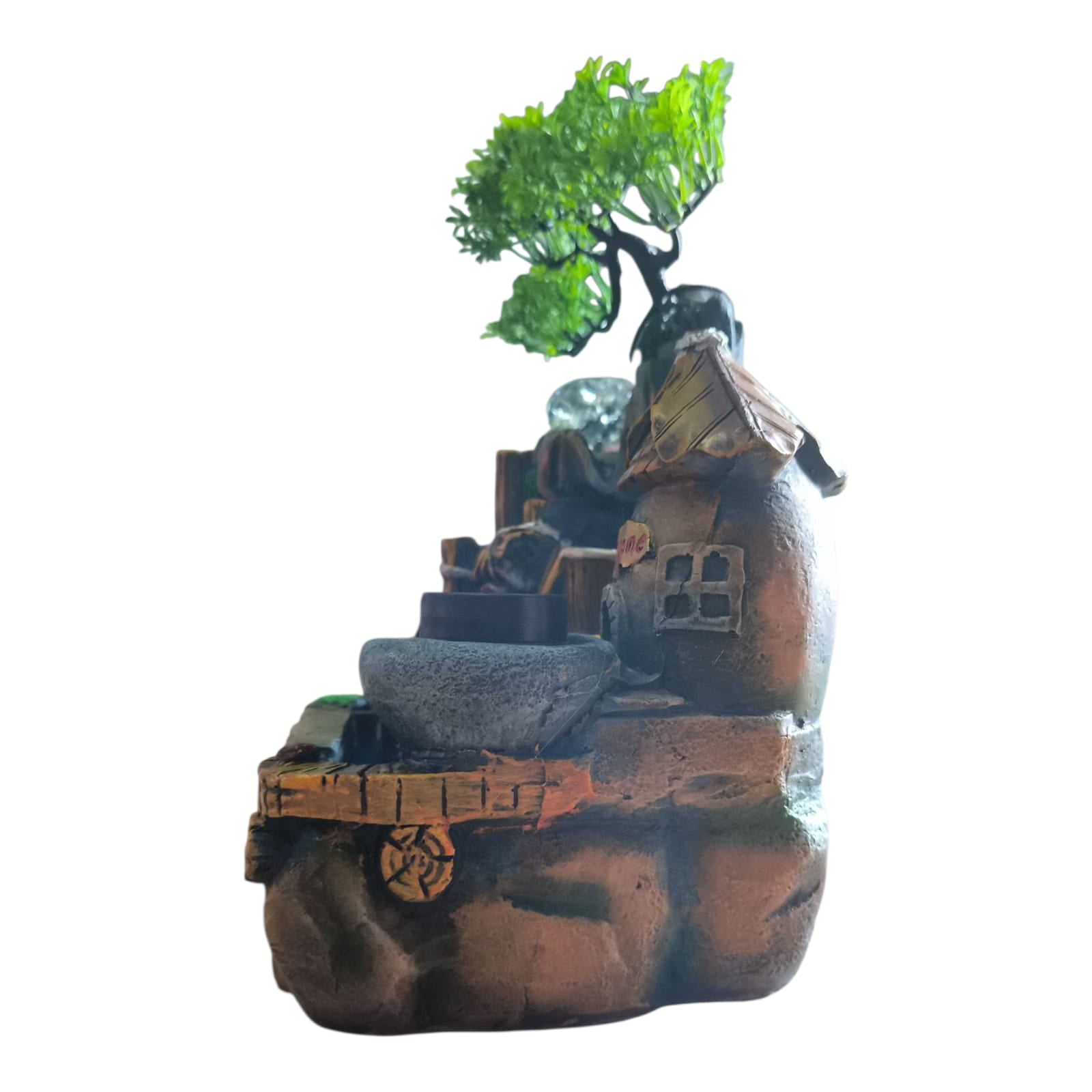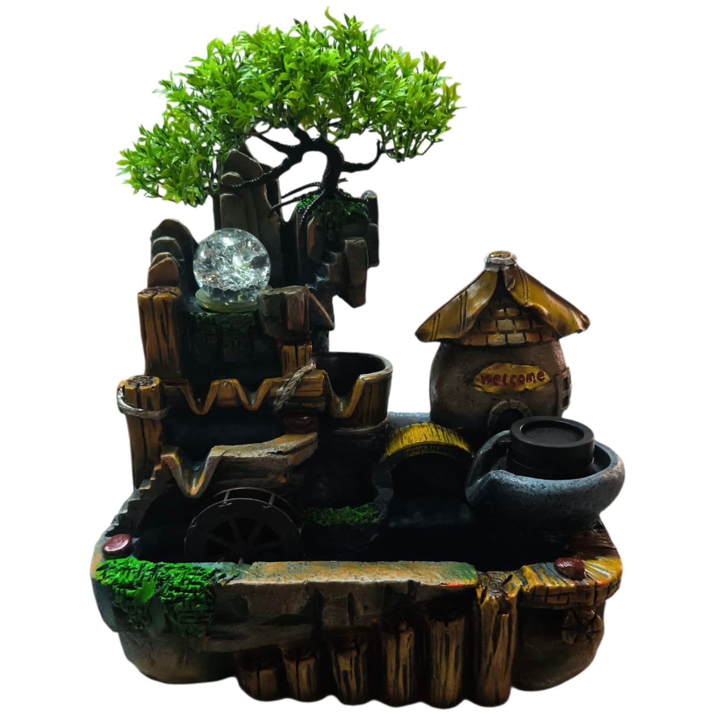 Fântâna este fabricată din polirășină vopsită multicolor.