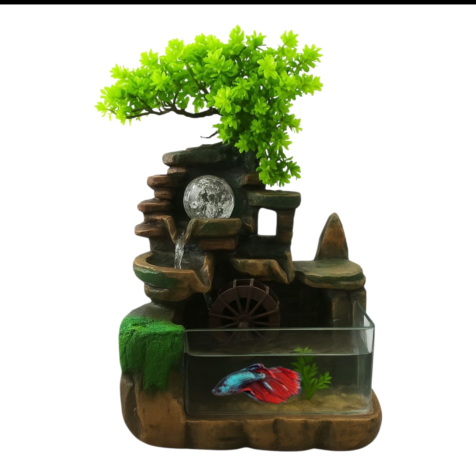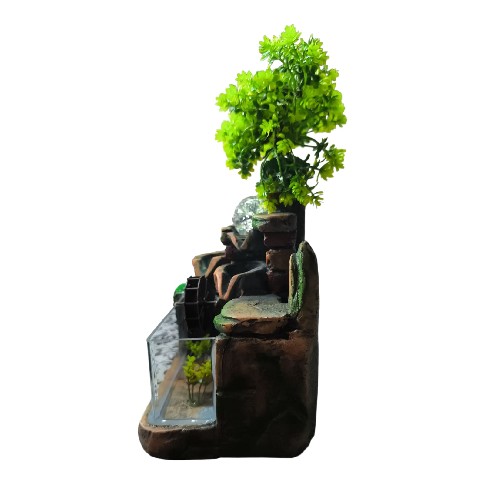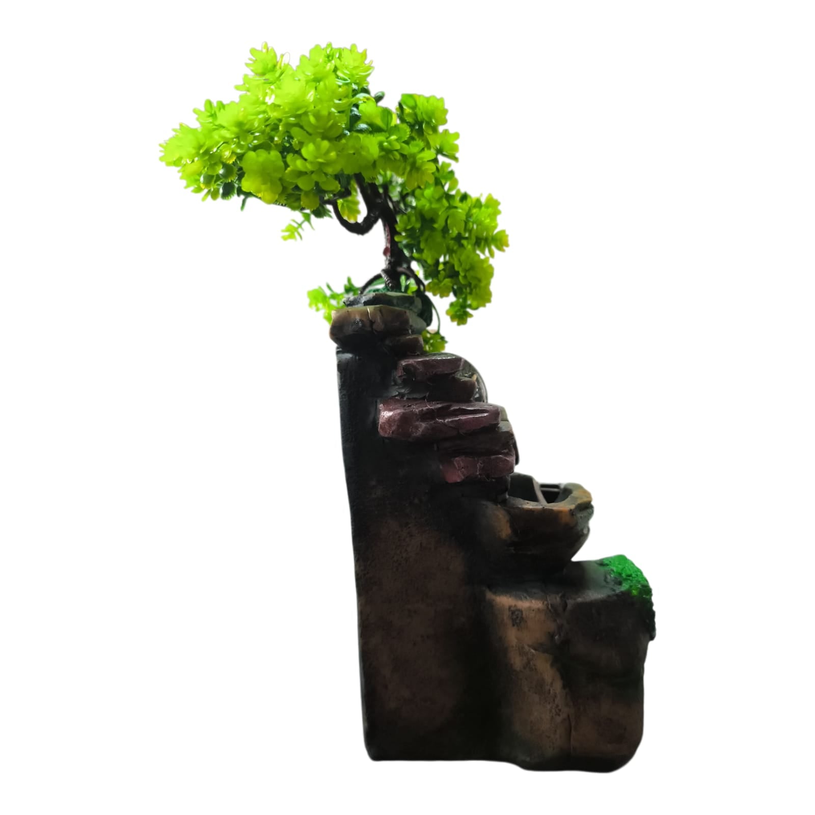 Fântâna este fabricată din polirășină vopsită multicolor.