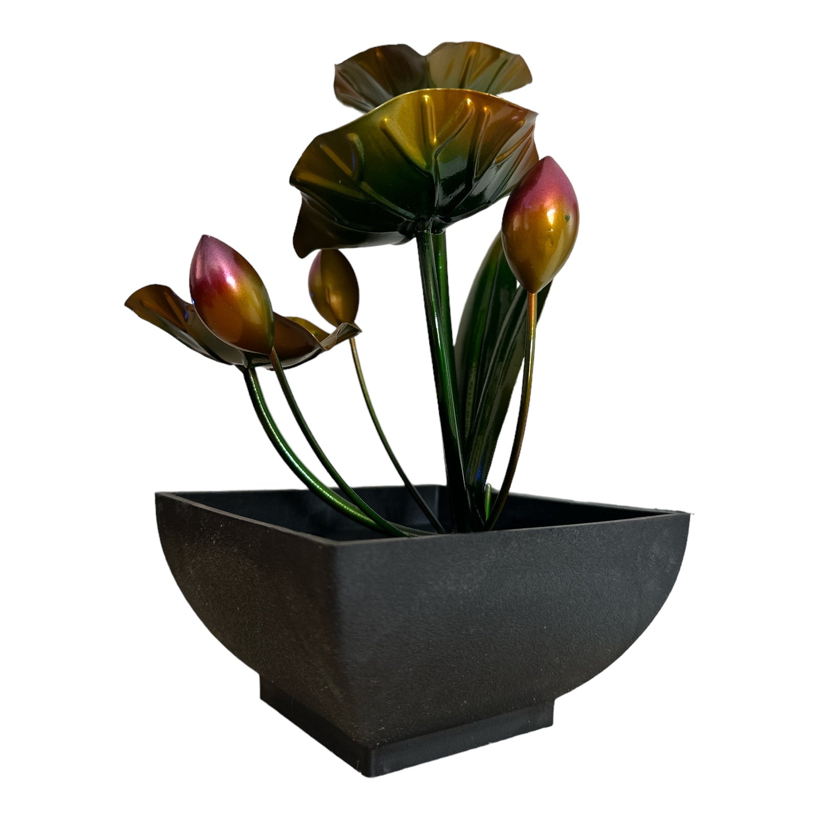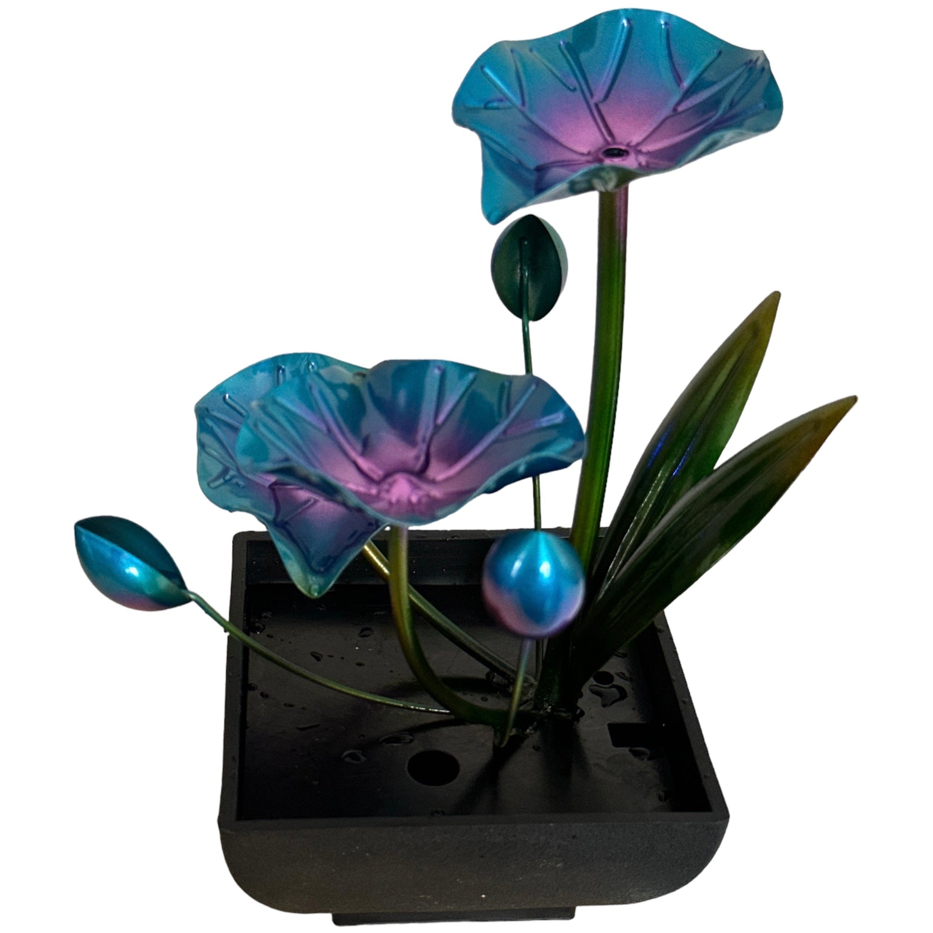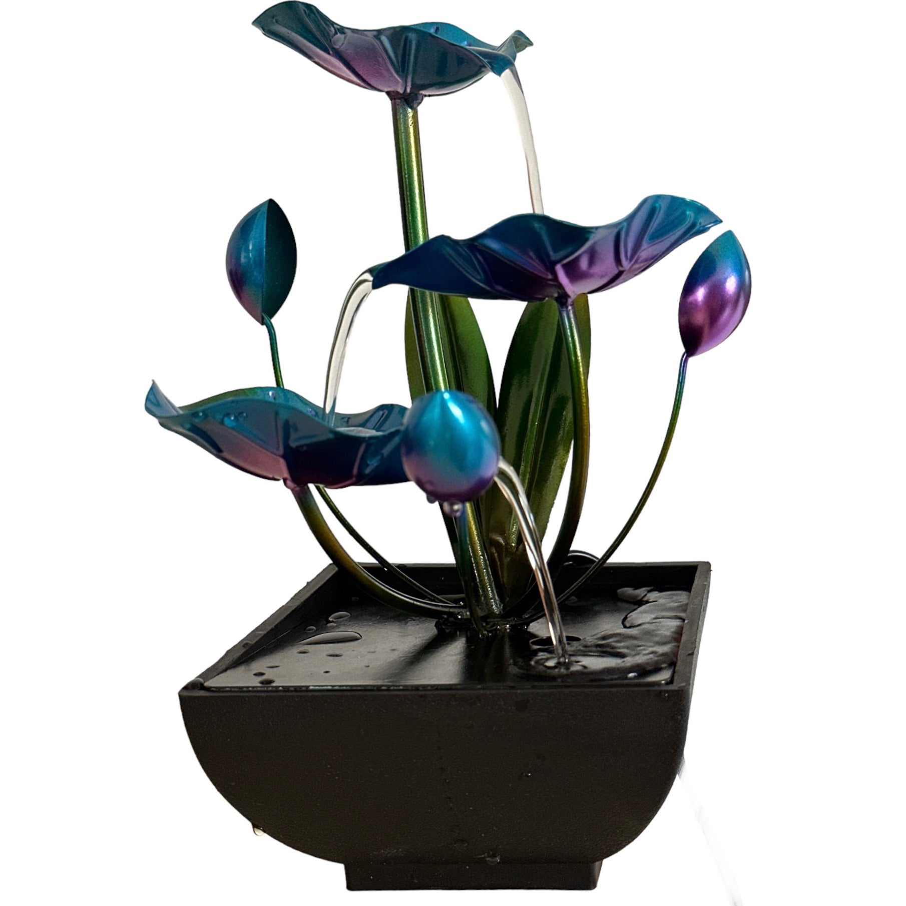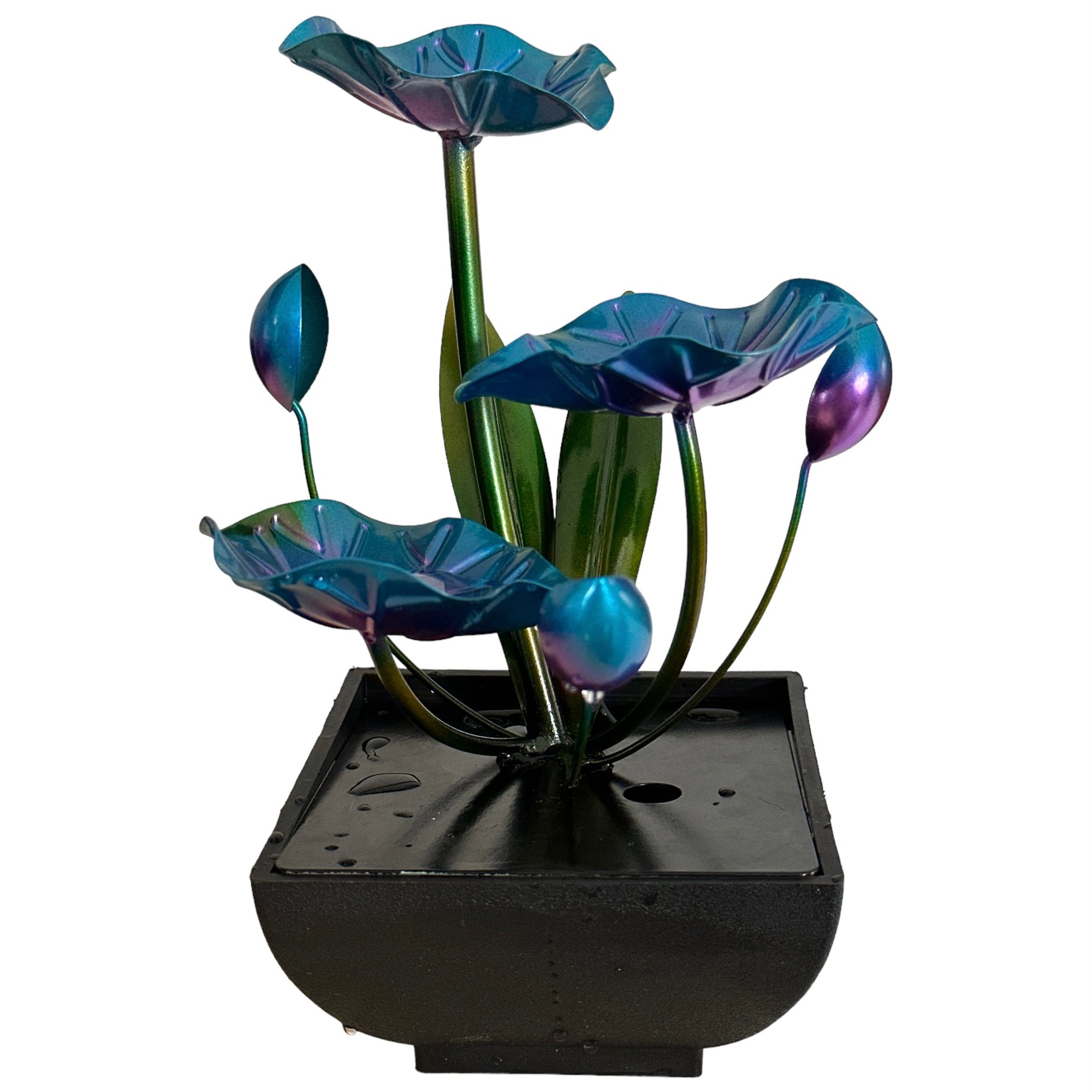 Fântâna este fabricată din plastic cu metal vopsit multicolor.