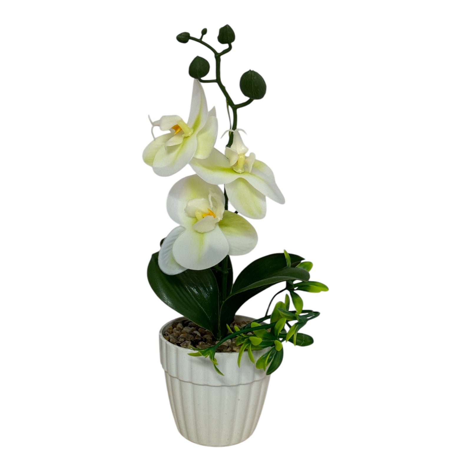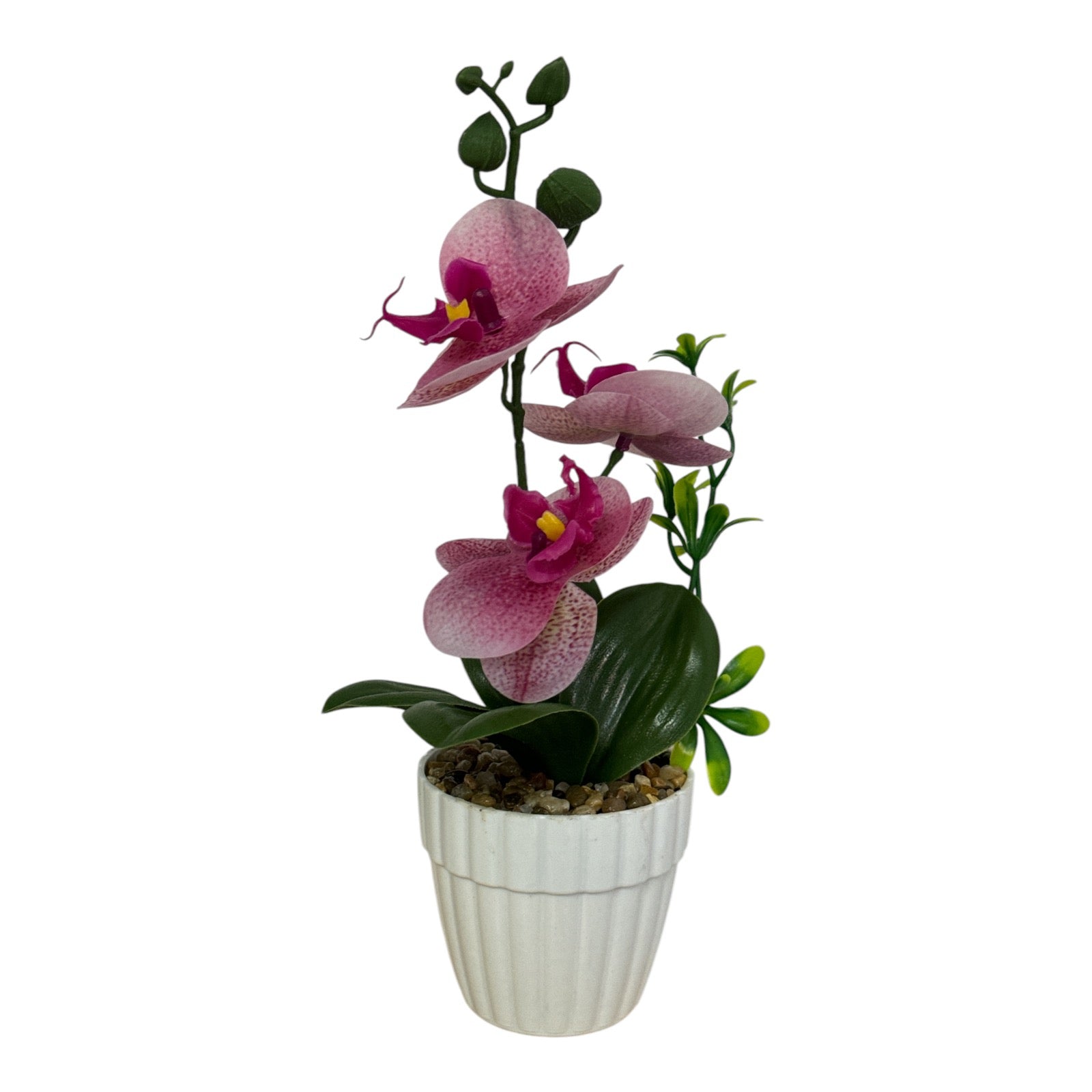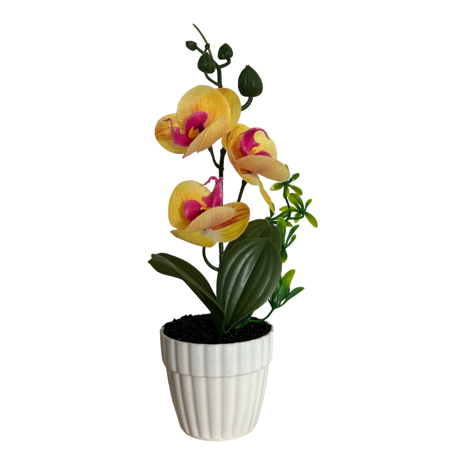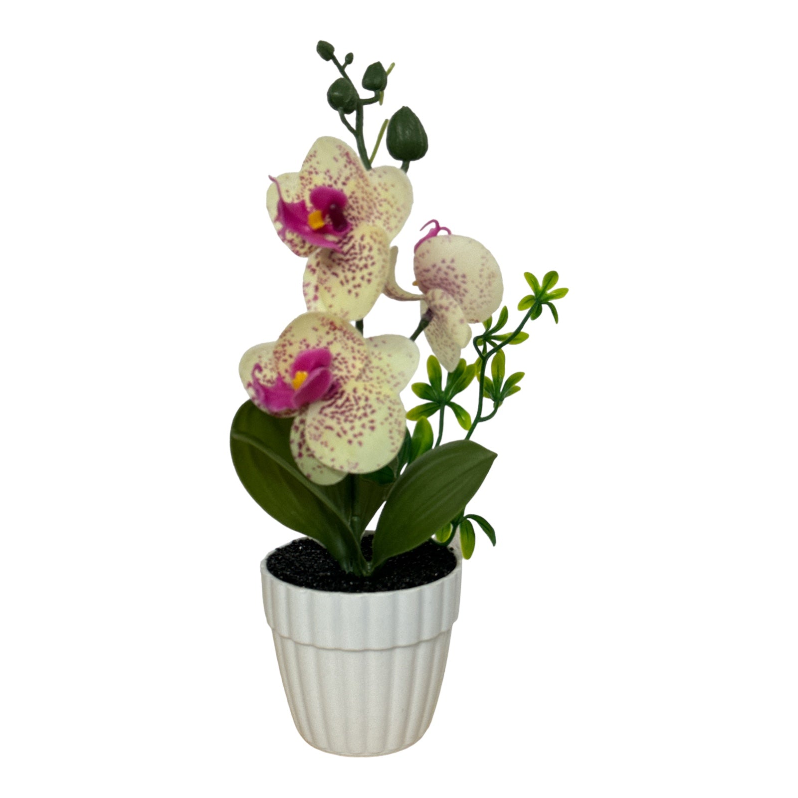 Este un produs elegant si rafinat care se îmbină perfect cu ambientul. Florile sunt artificiale din material textil și plastic. Ghiveciul este din material plastic.