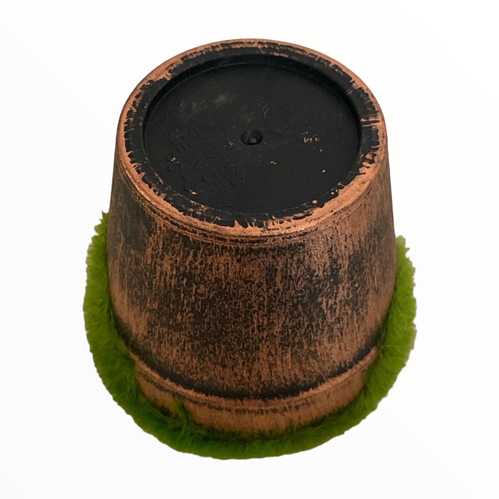 Ghiveciul este fabricat din polirășină vopsită , are în interior polistiren acoperit cu mușchi artificial verde în care puteți planta flori artificiale diverse și veți obține astfel un aranjament floral unic.