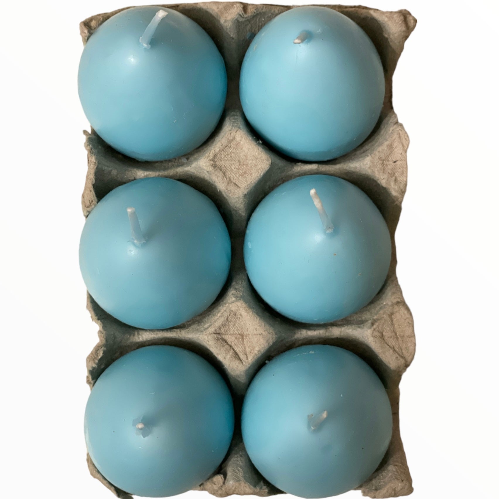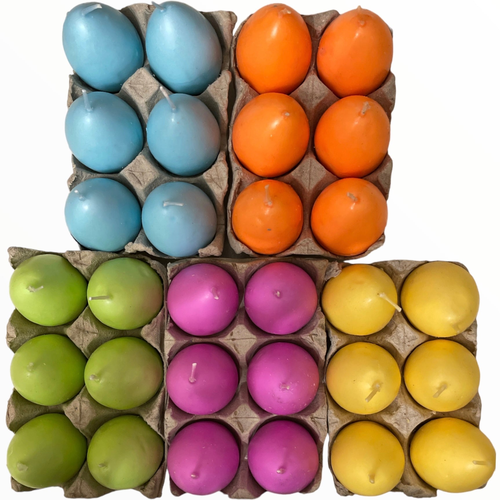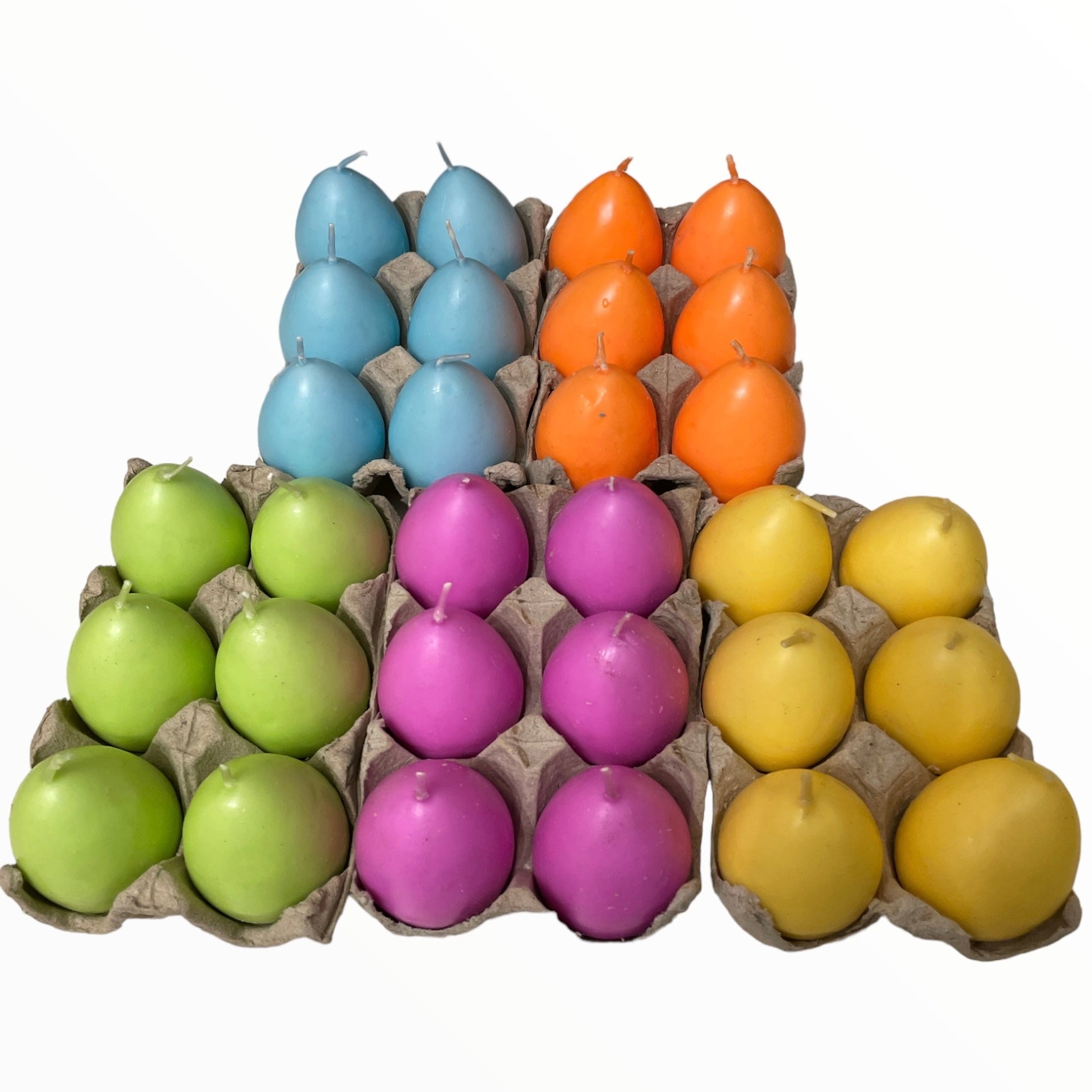 Setul de 6 de lumânări din ceară, în formă de Ou, diverse culori, este ideal pentru mesele festive de Paști, dar poate decora cu succes si mesele din cluburi și restaurante din perioada Sărbătorilor Pascale.