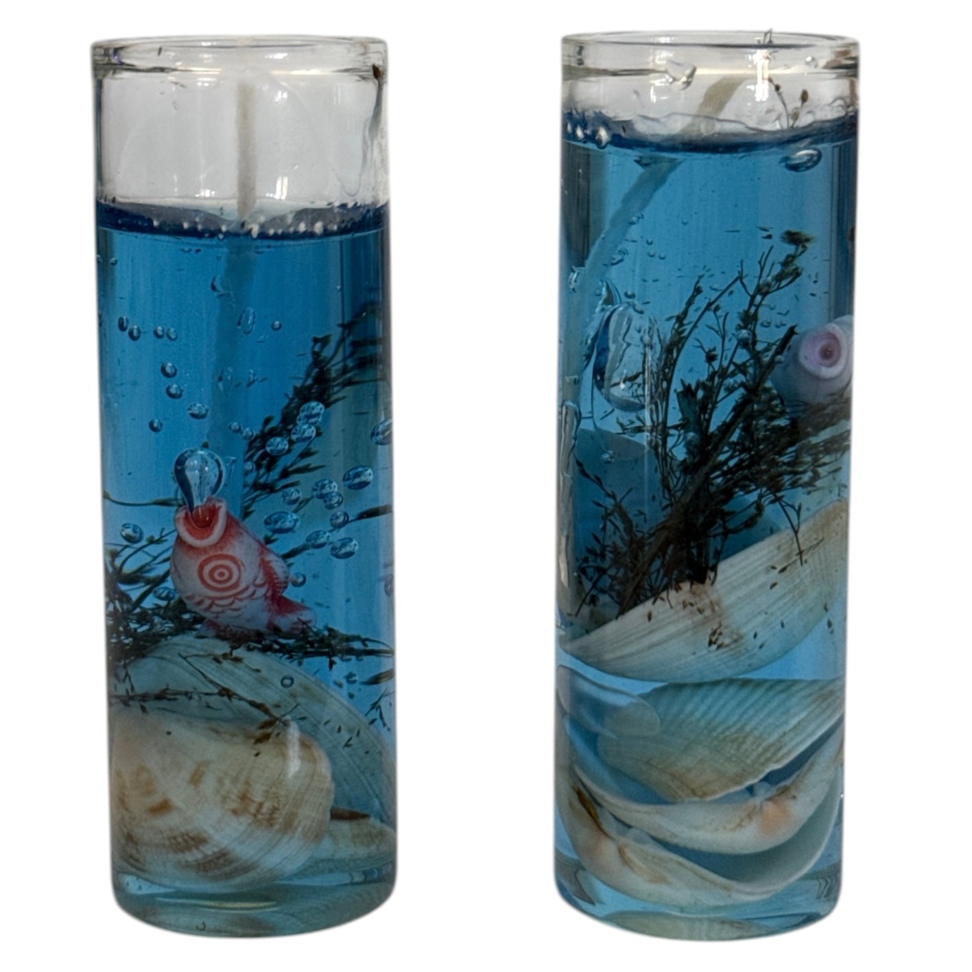 Creează un decor deosebit cu aceste lumânări decorative inspirate din lumea marină. Realizate în pahare din sticlă transparentă, cu efect lichid albastru și elemente precum scoici naturale și detalii subacvatice, aceste lumânări oferă un aspect relaxant și elegant, perfect pentru orice spațiu.