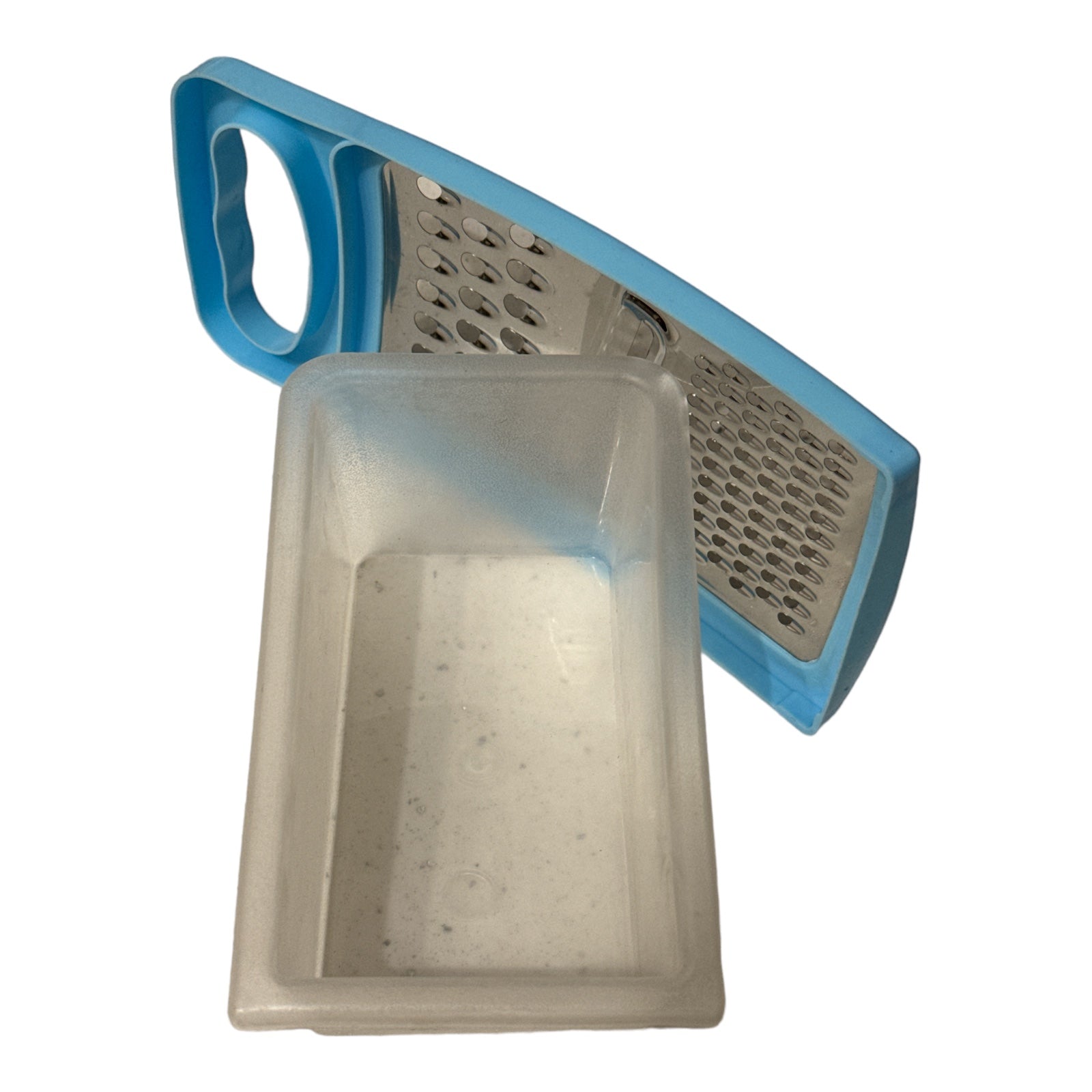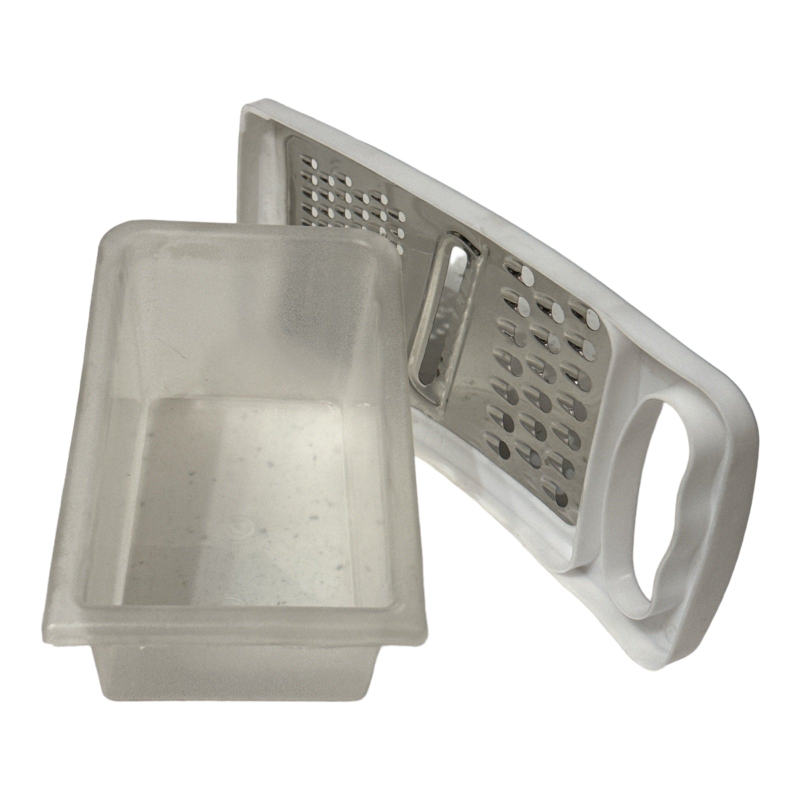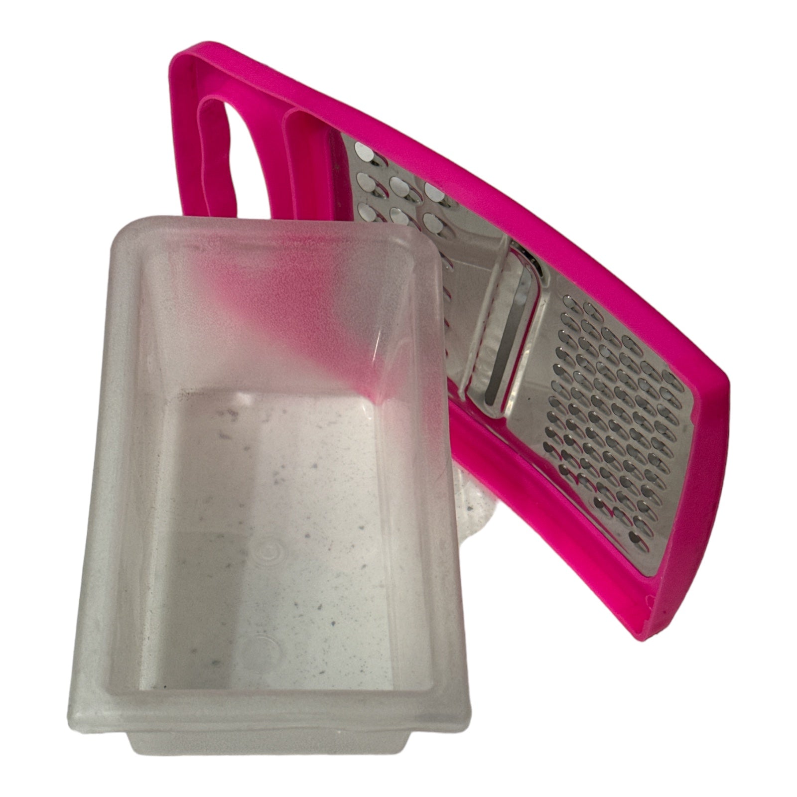 Cutia este fabricată din plastic transparent și răzătoarea este metalică.