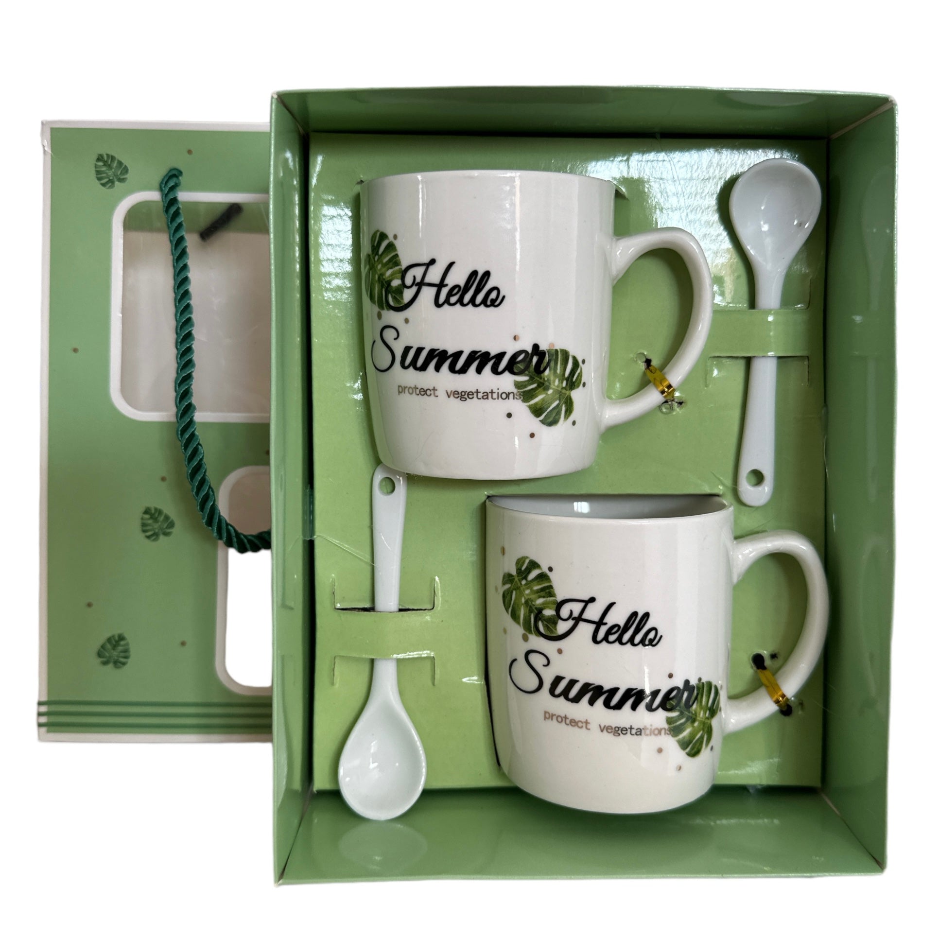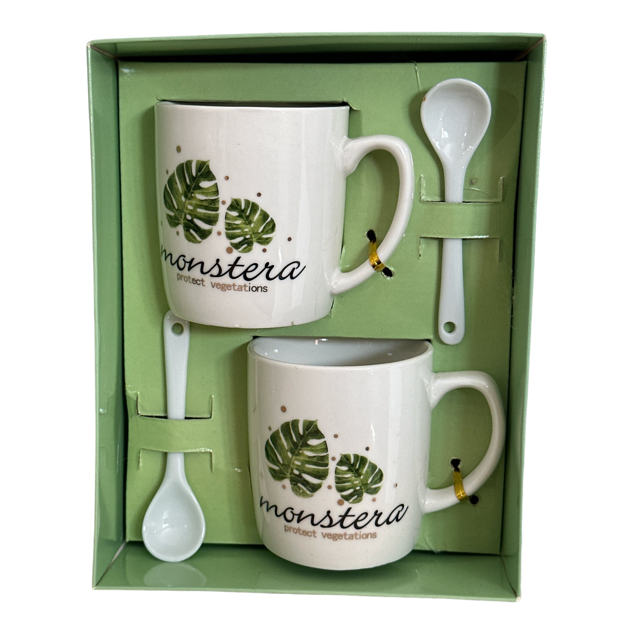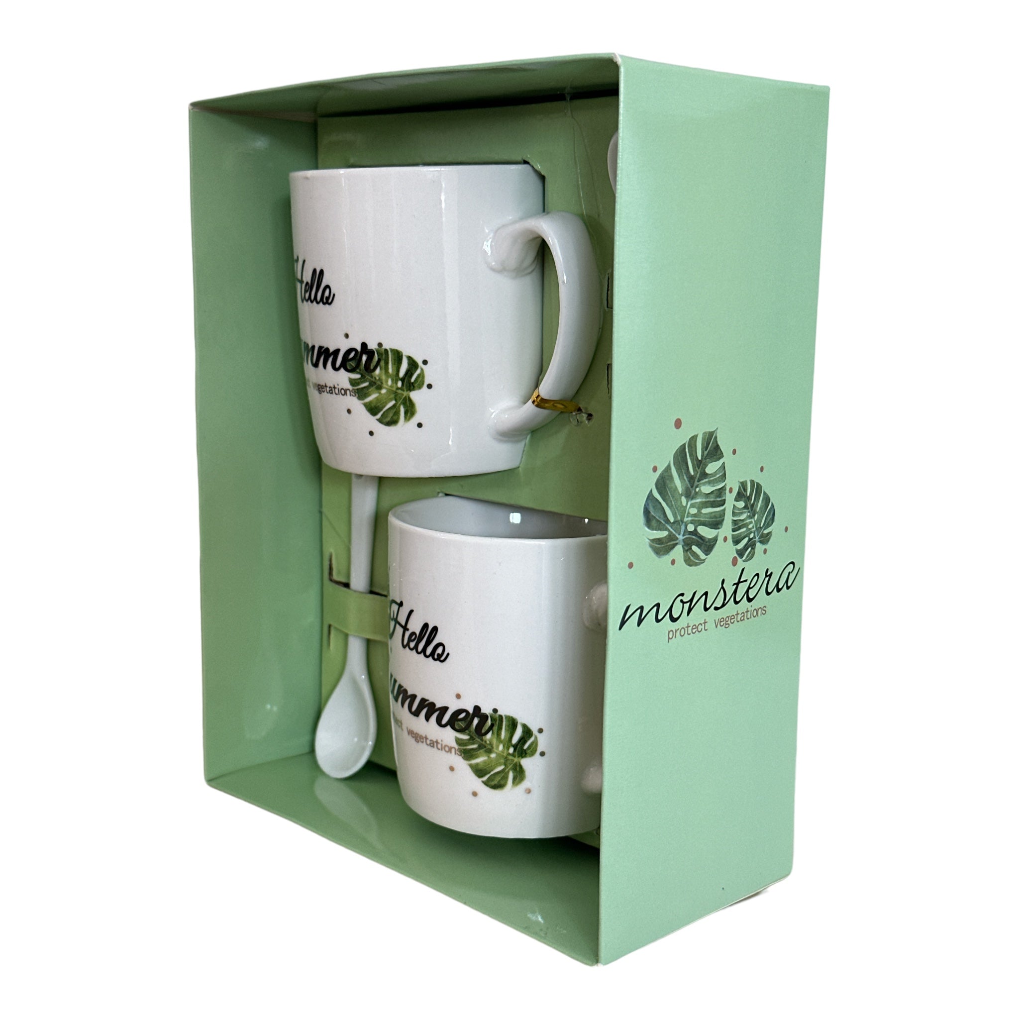 Setul este format din 2 căni cu linguriță și vine ambalat într-o cutie elegantă în formă de pungă de cadou cu șnur.