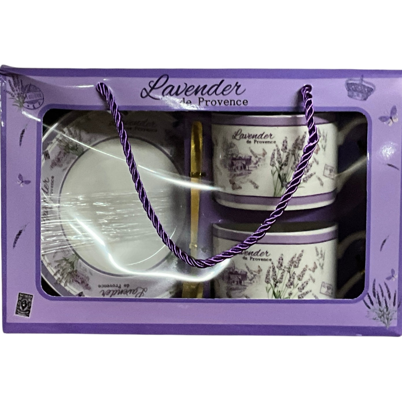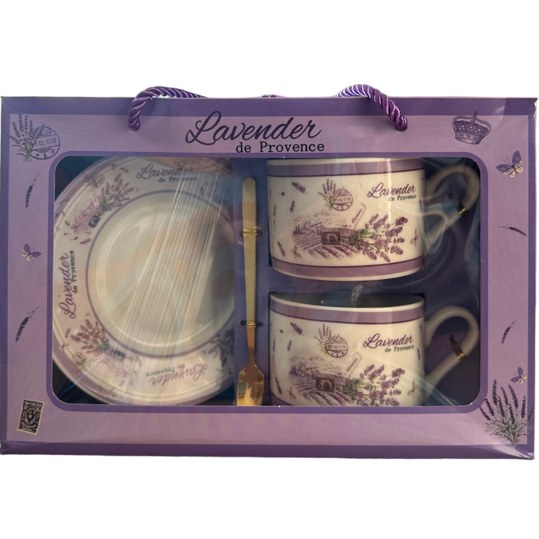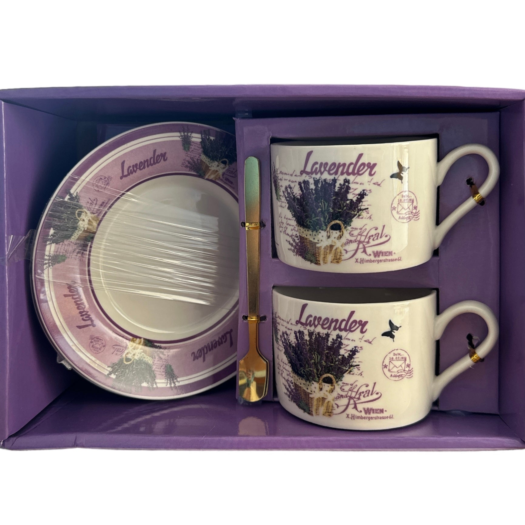 Setul este format din 2 căni cu 2 farfurii cu lingurițe și vine ambalat într-o cutie elegantă cu mânere.