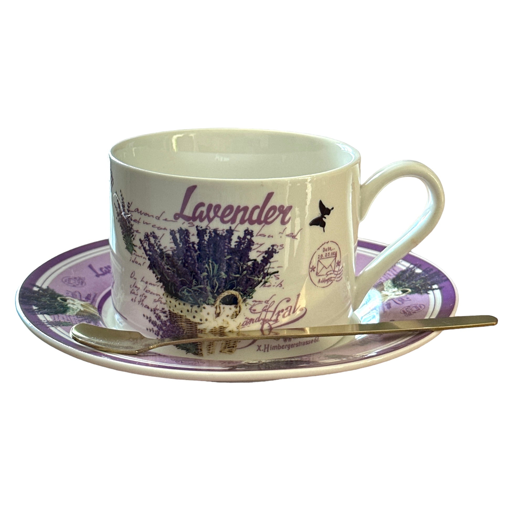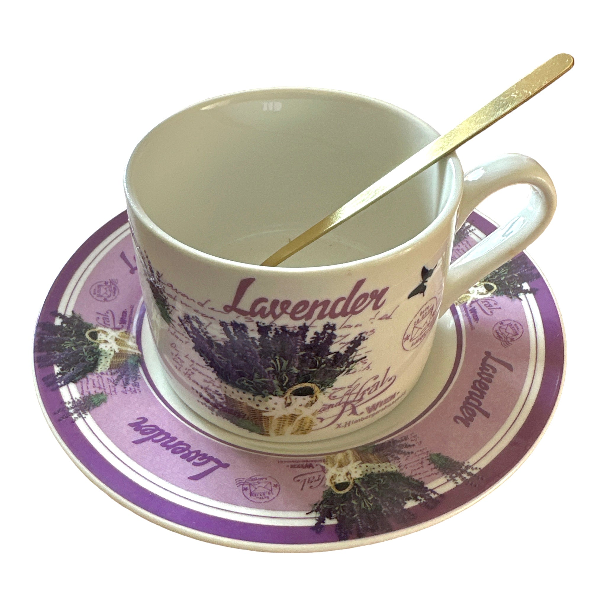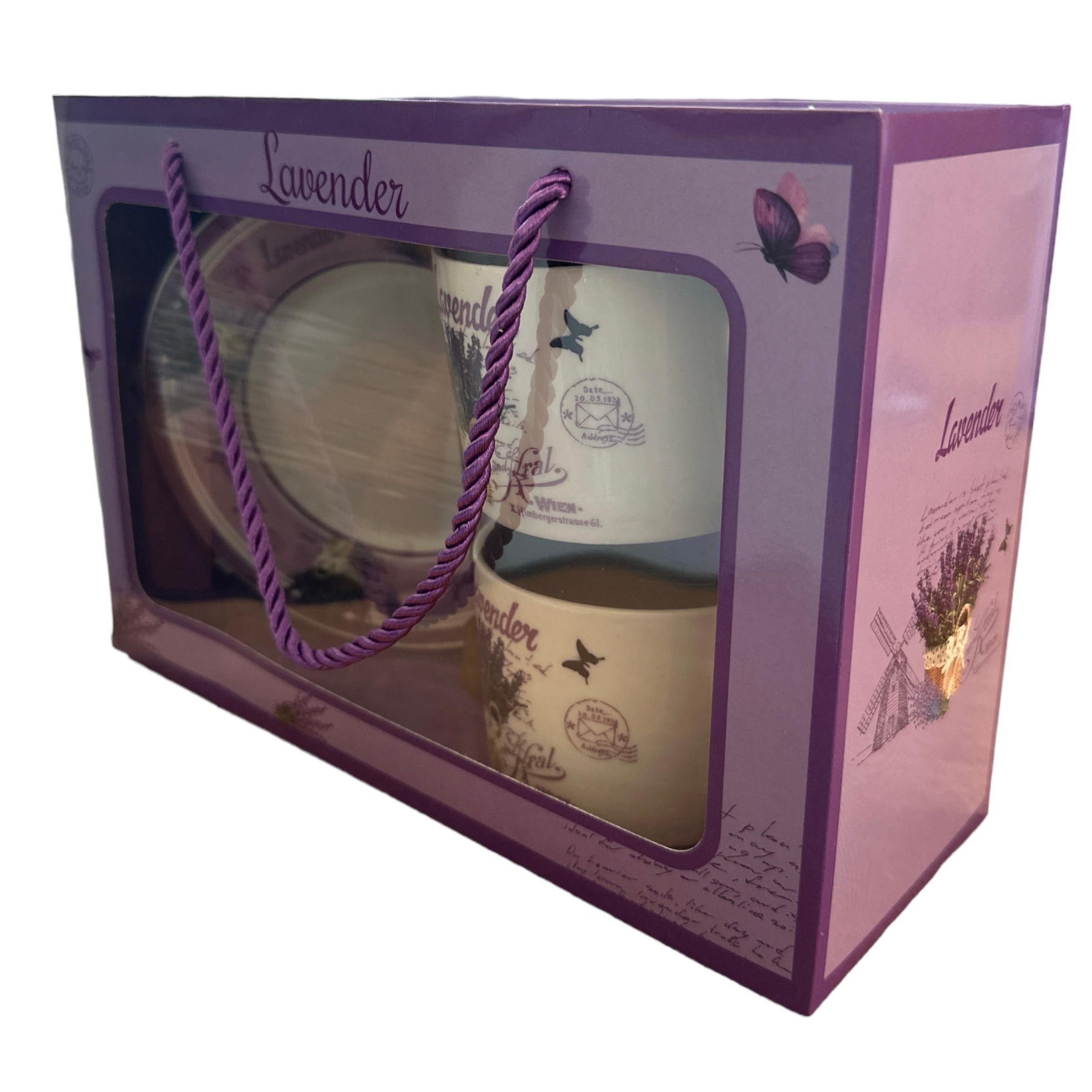 Setul este format din 2 căni cu 2 farfurii cu lingurițe și vine ambalat într-o cutie elegantă cu mânere.