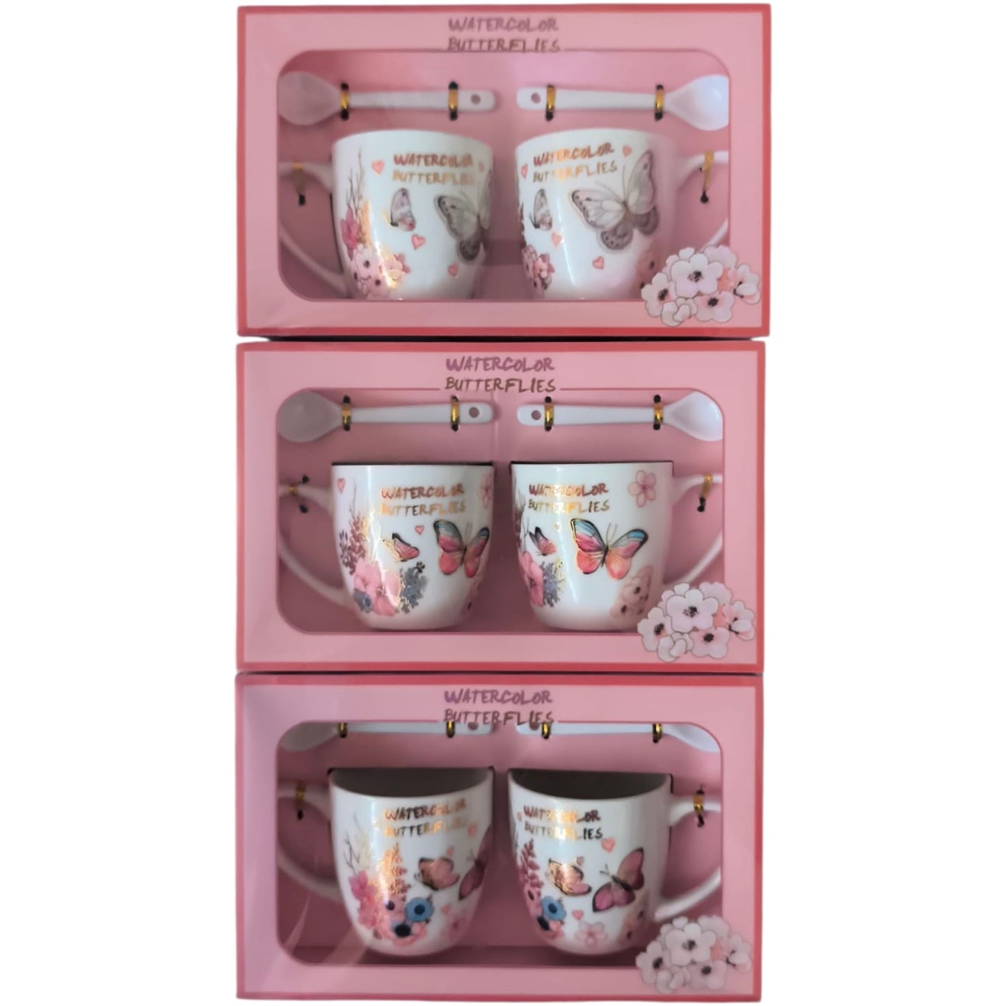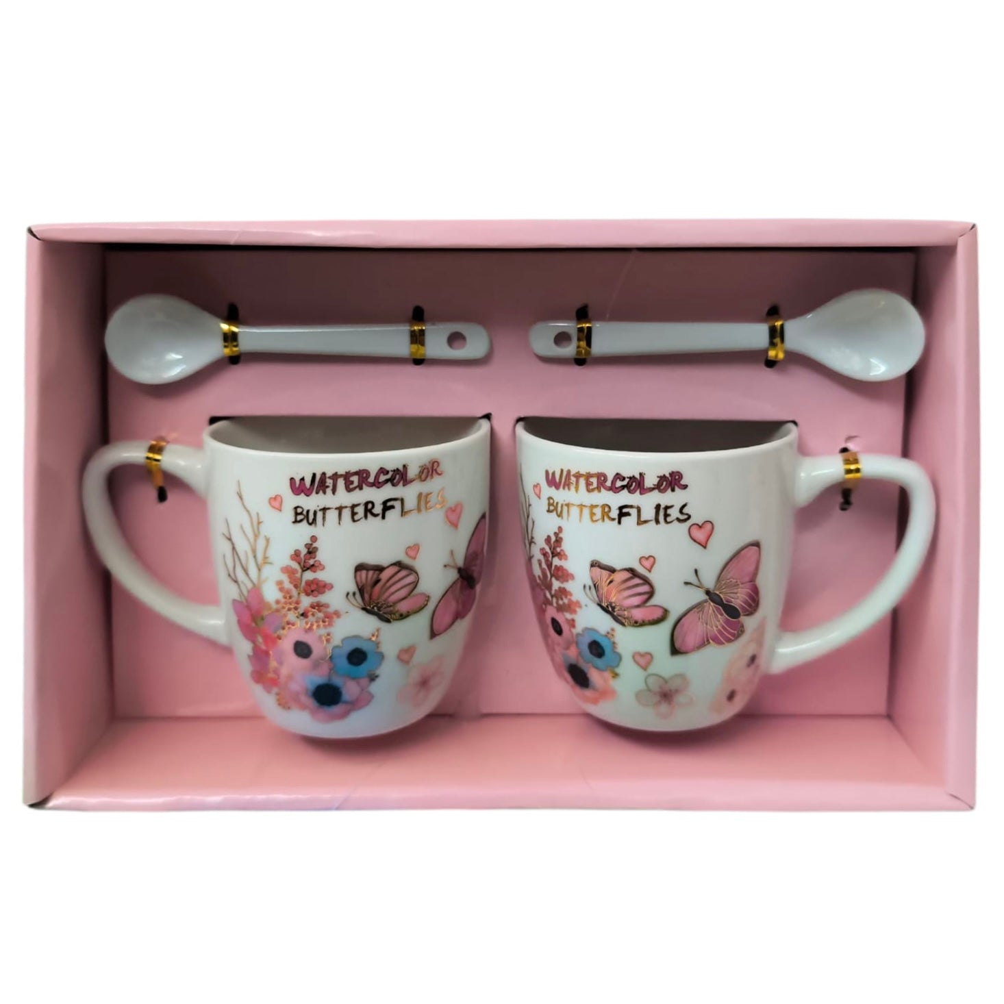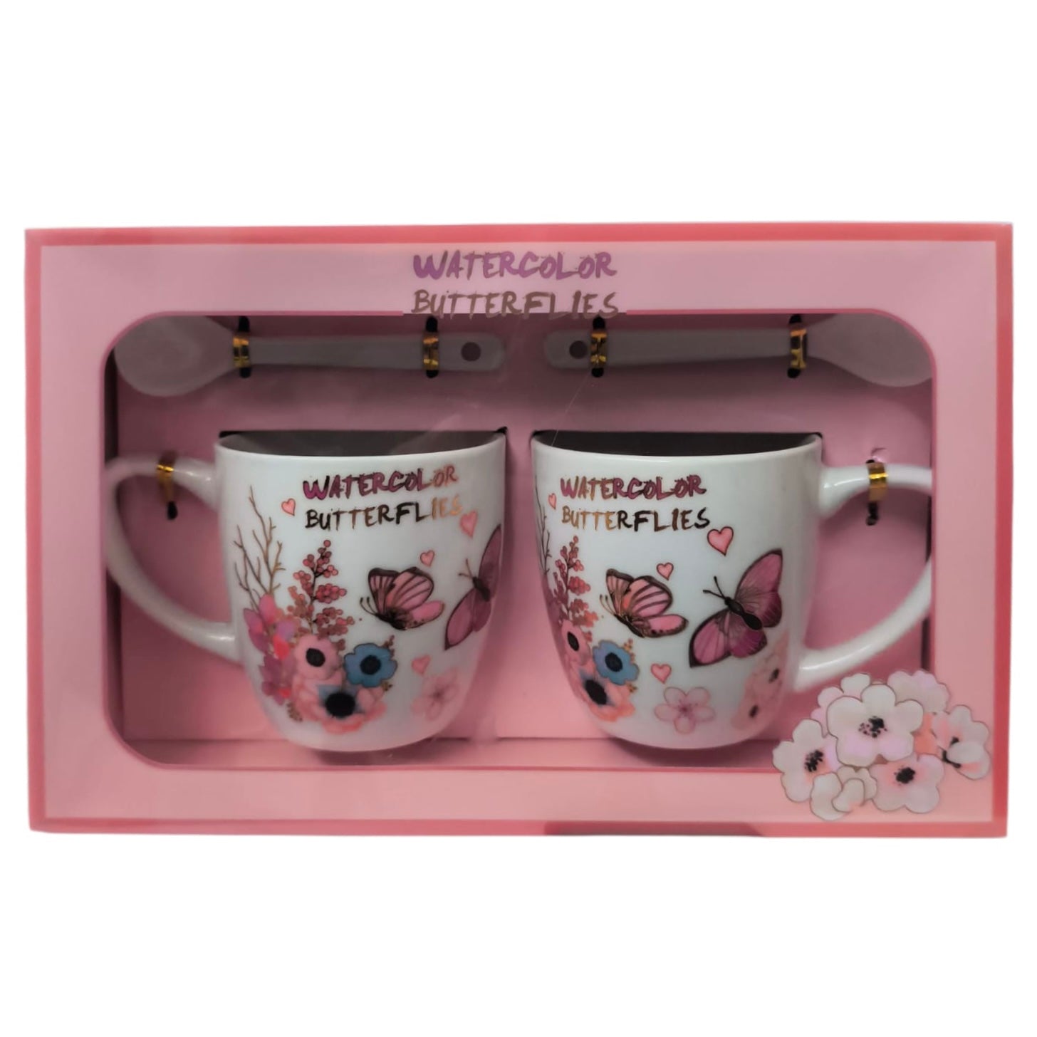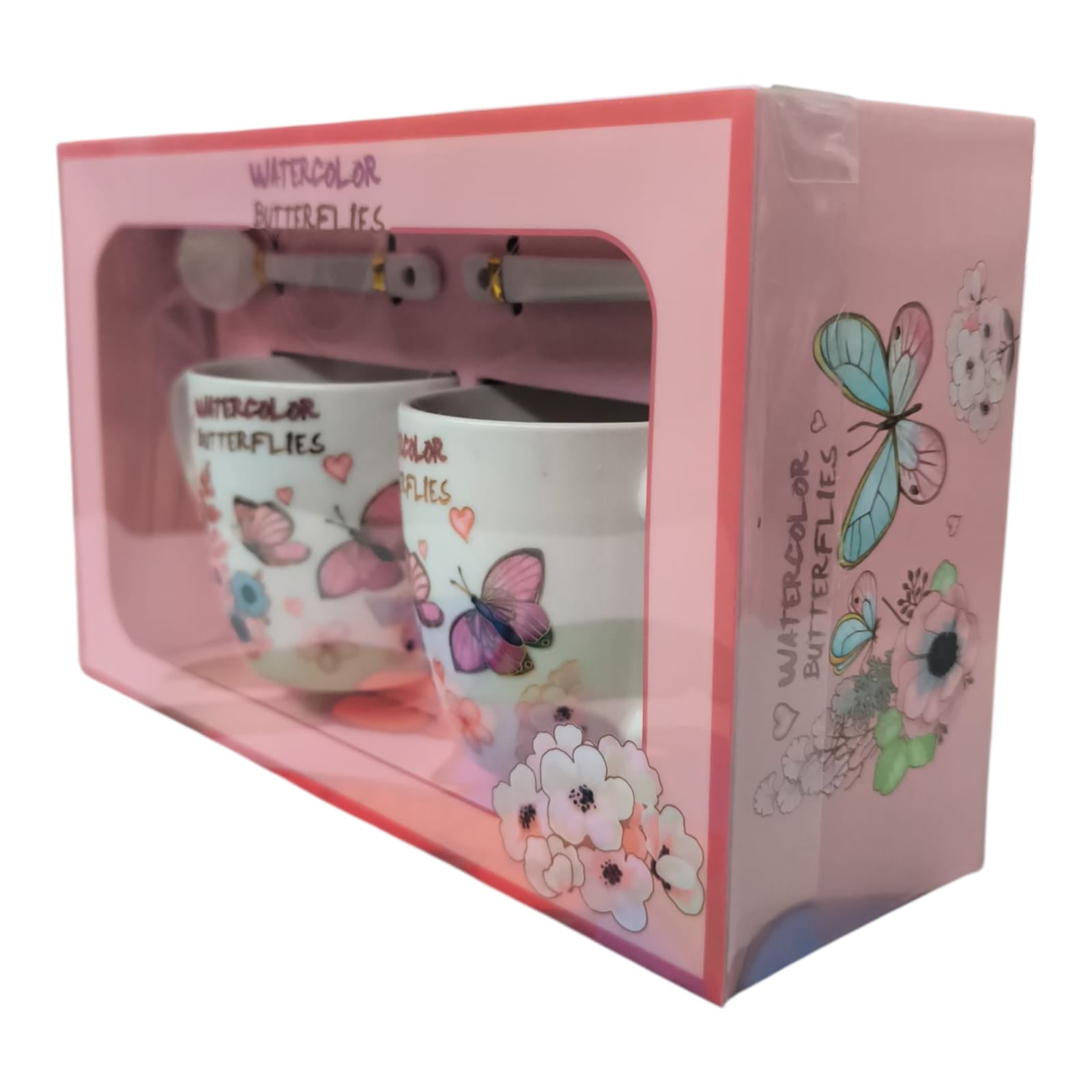 Setul este format din 2 căni cu linguriță și vine ambalat într-o cutie elegantă .