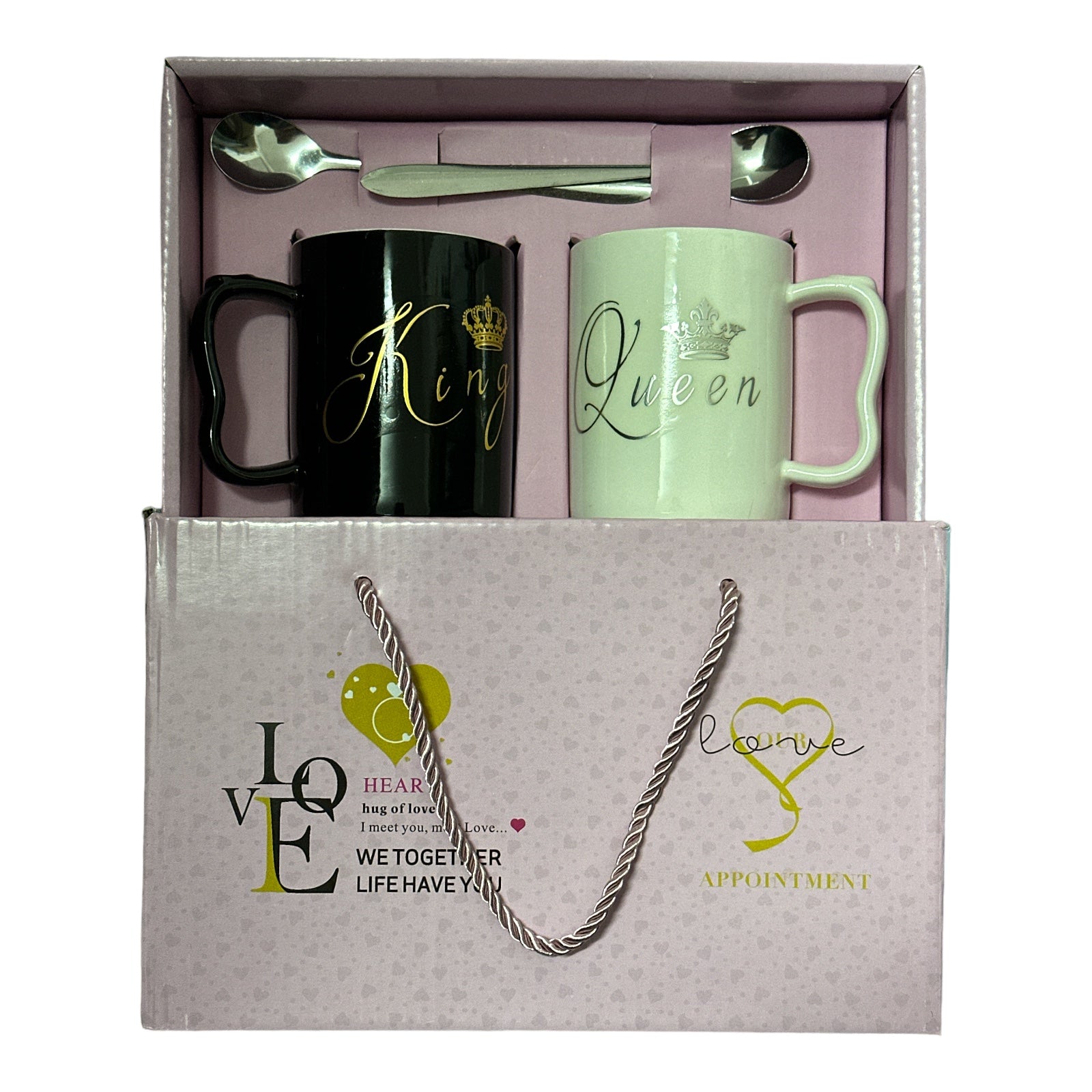 Setul este format din 2 căni cu lingurițe metalice și vine ambalat într-o cutie din carton frumos colorată cu mânere ,perfectă pentru un cadou plin de bun gust.