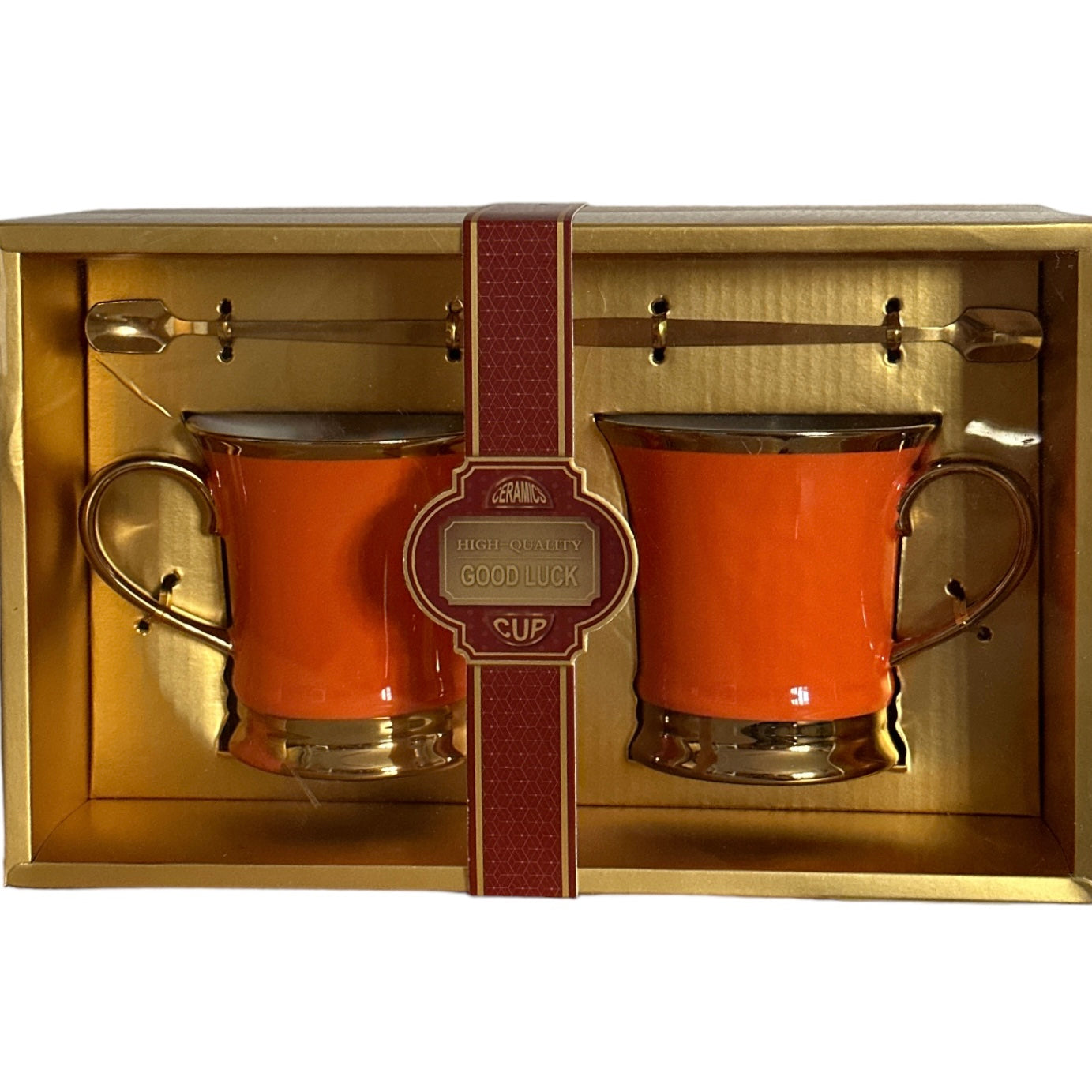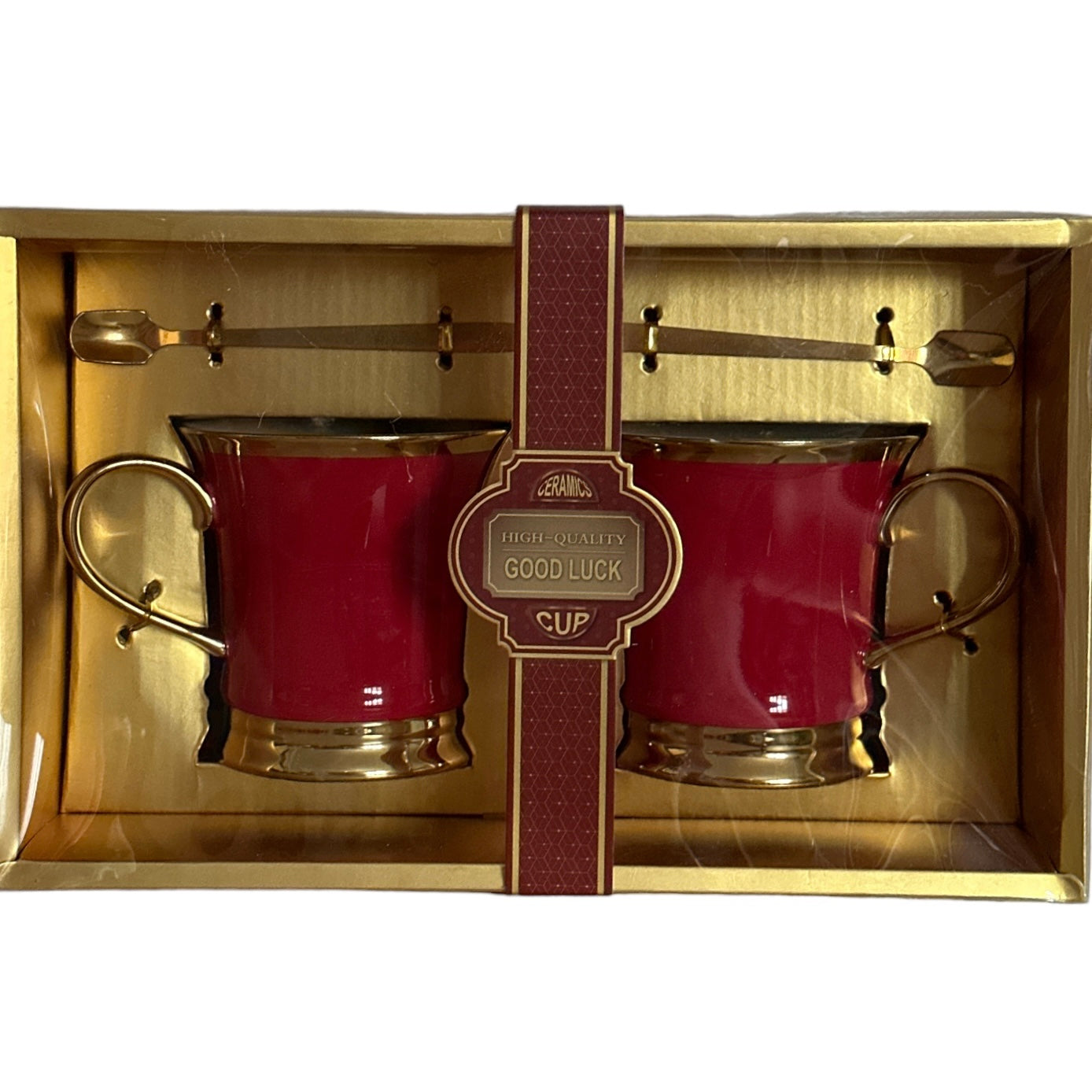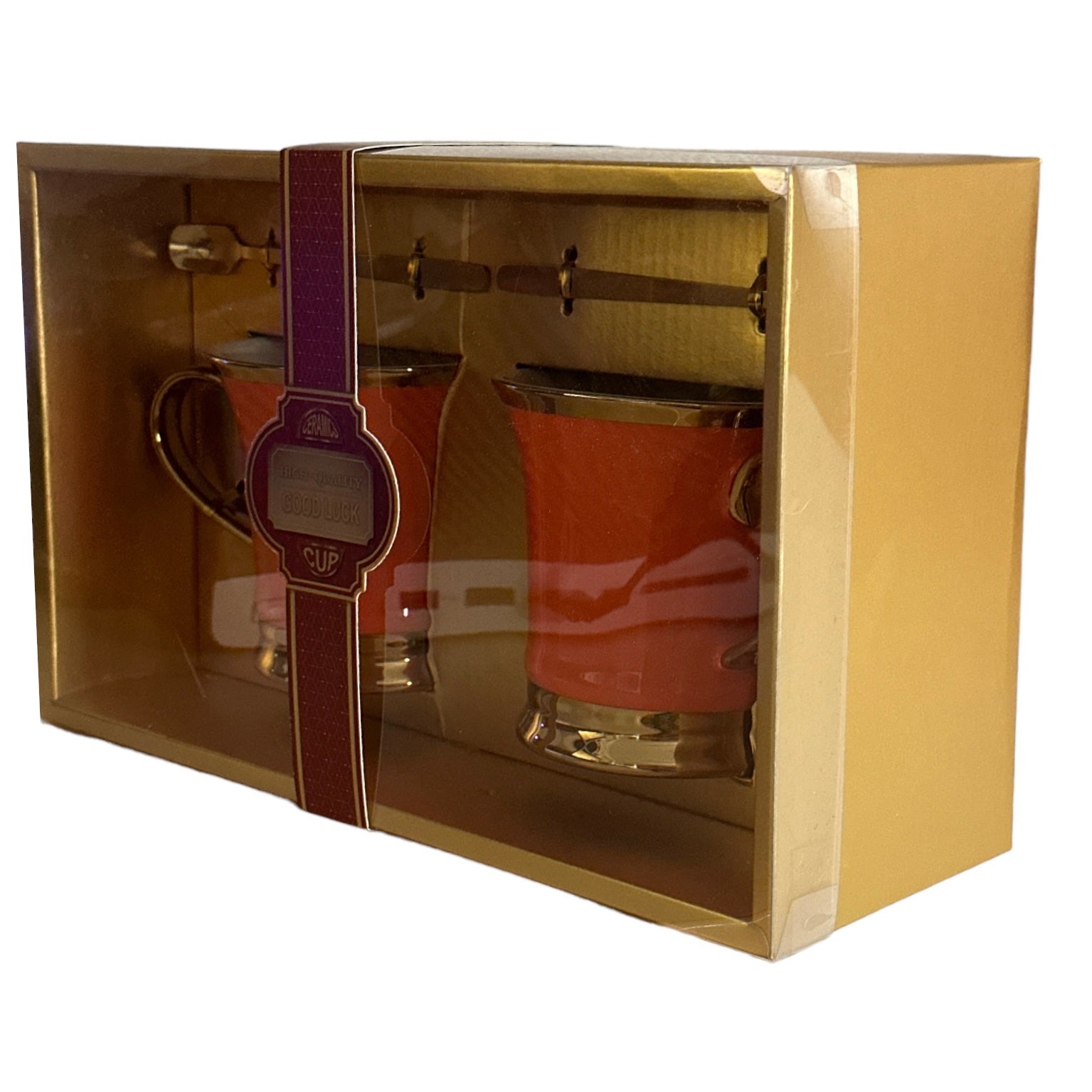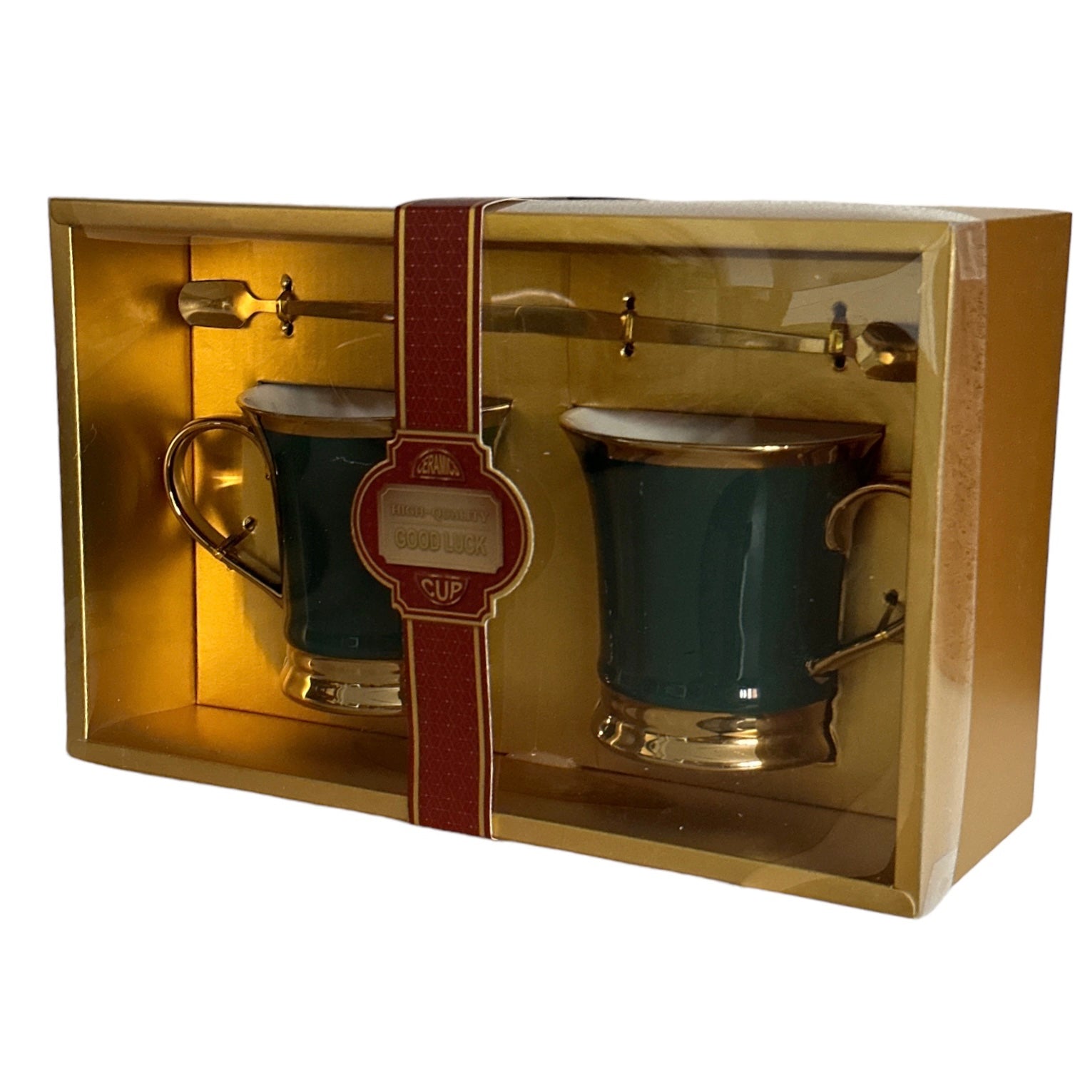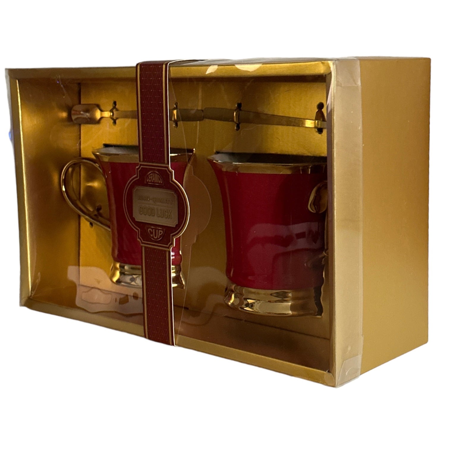 Setul este format din 2 căni cu 2 lingurițe metalice și vine ambalat într-o cutie elegantă din carton auriu perfectă pentru un cadou plin de bun gust.