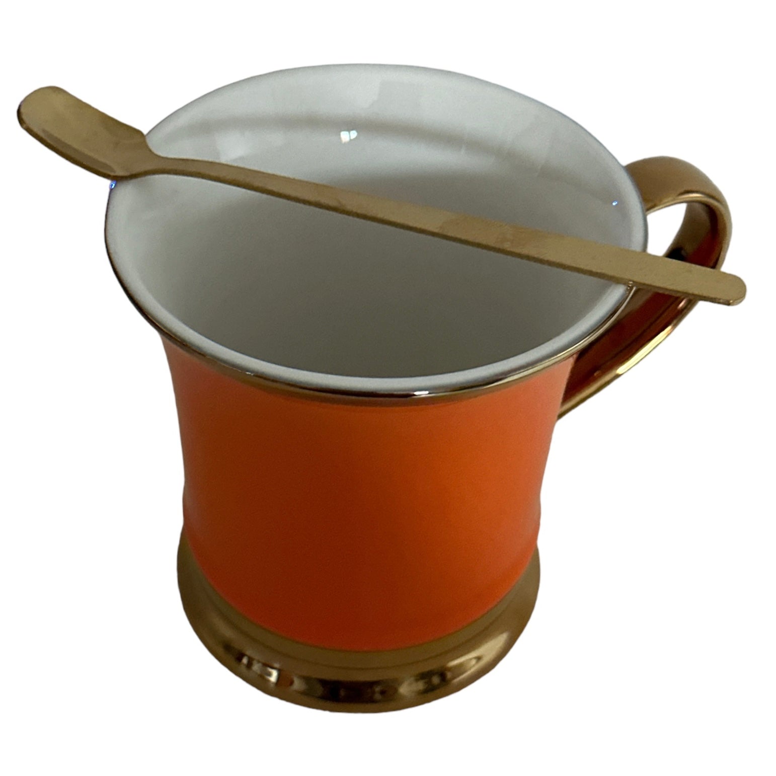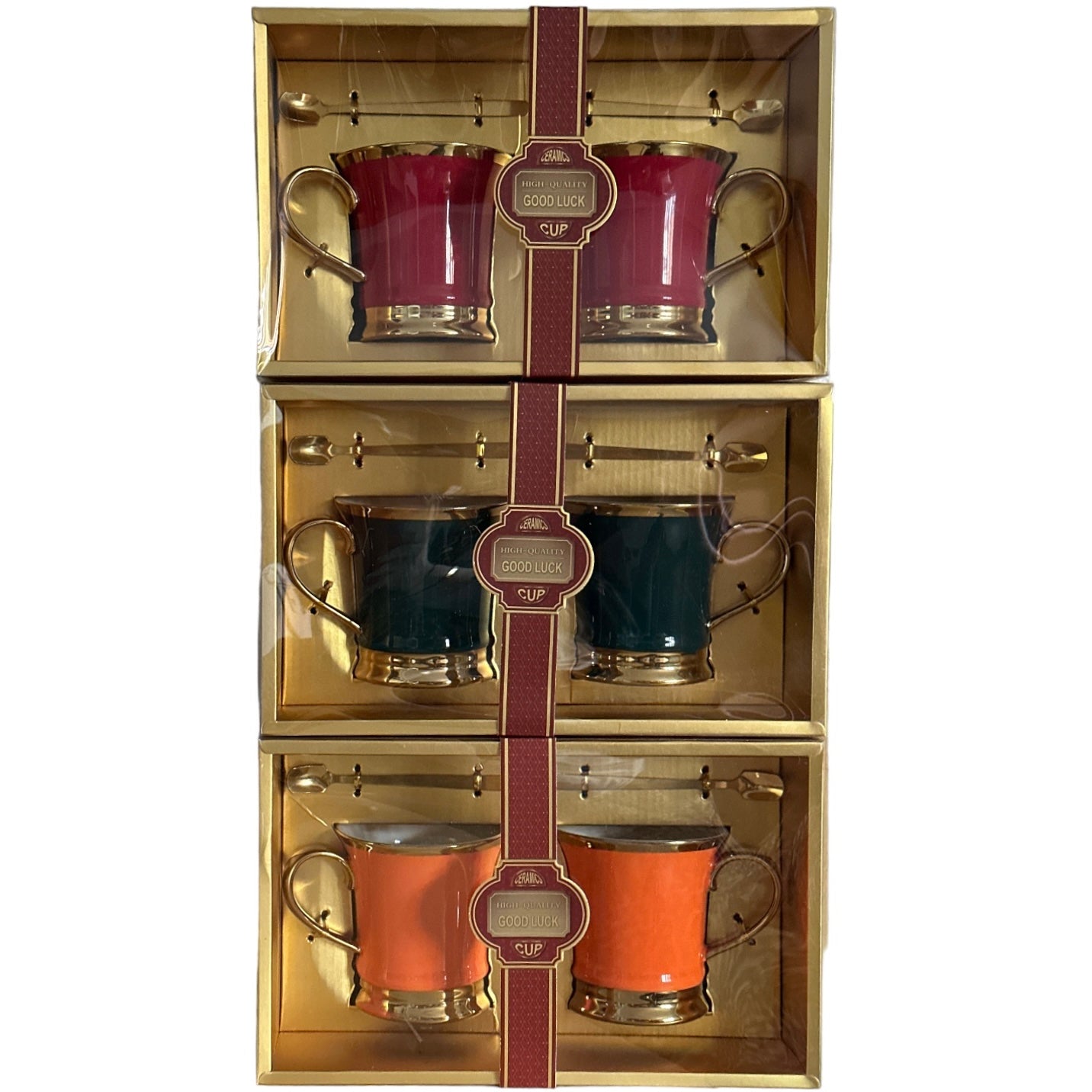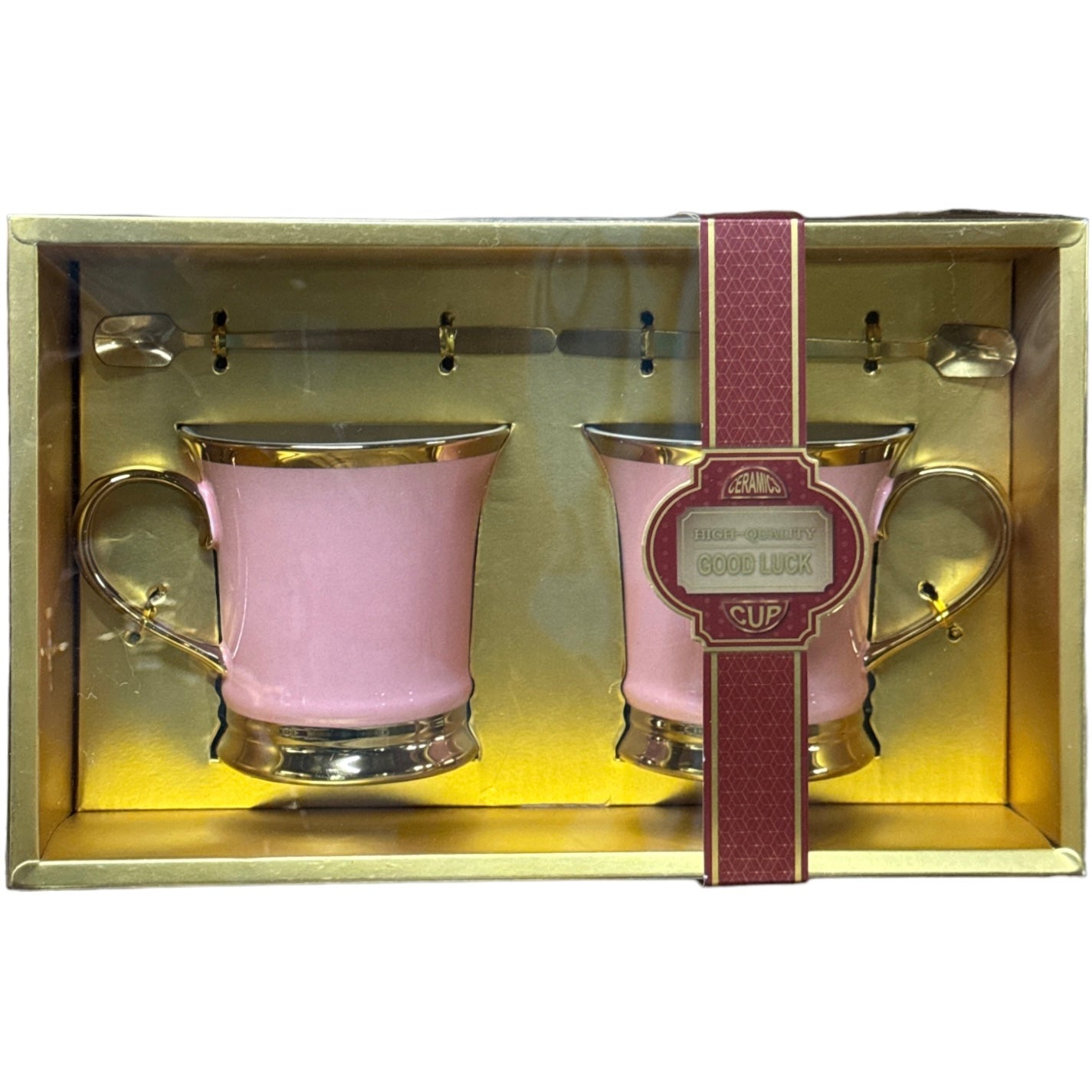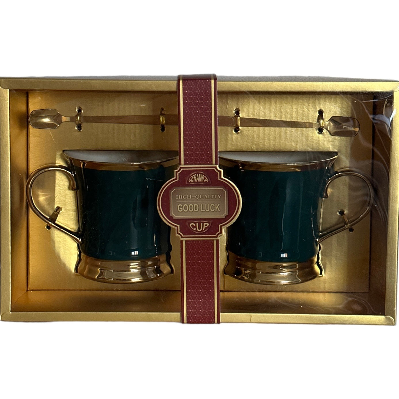 Setul este format din 2 căni cu 2 lingurițe metalice și vine ambalat într-o cutie elegantă din carton auriu perfectă pentru un cadou plin de bun gust.