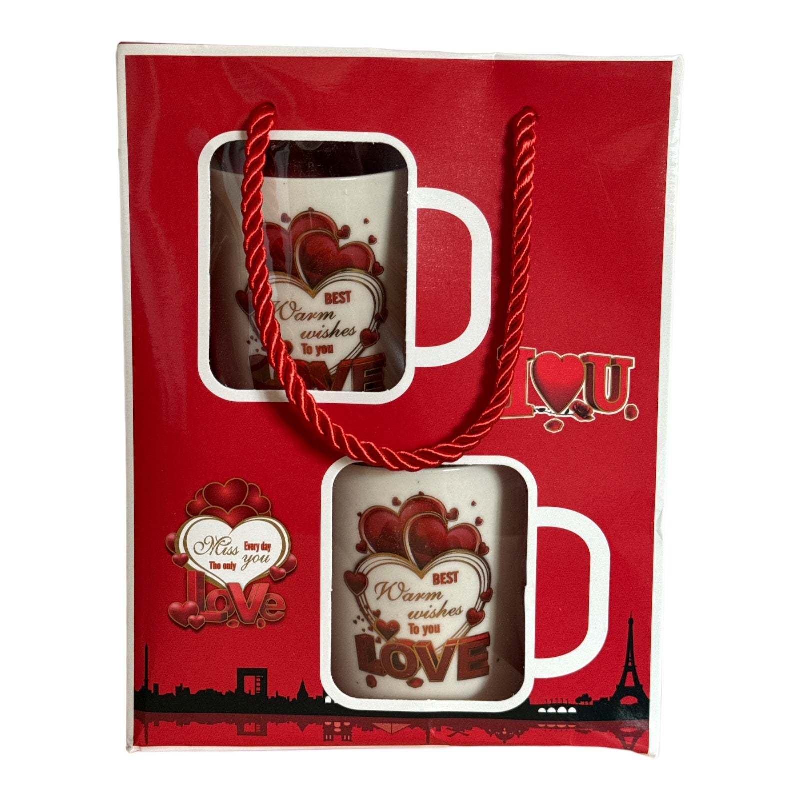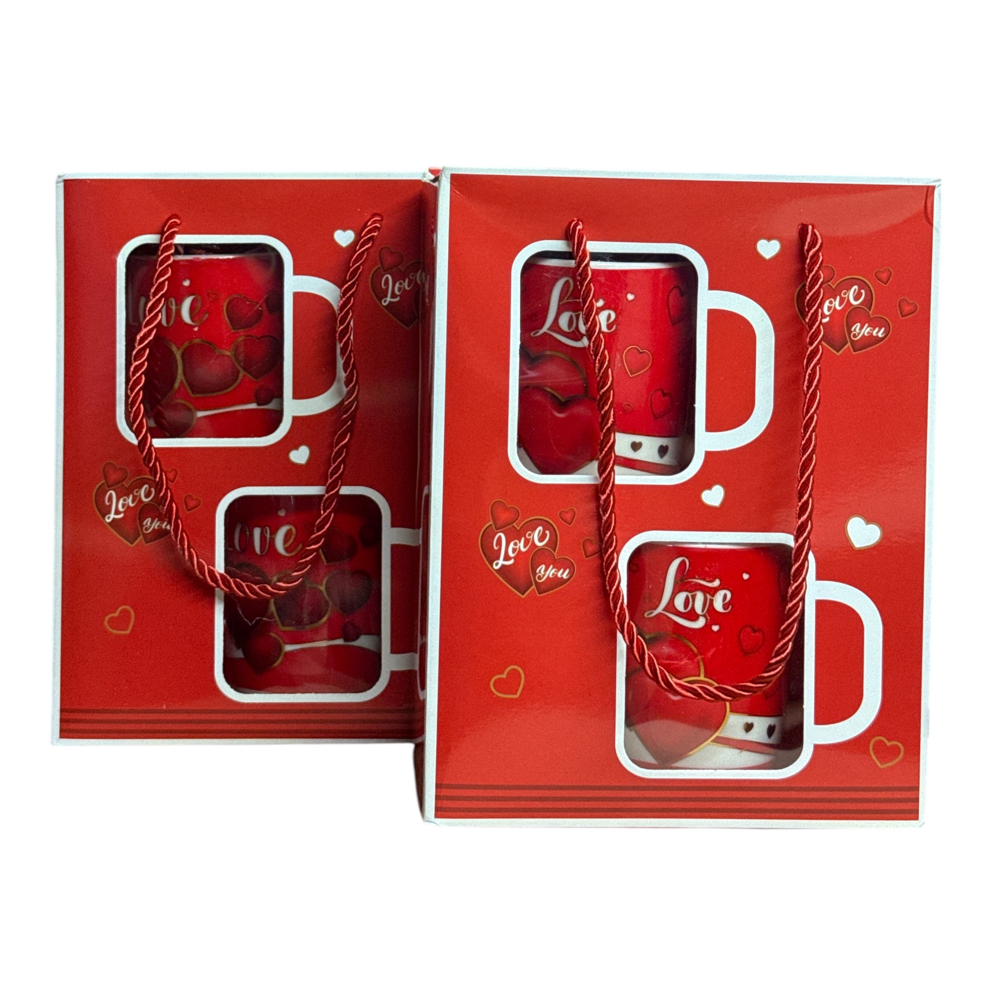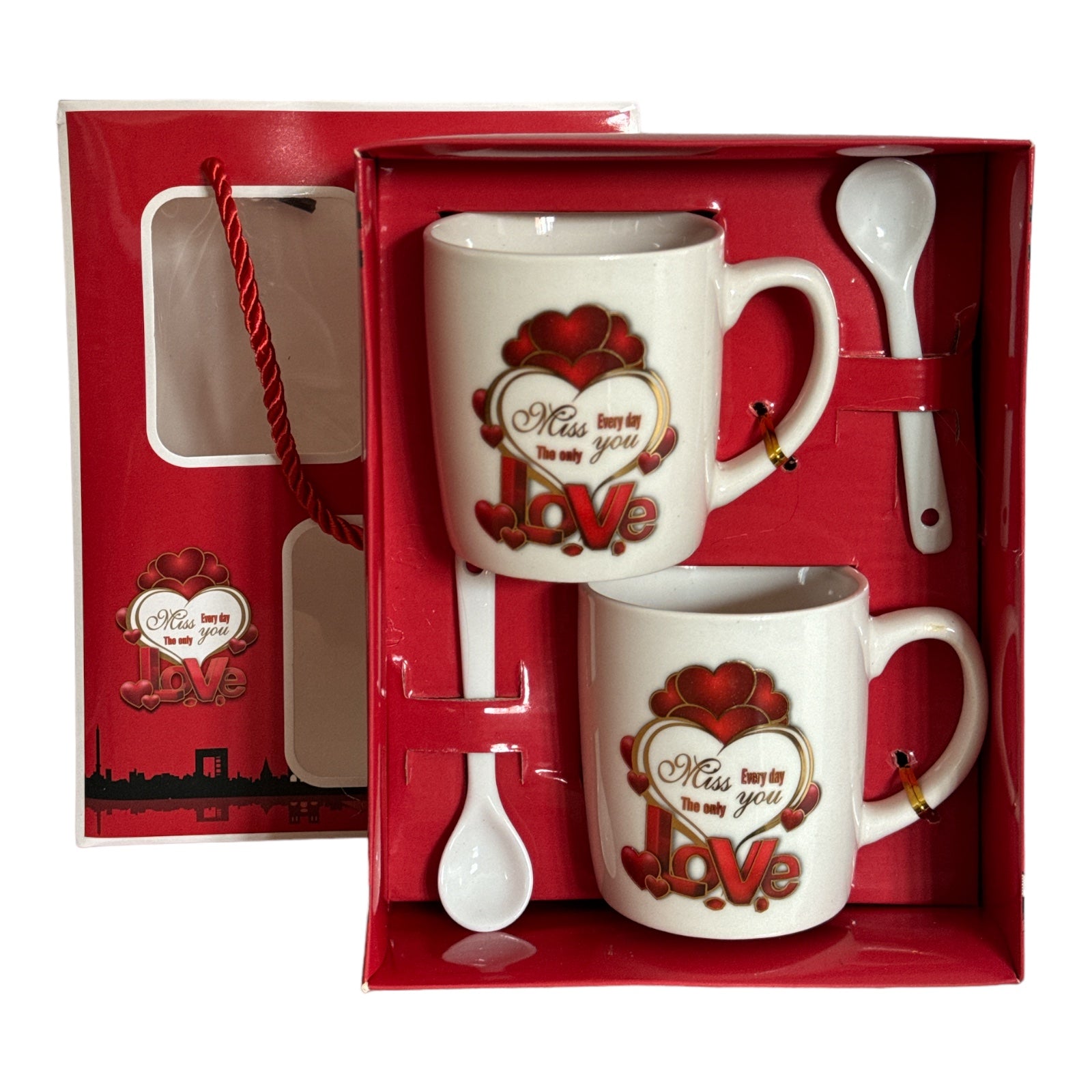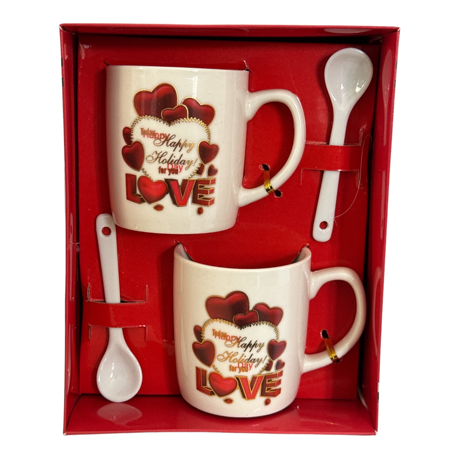 Setul este format din 2 căni cu linguriță și vine ambalat într-o cutie elegantă în formă de pungă de cadou cu șnur.