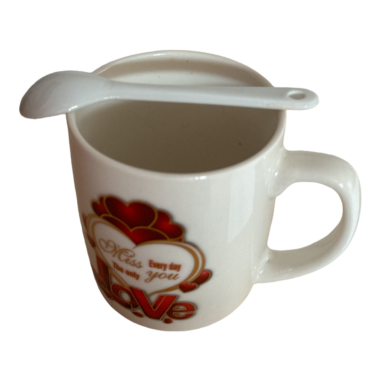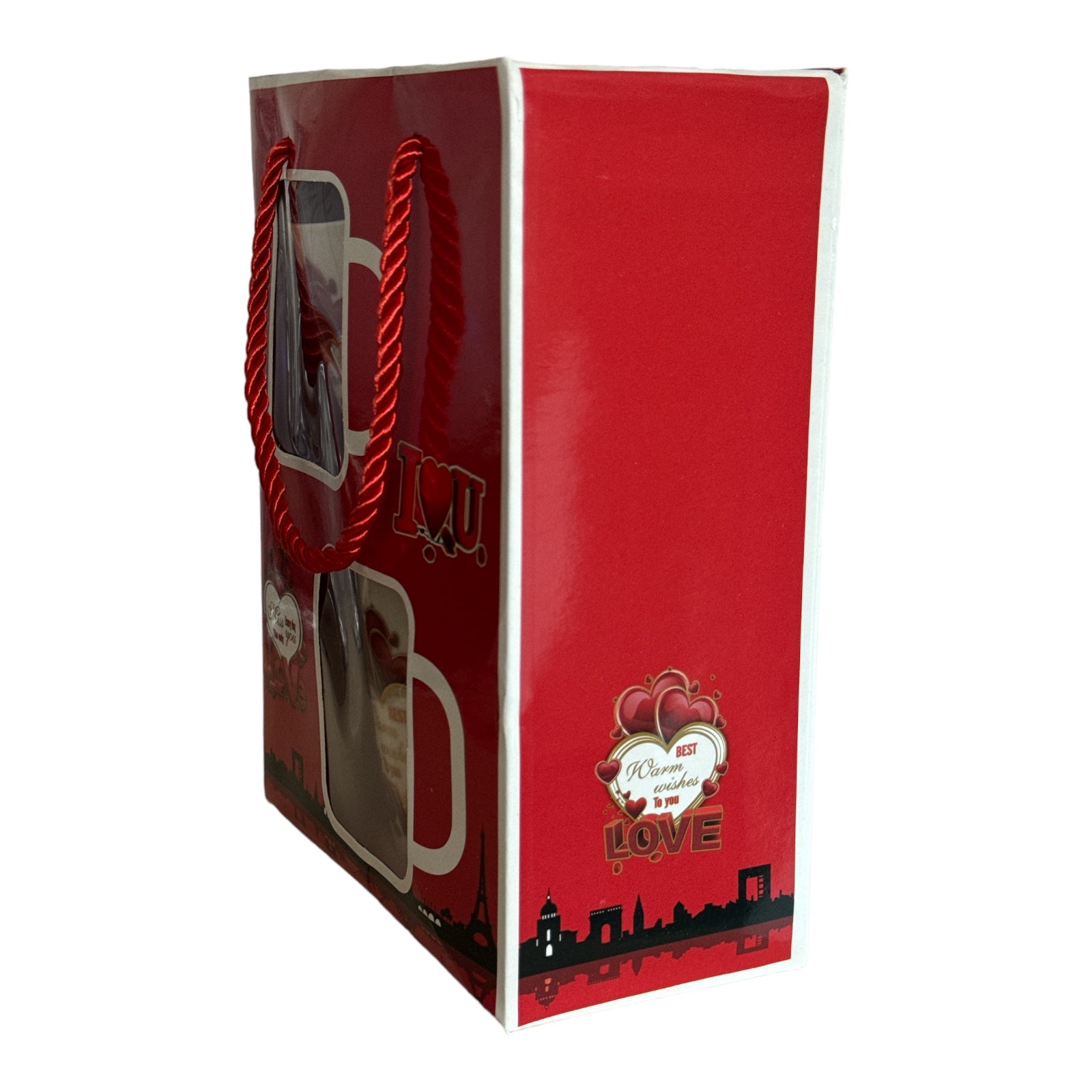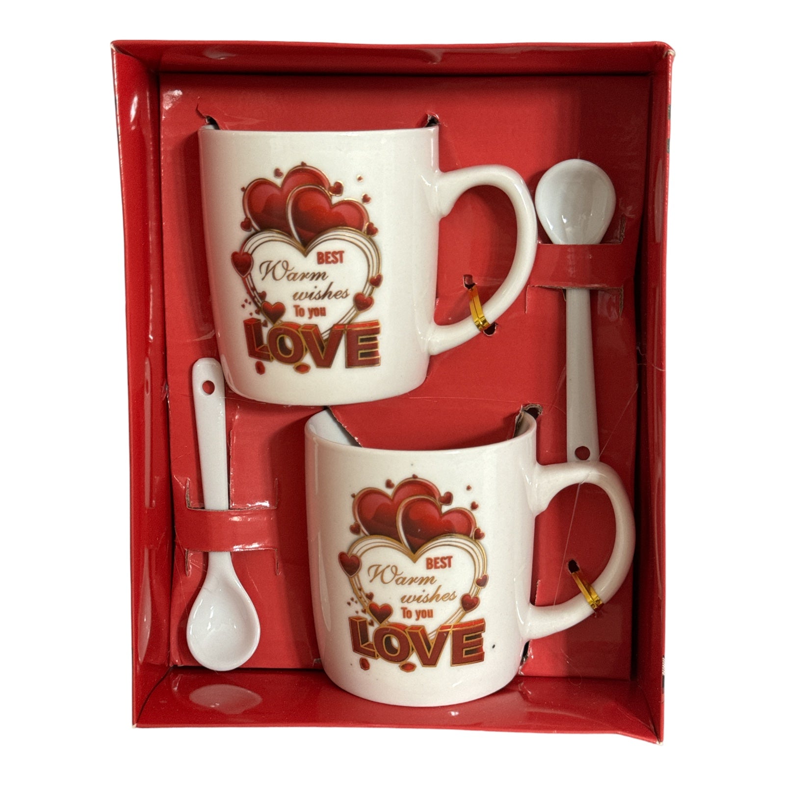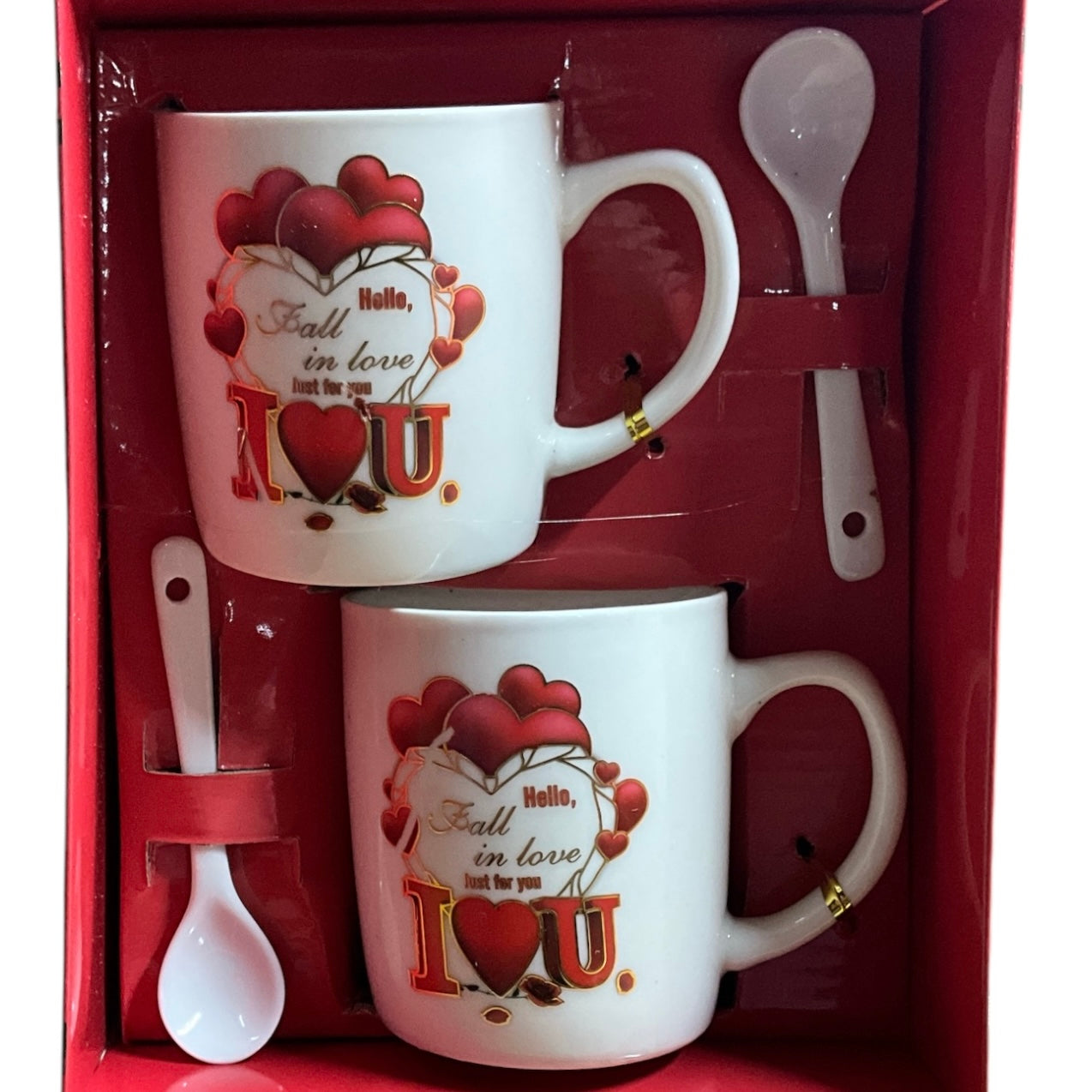 Setul este format din 2 căni cu linguriță și vine ambalat într-o cutie elegantă în formă de pungă de cadou cu șnur.