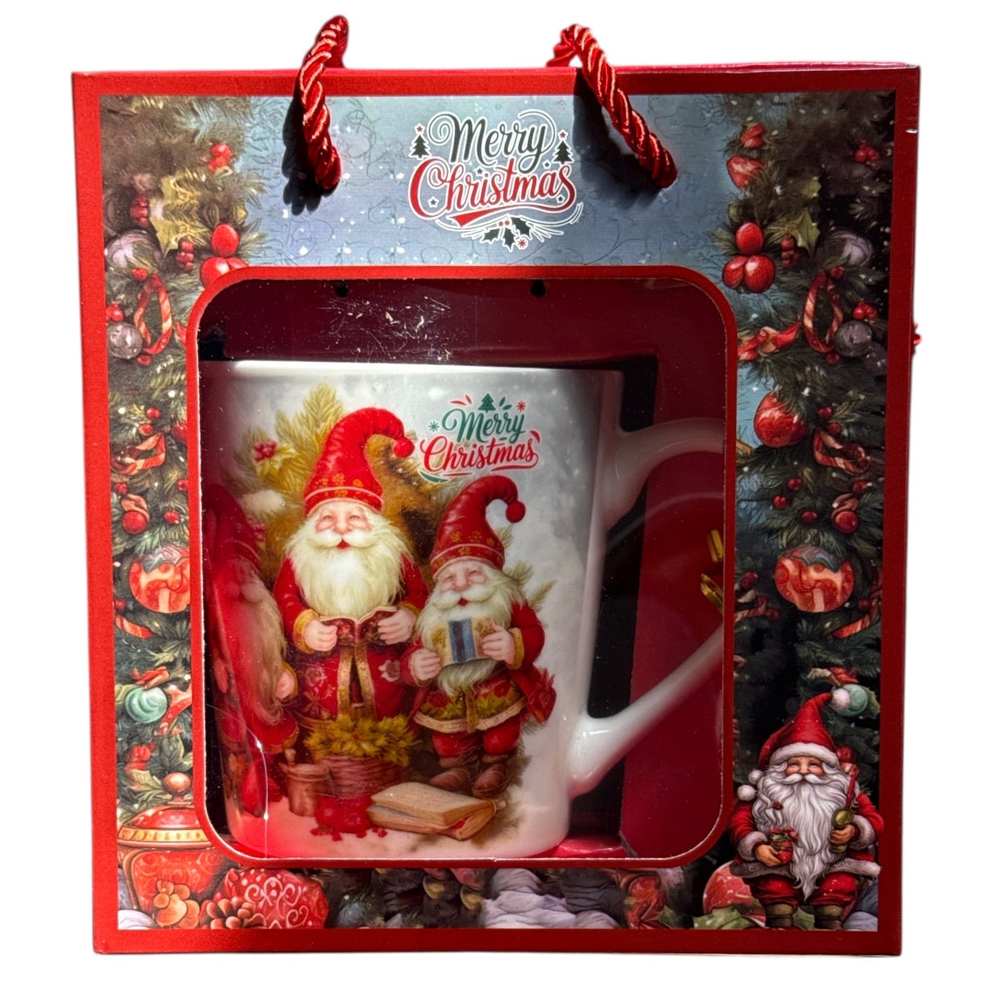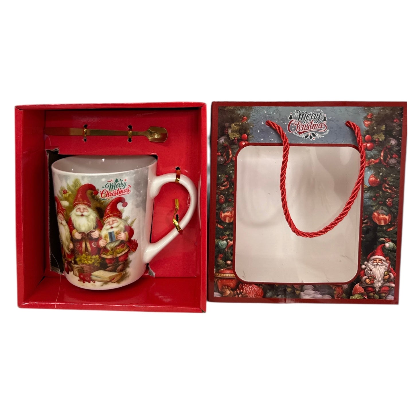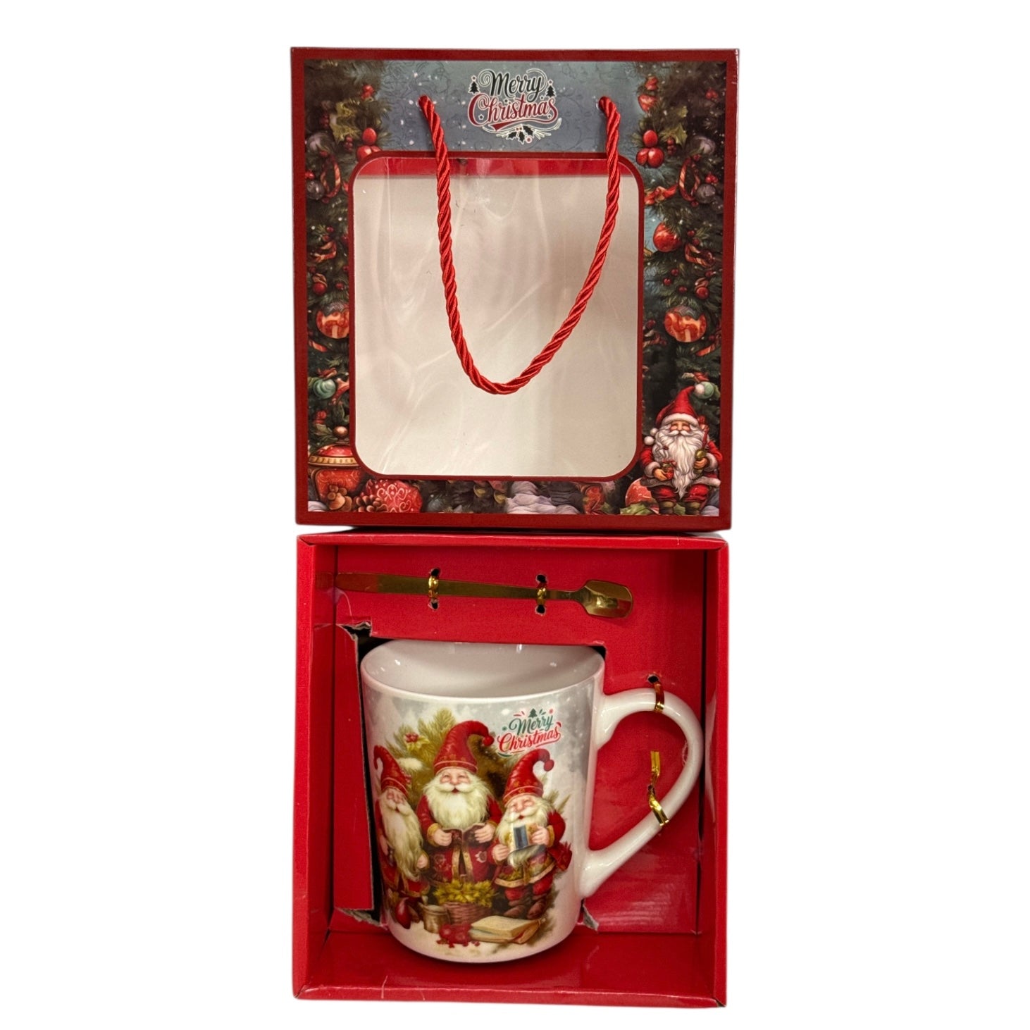 Setul este format dintr-o cană cu linguriță metalică și vine ambalat într-o cutie elegantă cu motive de Crăciun.