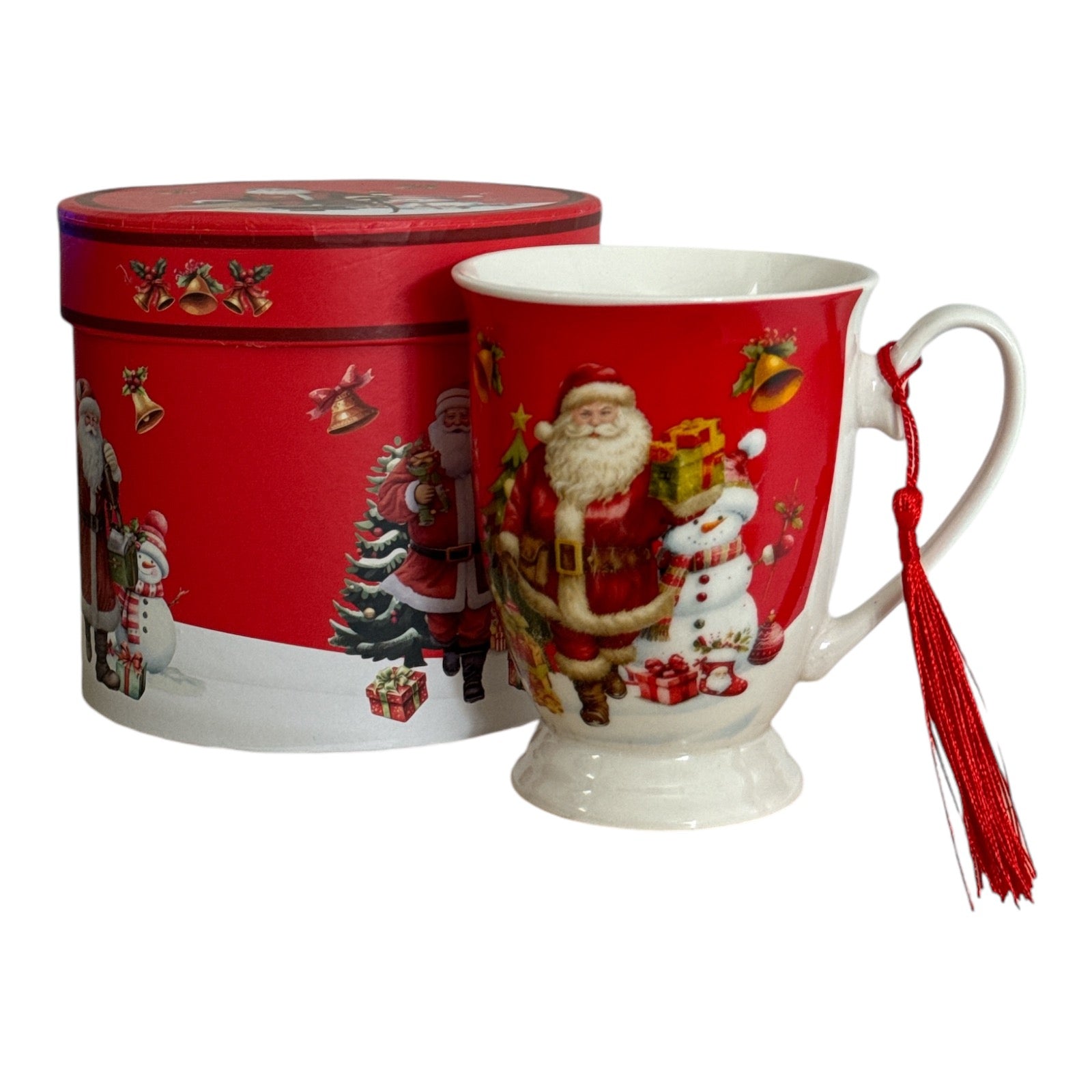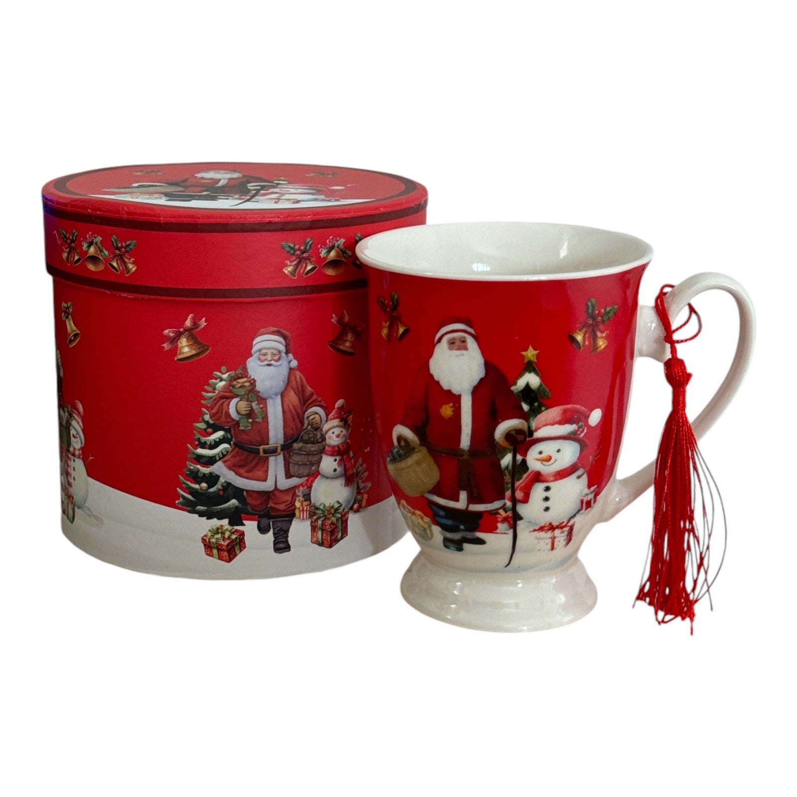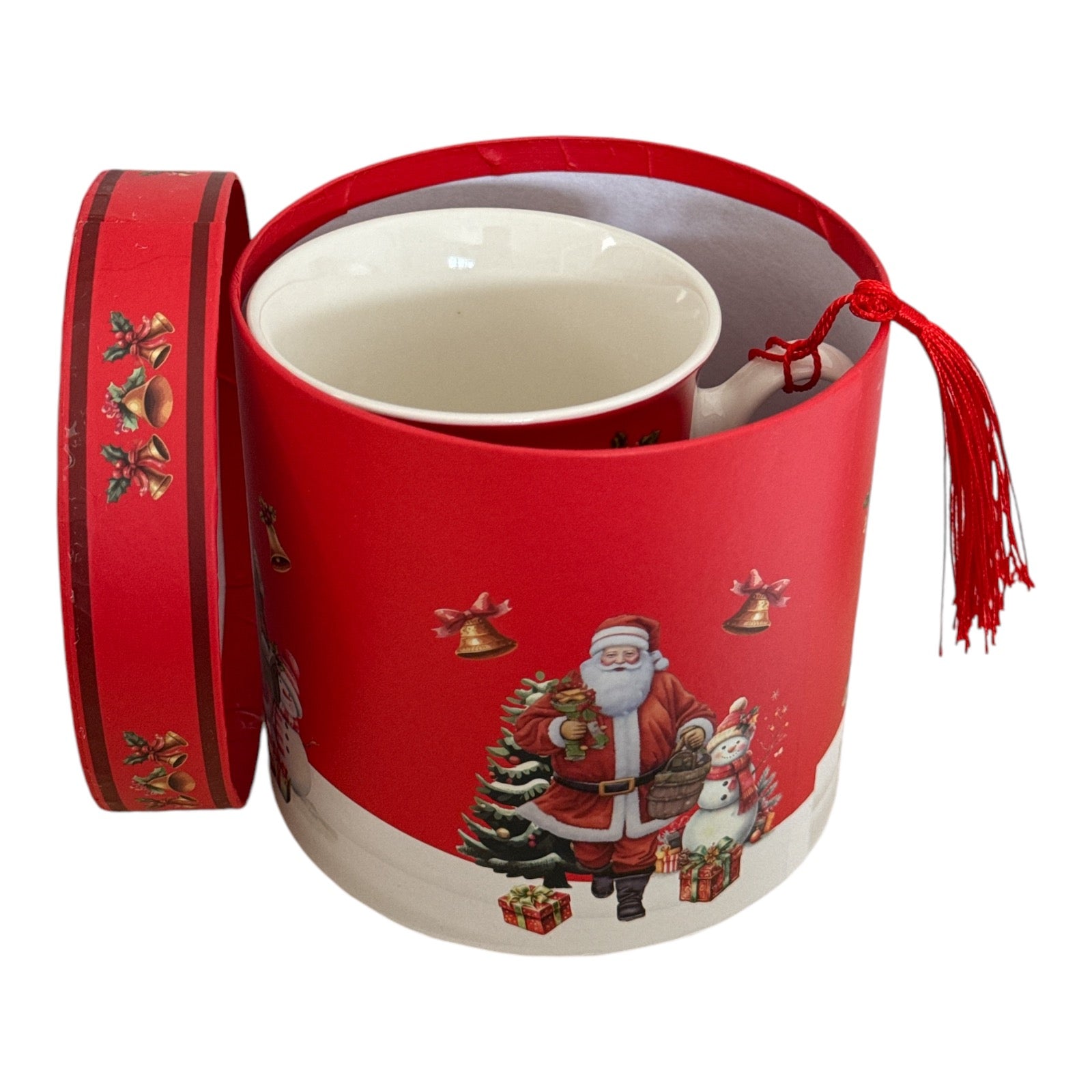 Setul este format dintr-o cană cu ciucure și vine ambalat într-o cutie elegantă de cadou rotundă specifică Sărbătorilor de iarnă.