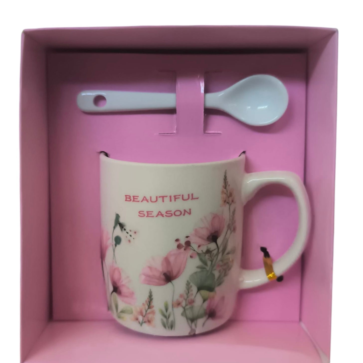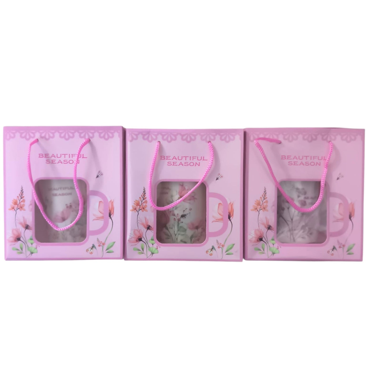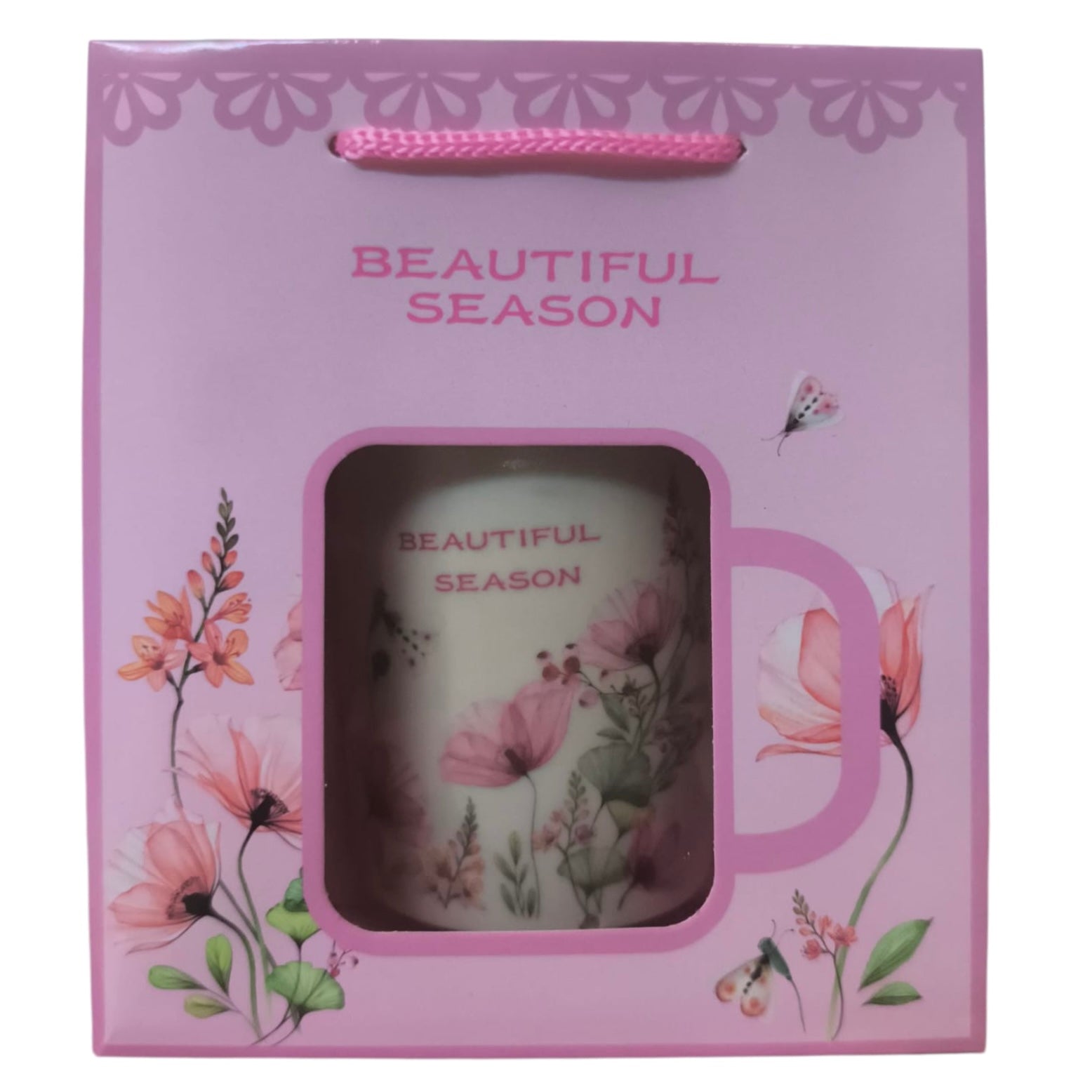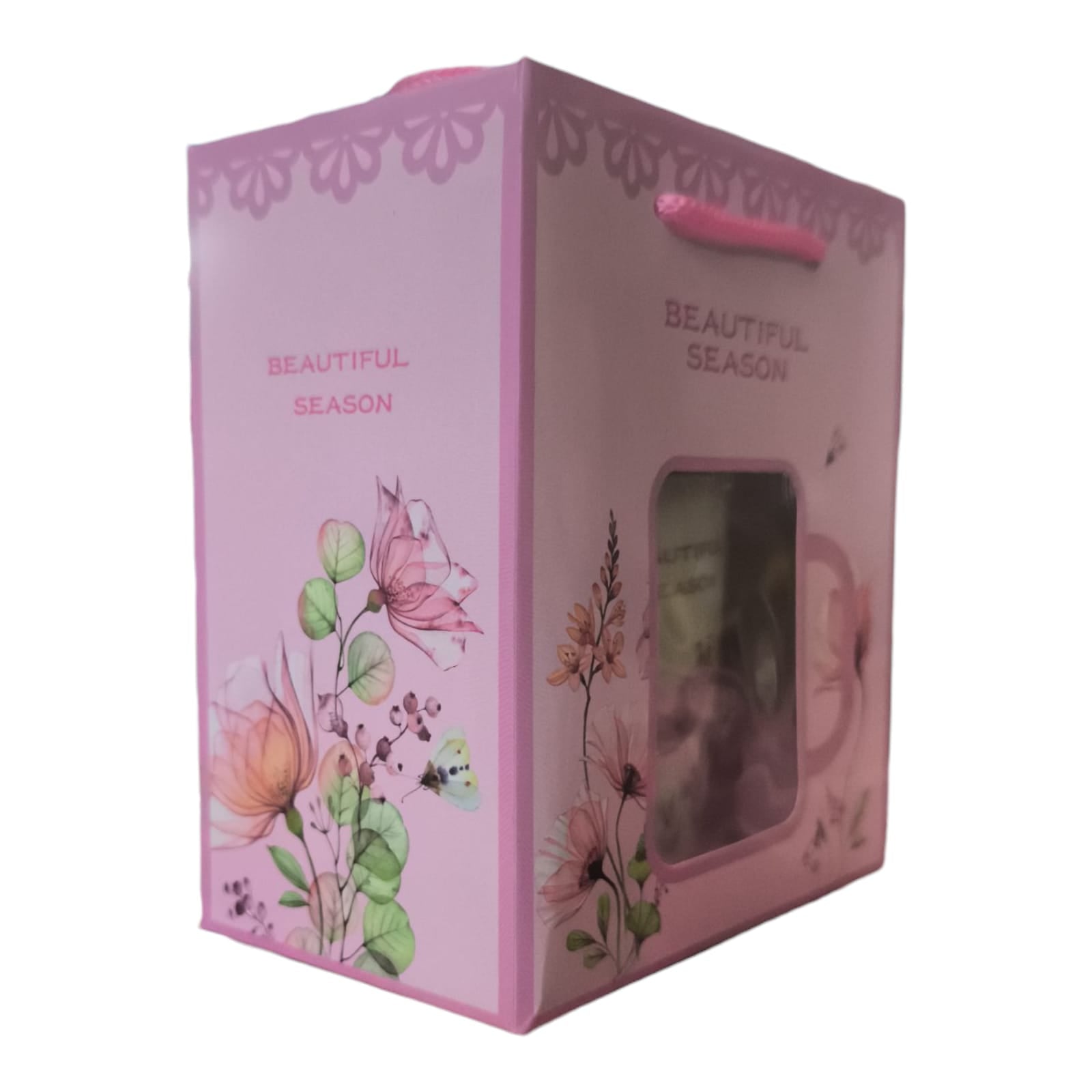 Setul este format dintr-o cană cu linguriță și vine ambalat într-o cutie eleganta în formă de pungă de cadou cu șnur.
