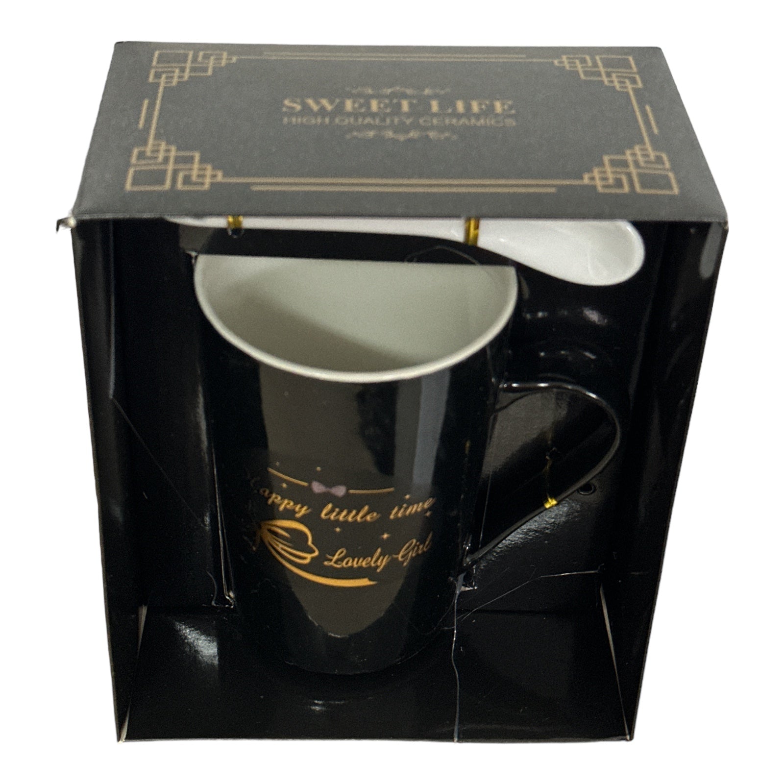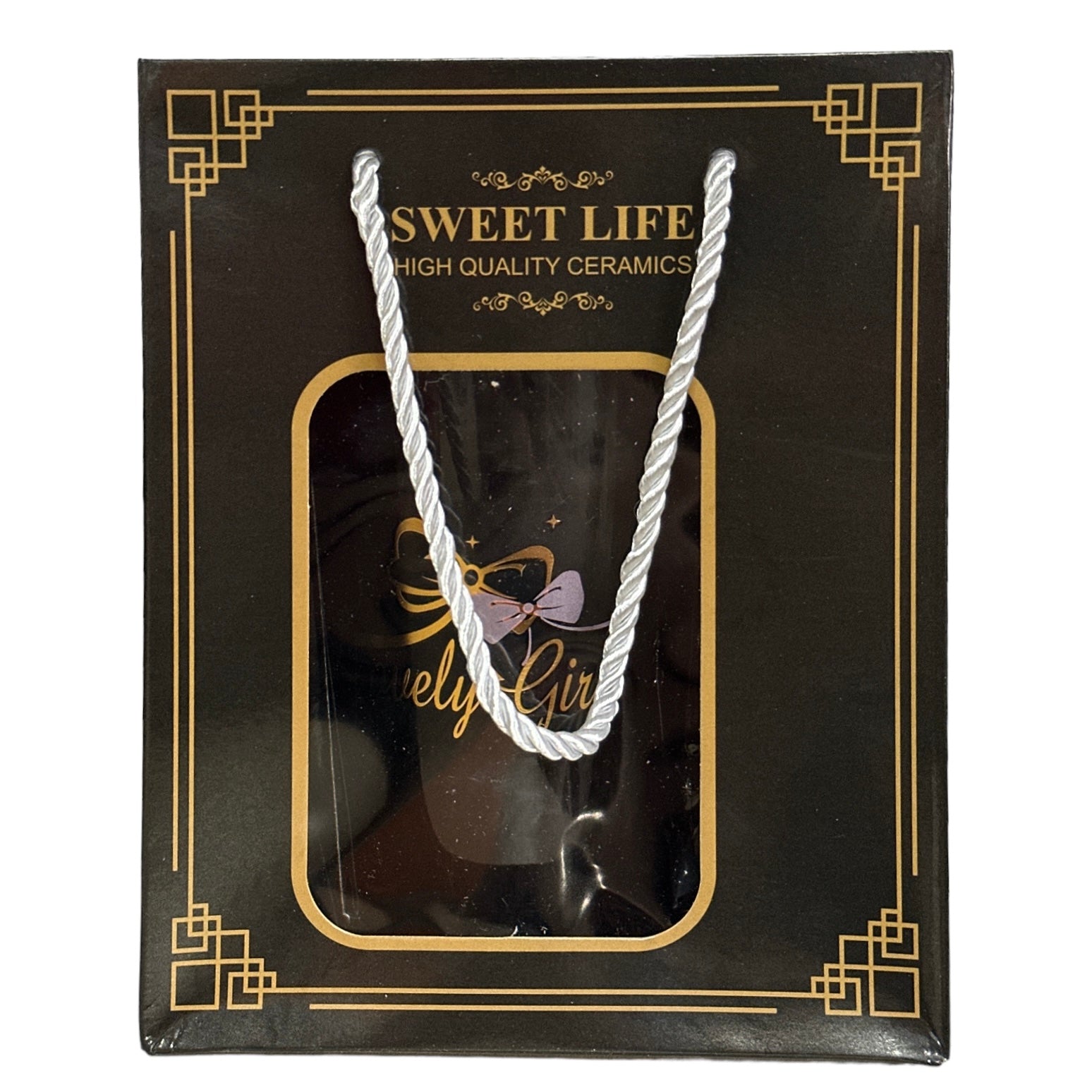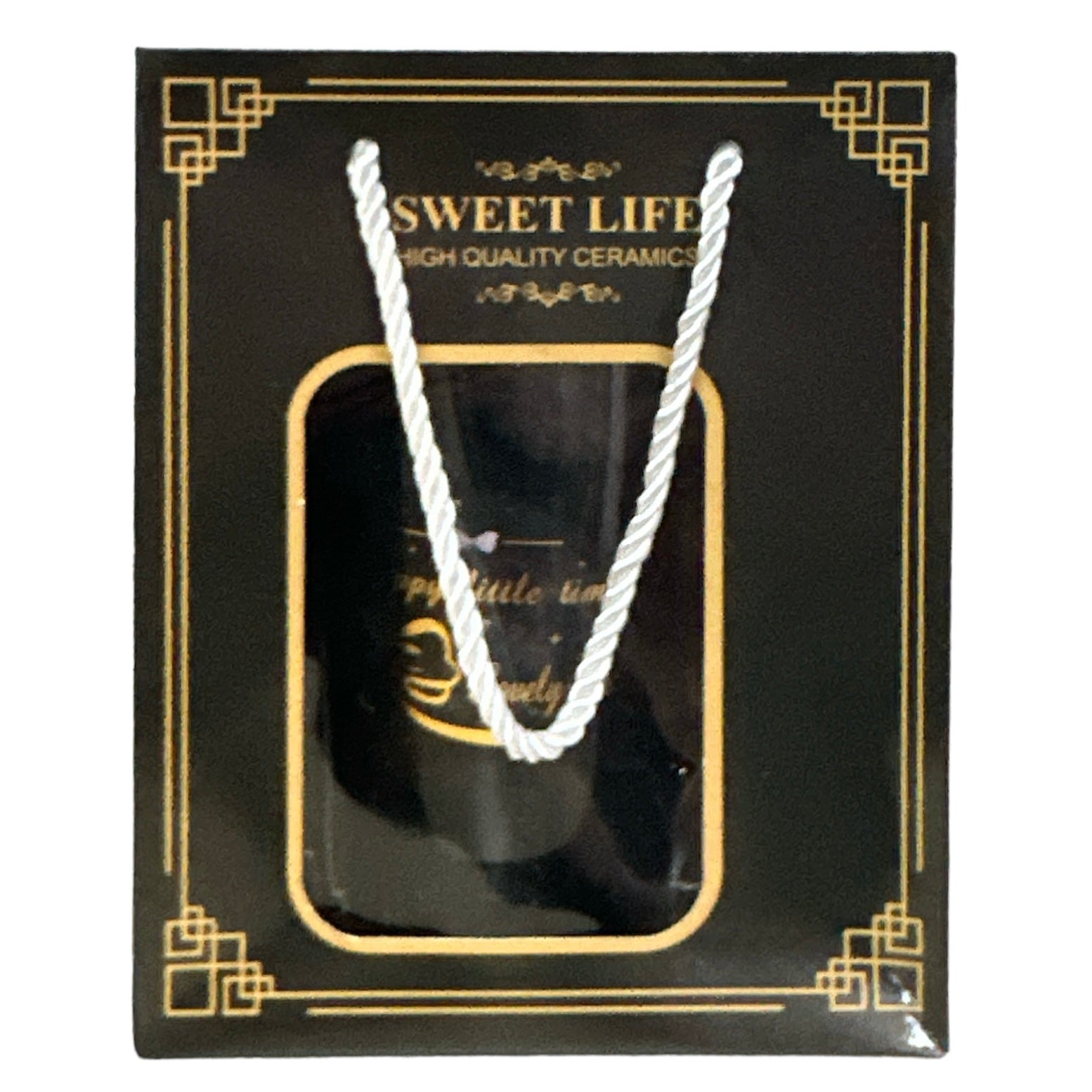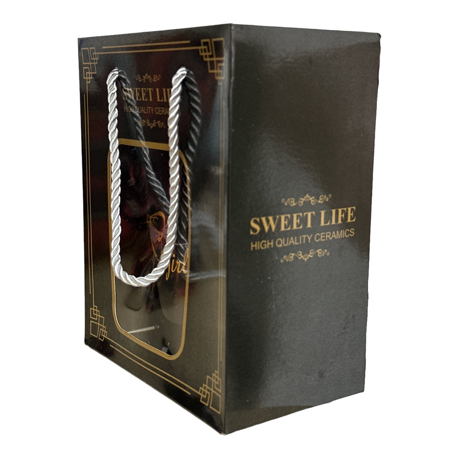 Setul este format dintr-o cană cu linguriță și vine ambalat într-o cutie elegantă în formă de pungă de cadou cu șnur.