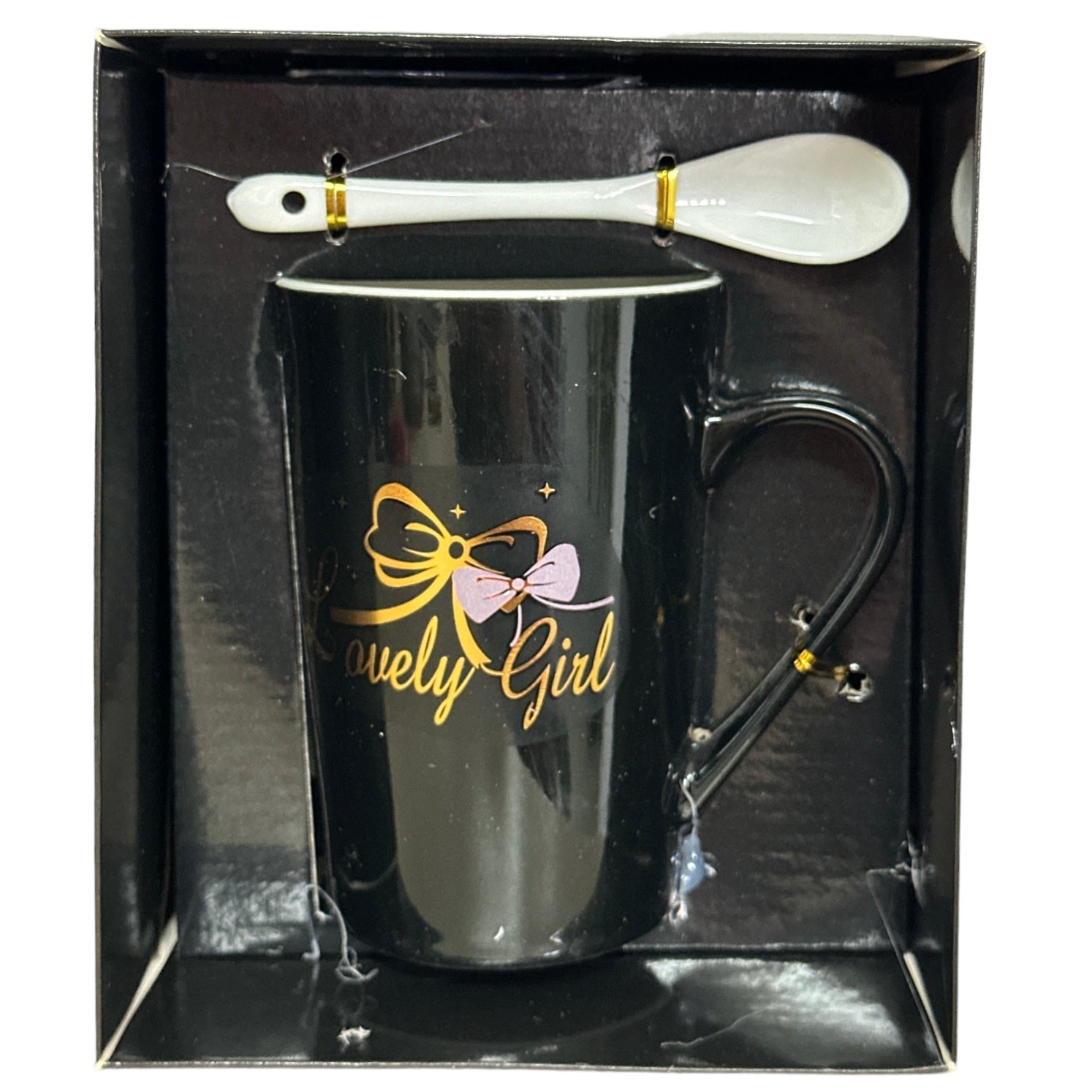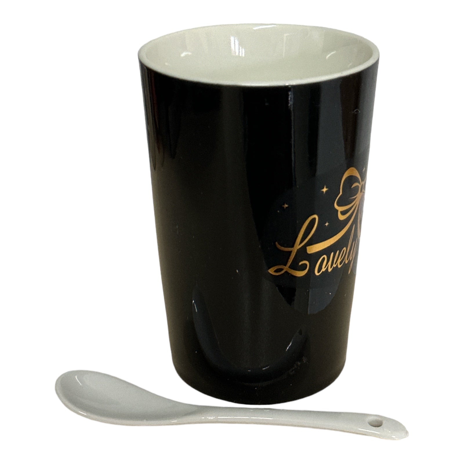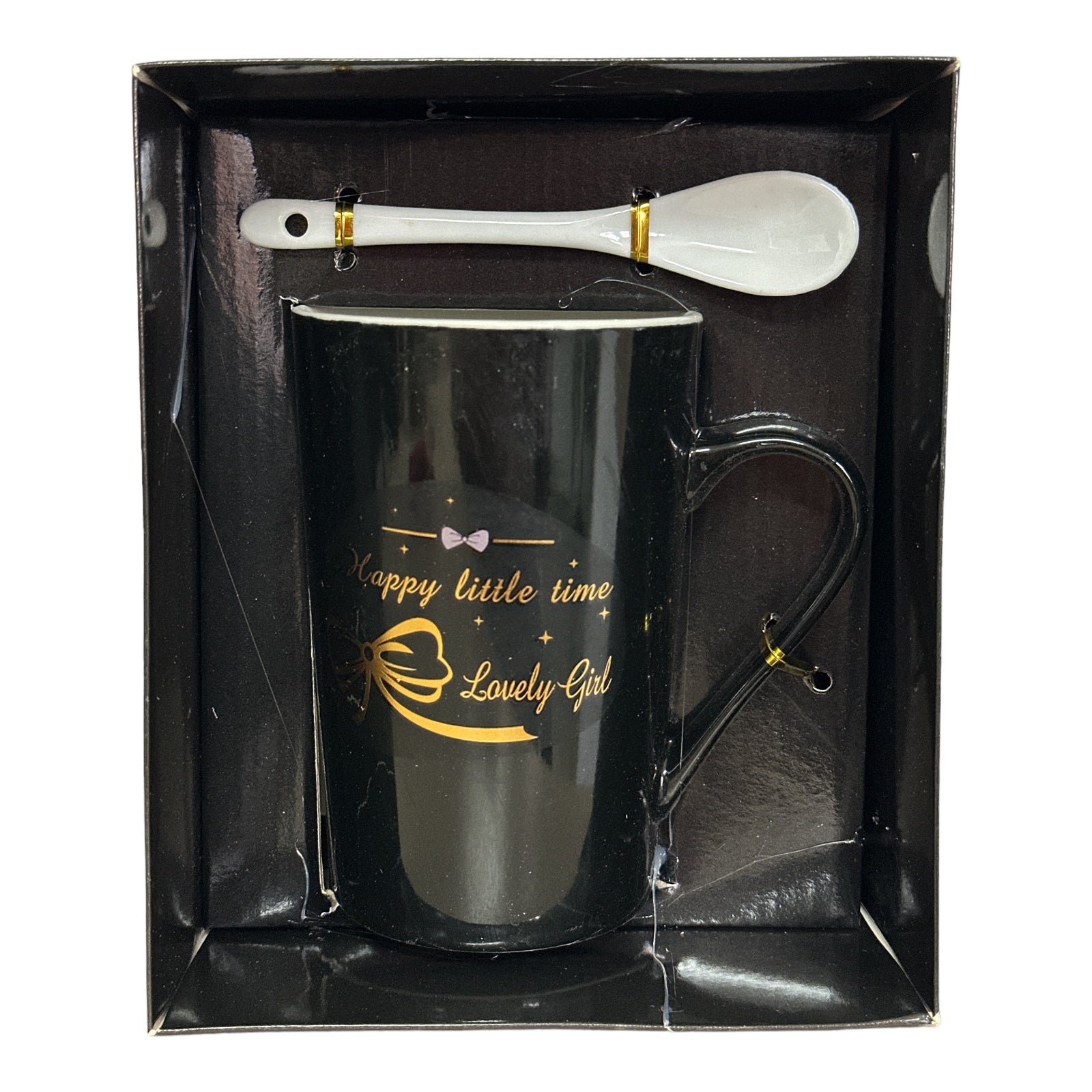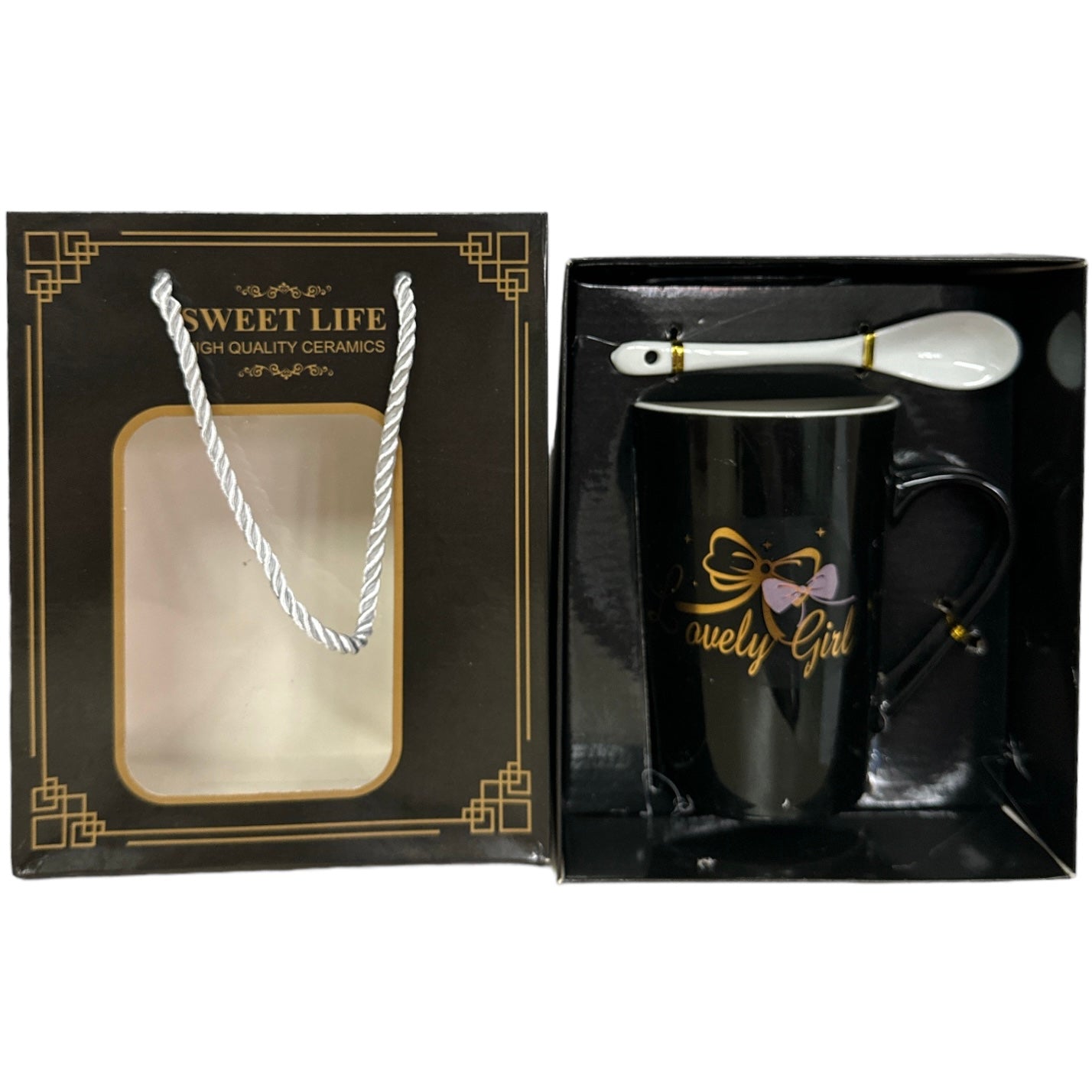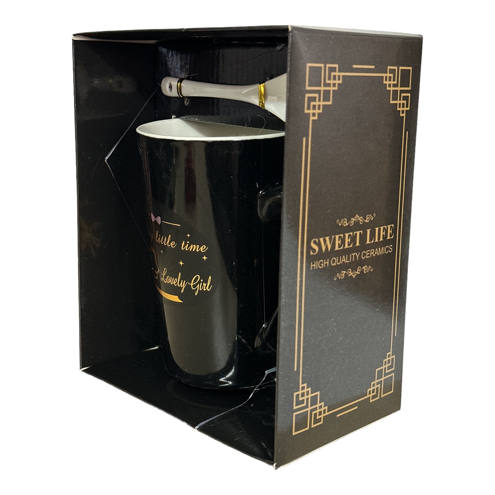 Setul este format dintr-o cană cu linguriță și vine ambalat într-o cutie elegantă în formă de pungă de cadou cu șnur.