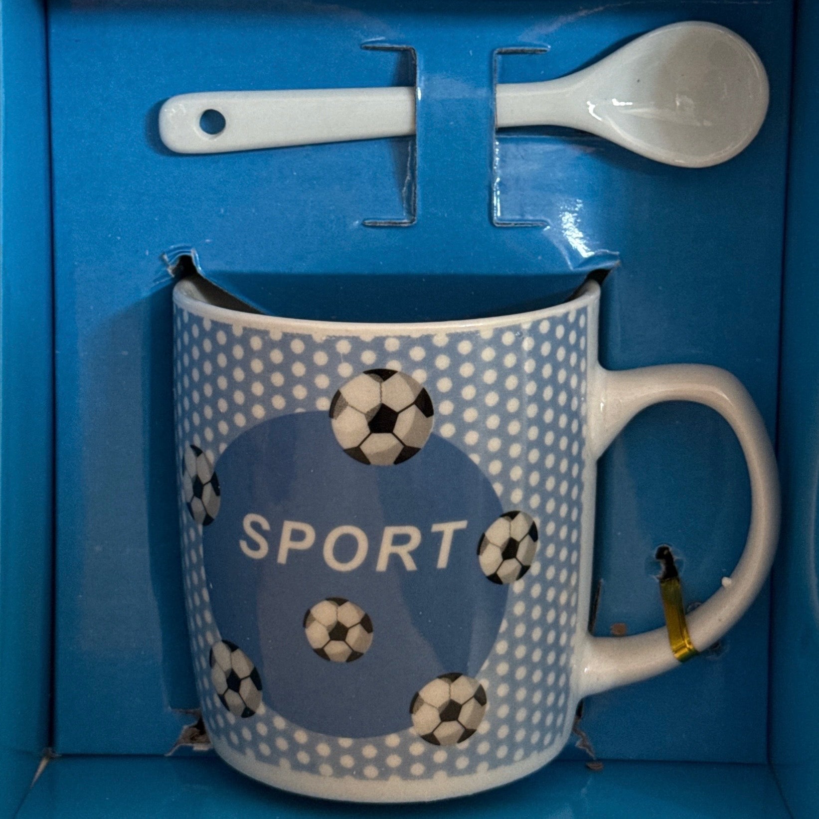 Setul este format dintr-o cană cu linguriță și vine ambalat într-o cutie eleganta în formă de pungă de cadou cu șnur.