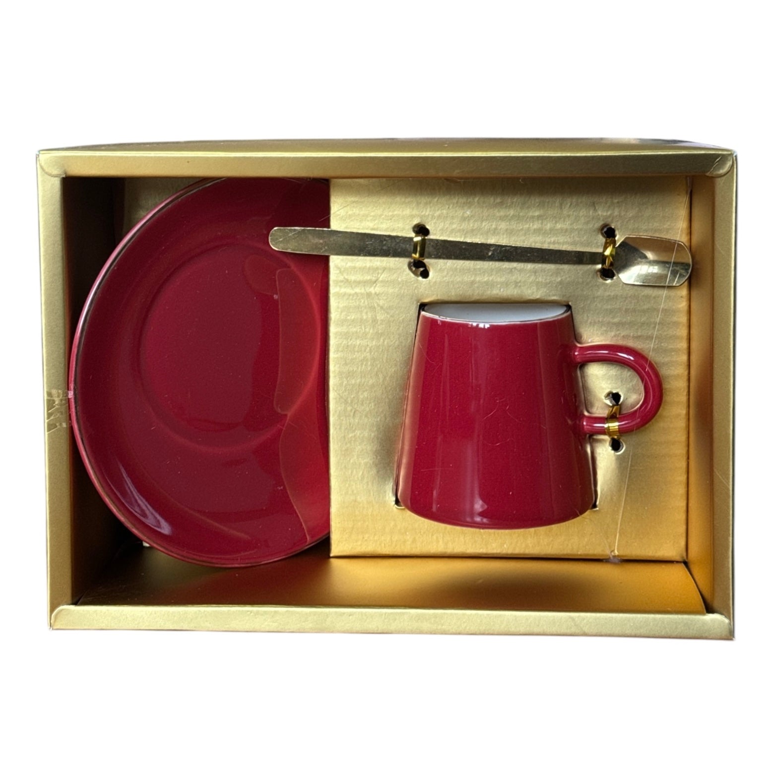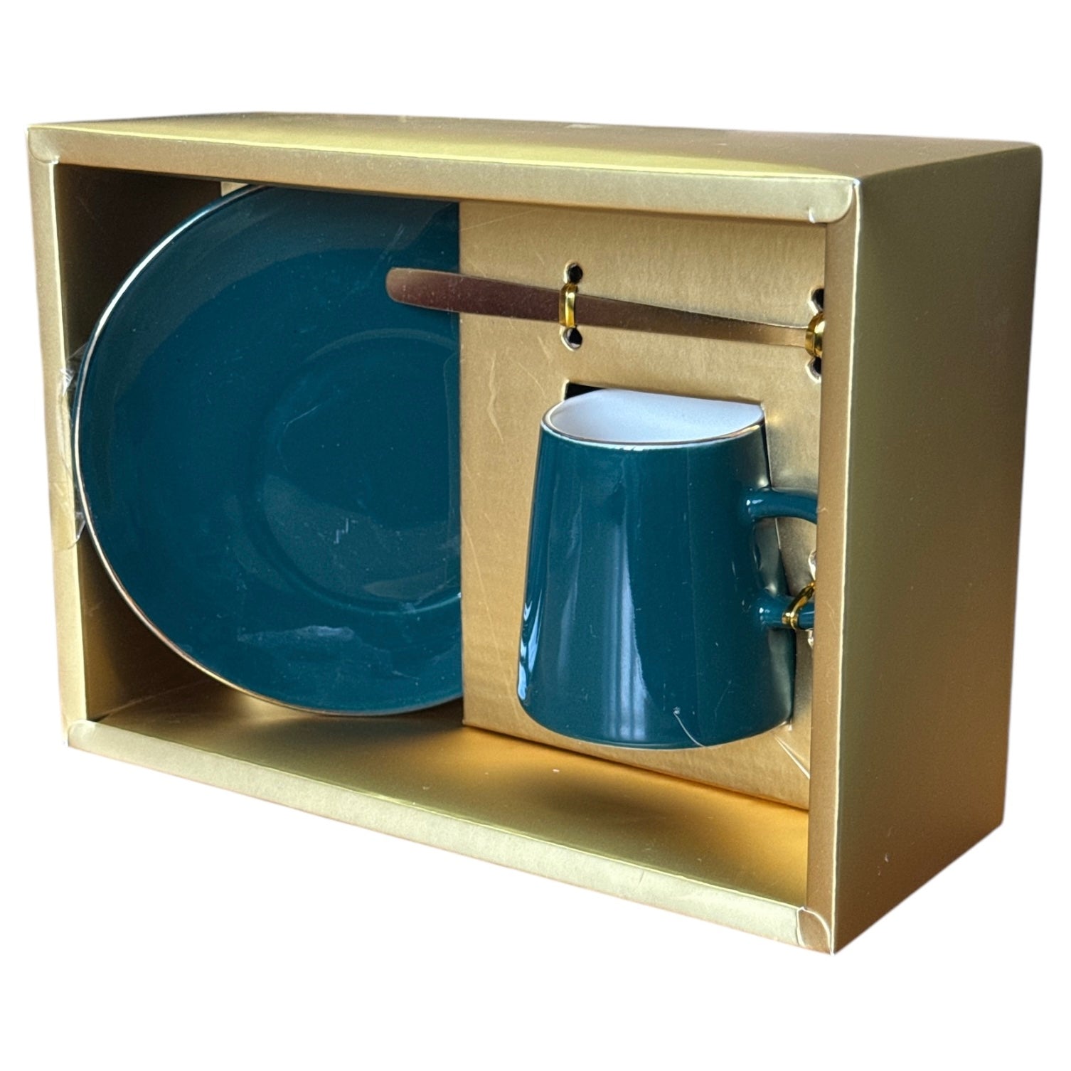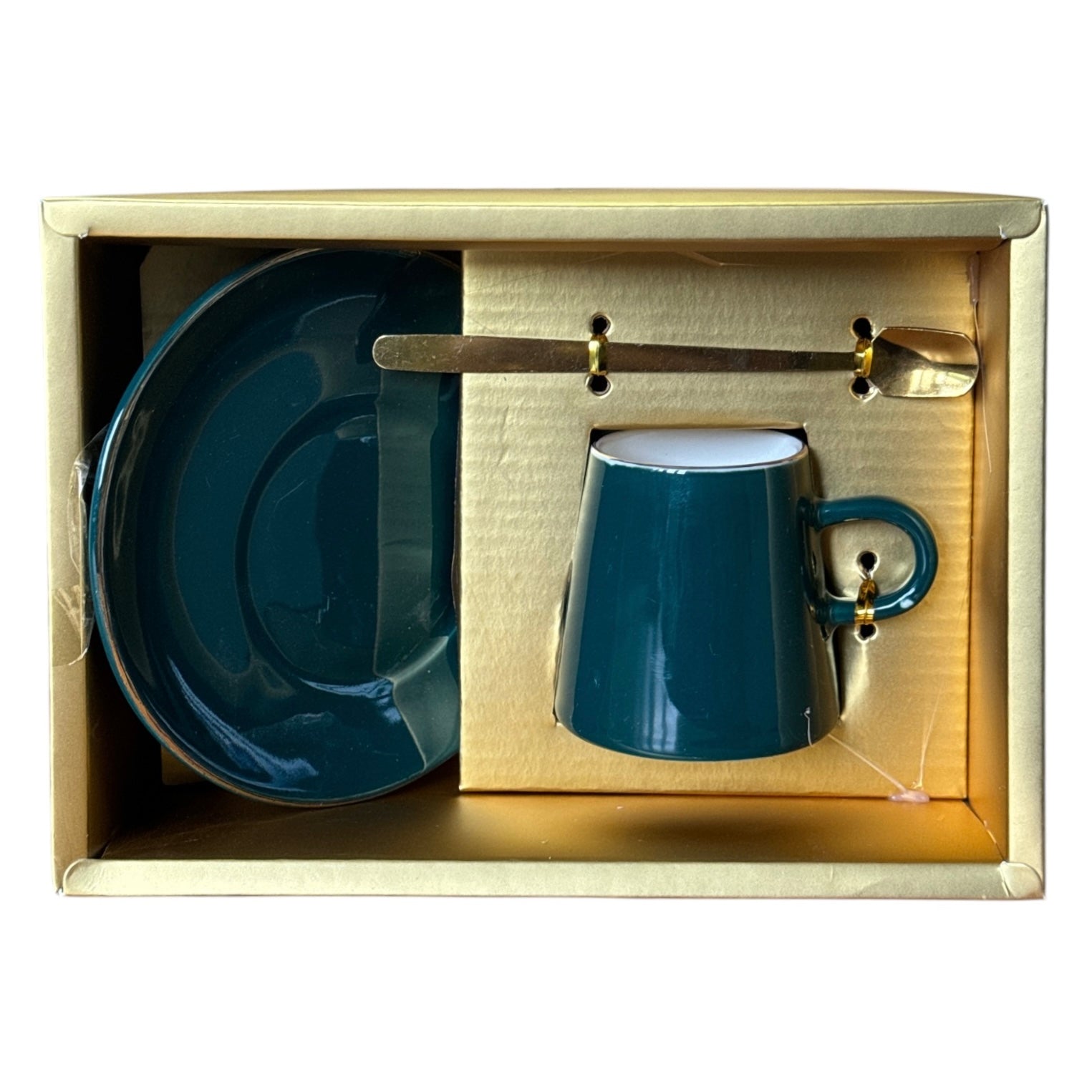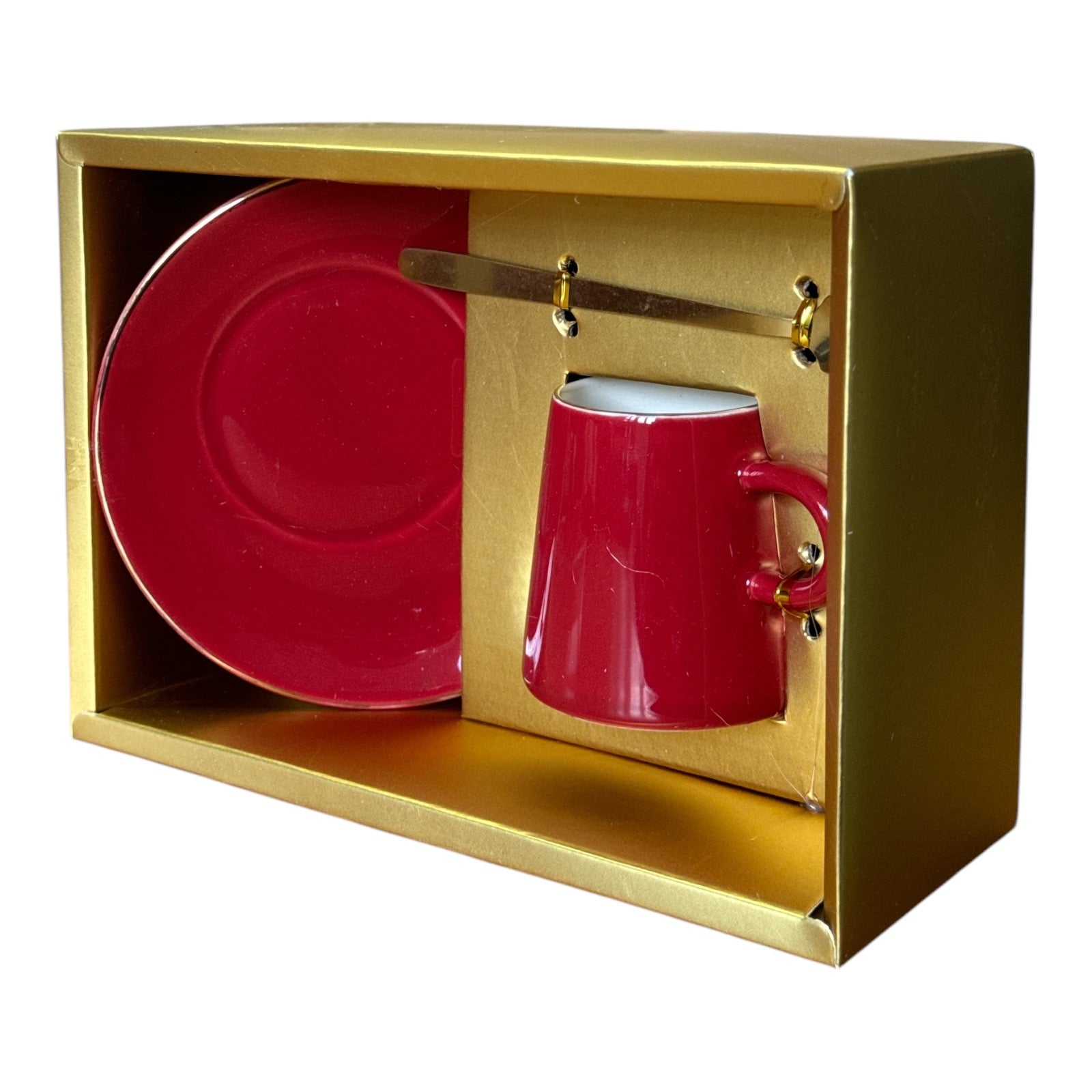Setul este format dintr-o ceașcă cu farfurie și o linguriță metalică și vine ambalat într-o cutie elegantă din carton auriu perfectă pentru un cadou plin de bun gust.