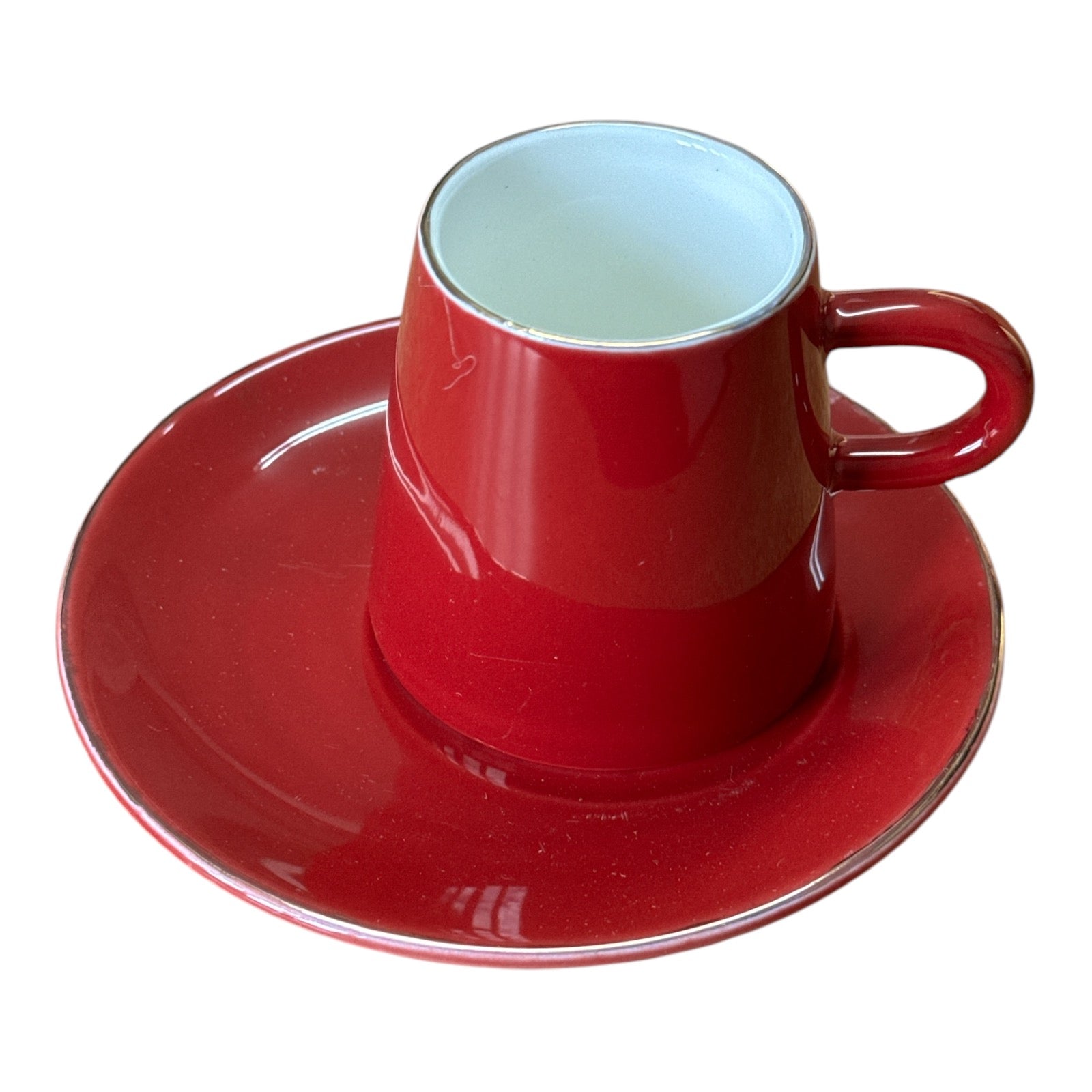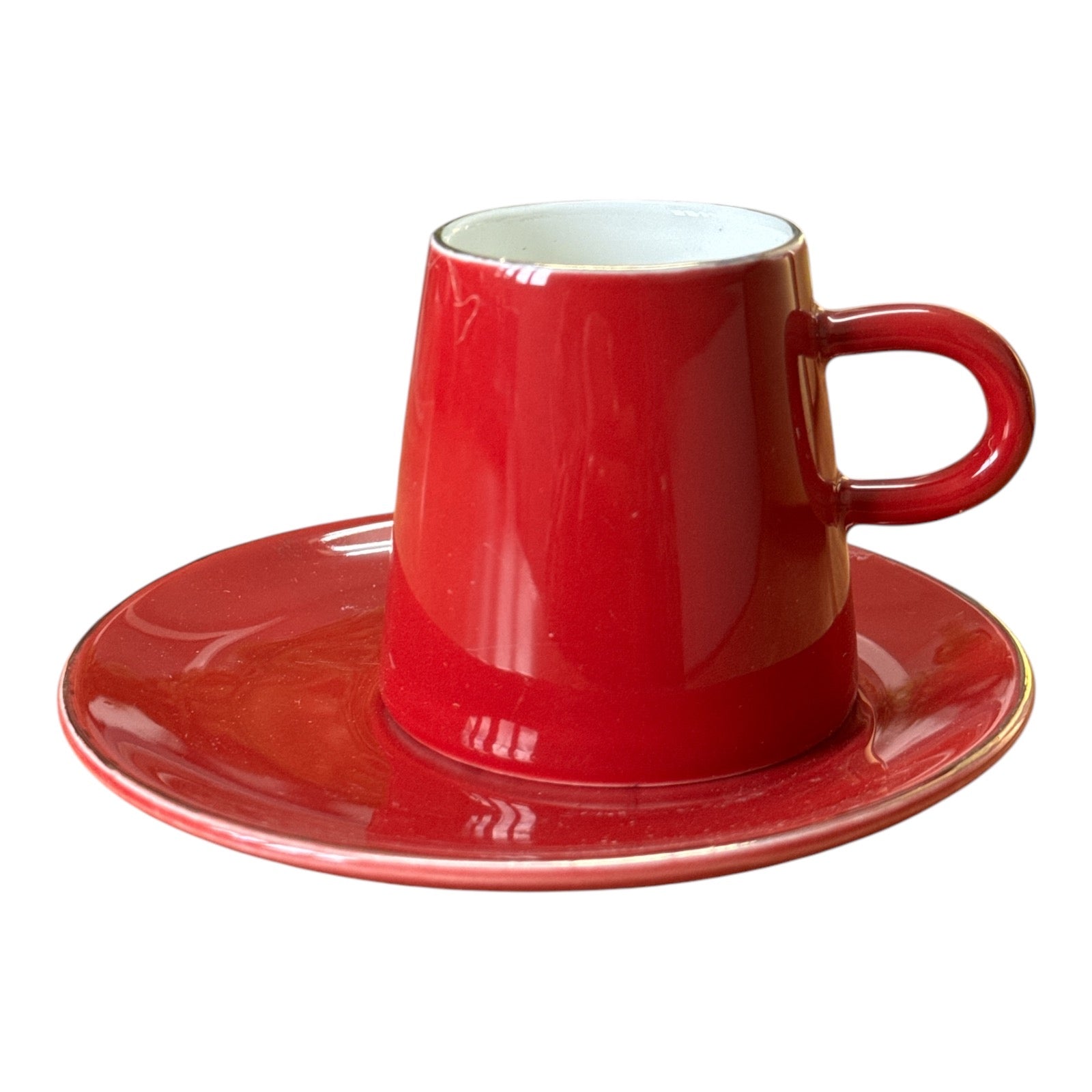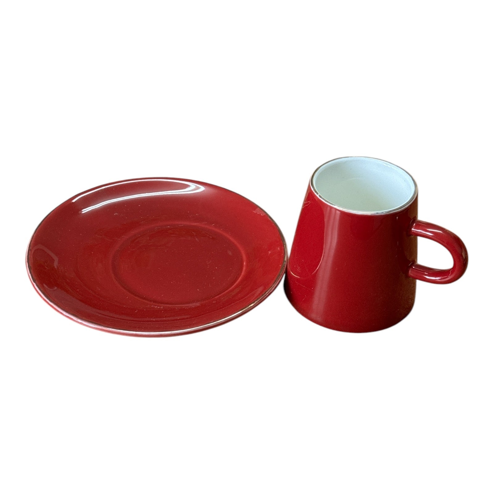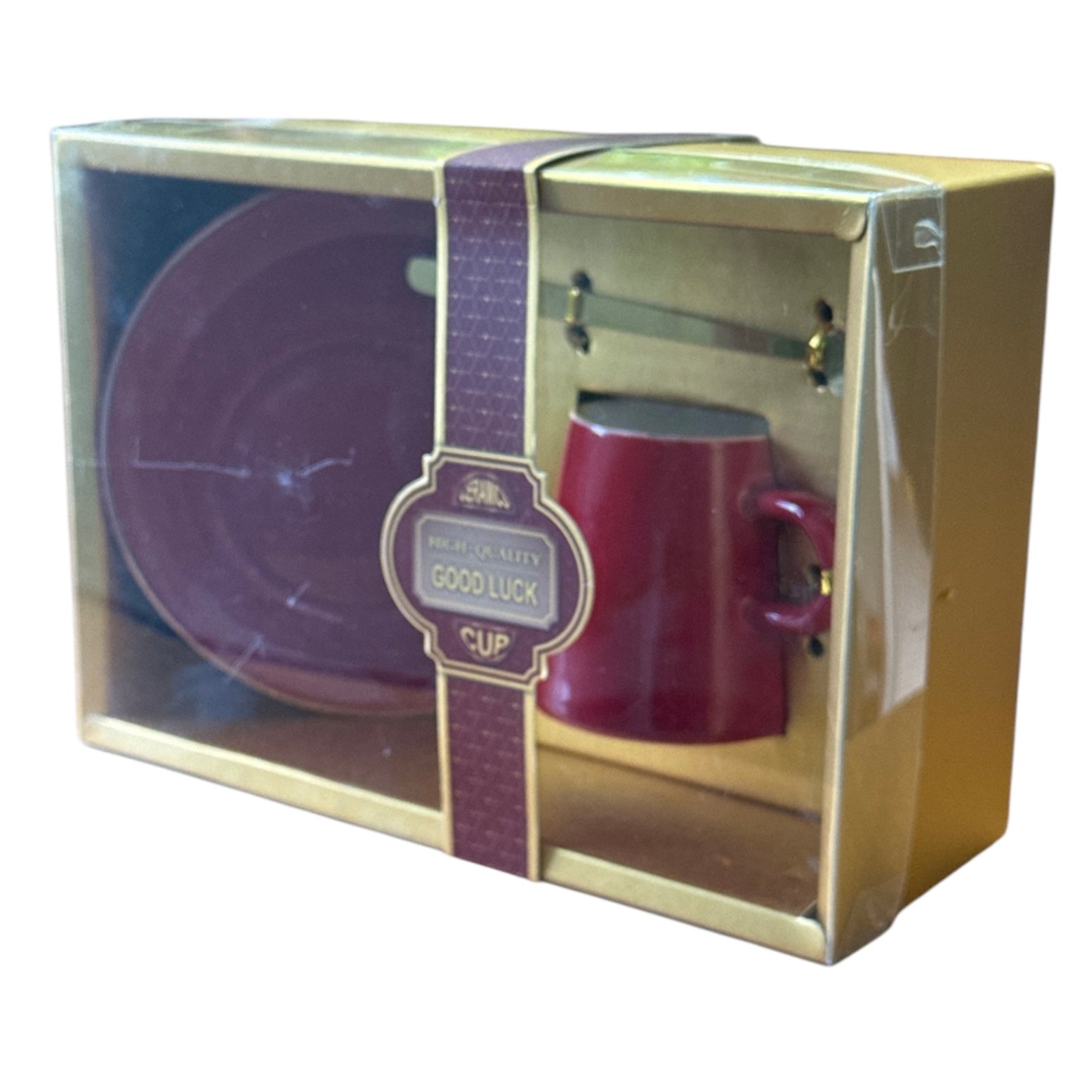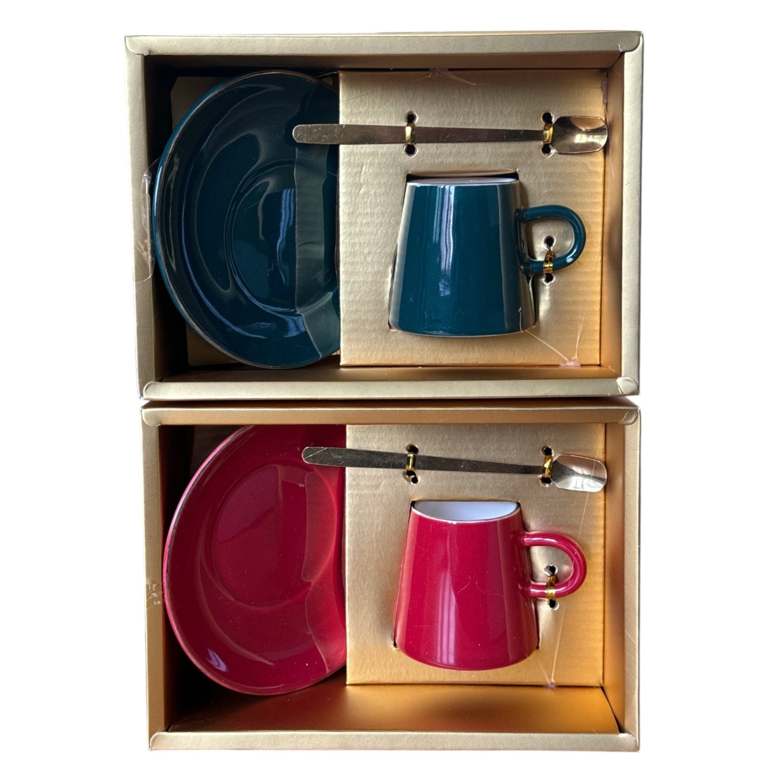 Setul este format dintr-o ceașcă cu farfurie și o linguriță metalică și vine ambalat într-o cutie elegantă din carton auriu perfectă pentru un cadou plin de bun gust.