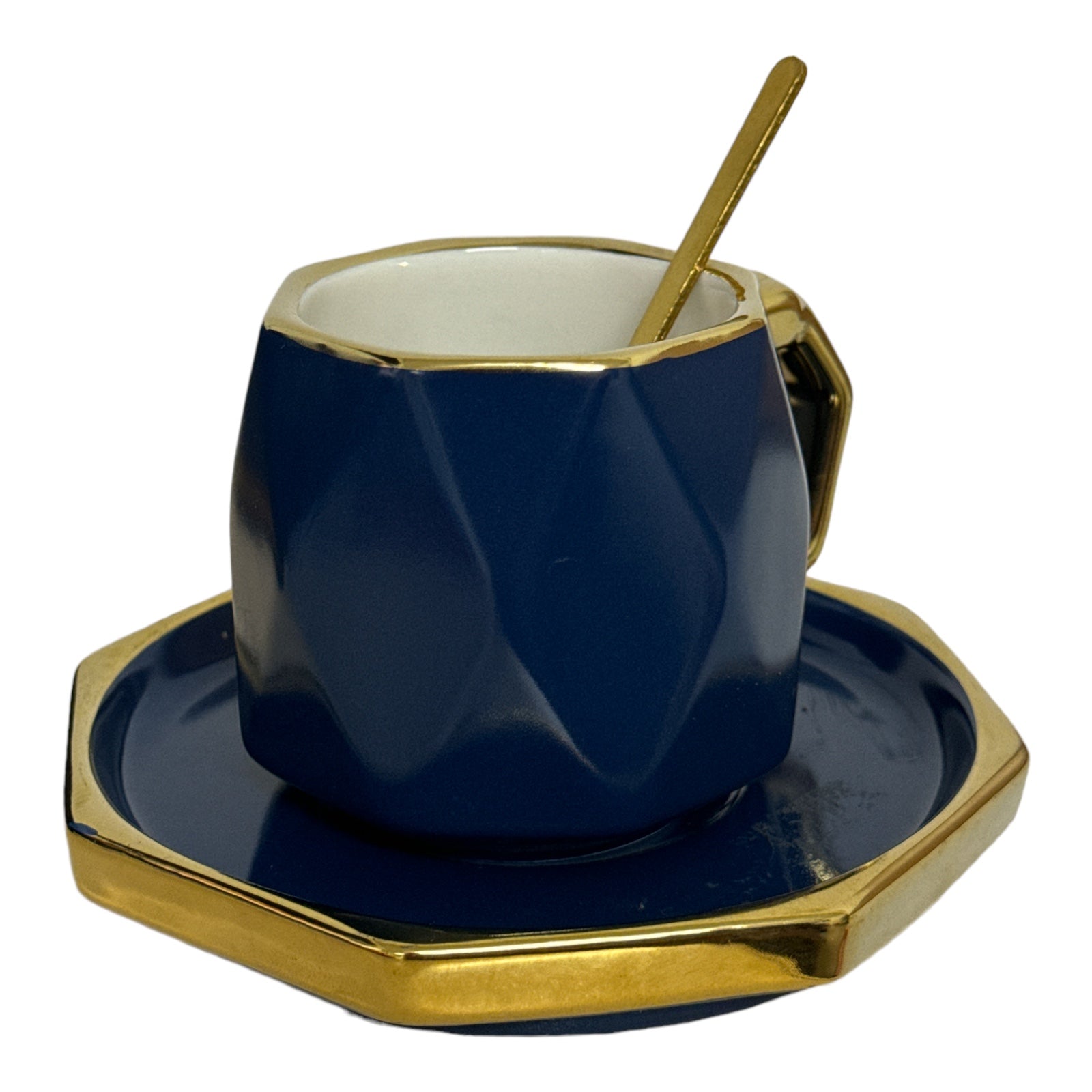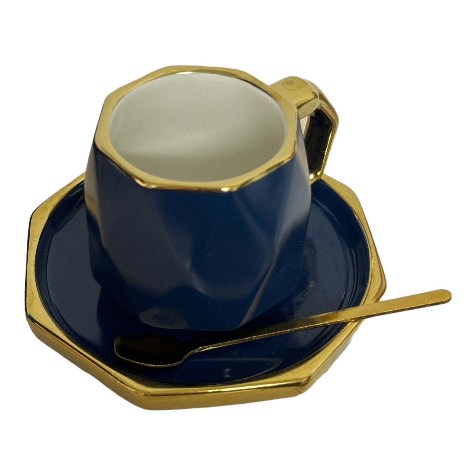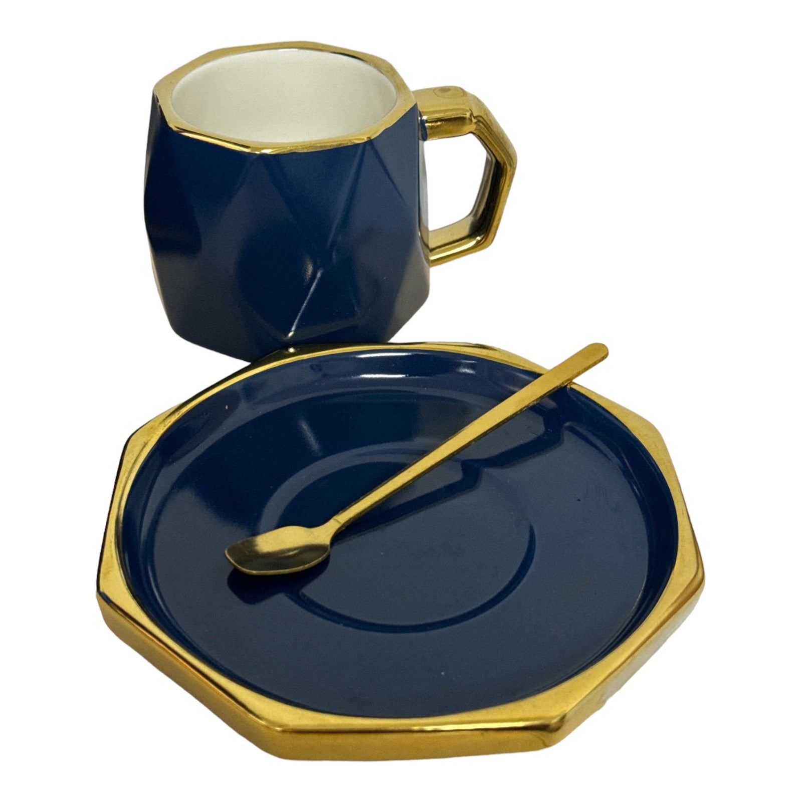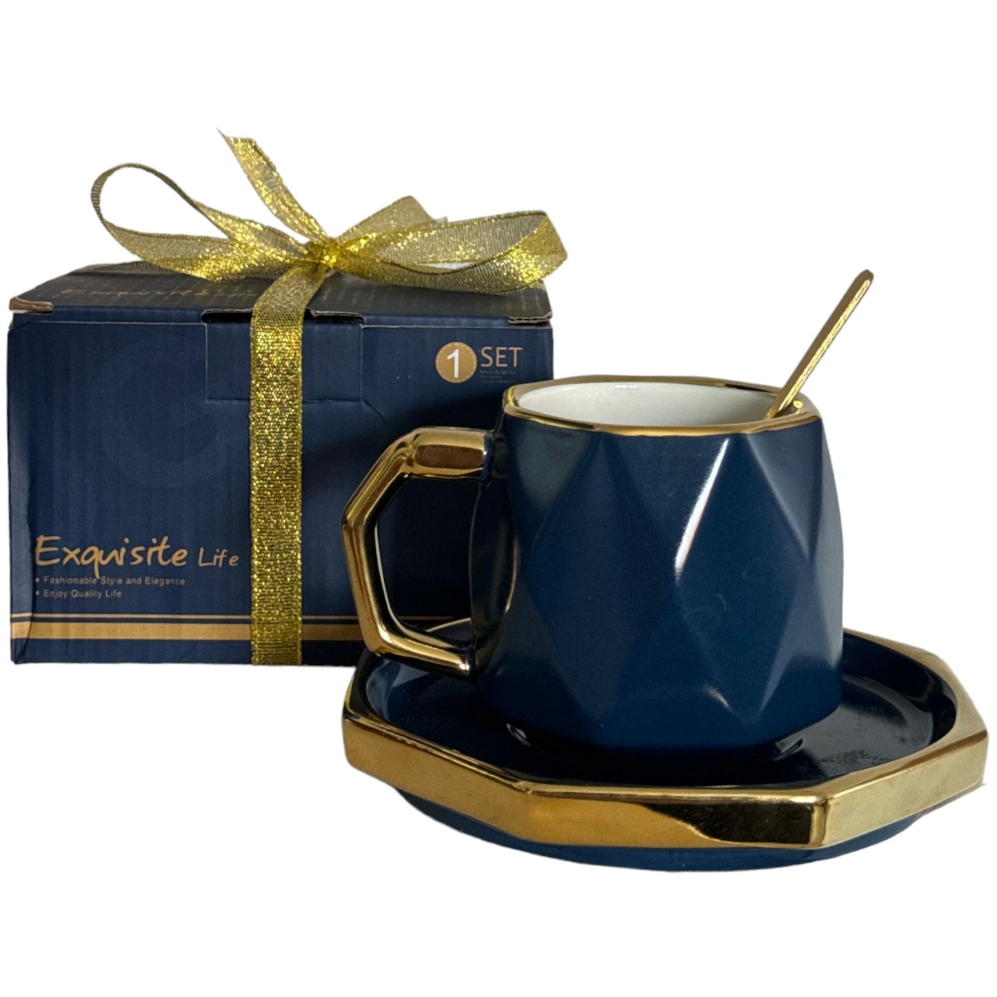 Setul este format dintr-o ceașcă cu farfurie și o linguriță metalică și vine ambalat într-o cutie din carton bleumarin , legată cu fundiță aurie ,perfectă pentru un cadou plin de bun gust.