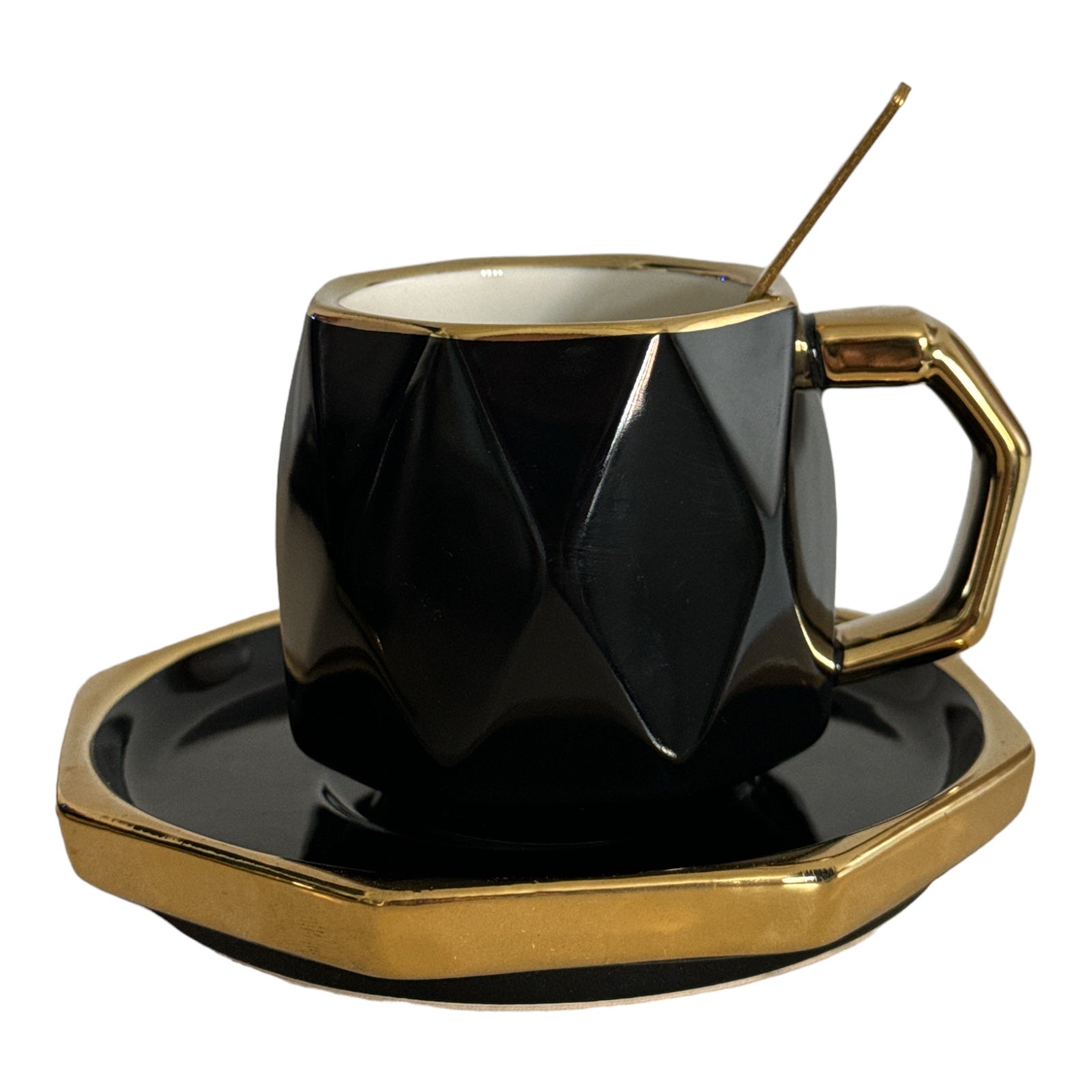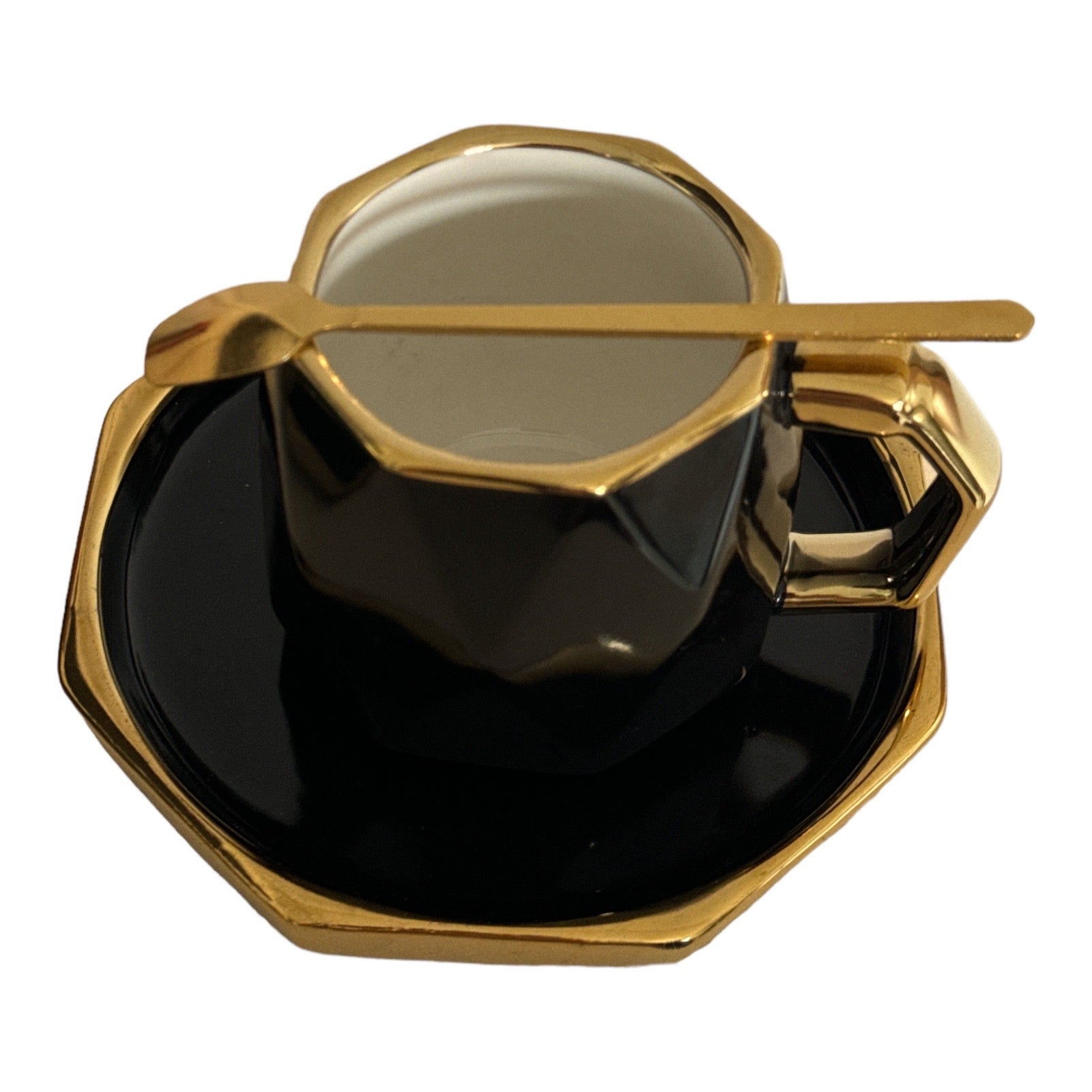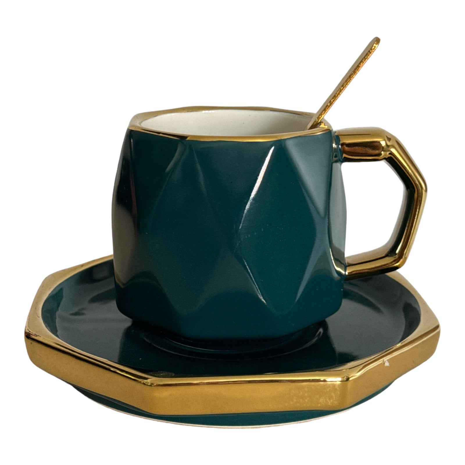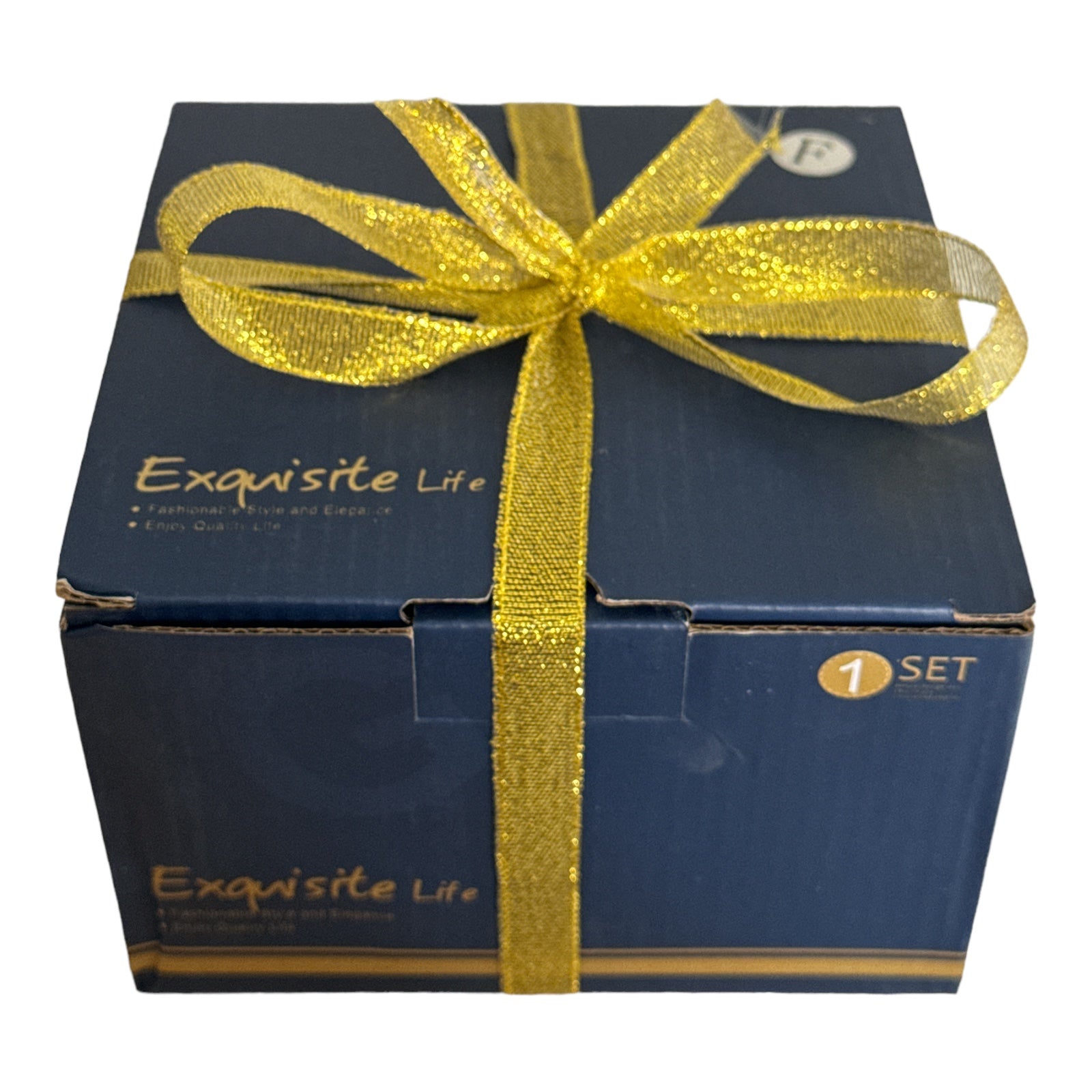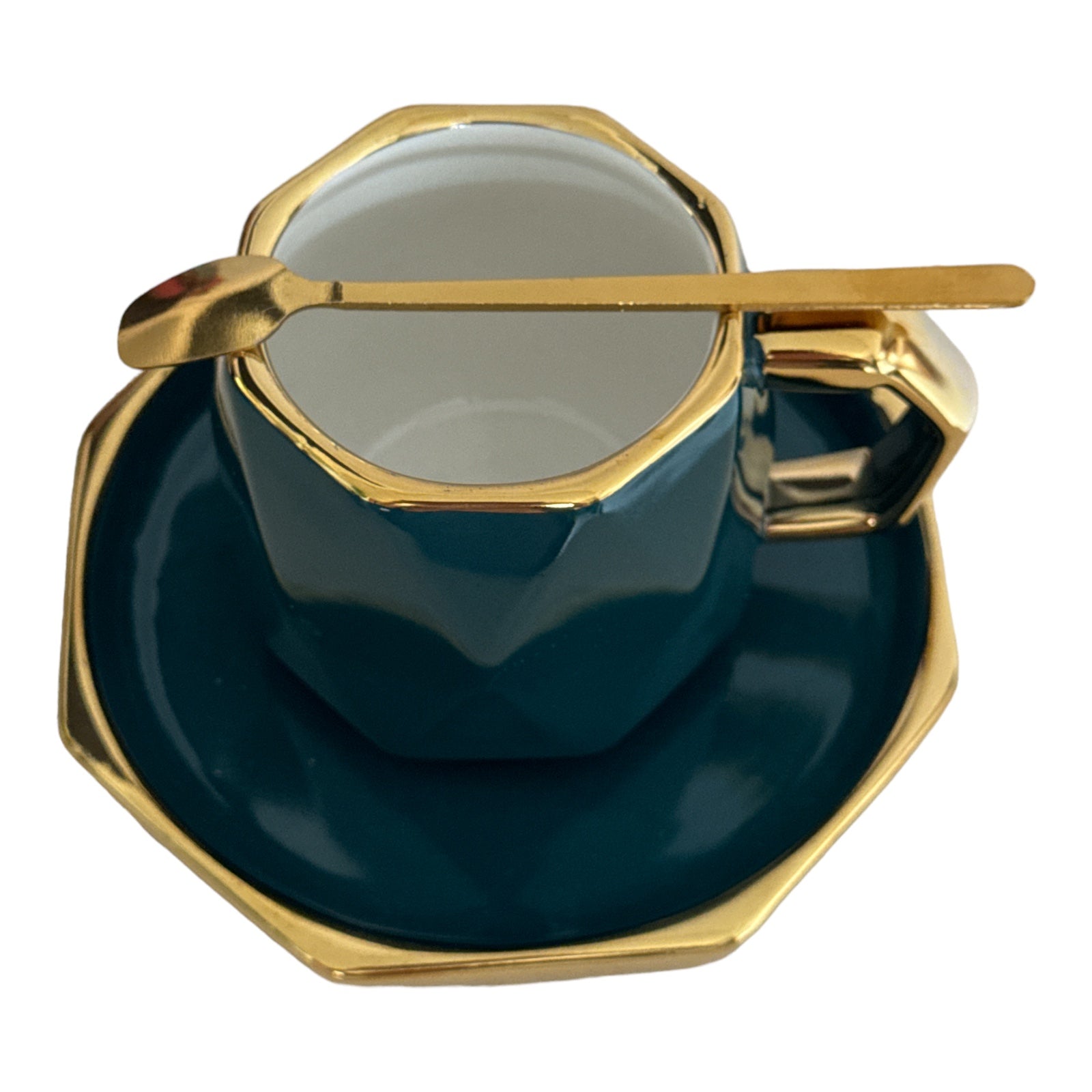 Setul este format dintr-o ceașcă cu farfurie și o linguriță metalică și vine ambalat într-o cutie din carton bleumarin , legată cu fundiță aurie ,perfectă pentru un cadou plin de bun gust.