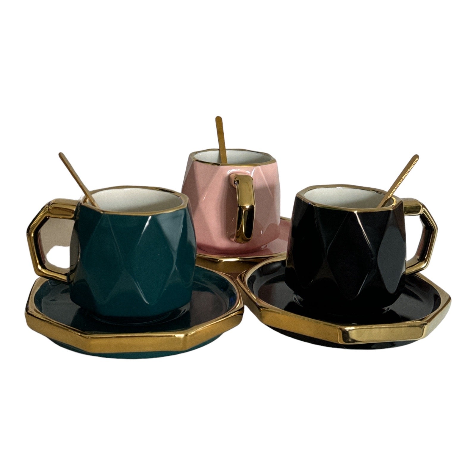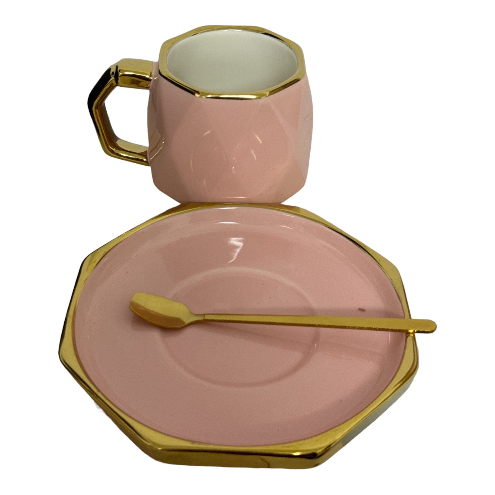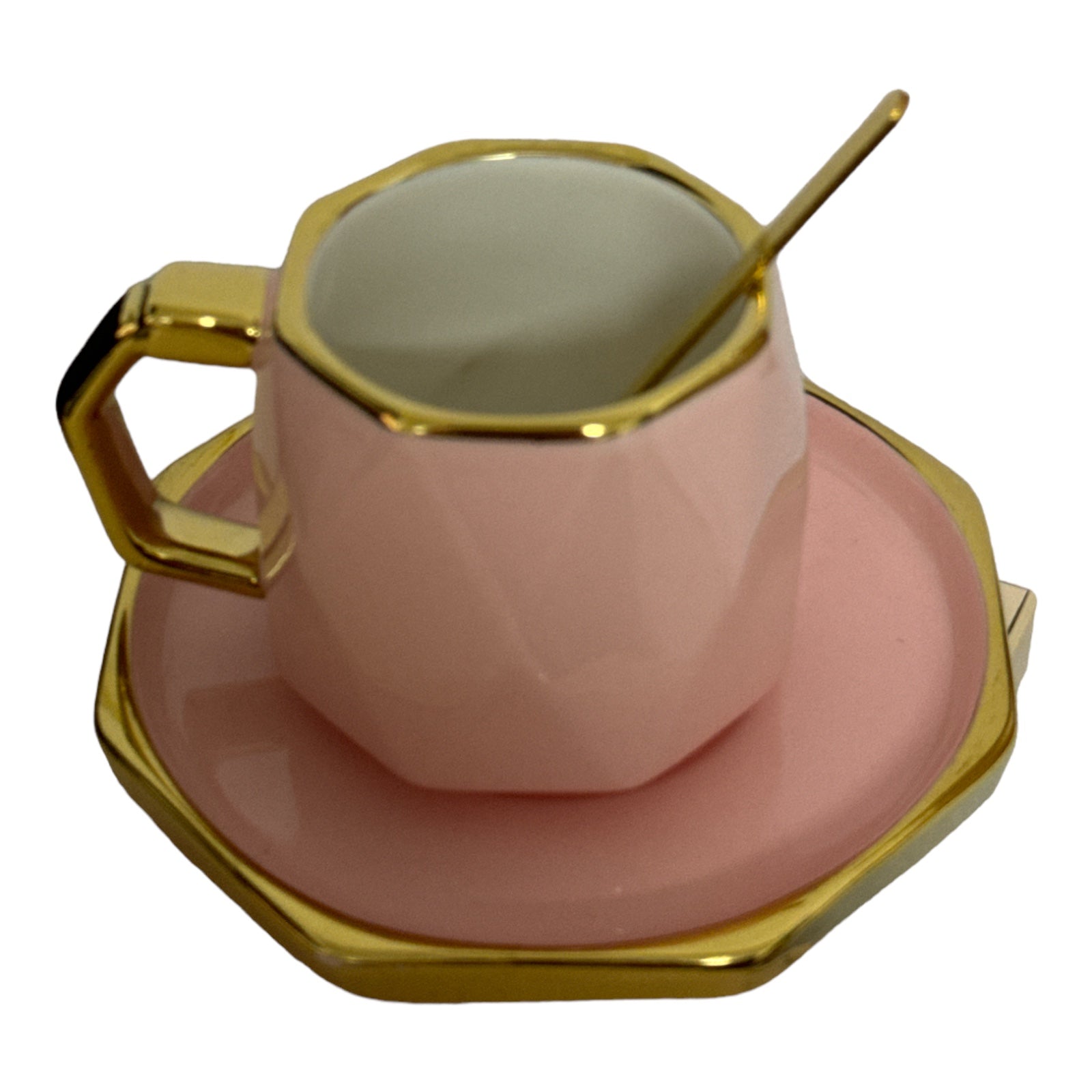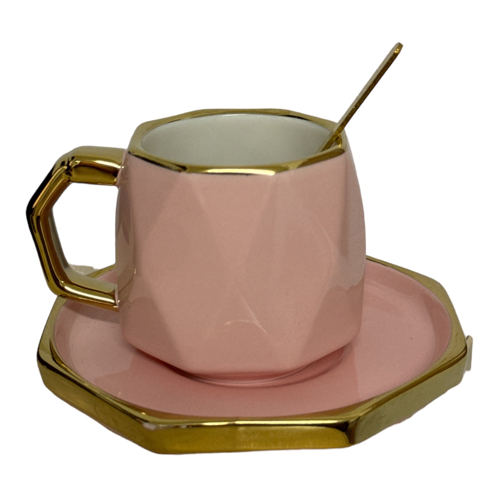 Setul este format dintr-o ceașcă cu farfurie și o linguriță metalică și vine ambalat într-o cutie din carton bleumarin , legată cu fundiță aurie ,perfectă pentru un cadou plin de bun gust.