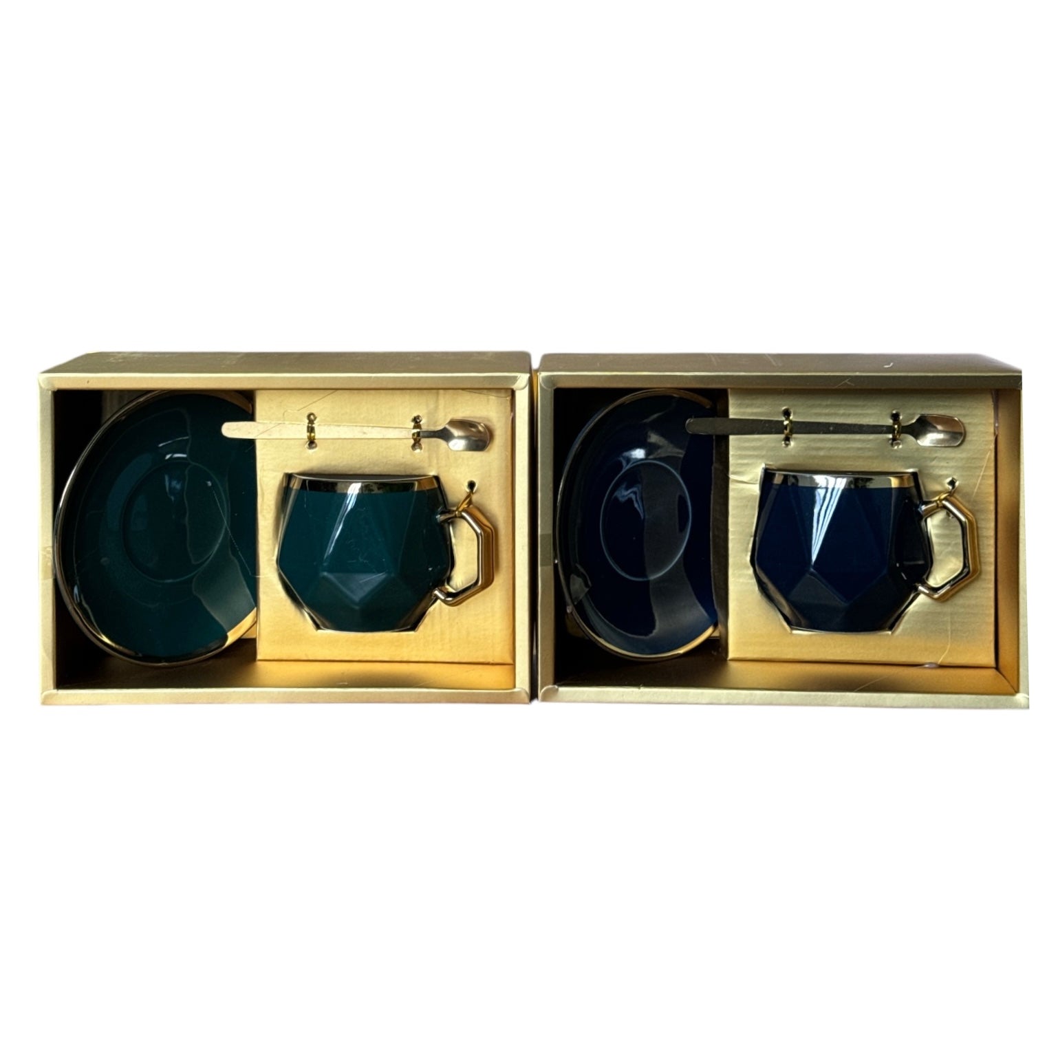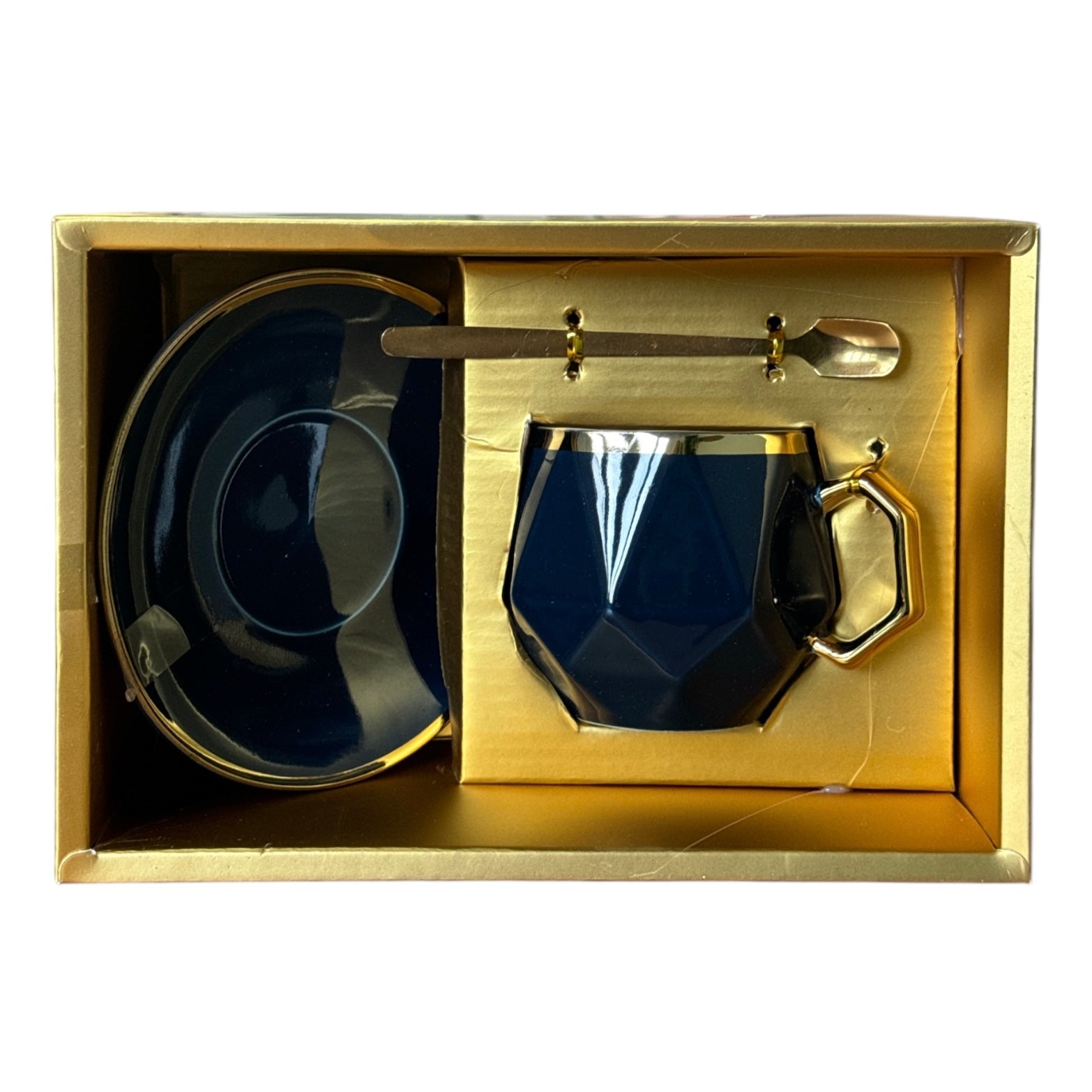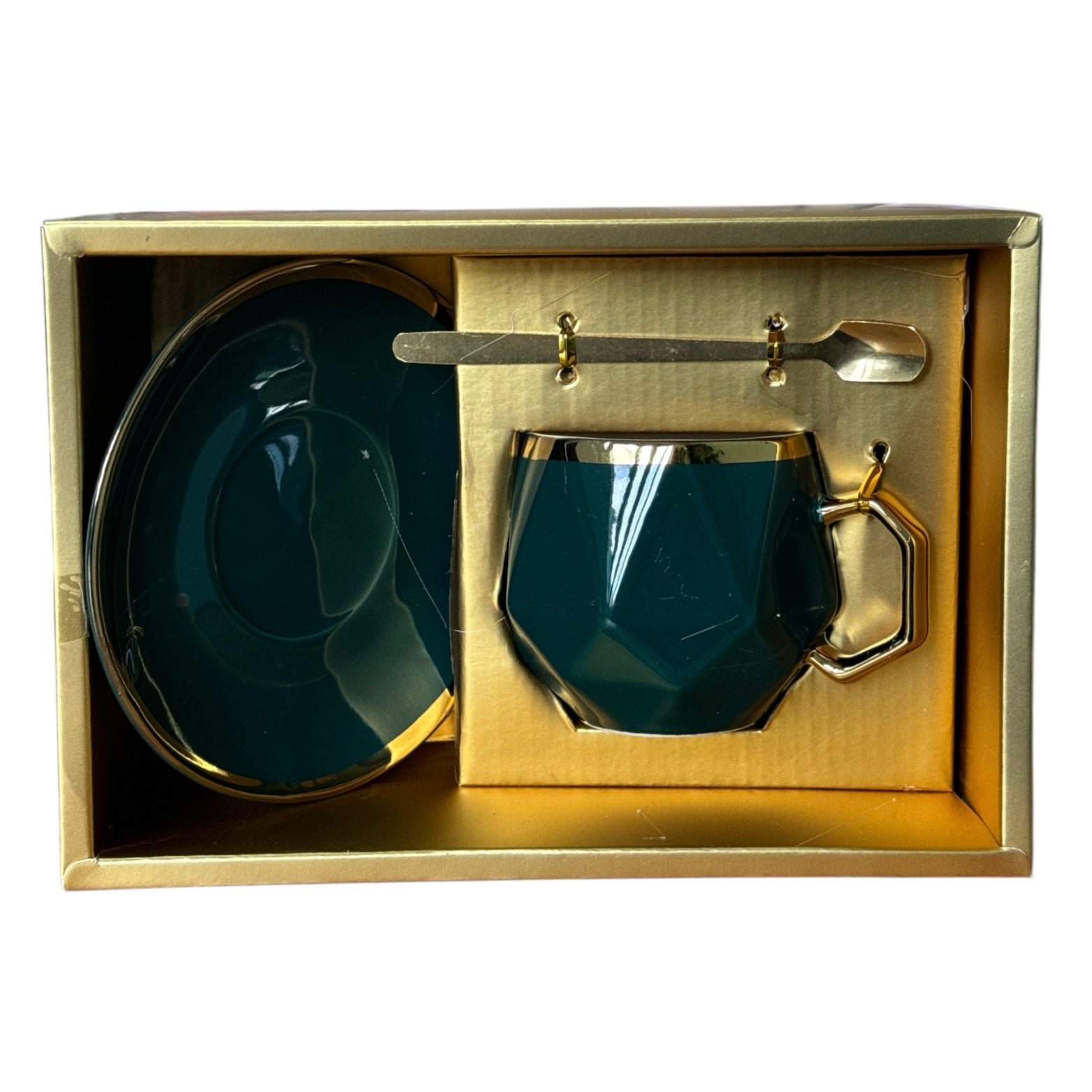 Setul este format dintr-o ceașcă cu farfurie și o linguriță metalică și vine ambalat într-o cutie elegantă din carton auriu perfectă pentru un cadou plin de bun gust.