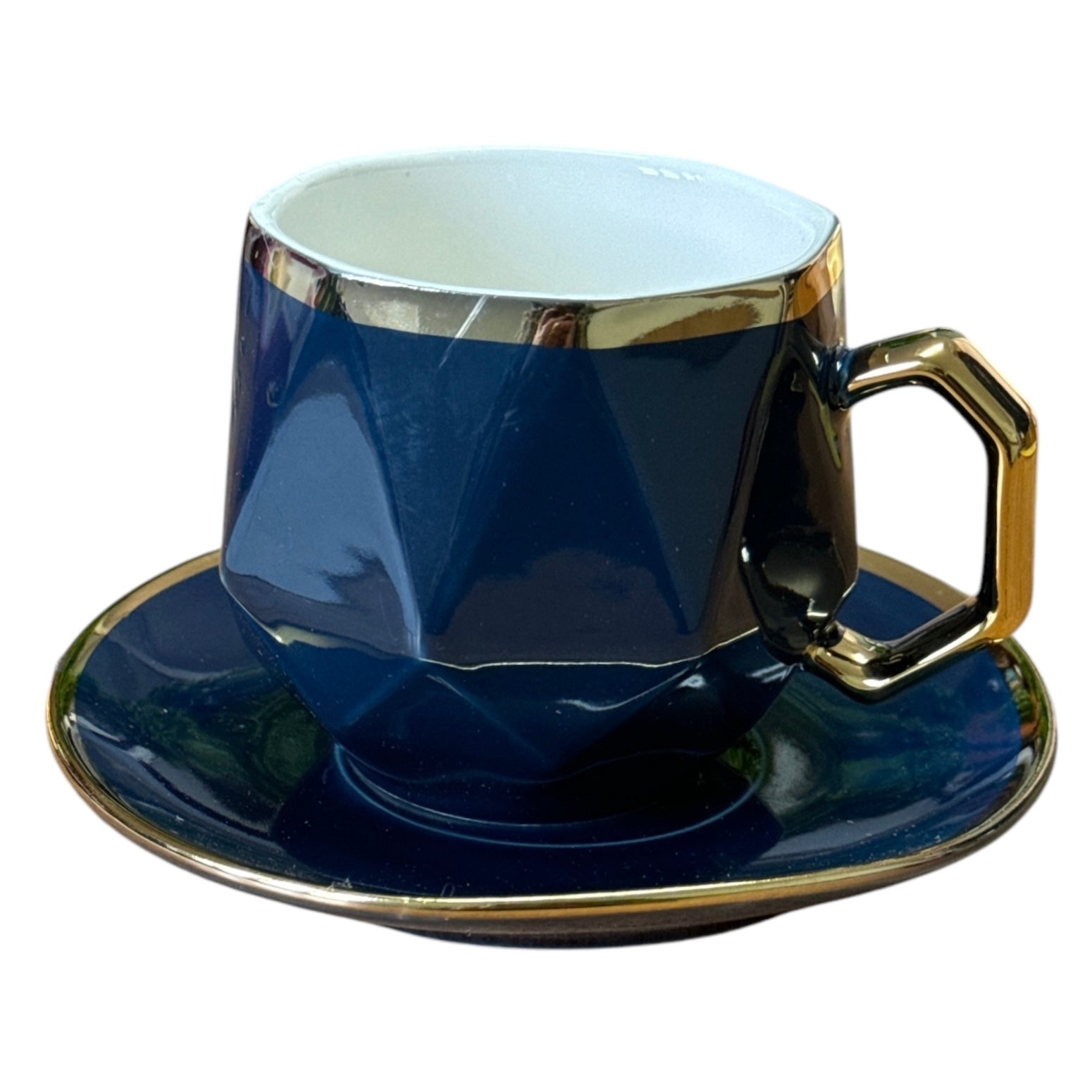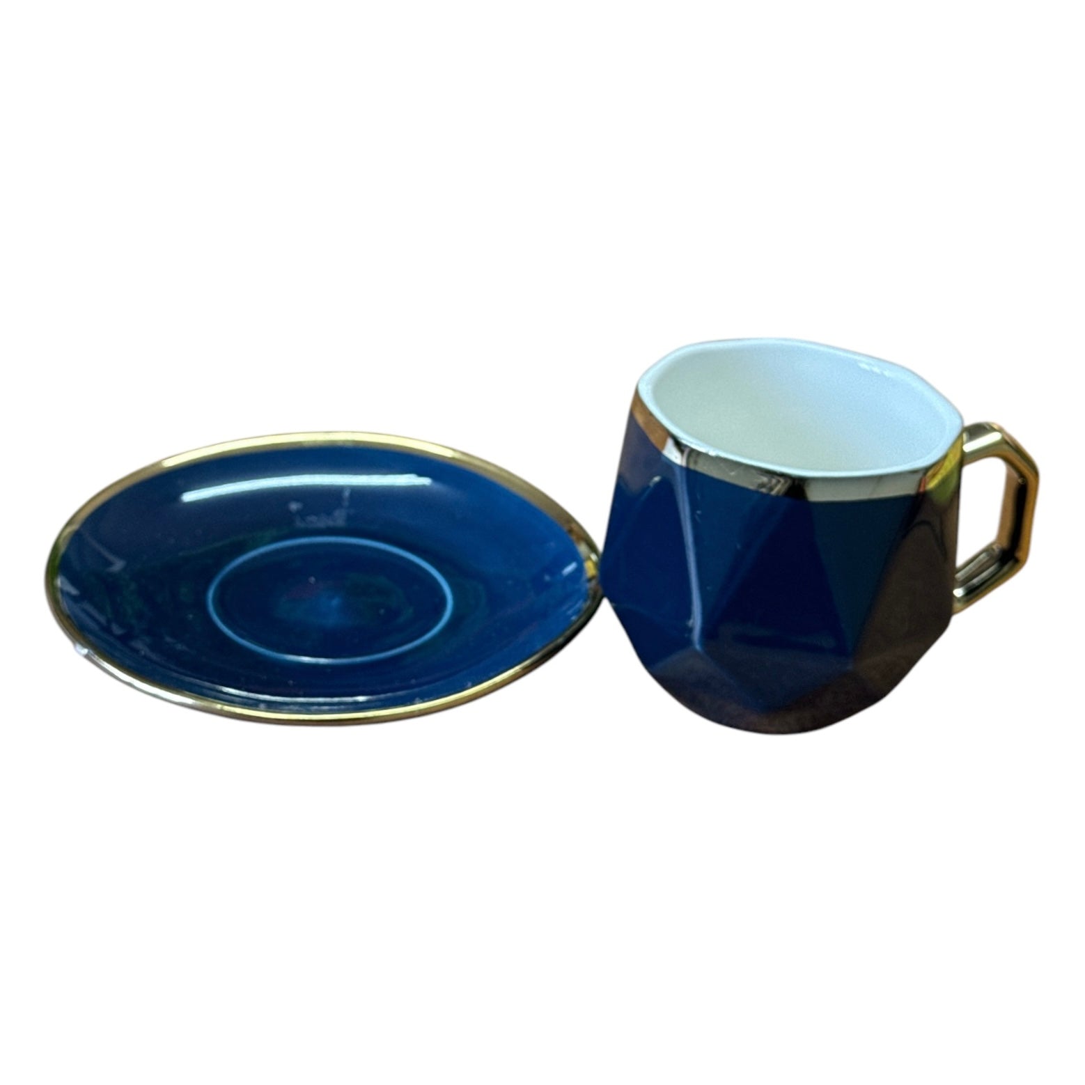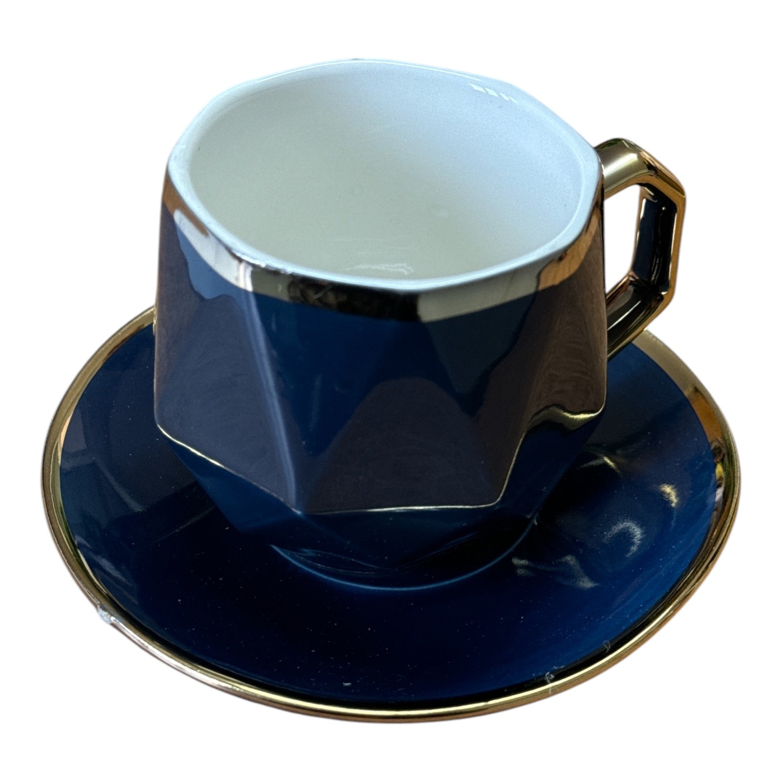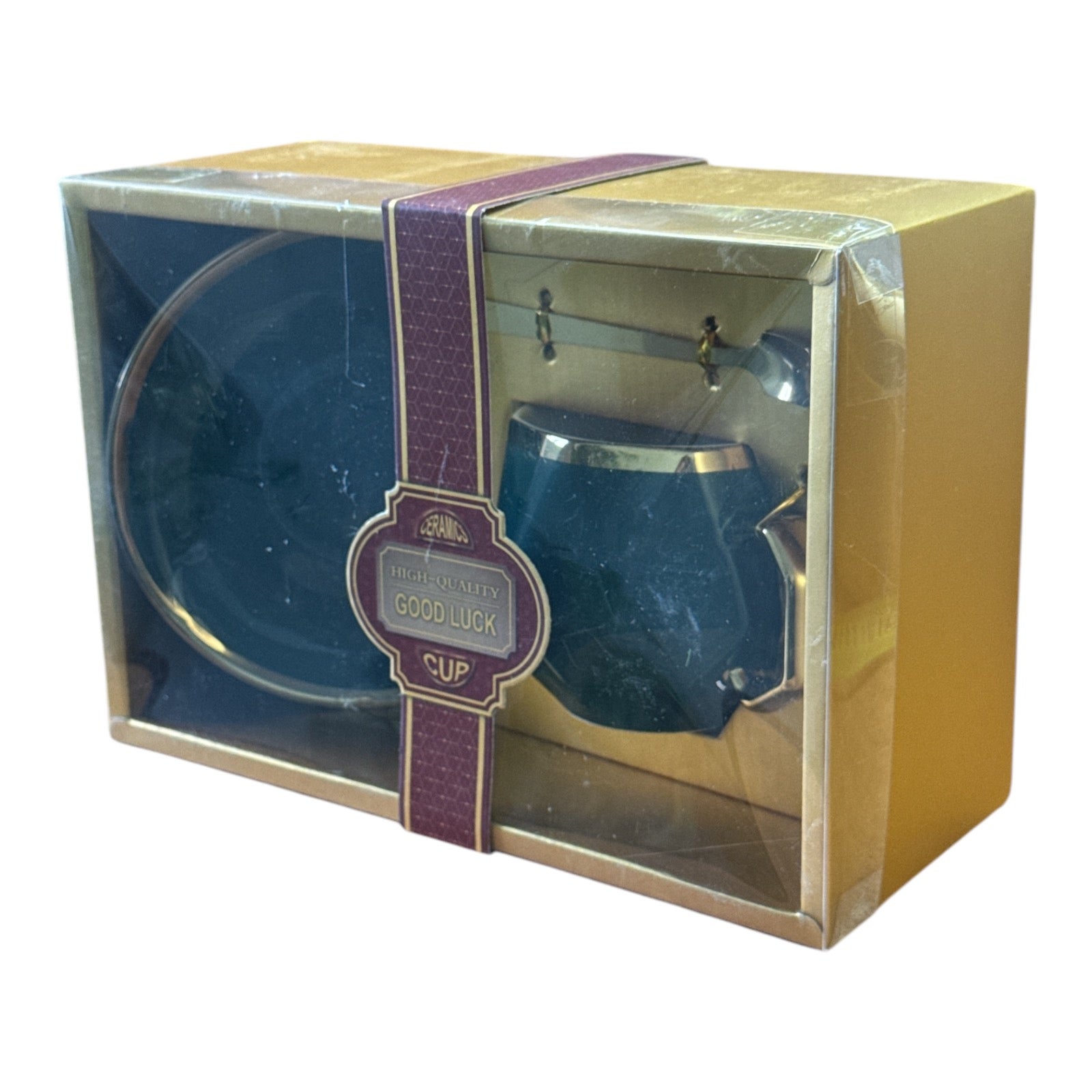 Setul este format dintr-o ceașcă cu farfurie și o linguriță metalică și vine ambalat într-o cutie elegantă din carton auriu perfectă pentru un cadou plin de bun gust.