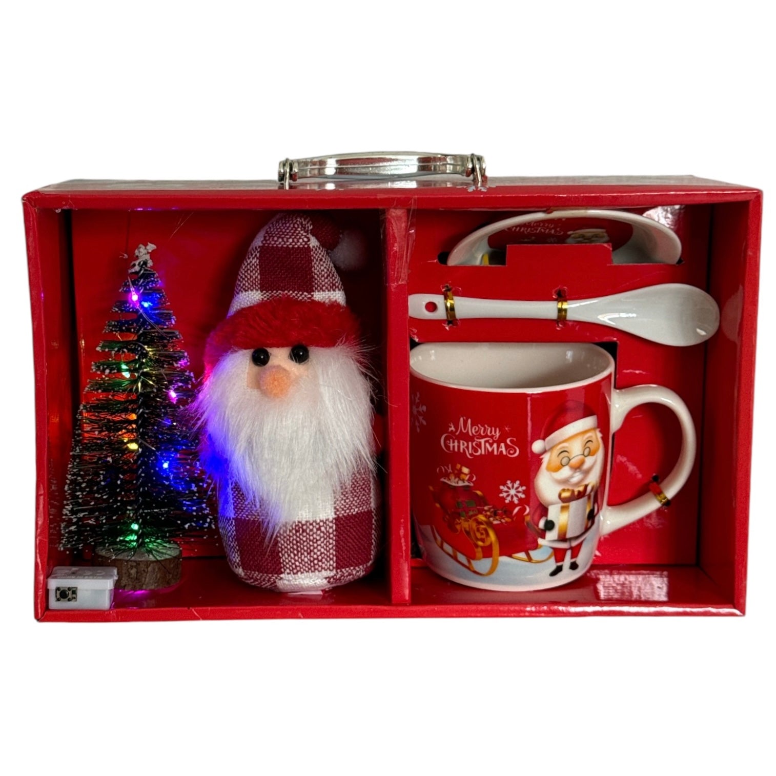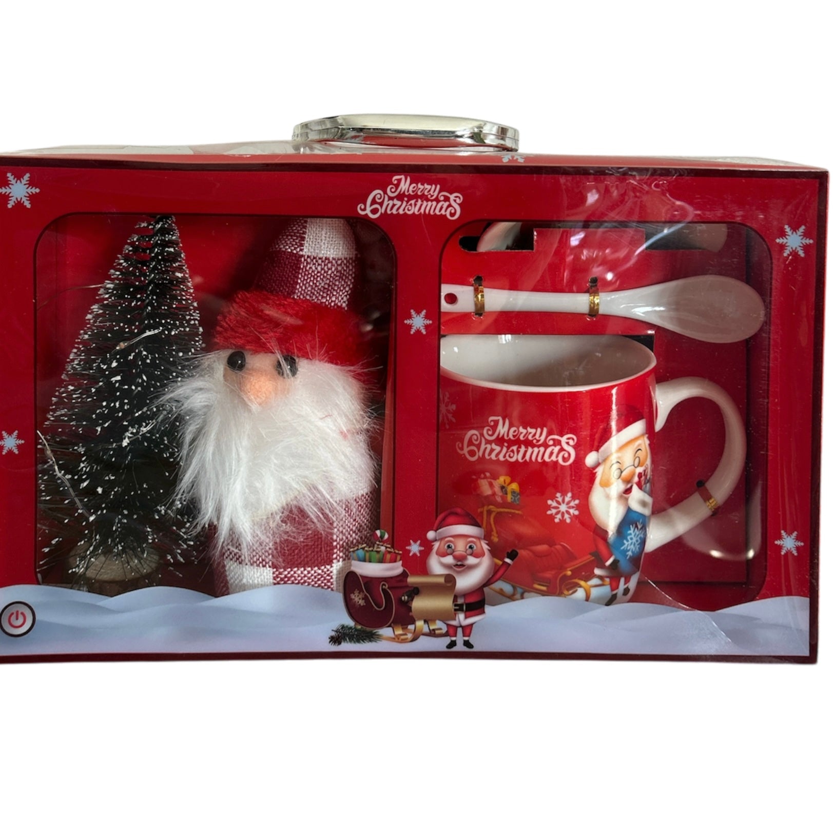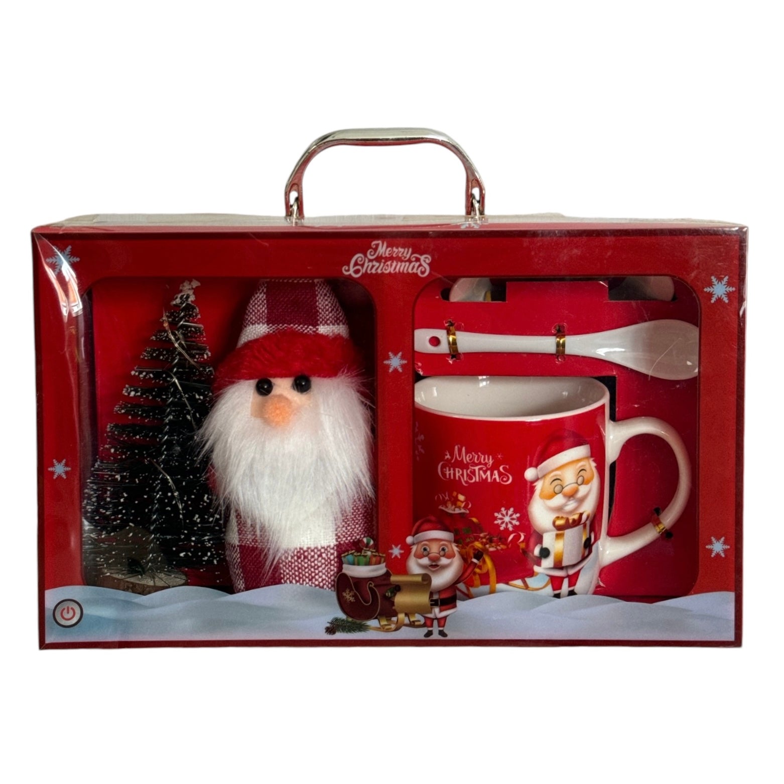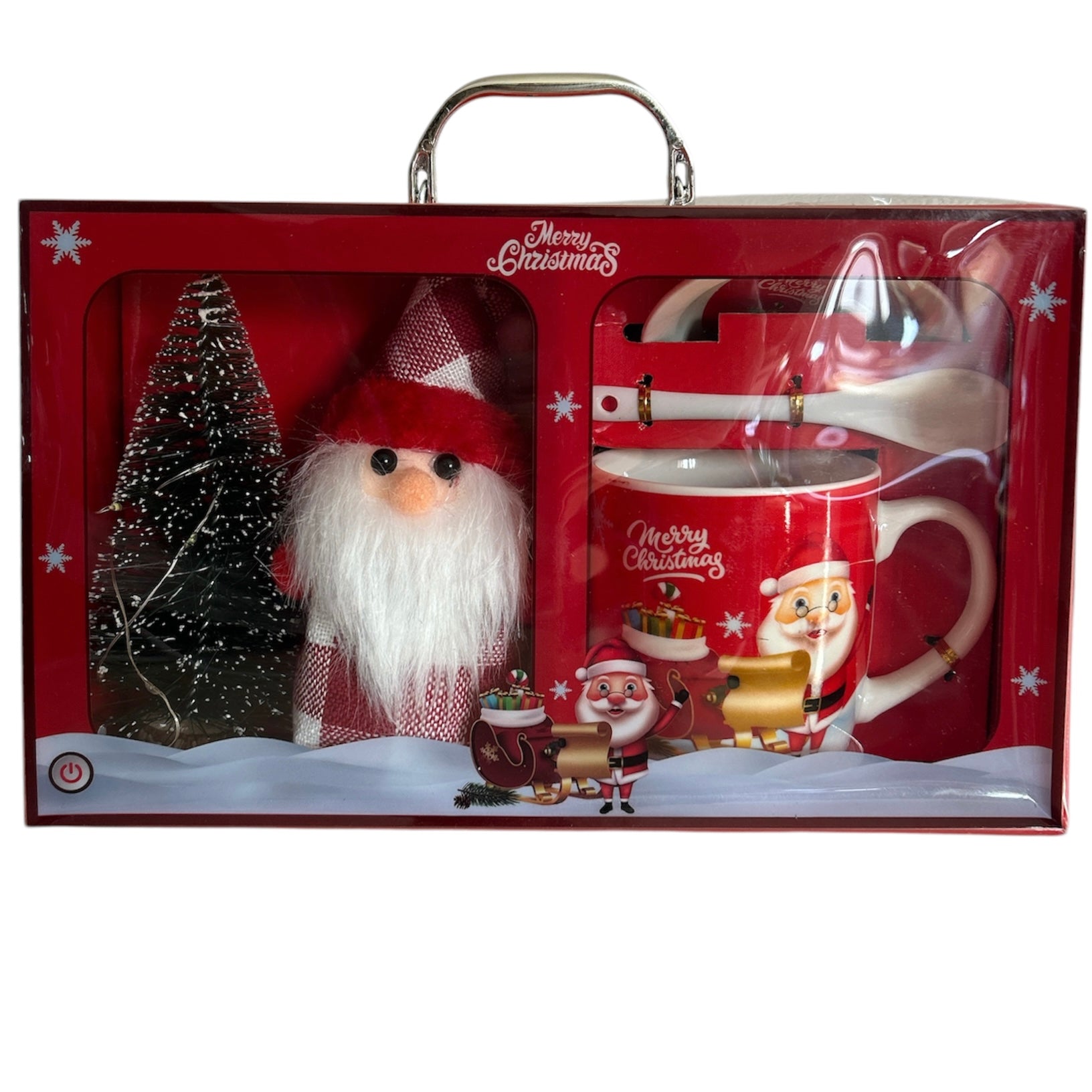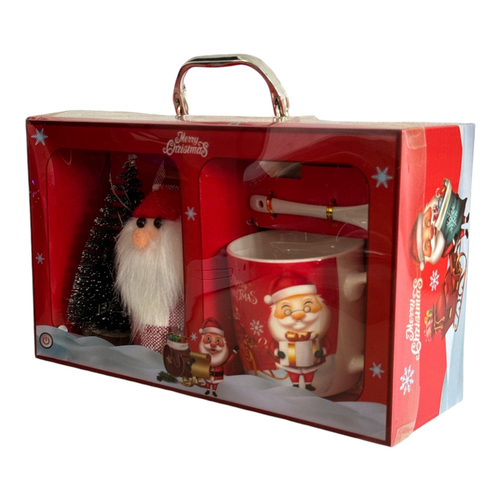 Setul este format dintr-o cană cu capac și linguriță și vine ambalat într-o cutie elegantă de cadou cu un brăduț cu lumini și o figurină specifică Sărbătorilor de iarnă.